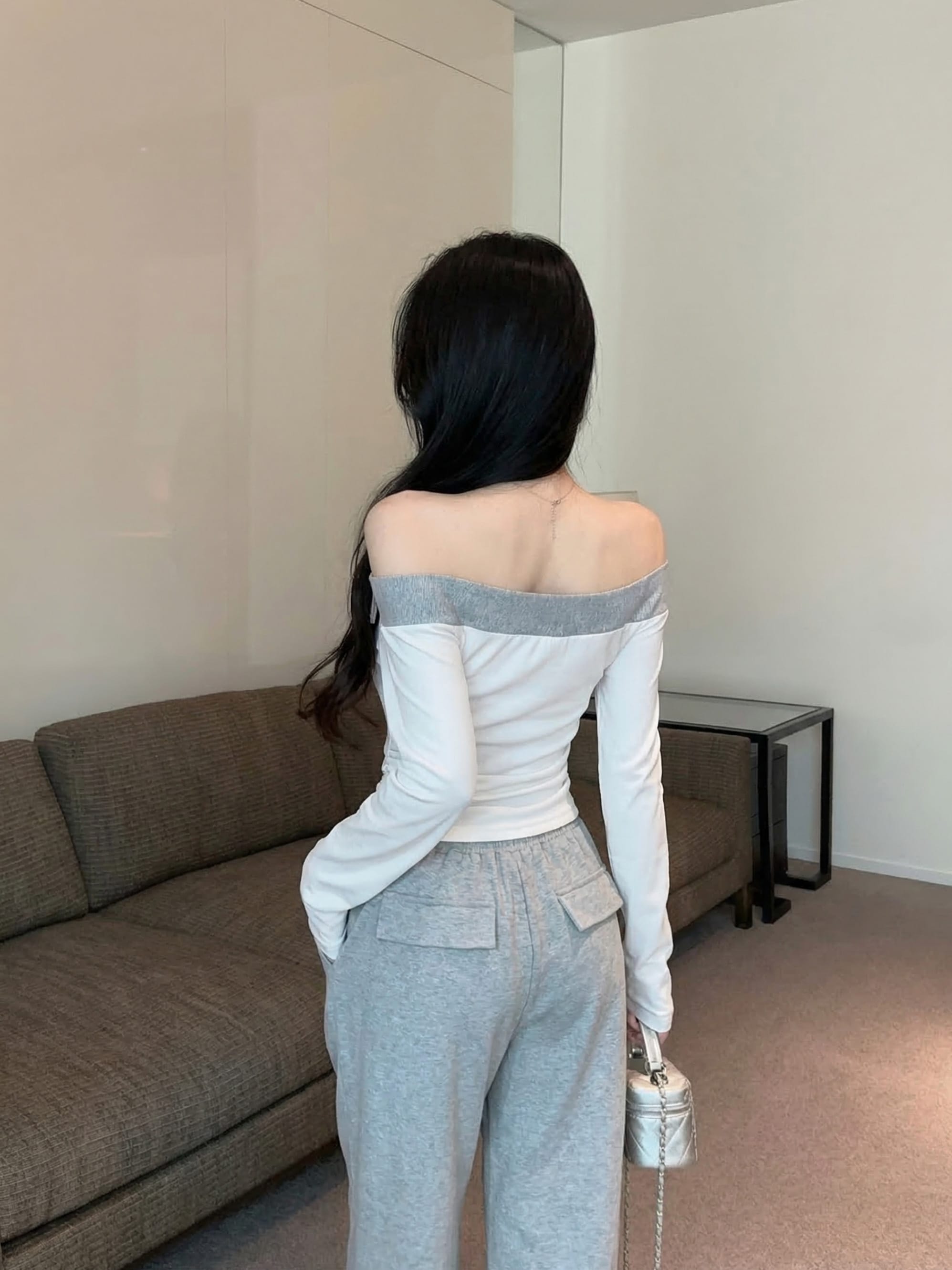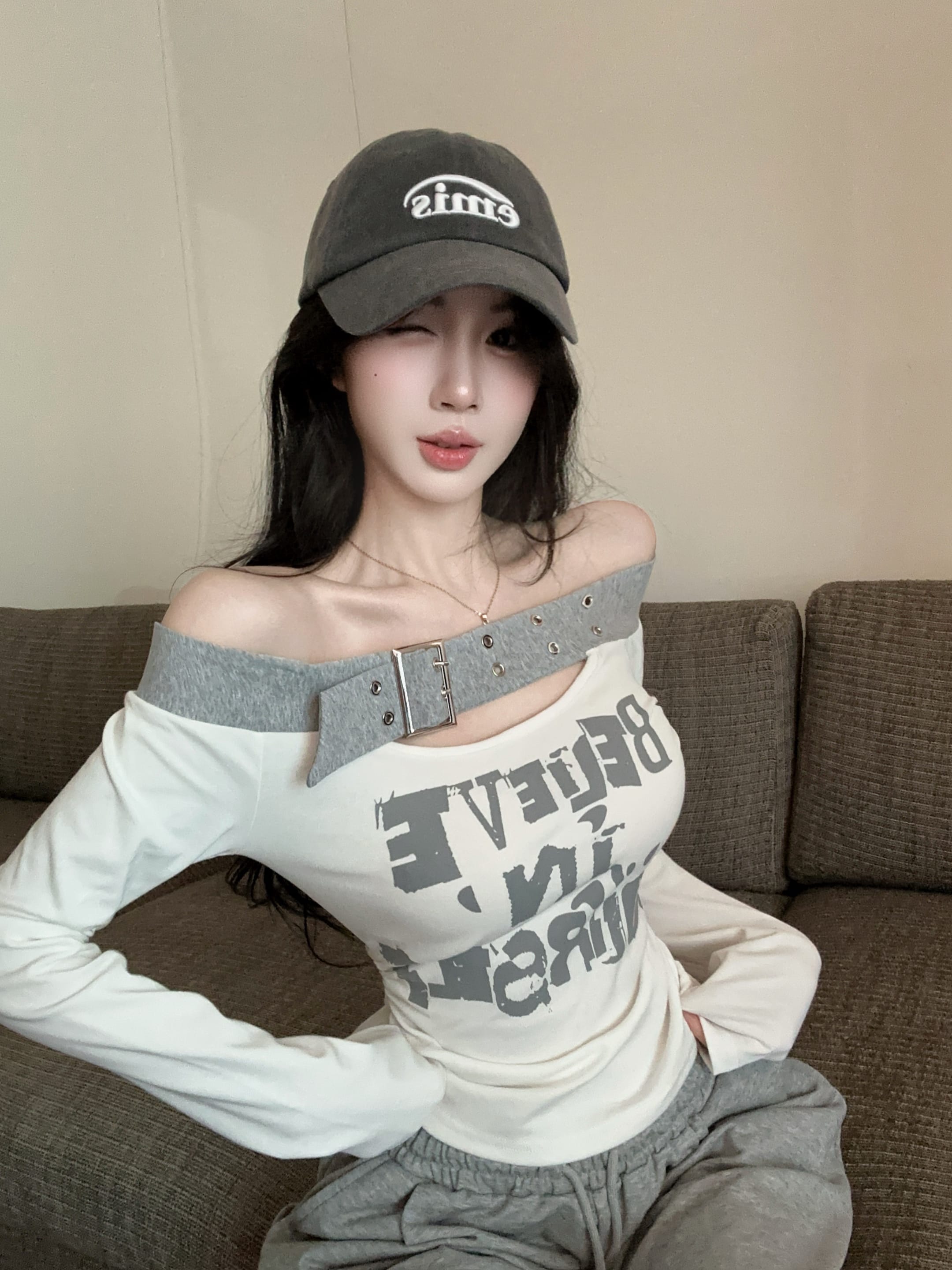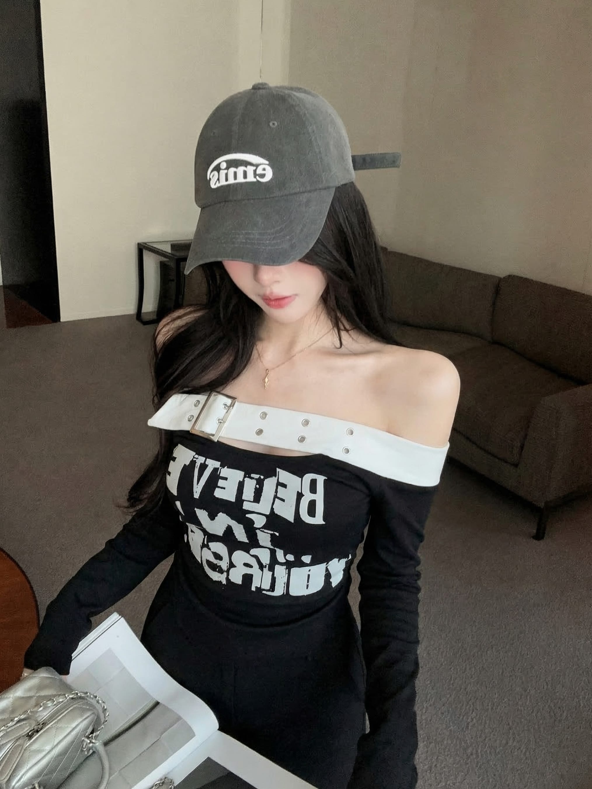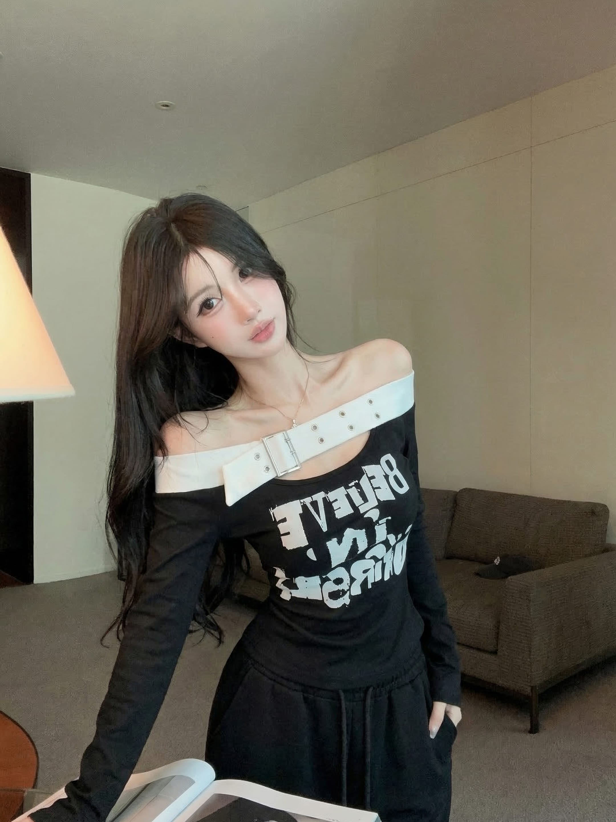 RY2898# 实拍实价 设计感一字肩长袖字母印花T恤抽绳宽松休闲阔腿裤套装