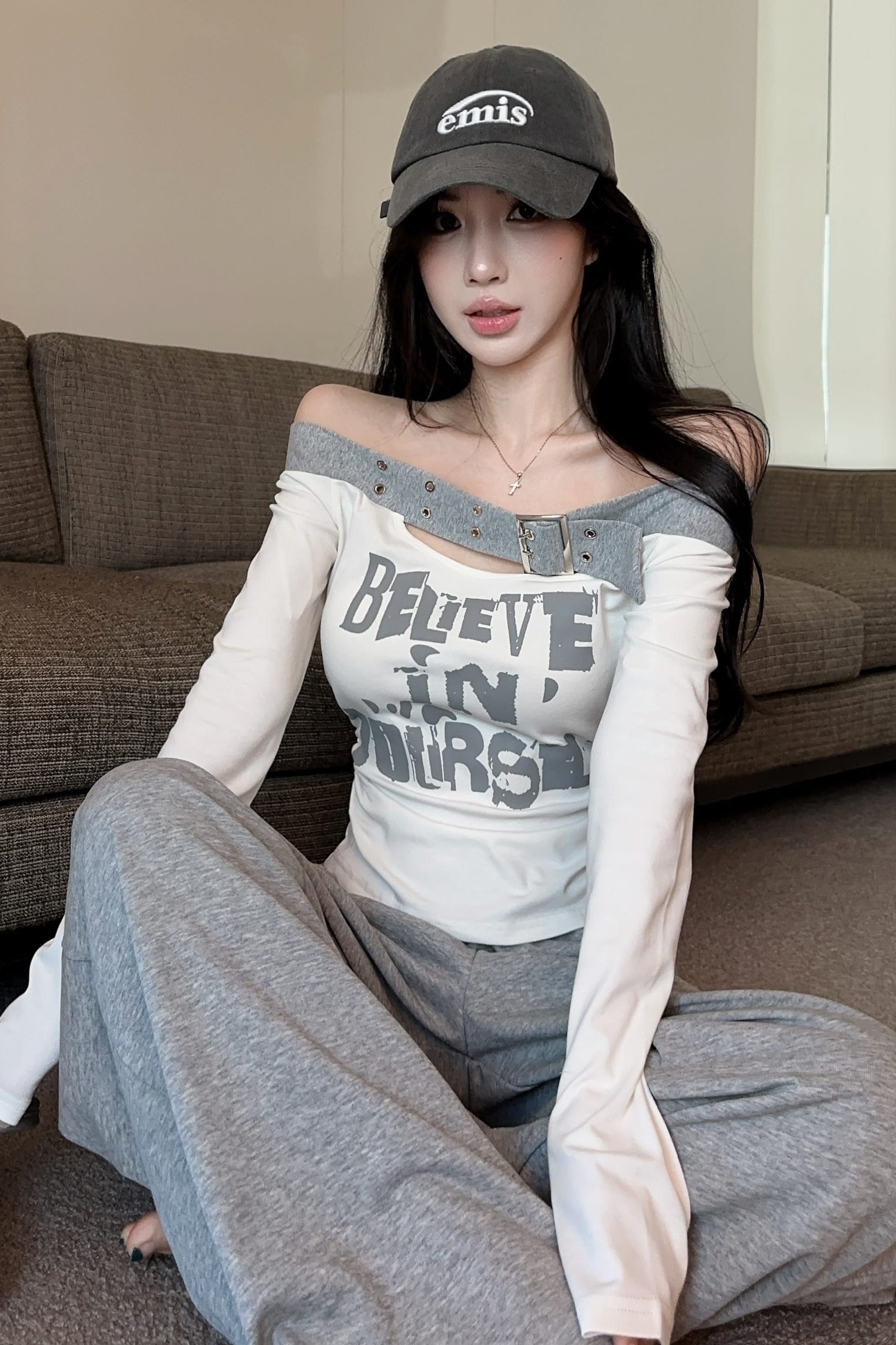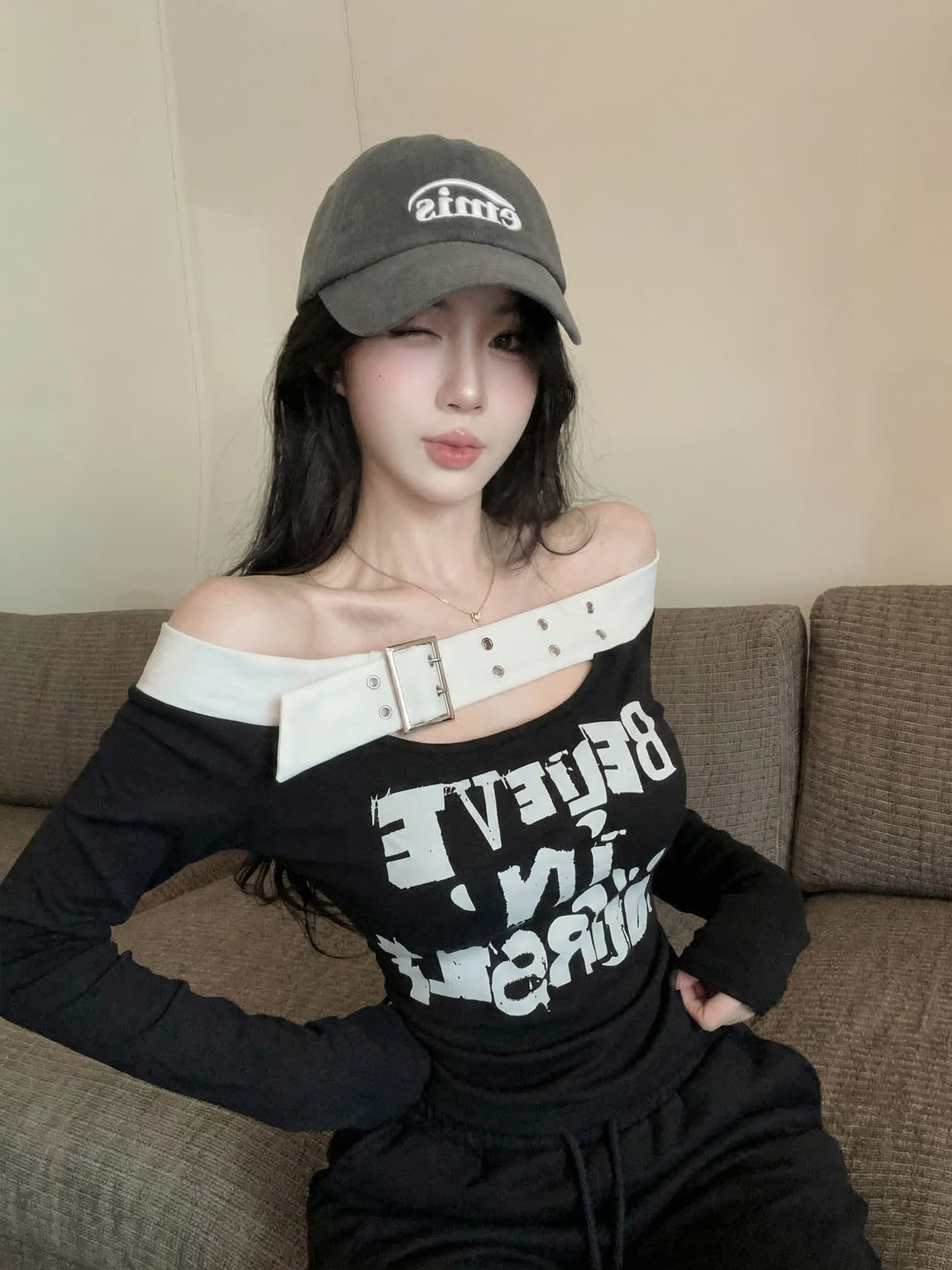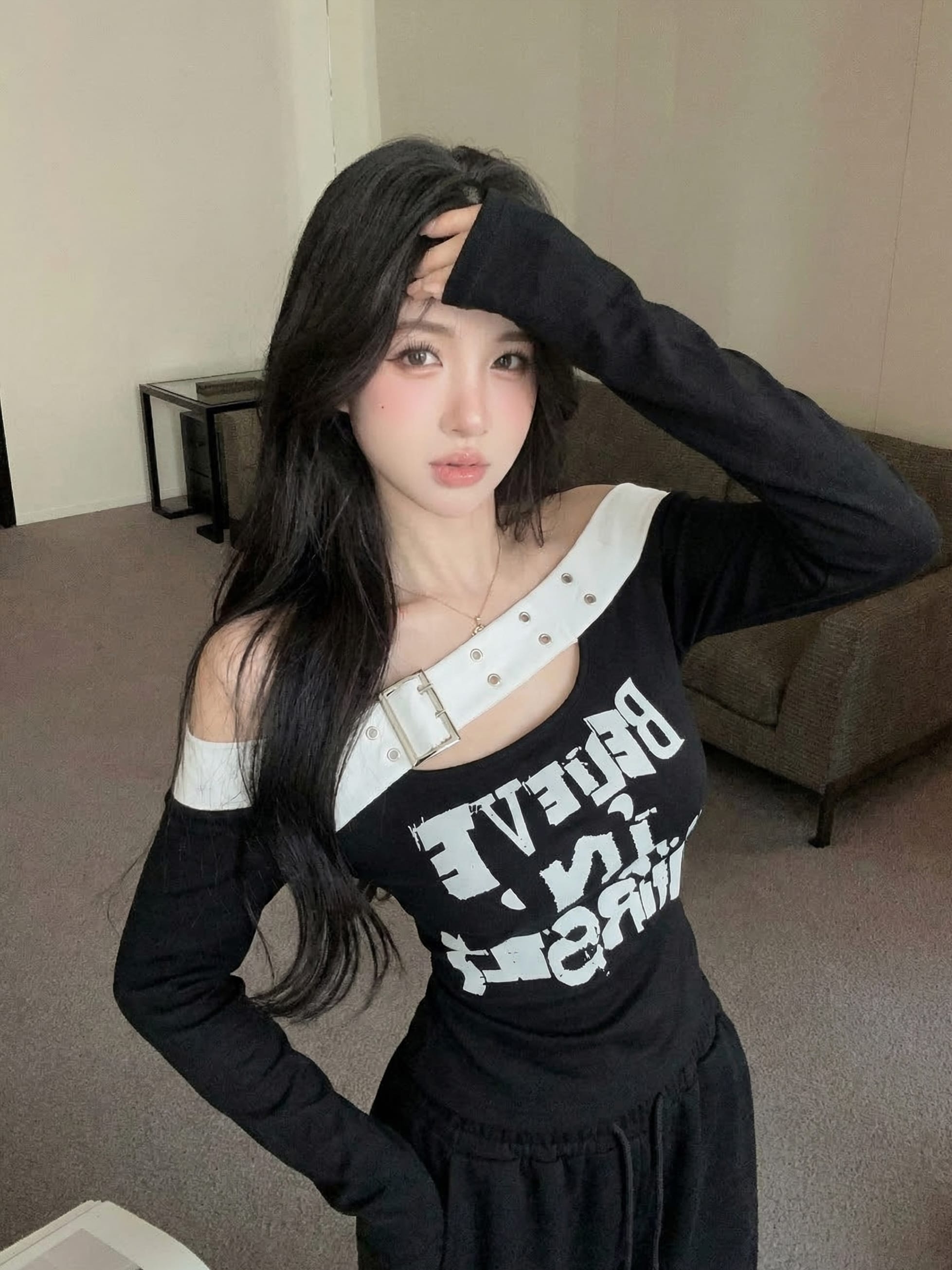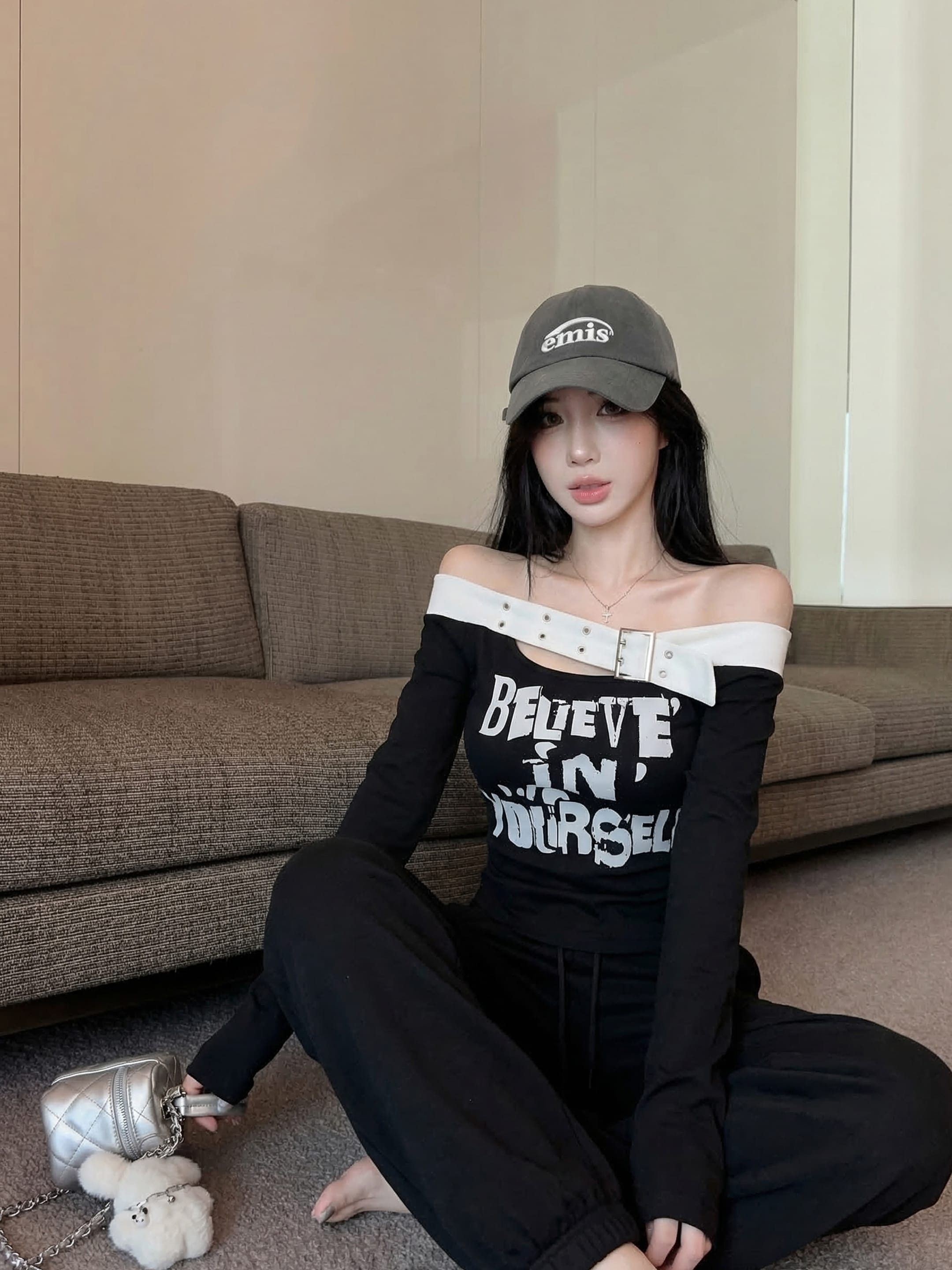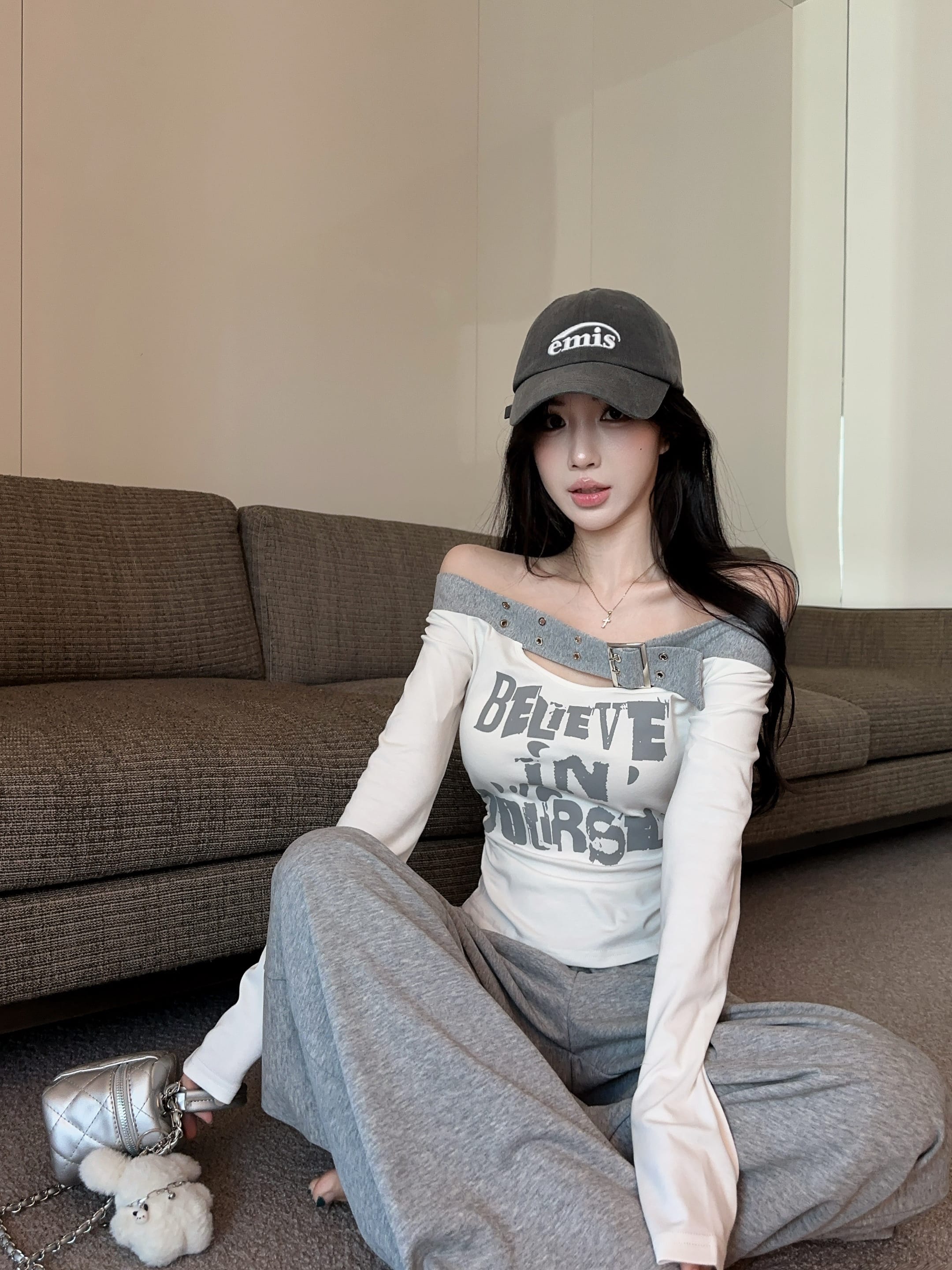 RY2898# 实拍实价 设计感一字肩长袖字母印花T恤抽绳宽松休闲阔腿裤套装
