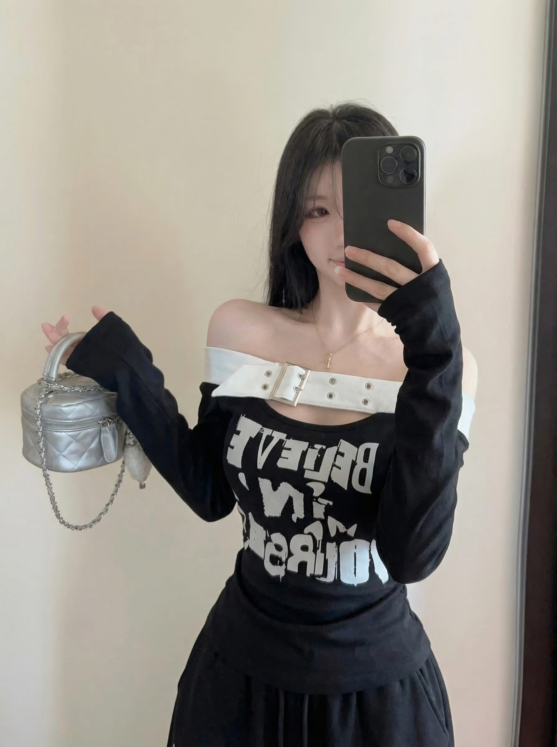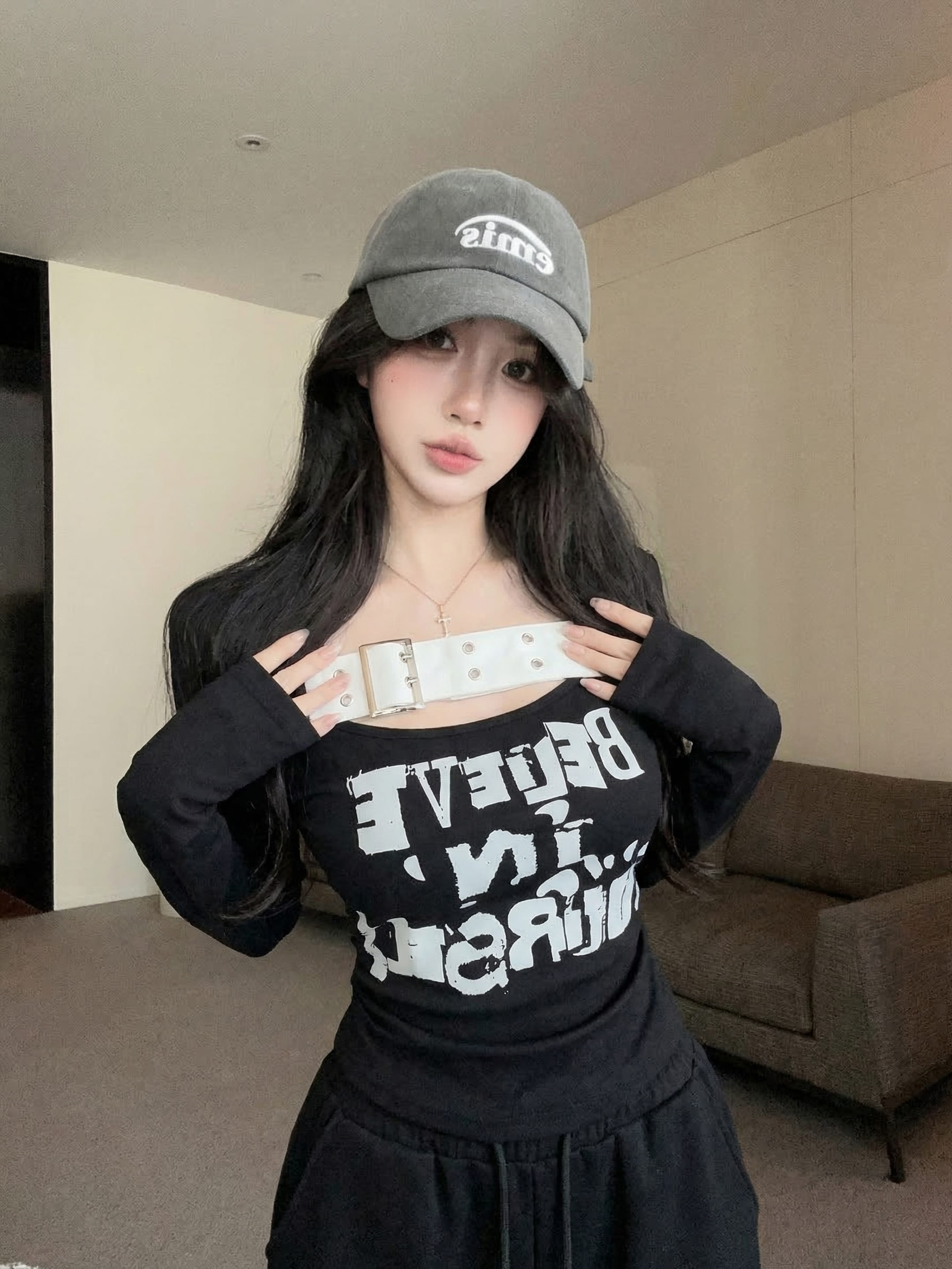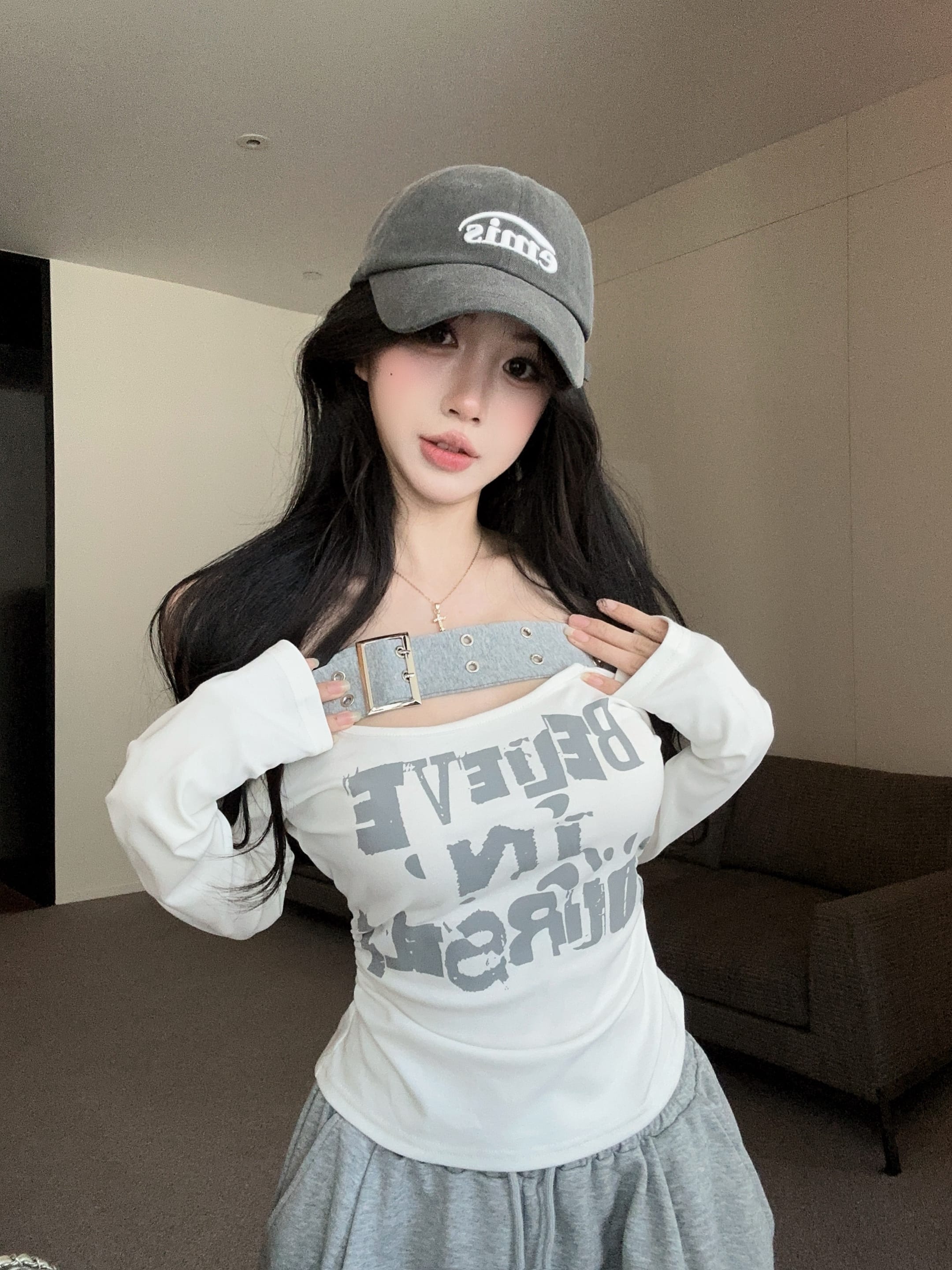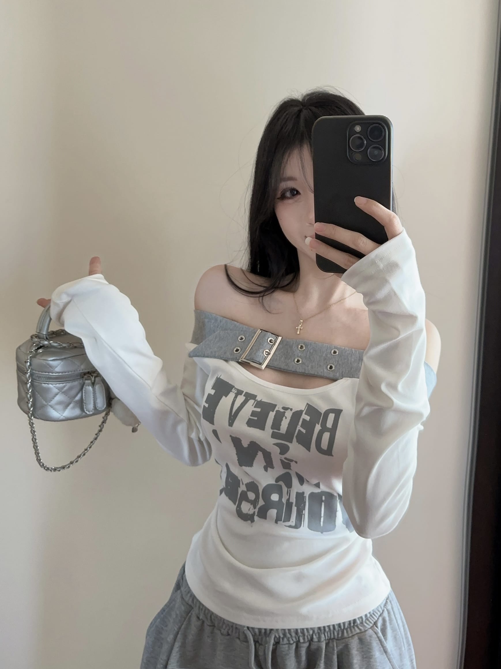 RY2898# 实拍实价 设计感一字肩长袖字母印花T恤抽绳宽松休闲阔腿裤套装