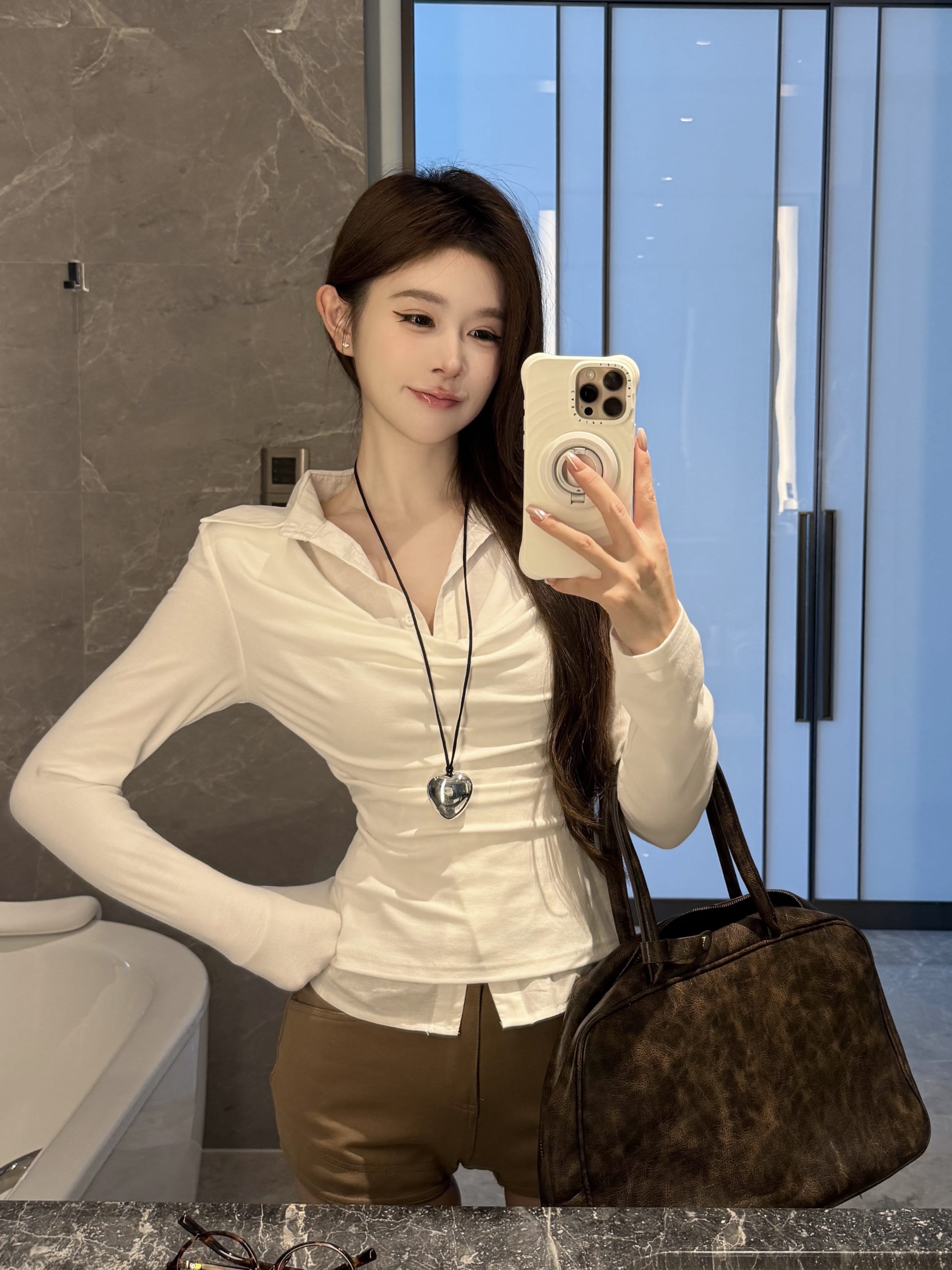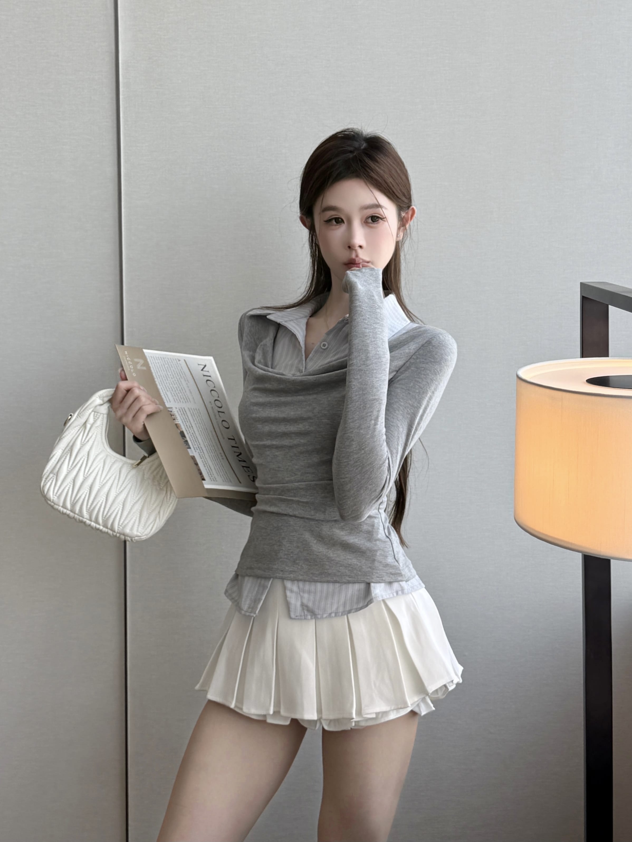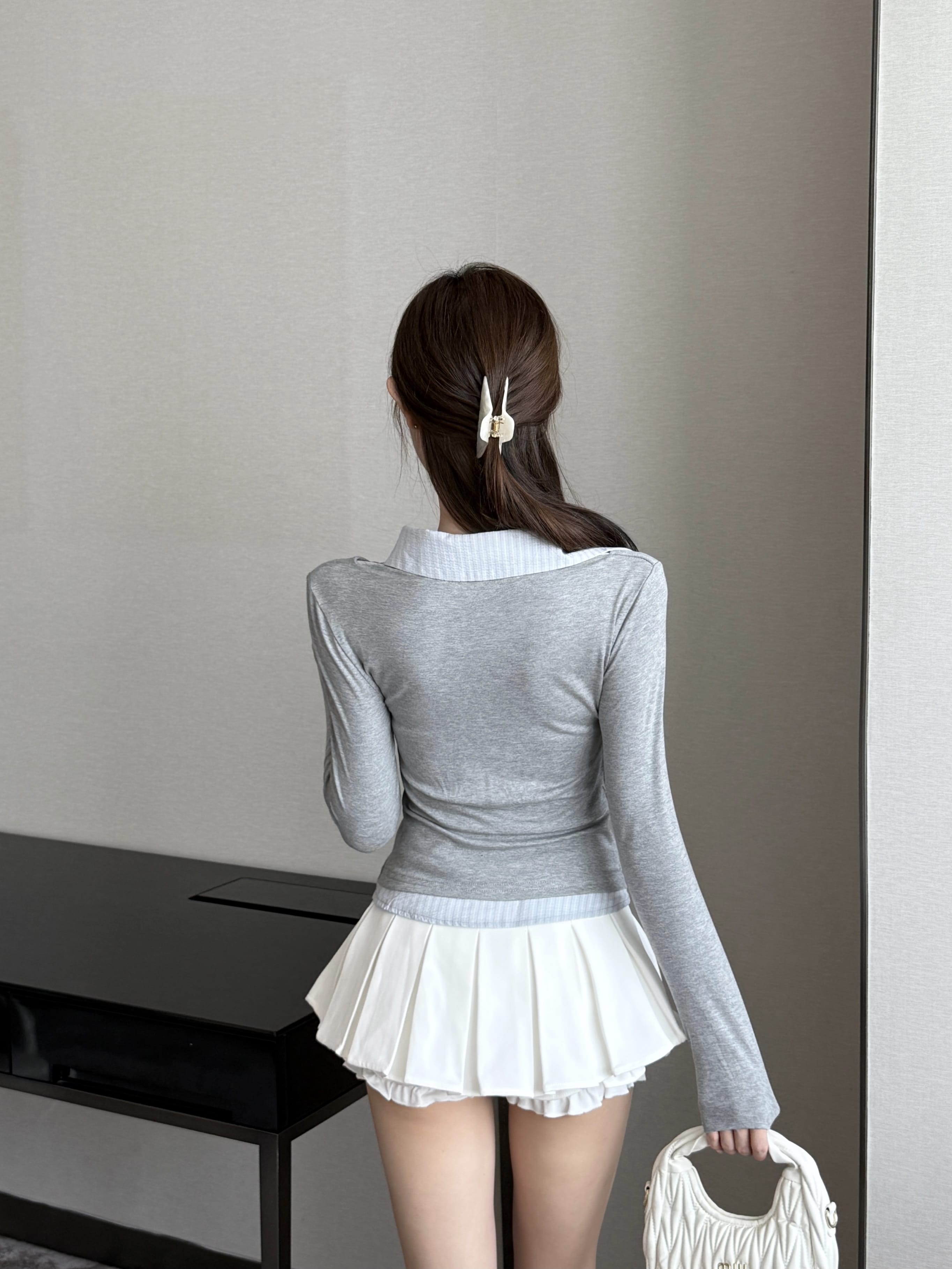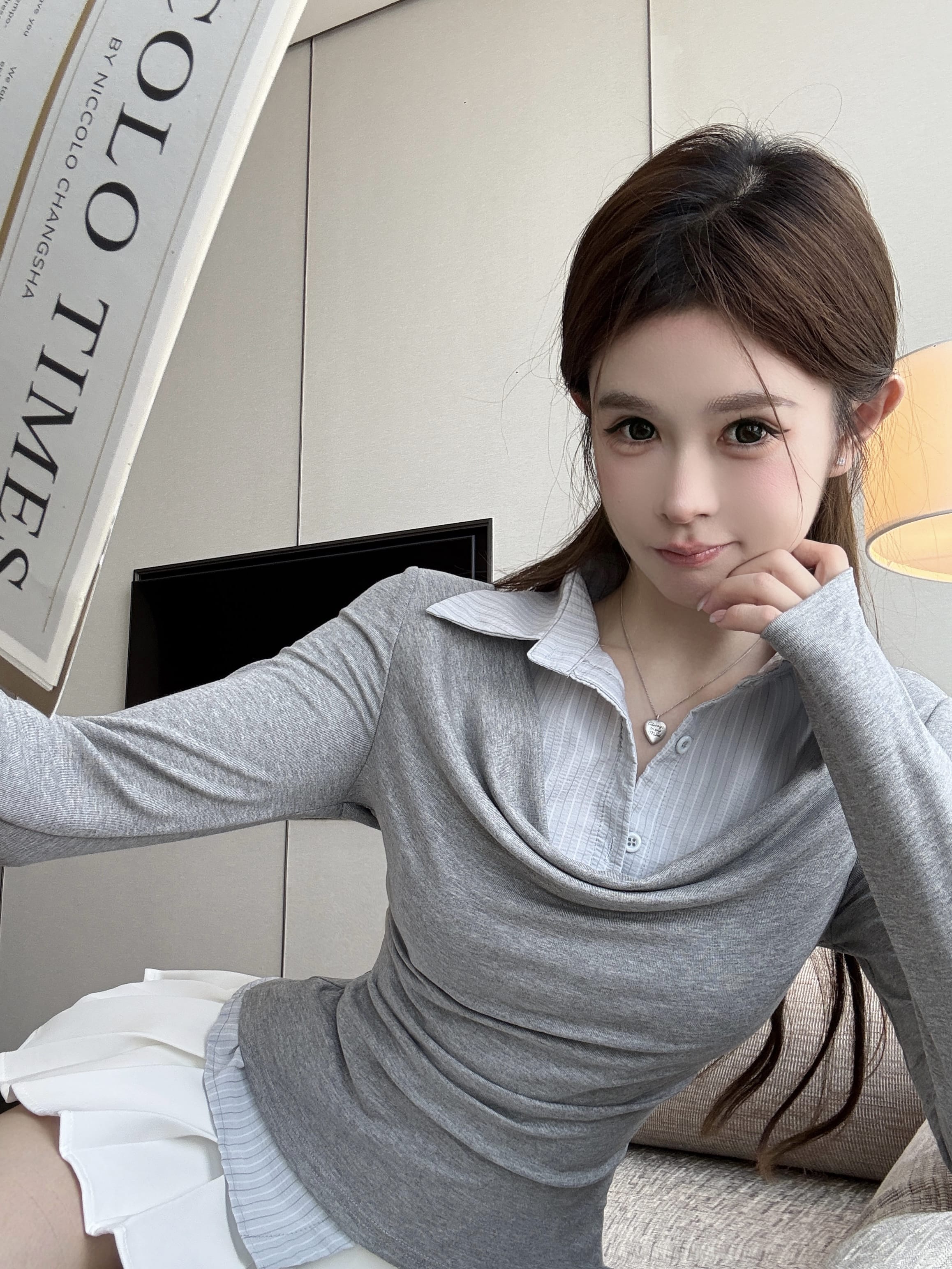 RY2899# 实拍实价 假两件长袖polo领T恤上衣拼接衬衫小众打底衫