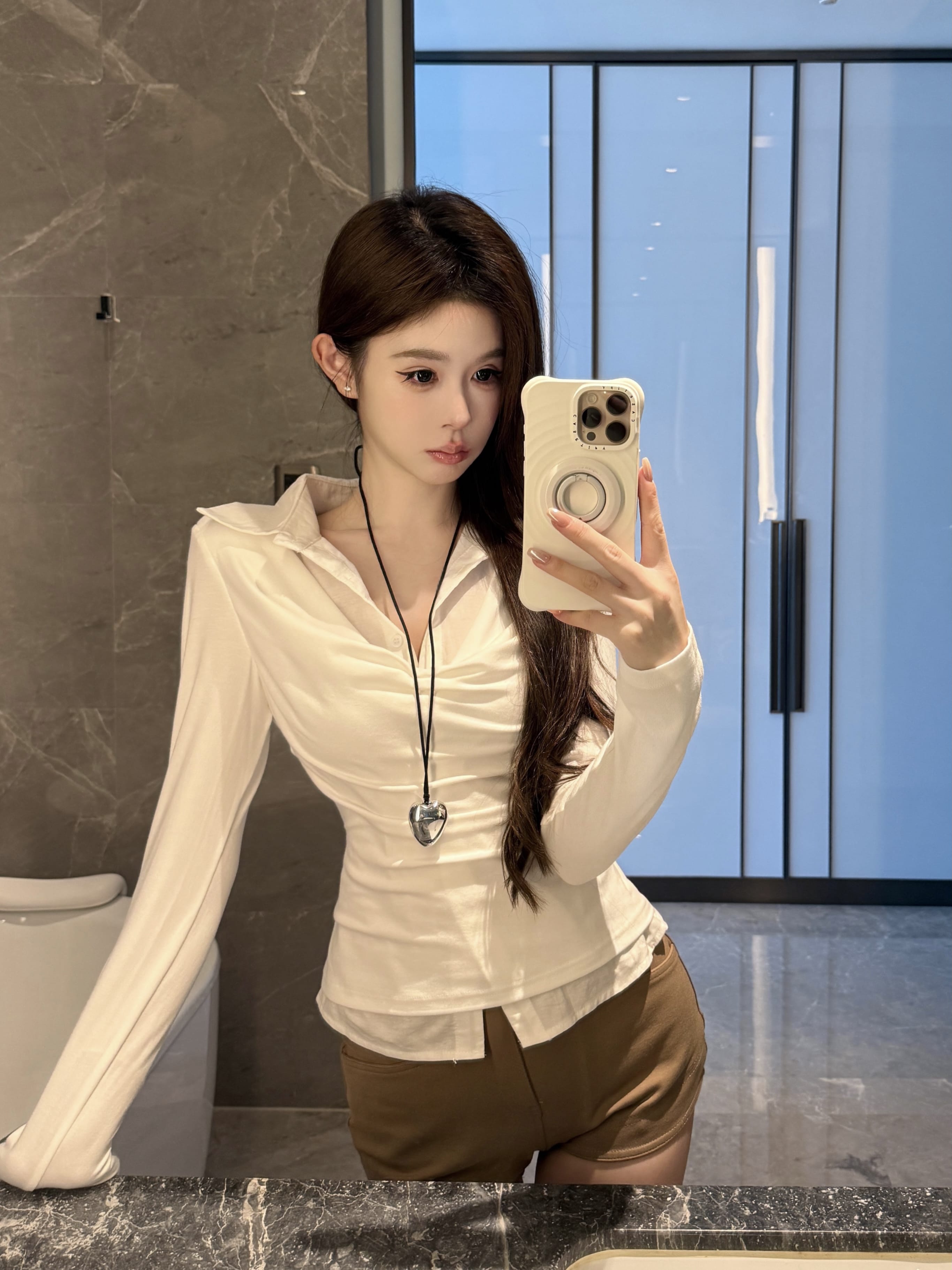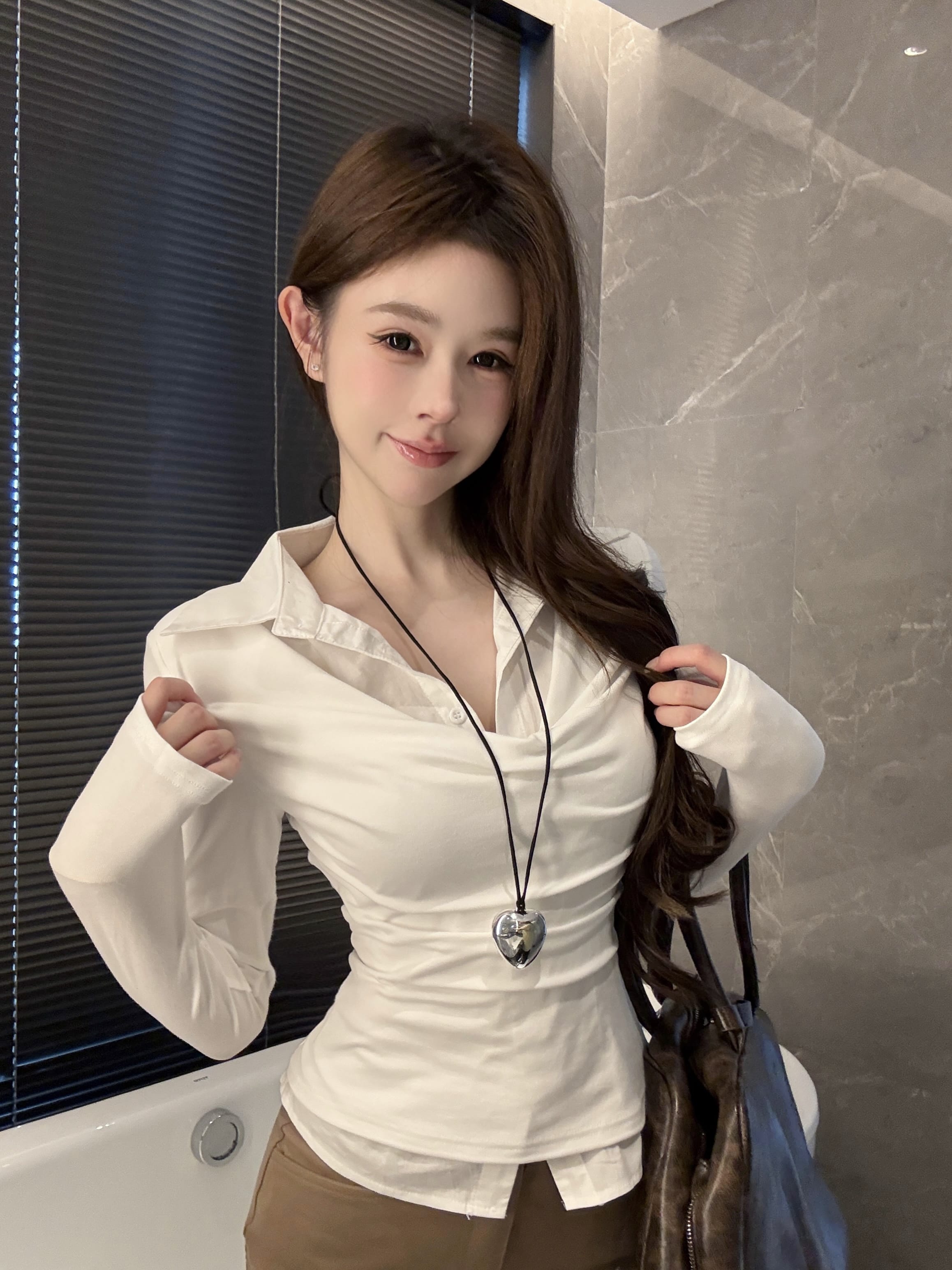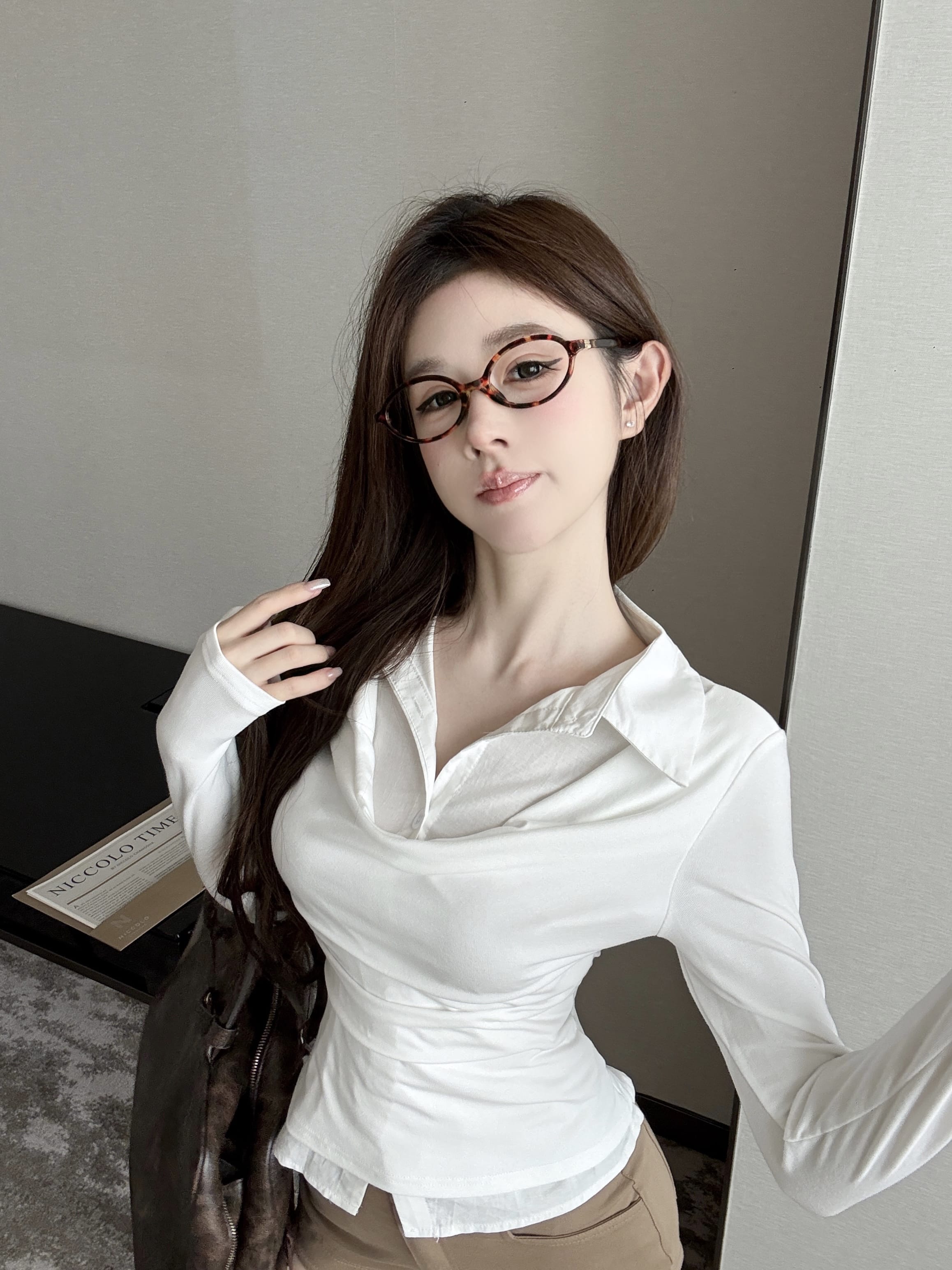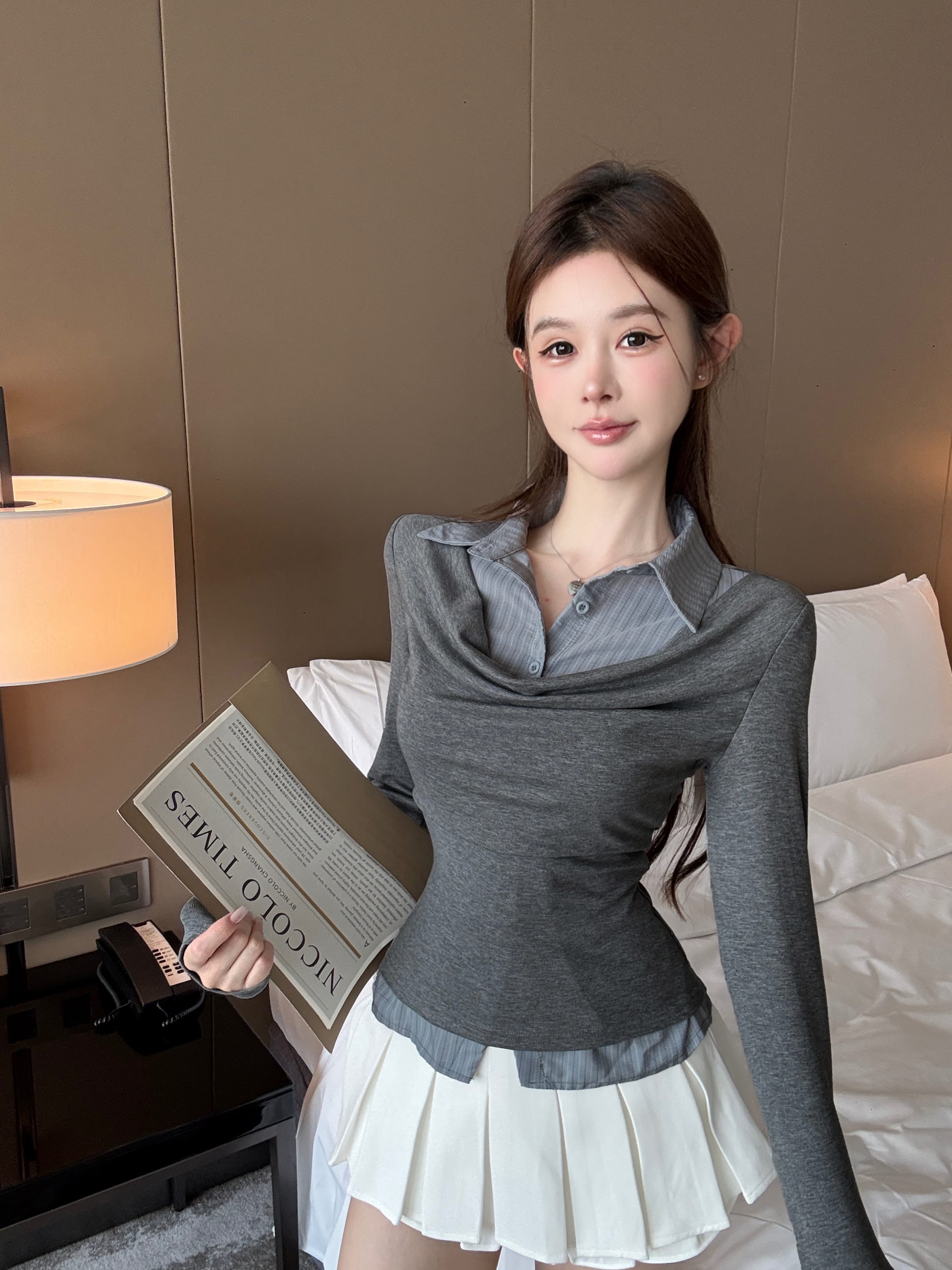 RY2899# 实拍实价 假两件长袖polo领T恤上衣拼接衬衫小众打底衫