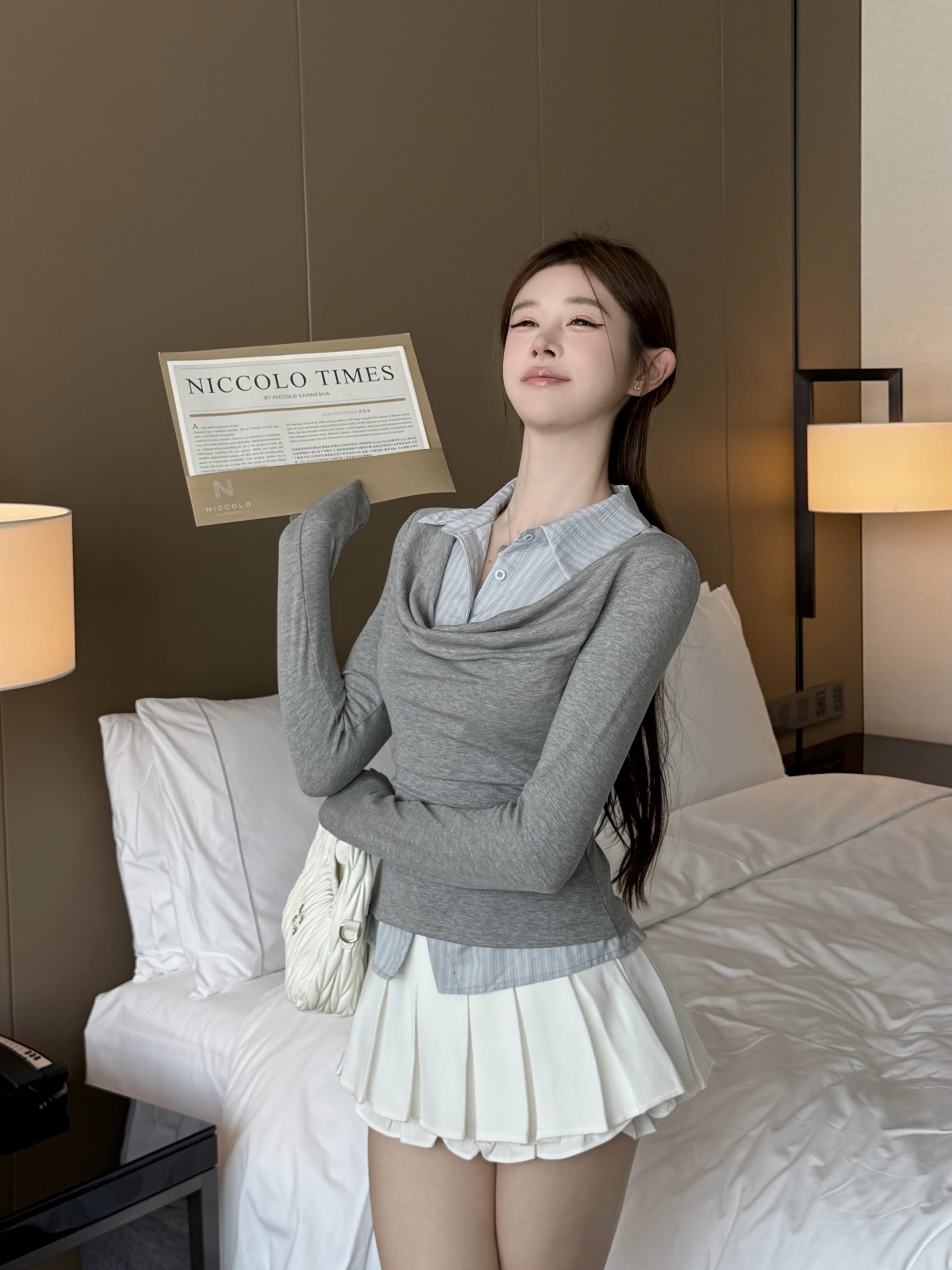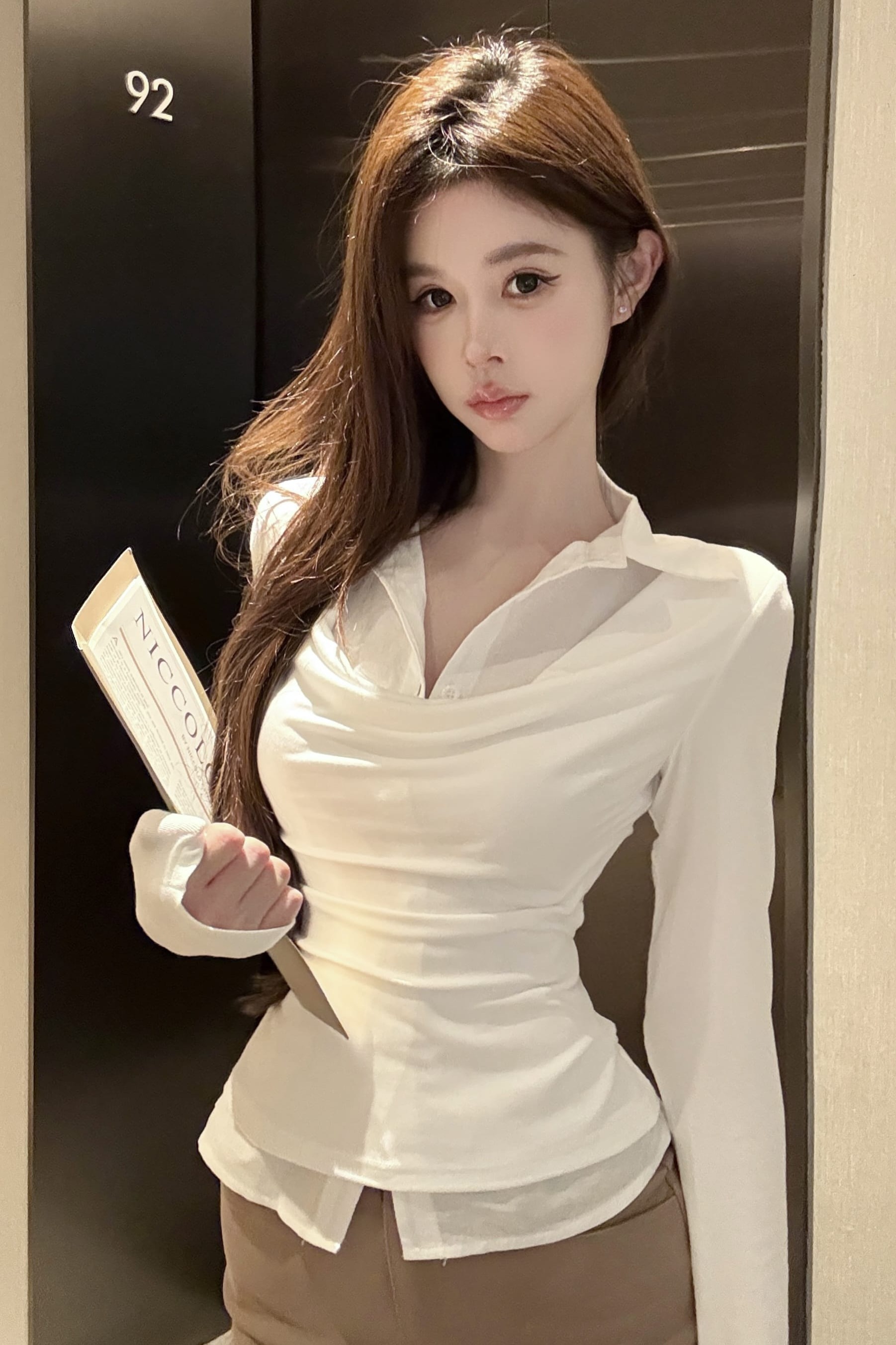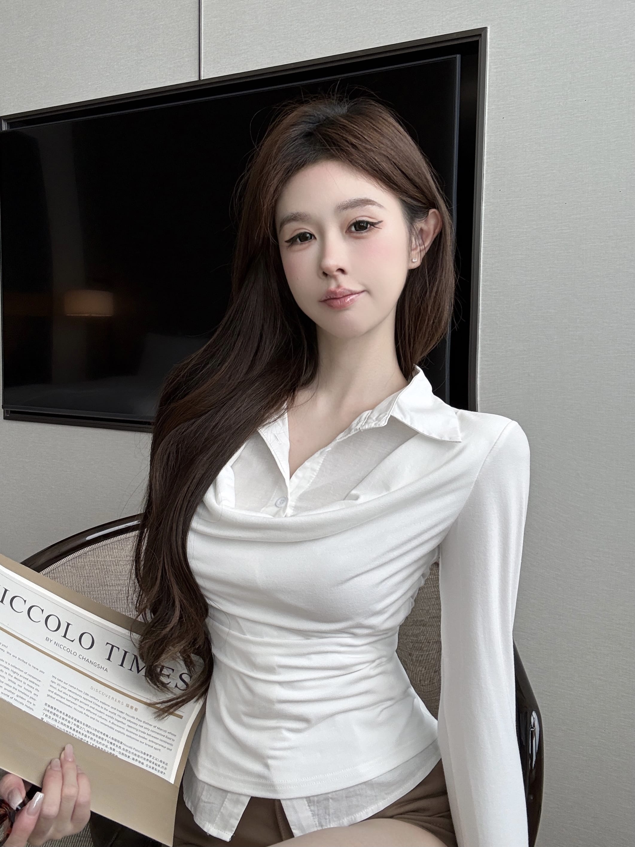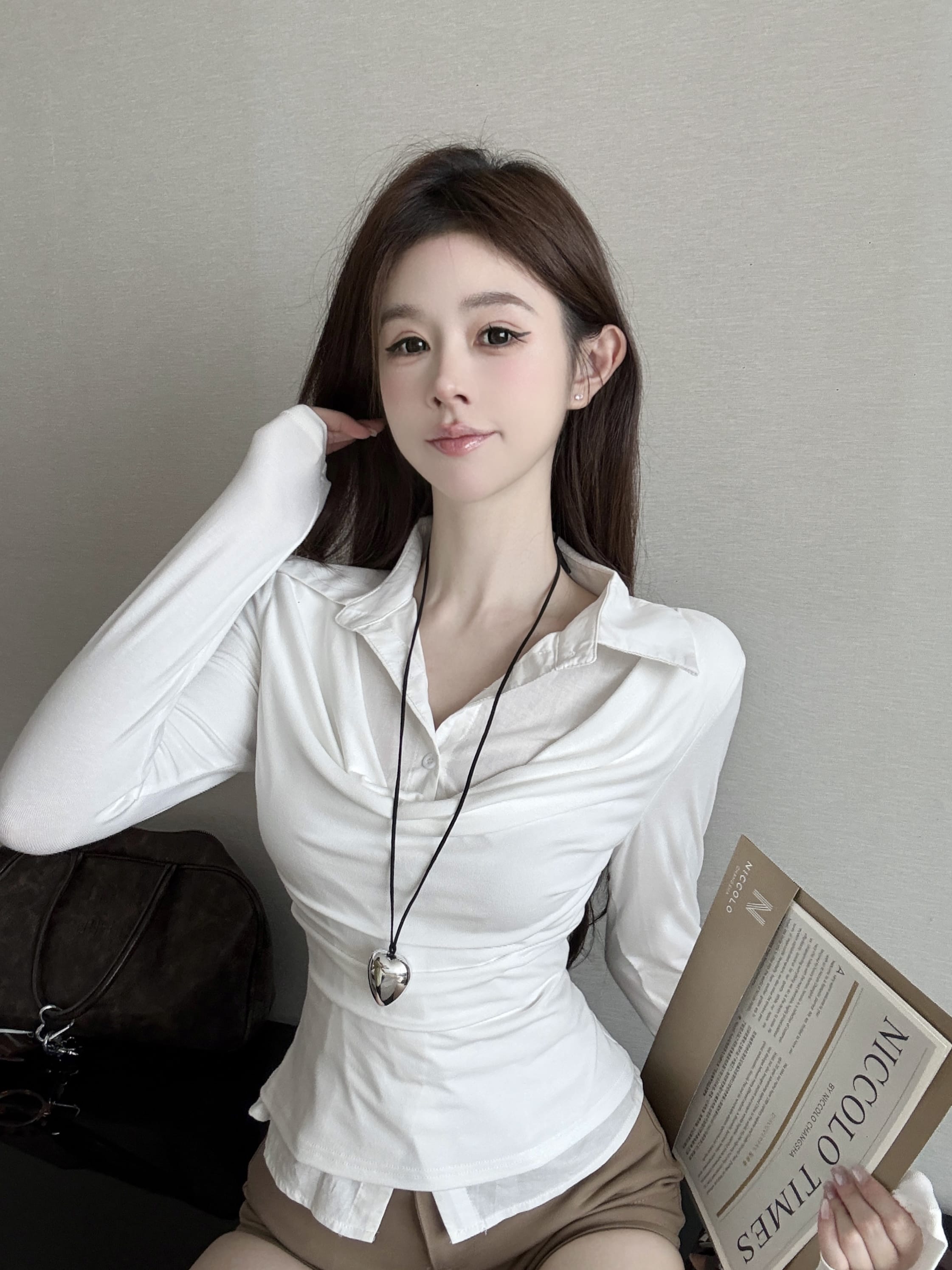 RY2899# 实拍实价 假两件长袖polo领T恤上衣拼接衬衫小众打底衫