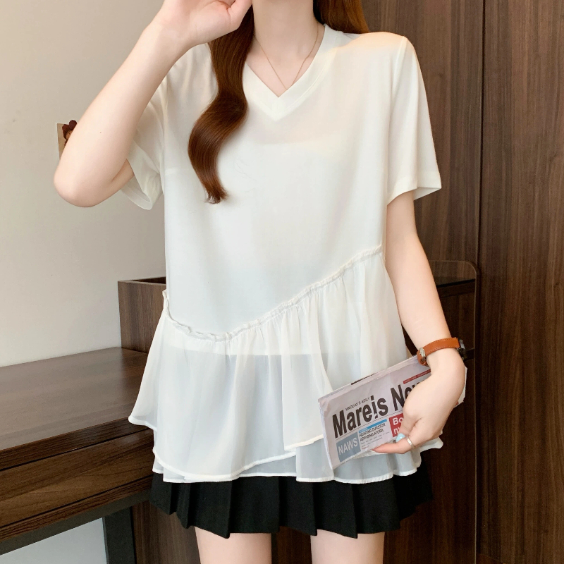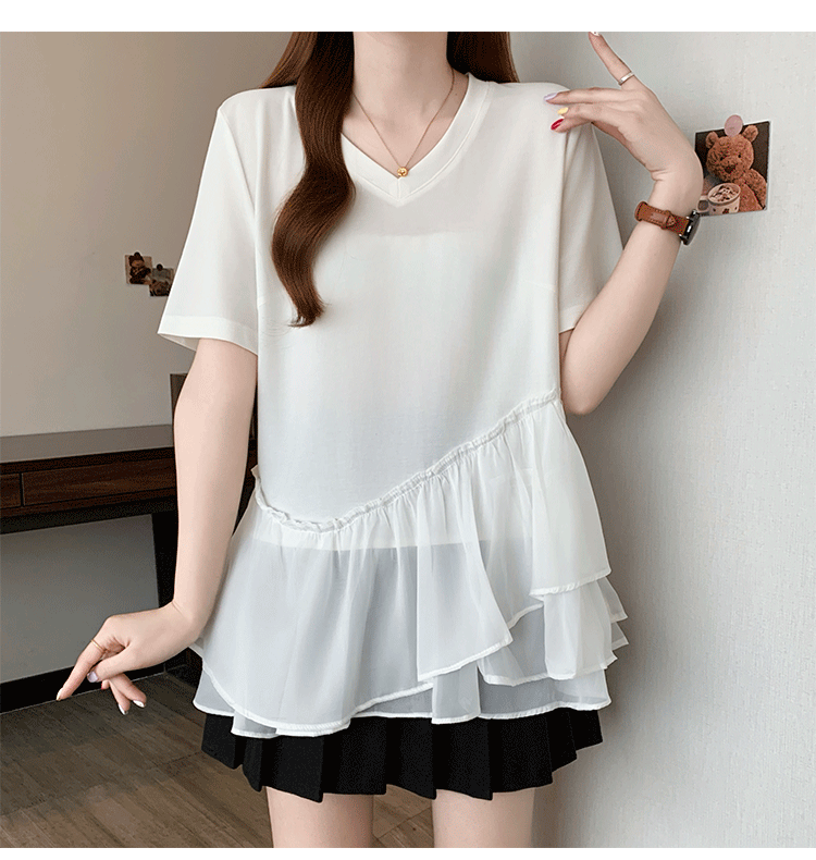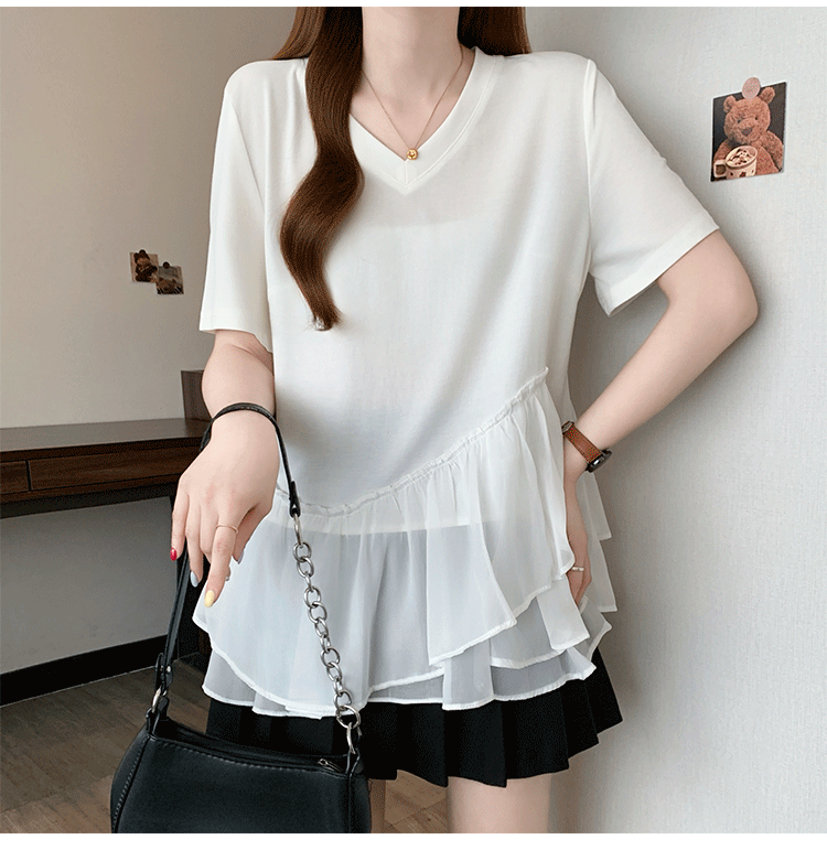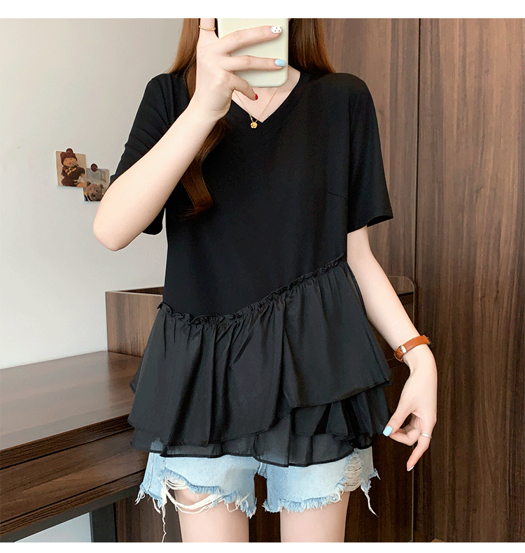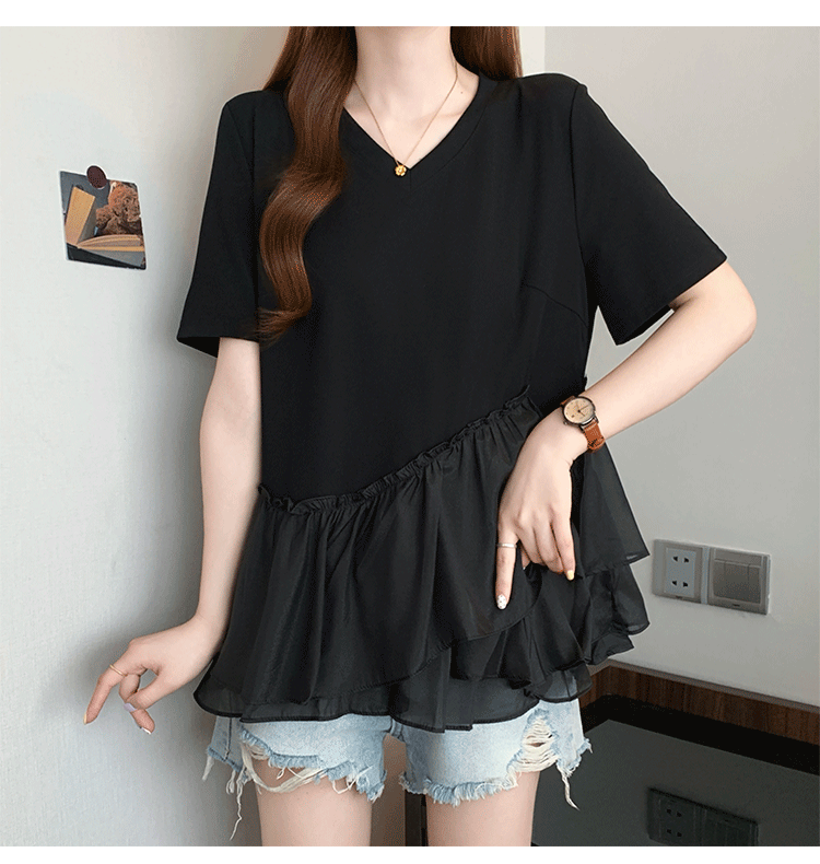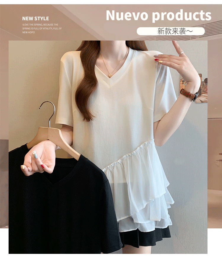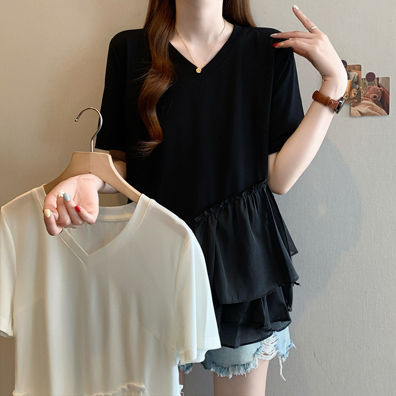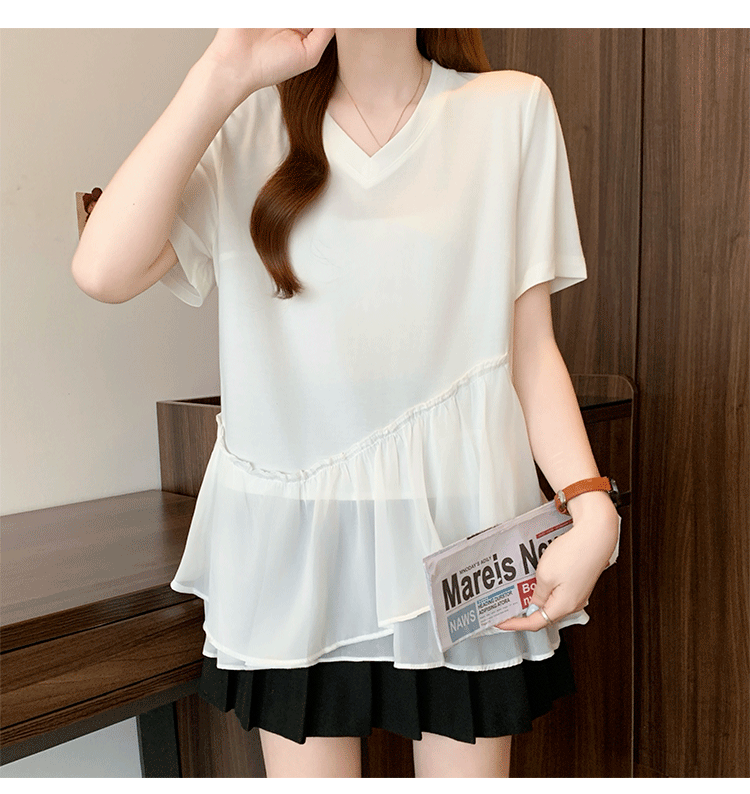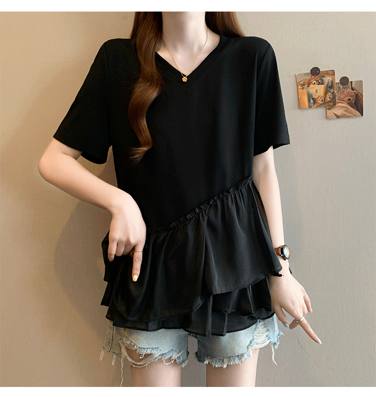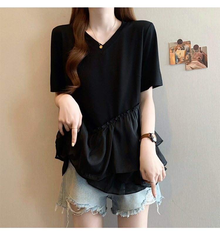 RY2901# 实拍2026夏季新款大码女韩版时尚宽松遮肉显瘦不规则拼接T恤上衣