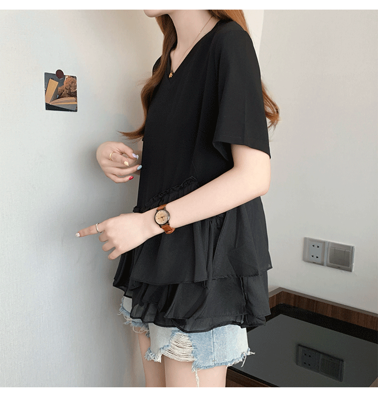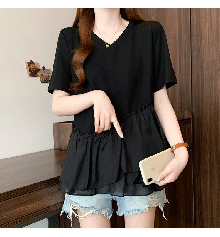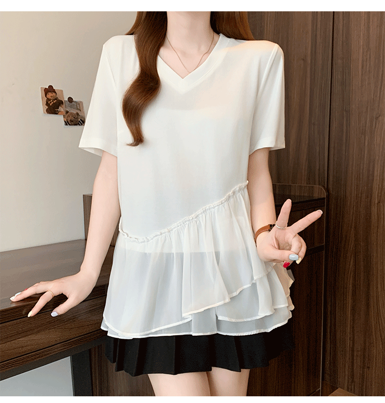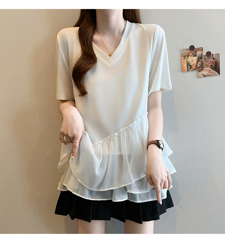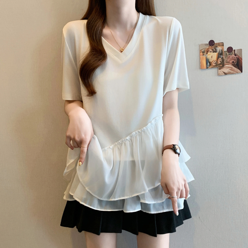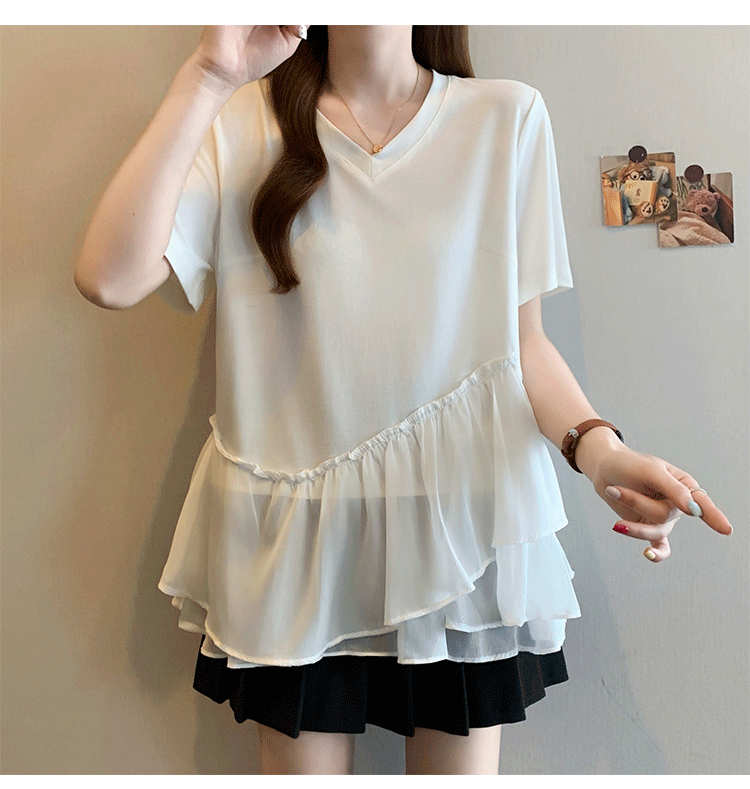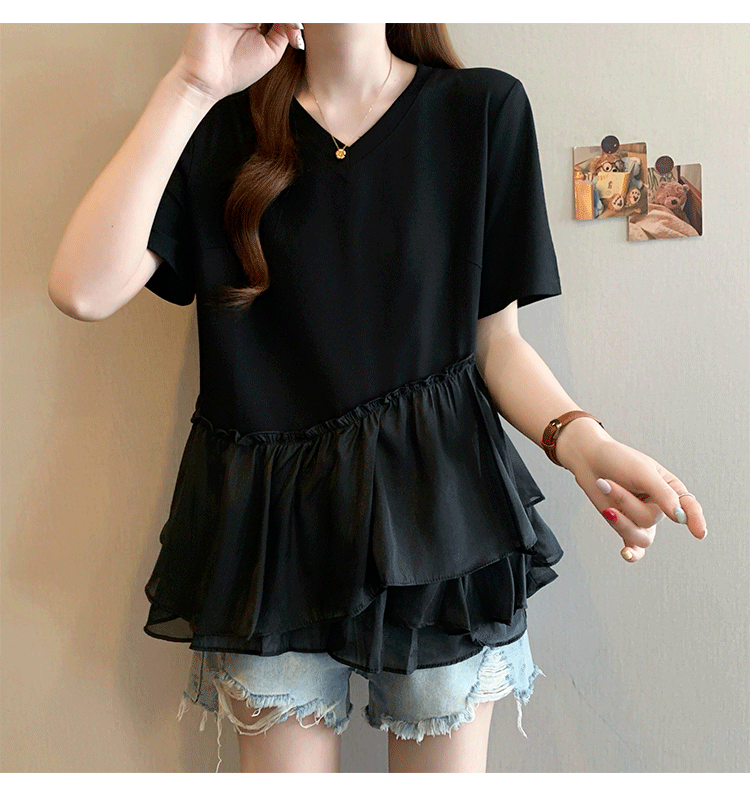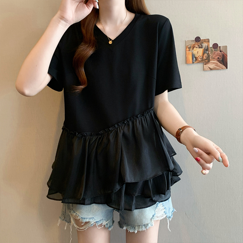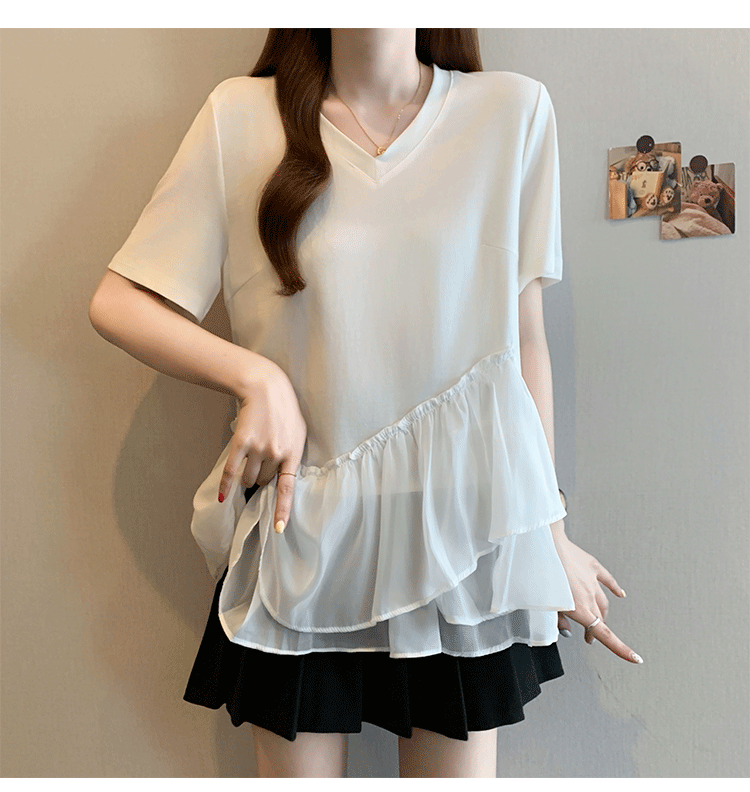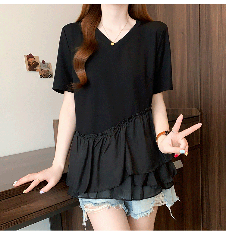 RY2901# 实拍2026夏季新款大码女韩版时尚宽松遮肉显瘦不规则拼接T恤上衣