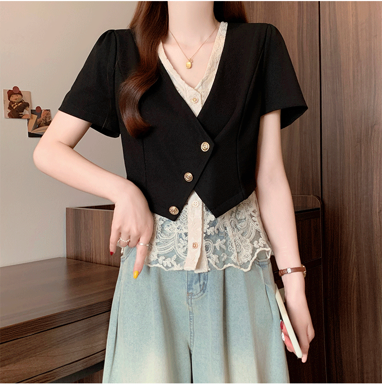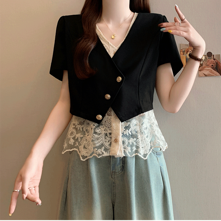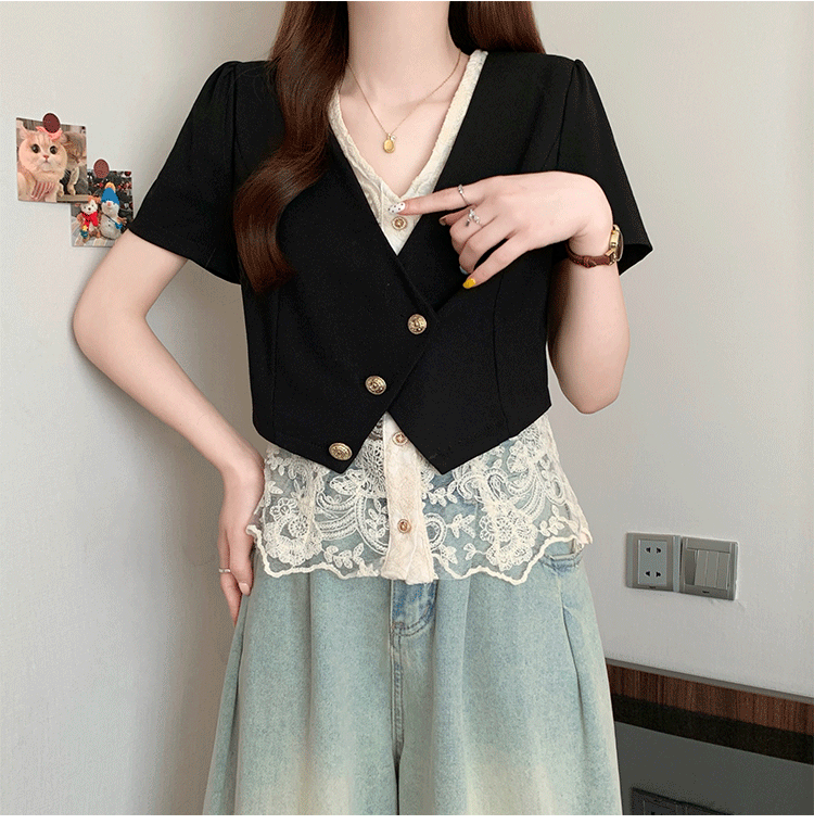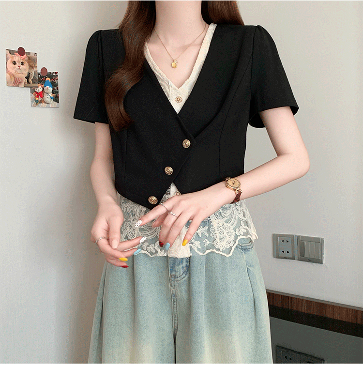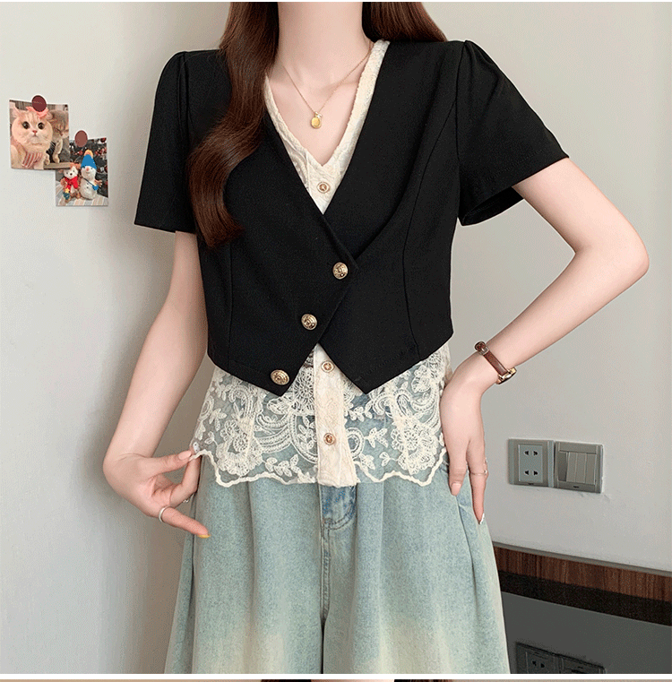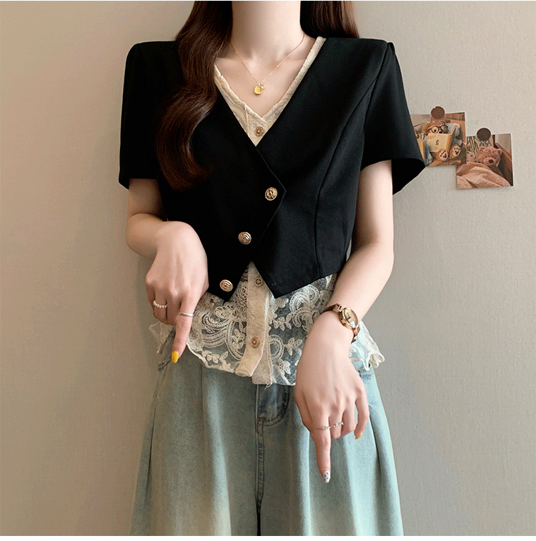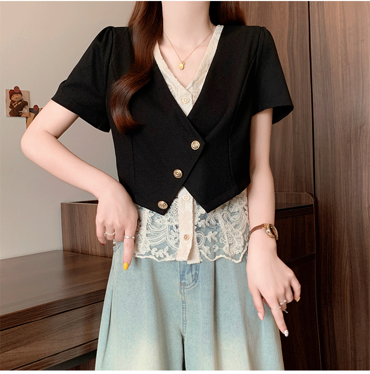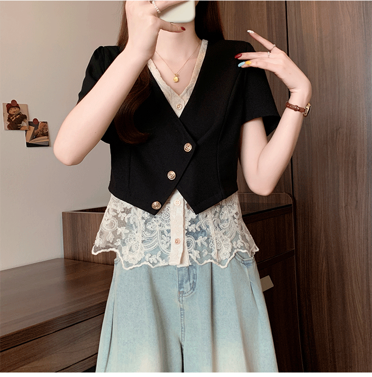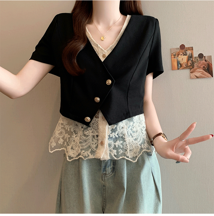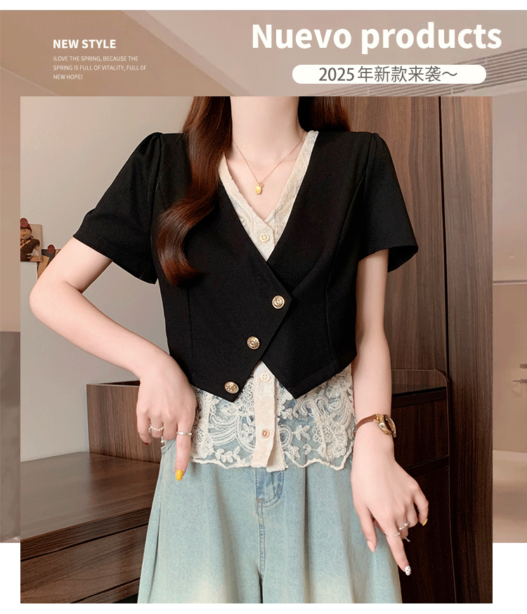 RY2904# 实拍2026夏季新款大码女装时尚气质显瘦遮肚蕾丝拼接假两件上衣