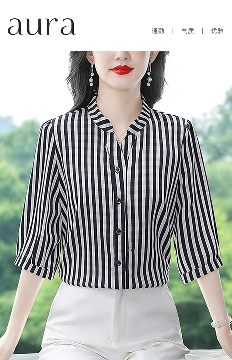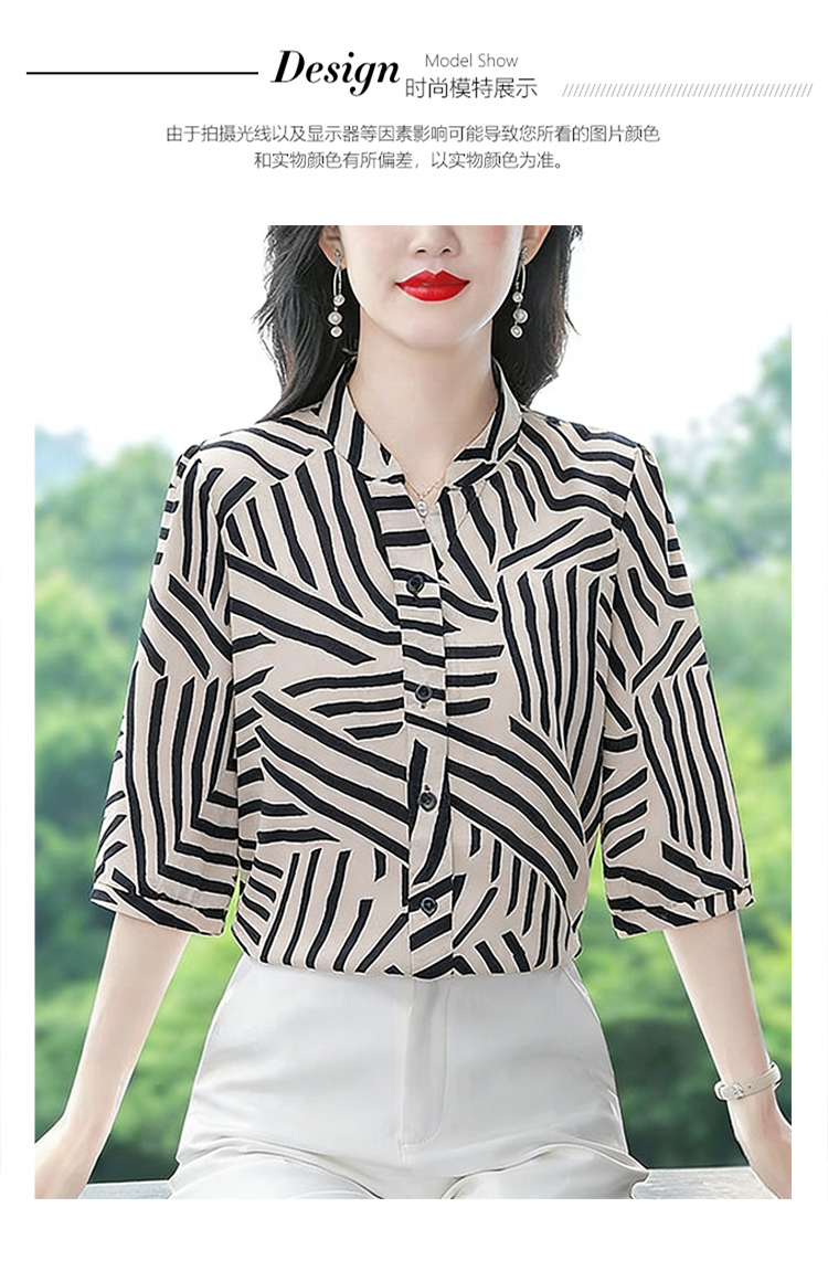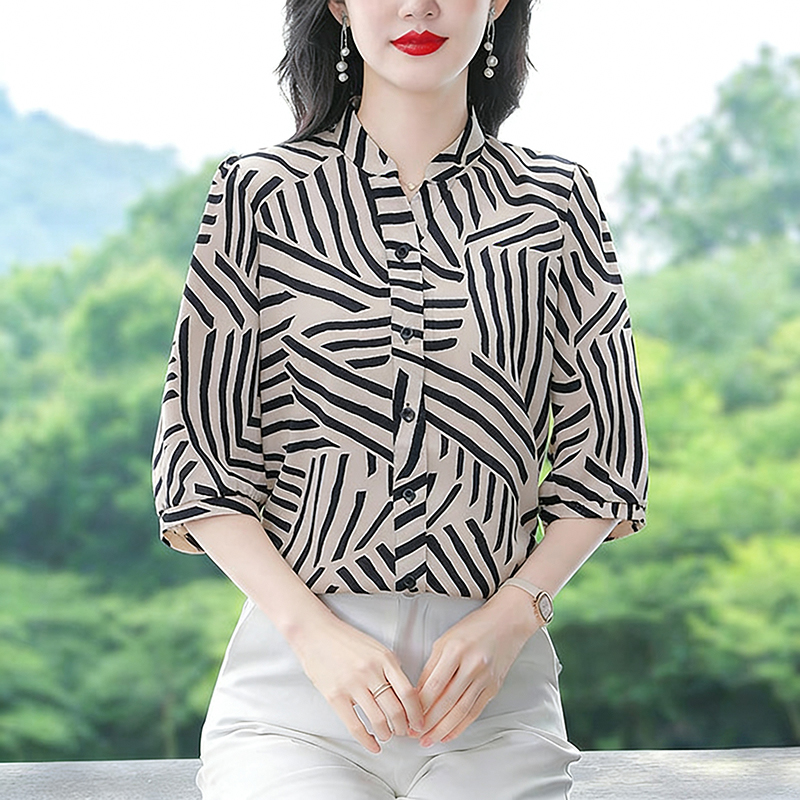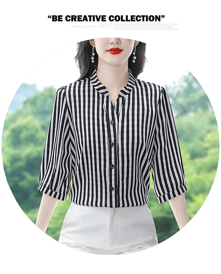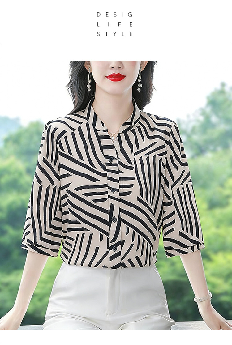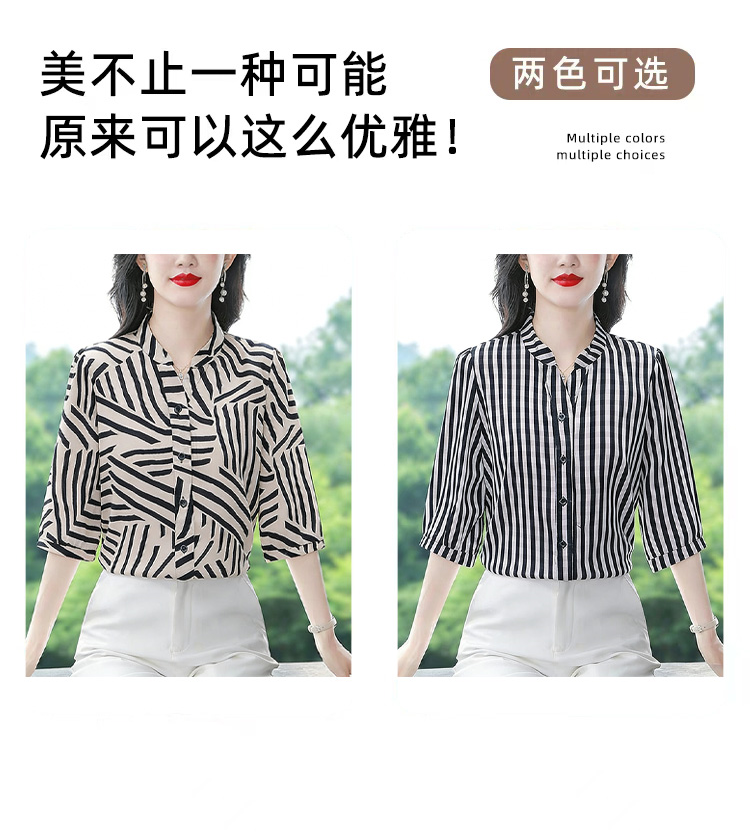 RY2909# 实拍2026夏季新款时尚韩系条纹格子印花衫气气质中袖雪纺衫上衣女