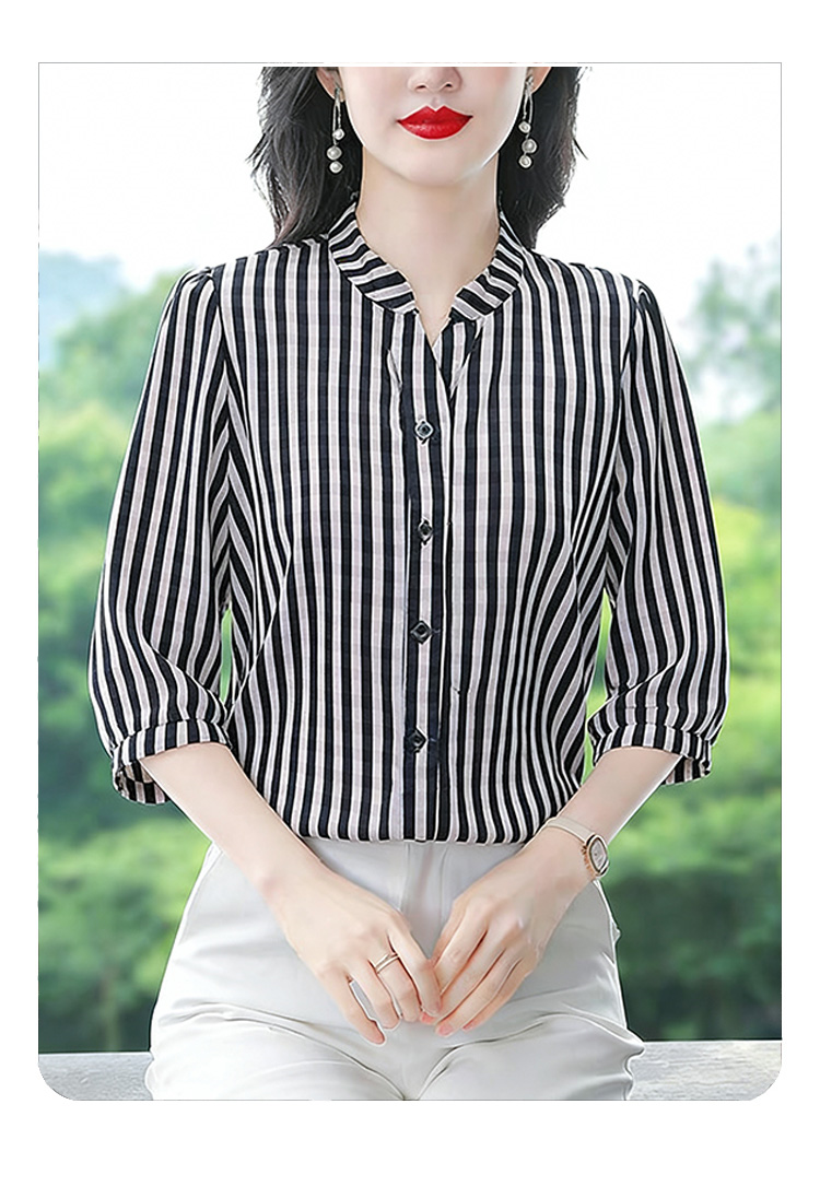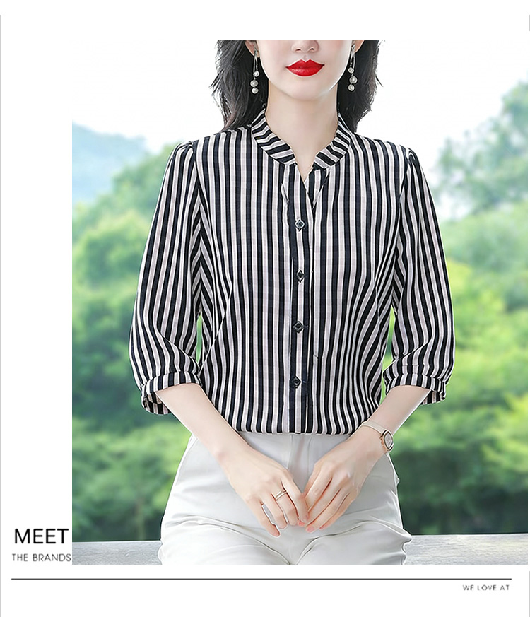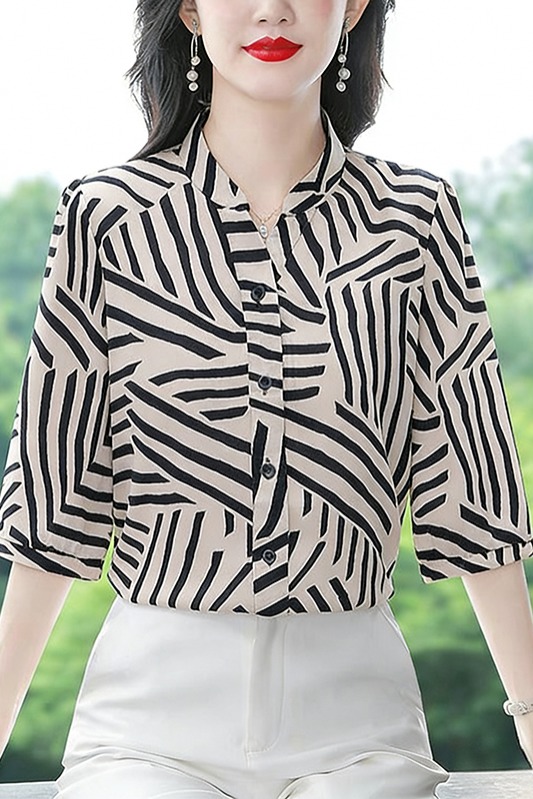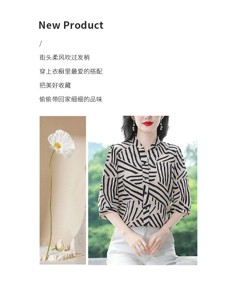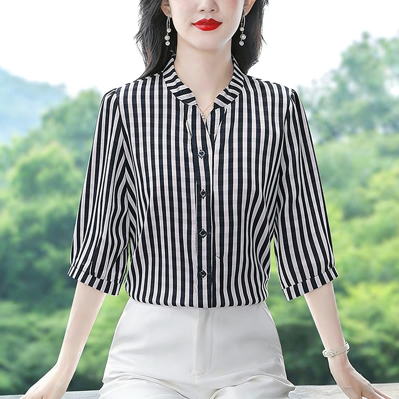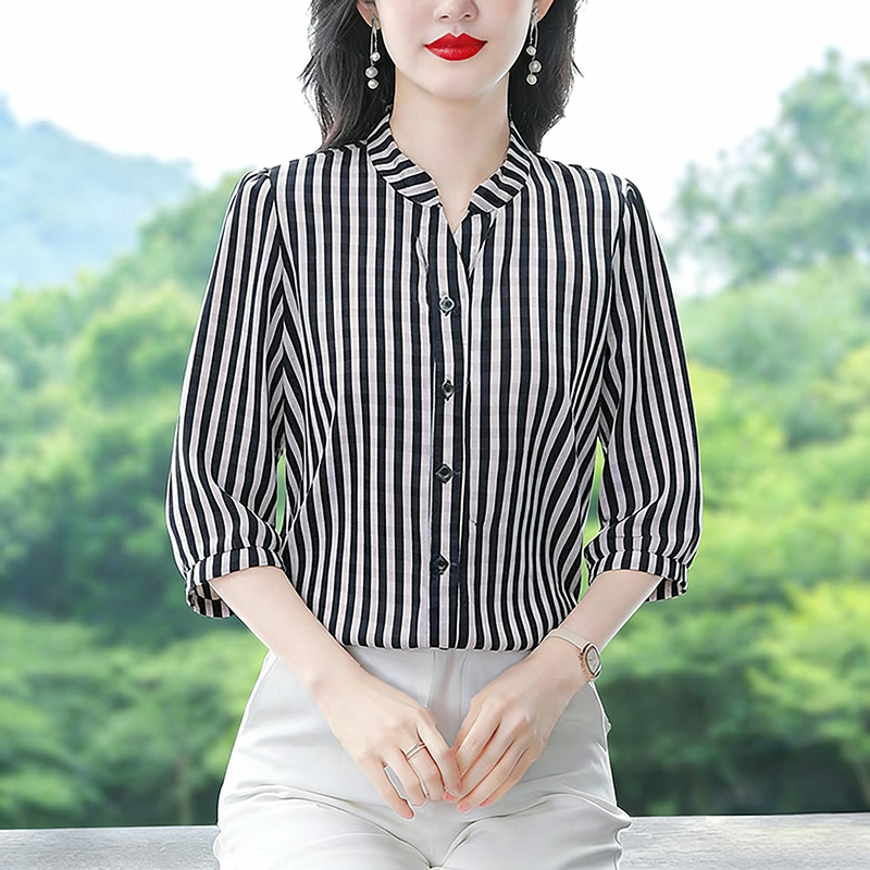 RY2909# 实拍2026夏季新款时尚韩系条纹格子印花衫气气质中袖雪纺衫上衣女