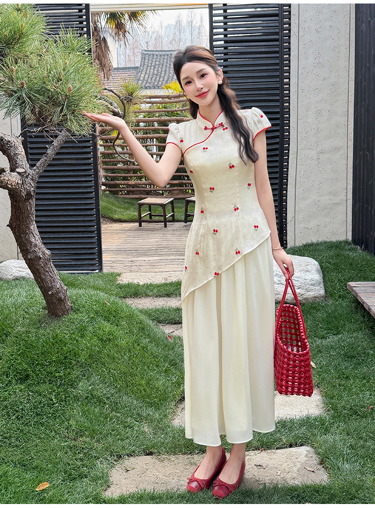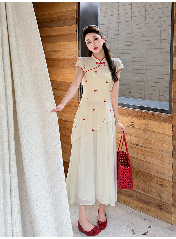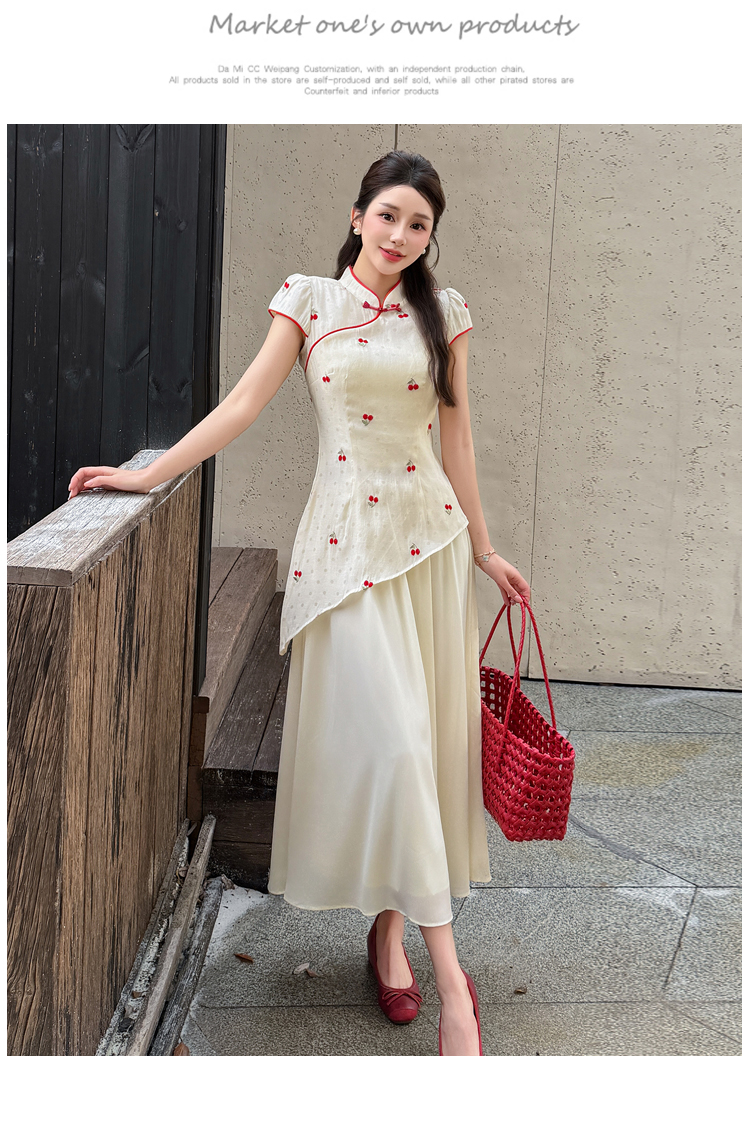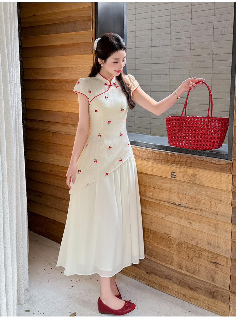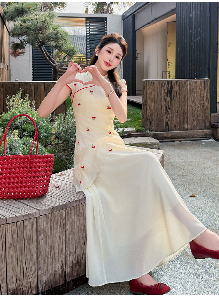 RY2910# 实拍夏季改良旗袍刺绣樱桃甜美拼接大摆改良旗袍连衣裙