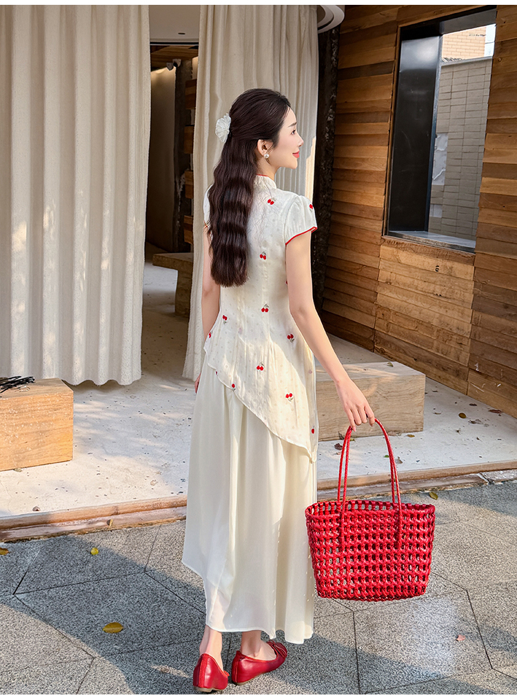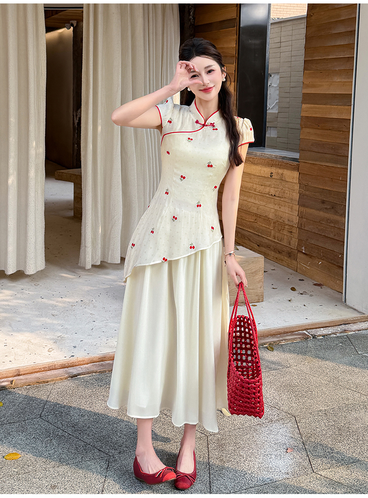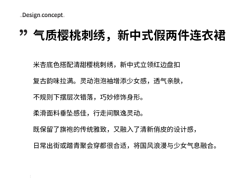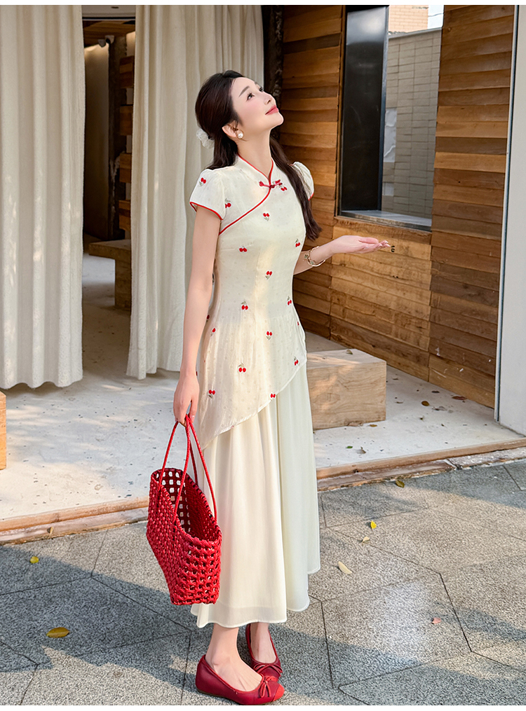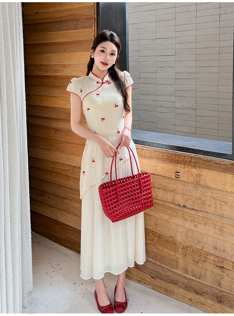 RY2910# 实拍夏季改良旗袍刺绣樱桃甜美拼接大摆改良旗袍连衣裙