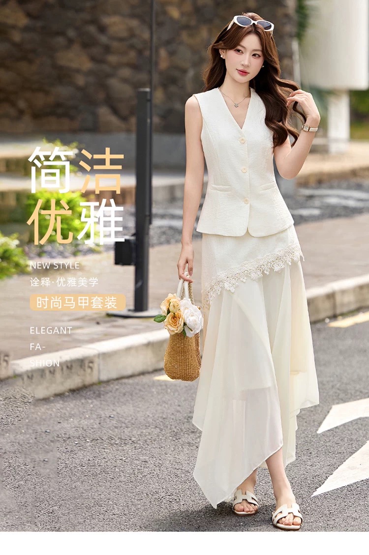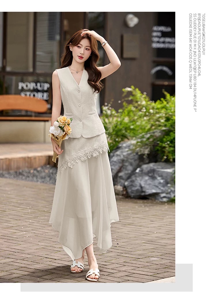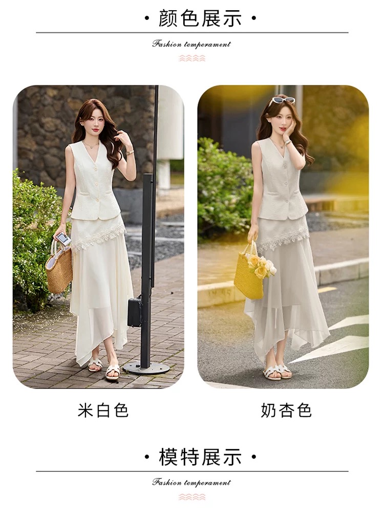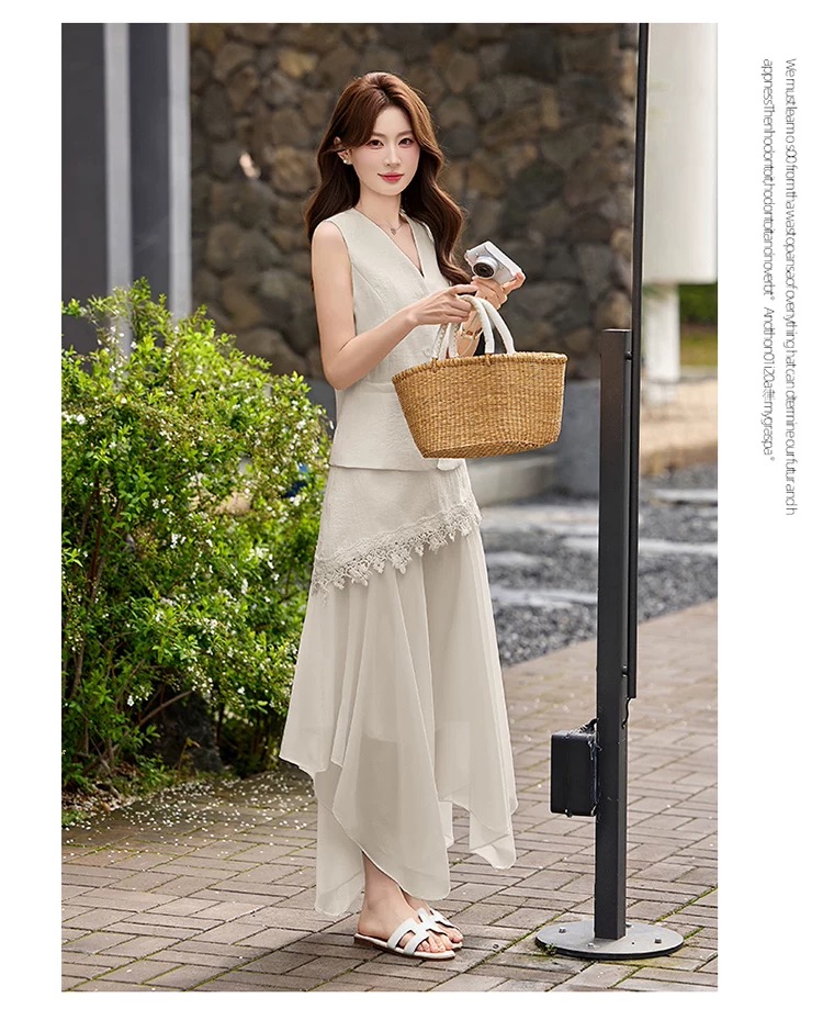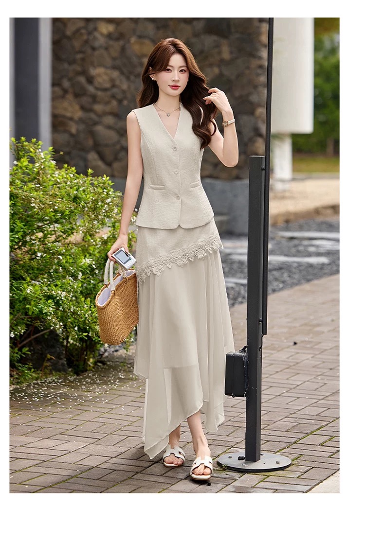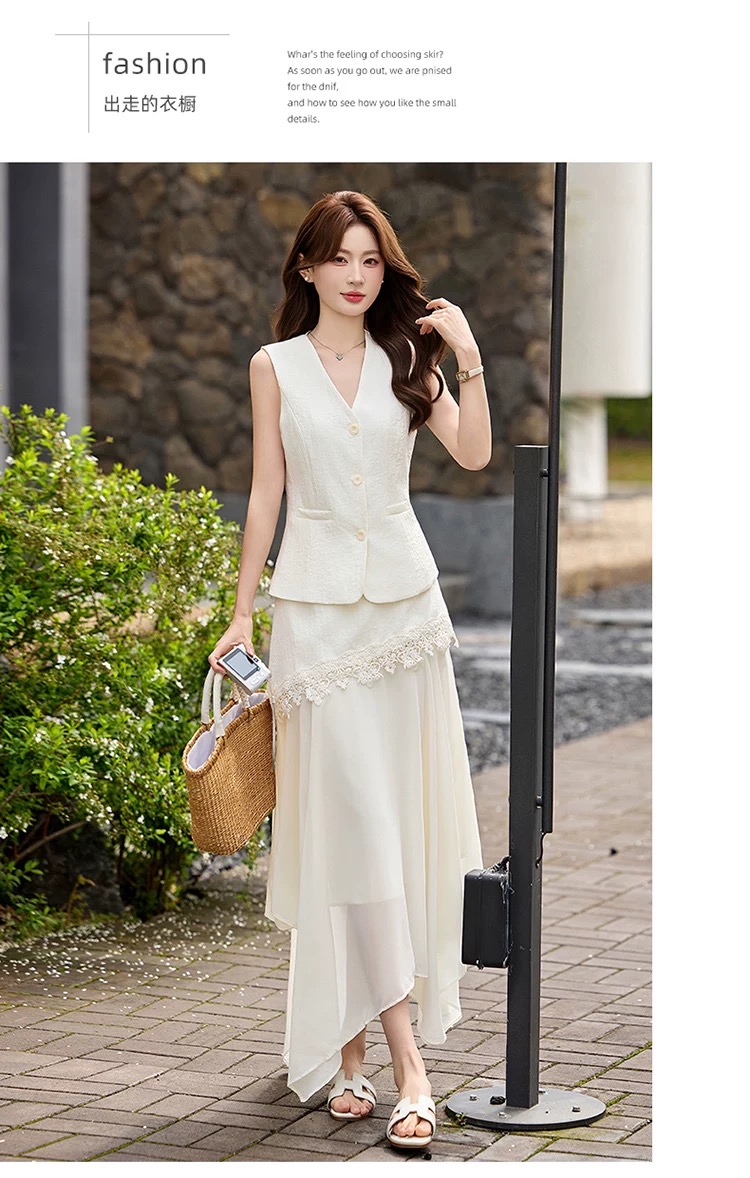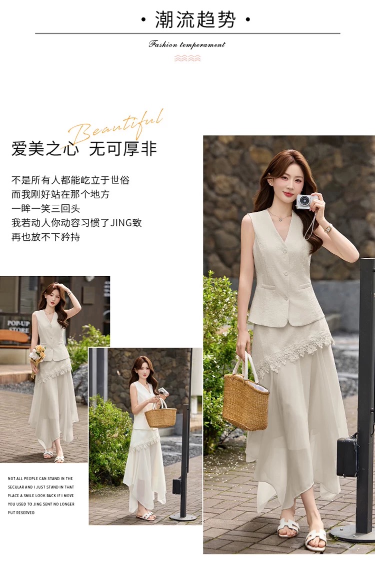 RY2922# 轻熟风V领无袖蕾丝拼接套装女显瘦气质两件套半身裙