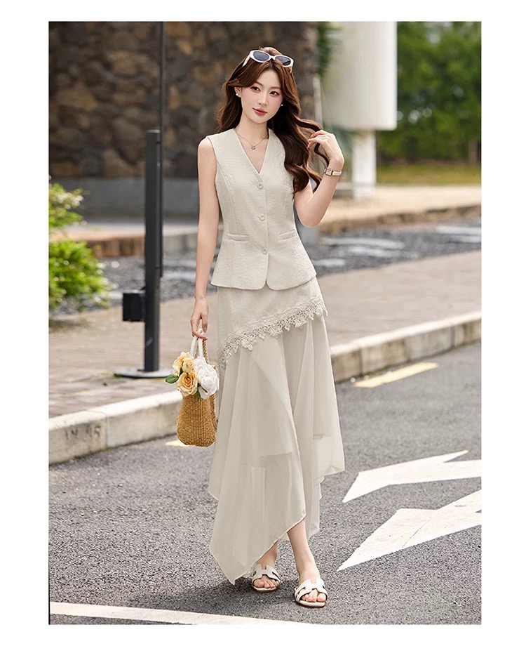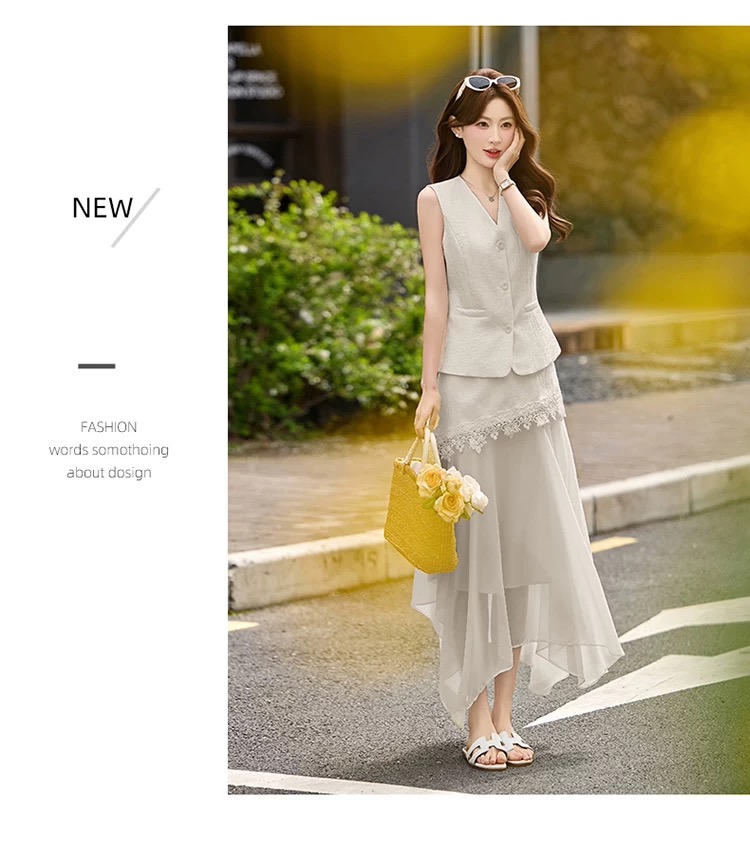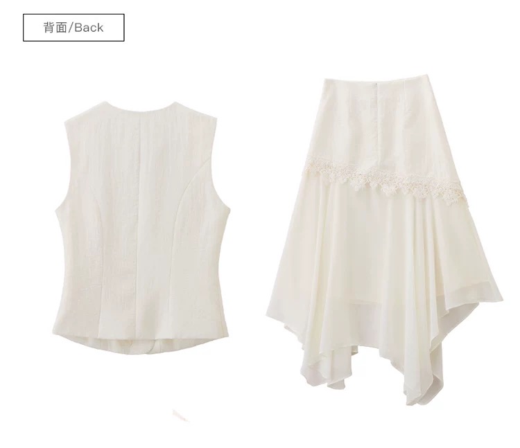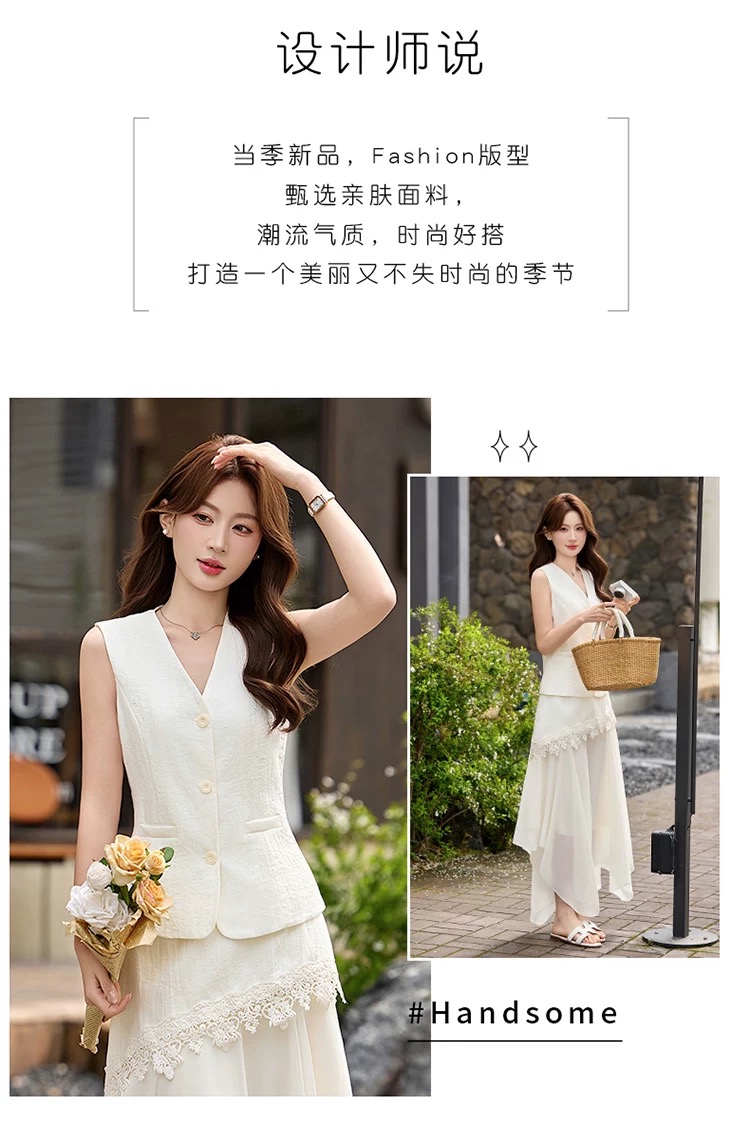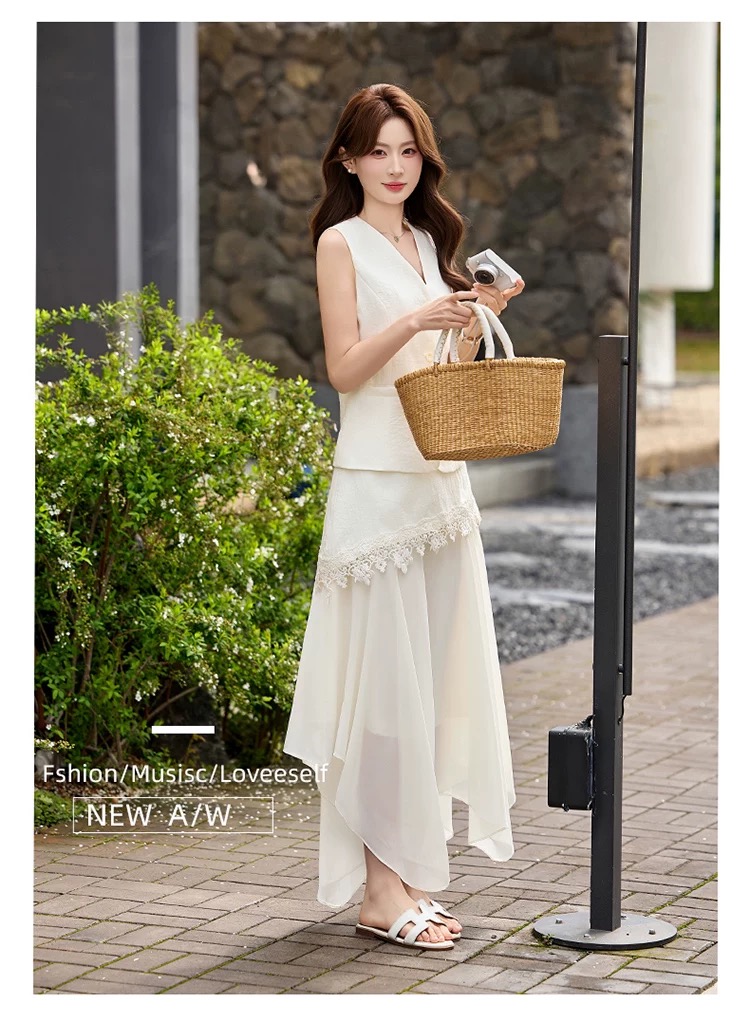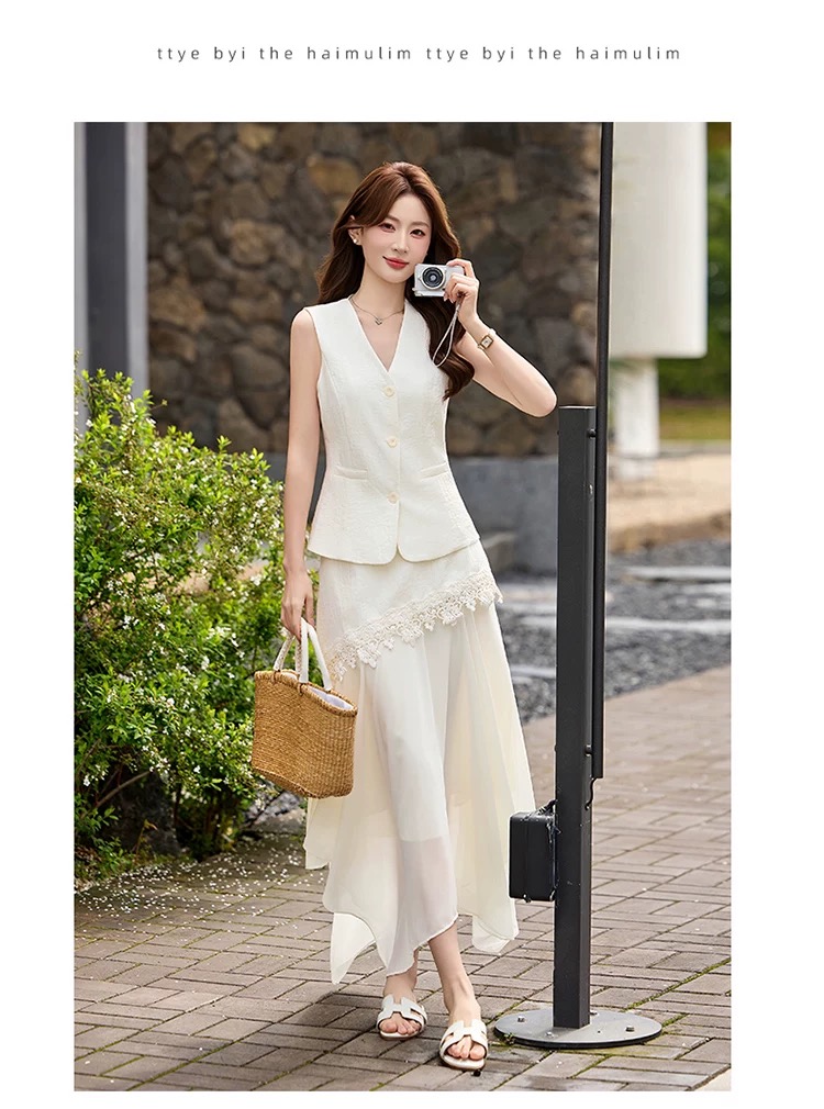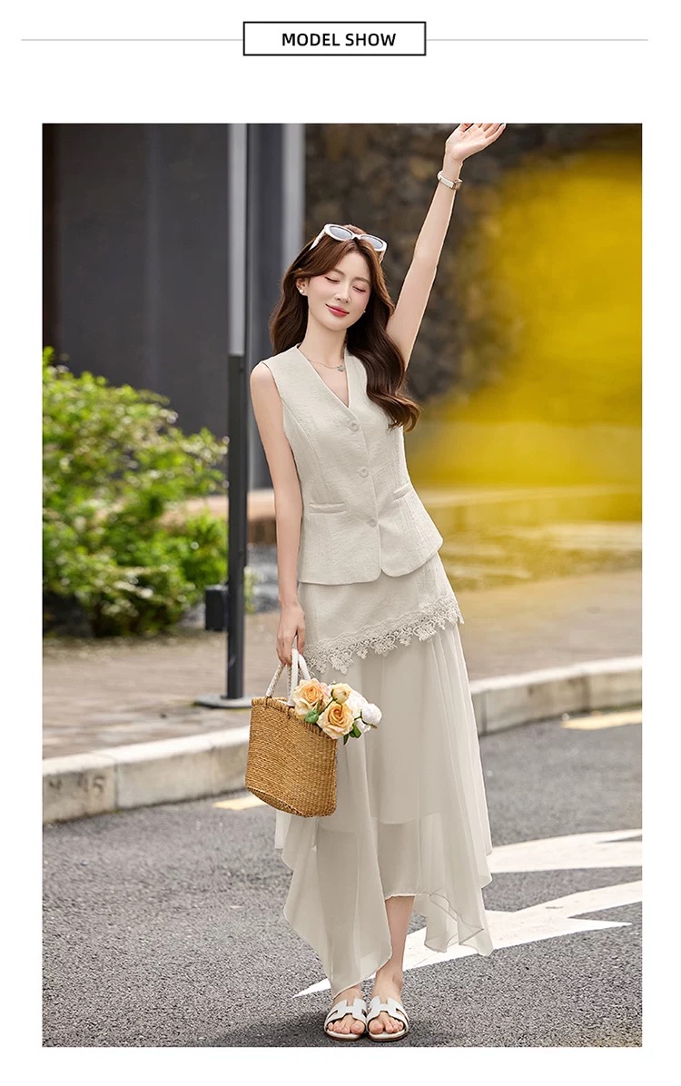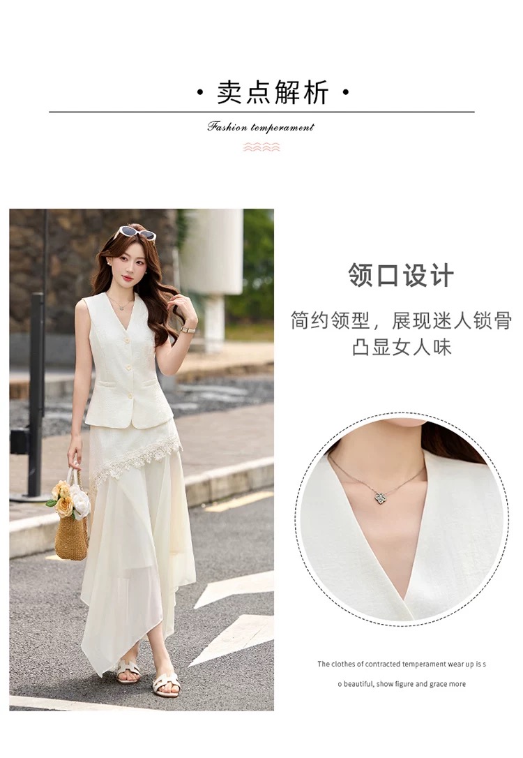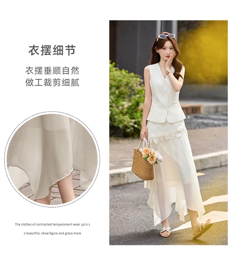 RY2922# 轻熟风V领无袖蕾丝拼接套装女显瘦气质两件套半身裙