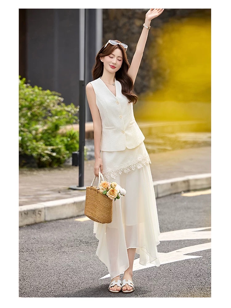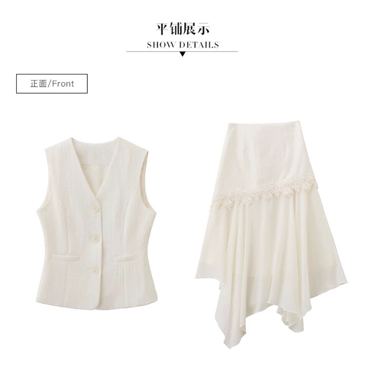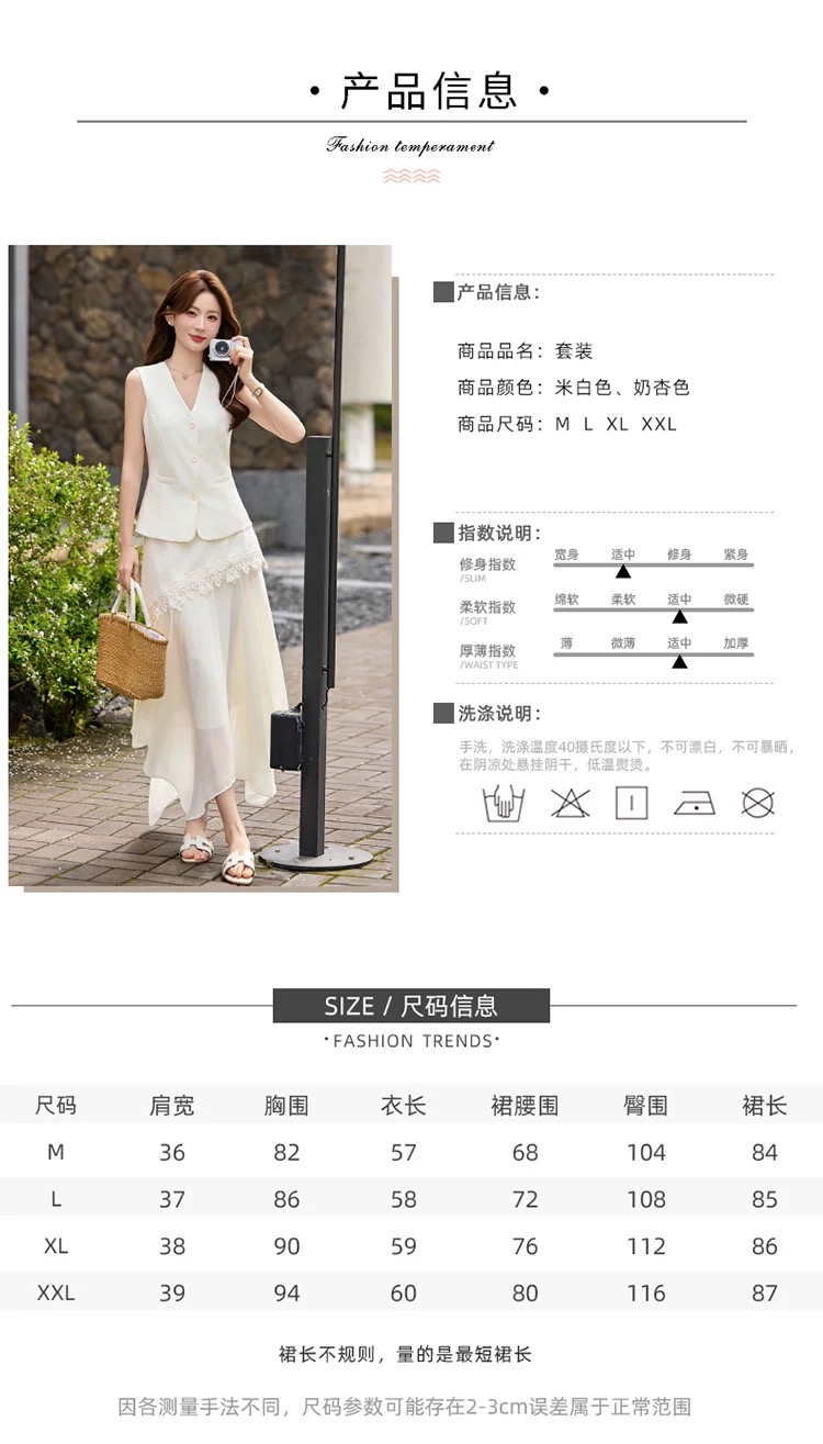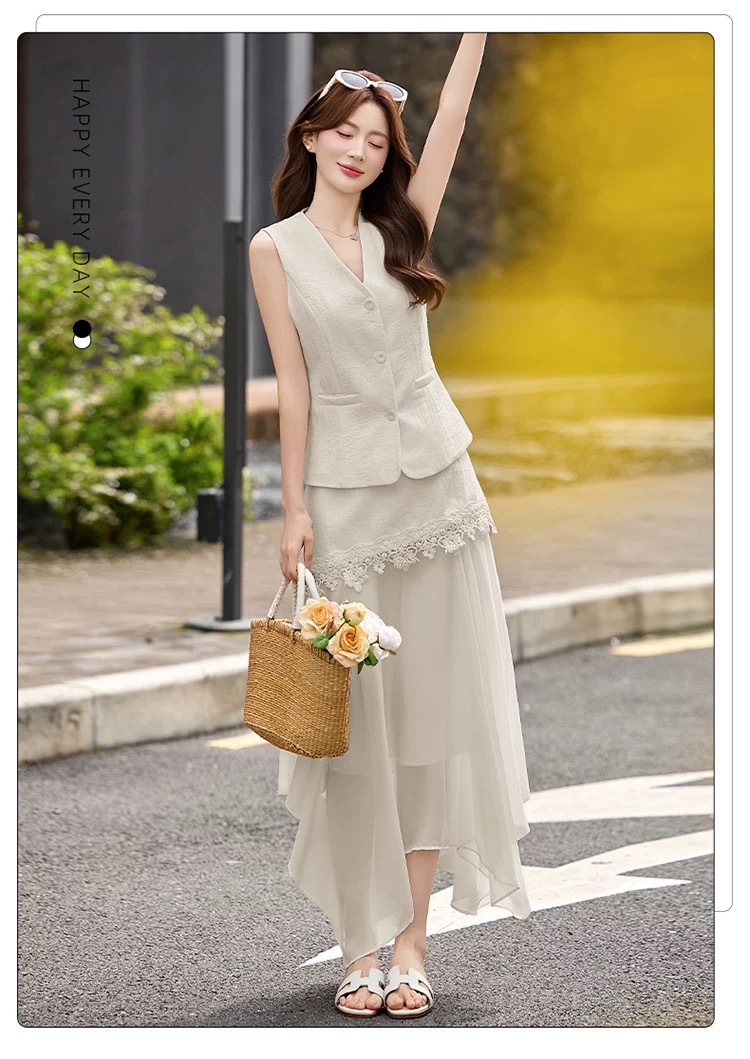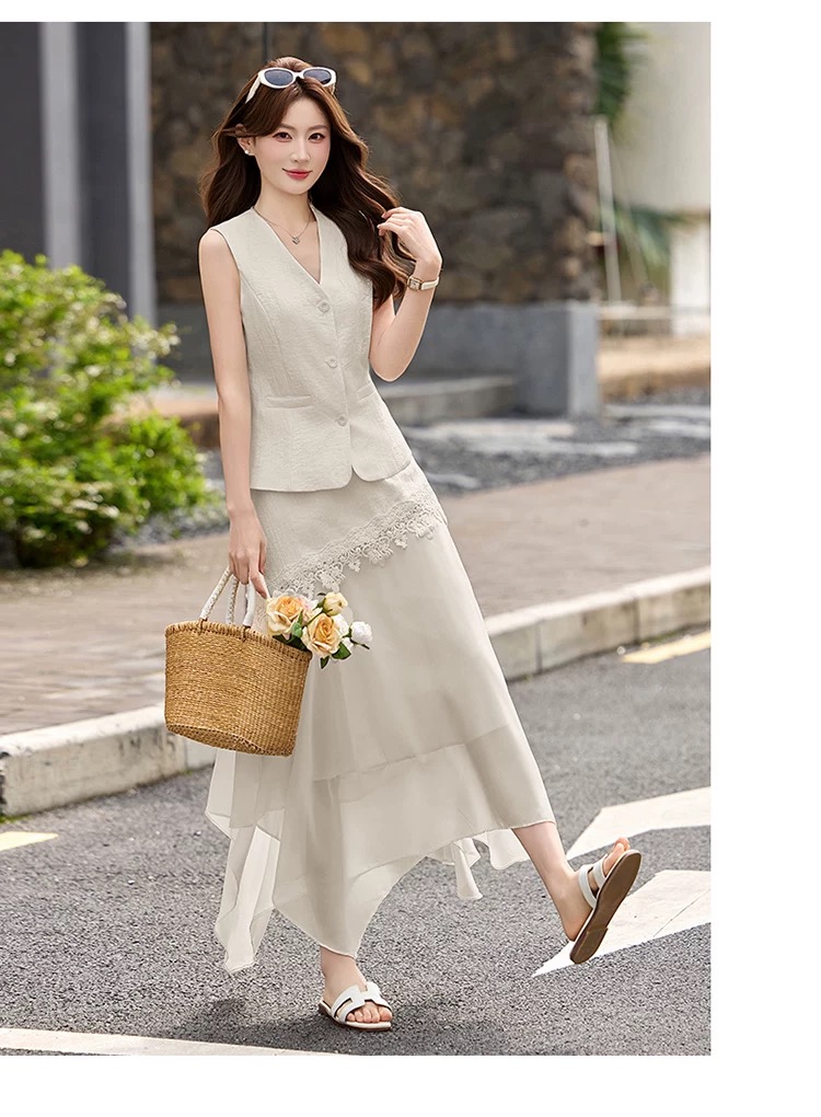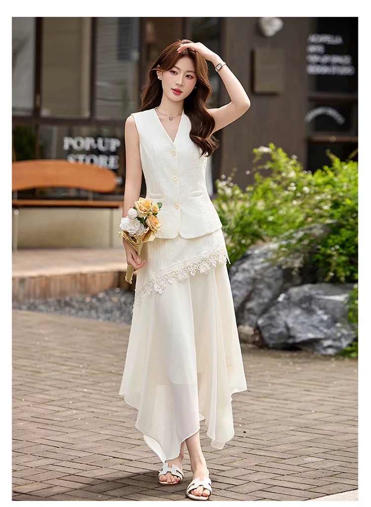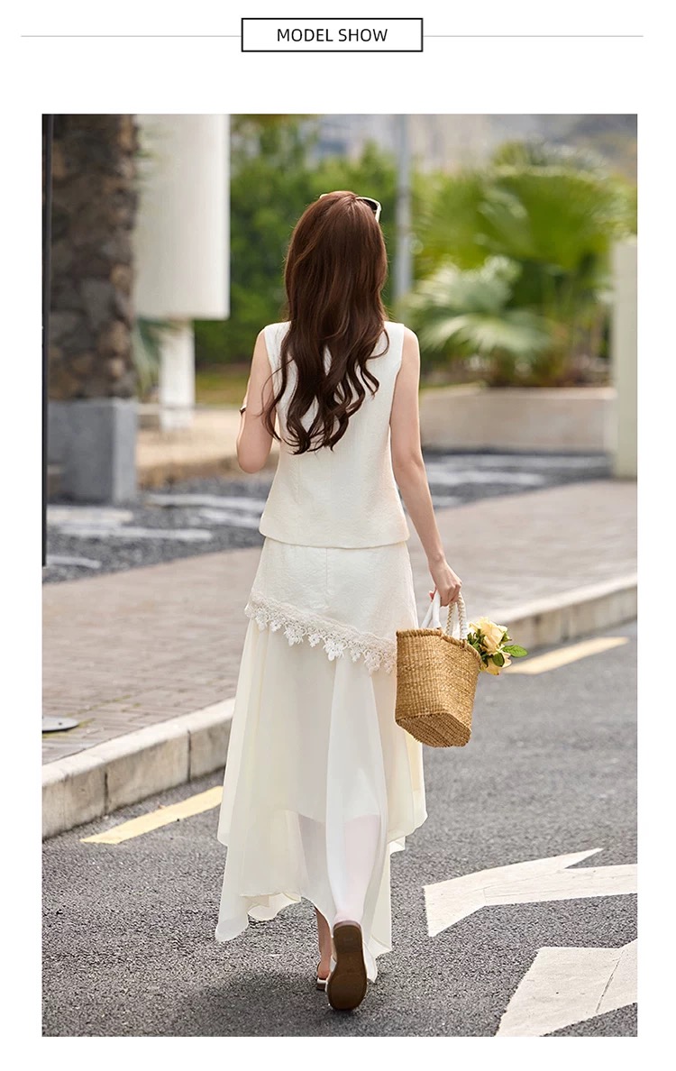 RY2922# 轻熟风V领无袖蕾丝拼接套装女显瘦气质两件套半身裙