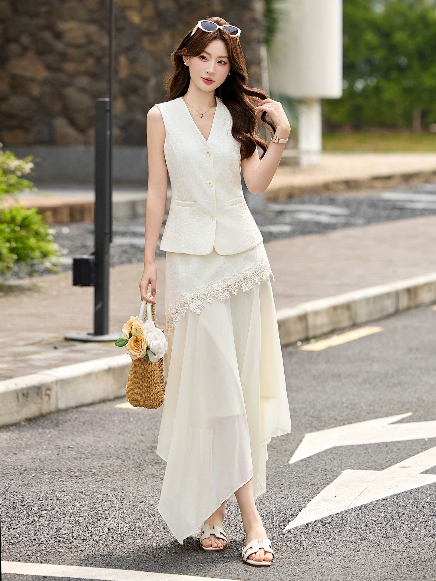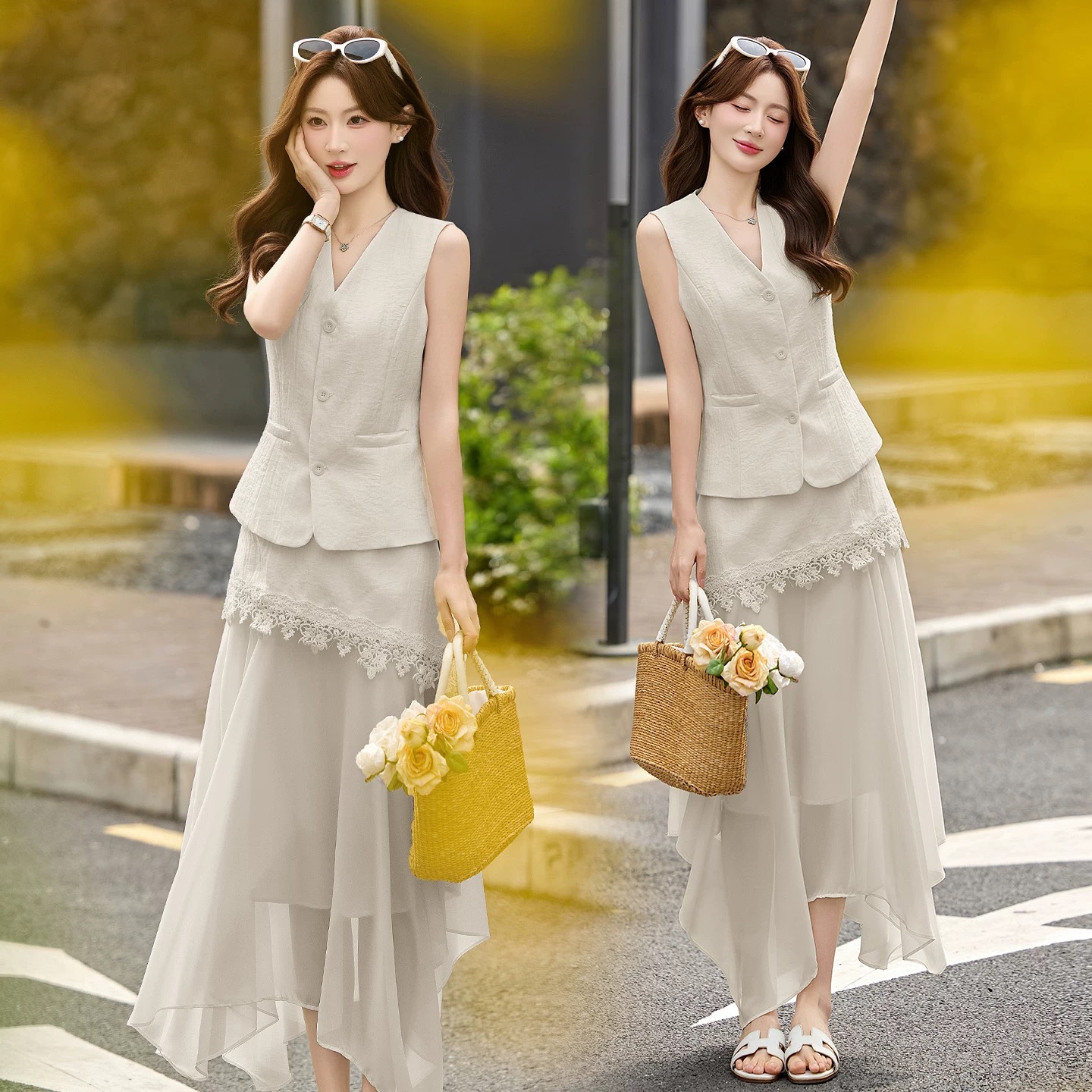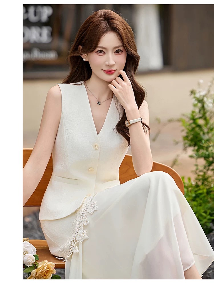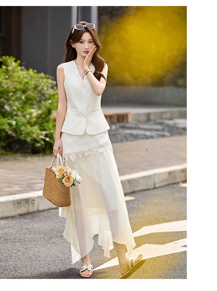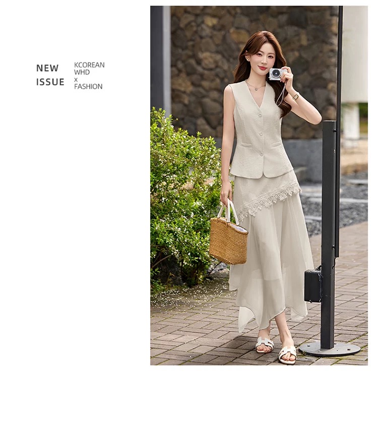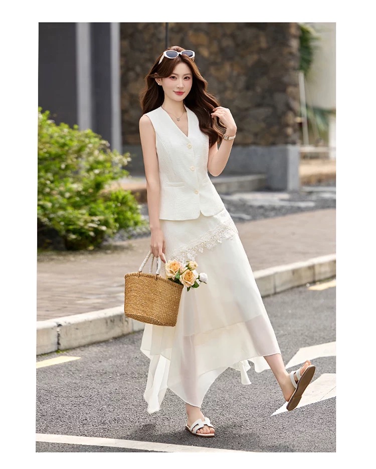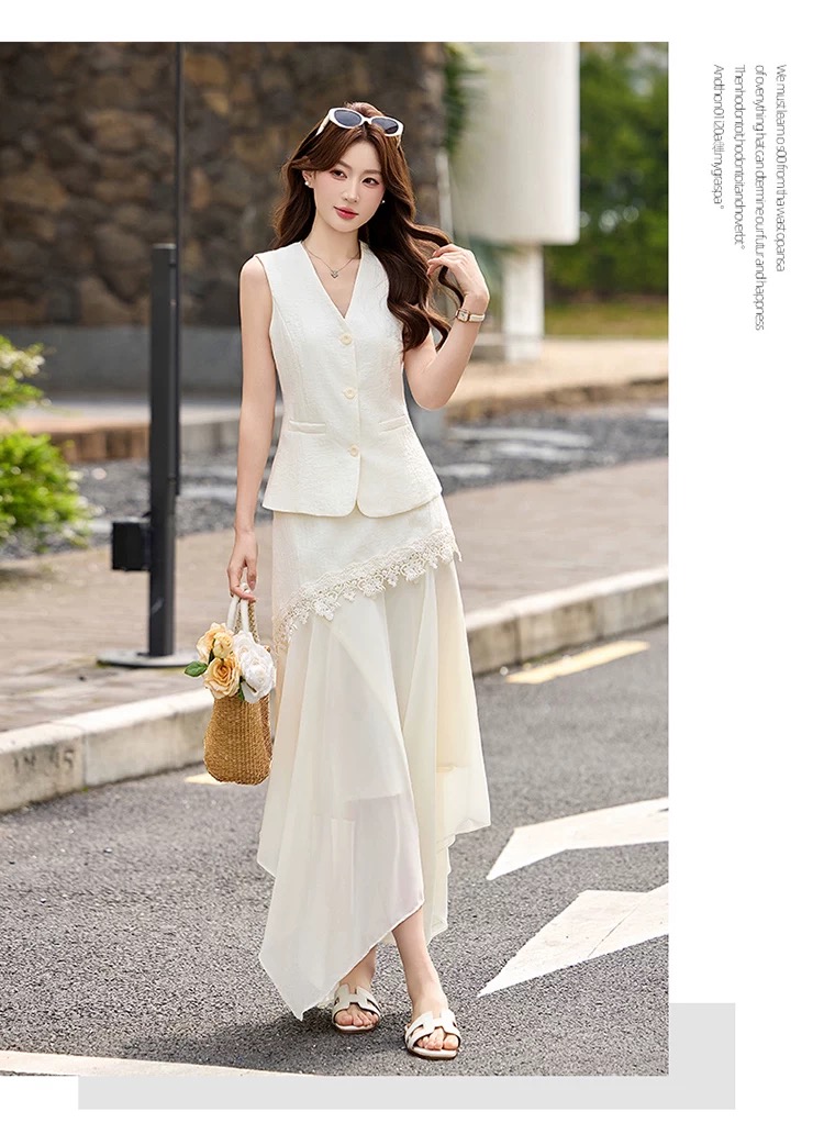 RY2922# 轻熟风V领无袖蕾丝拼接套装女显瘦气质两件套半身裙