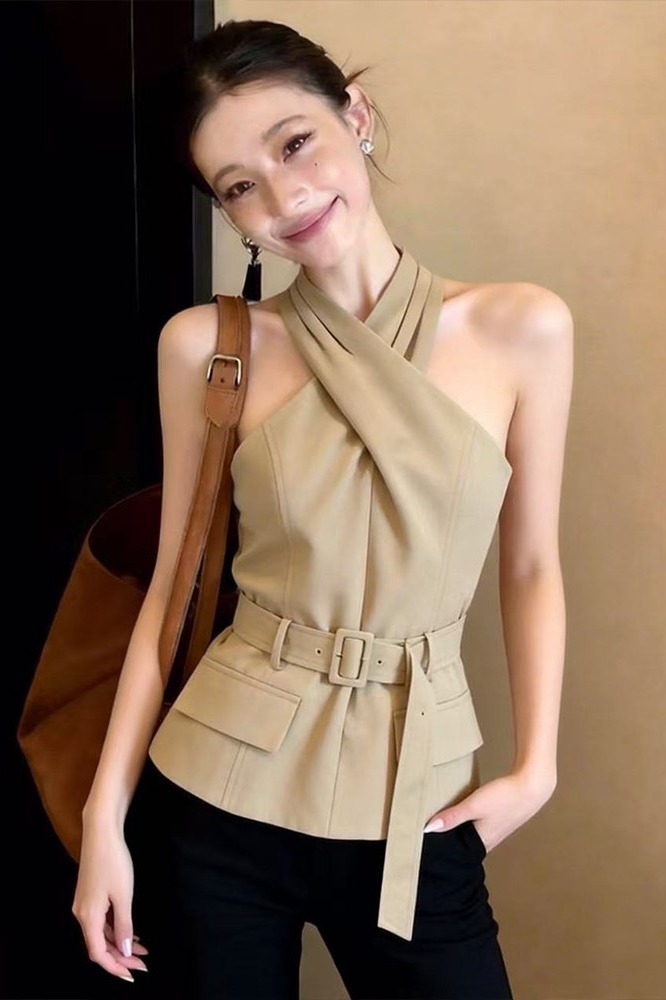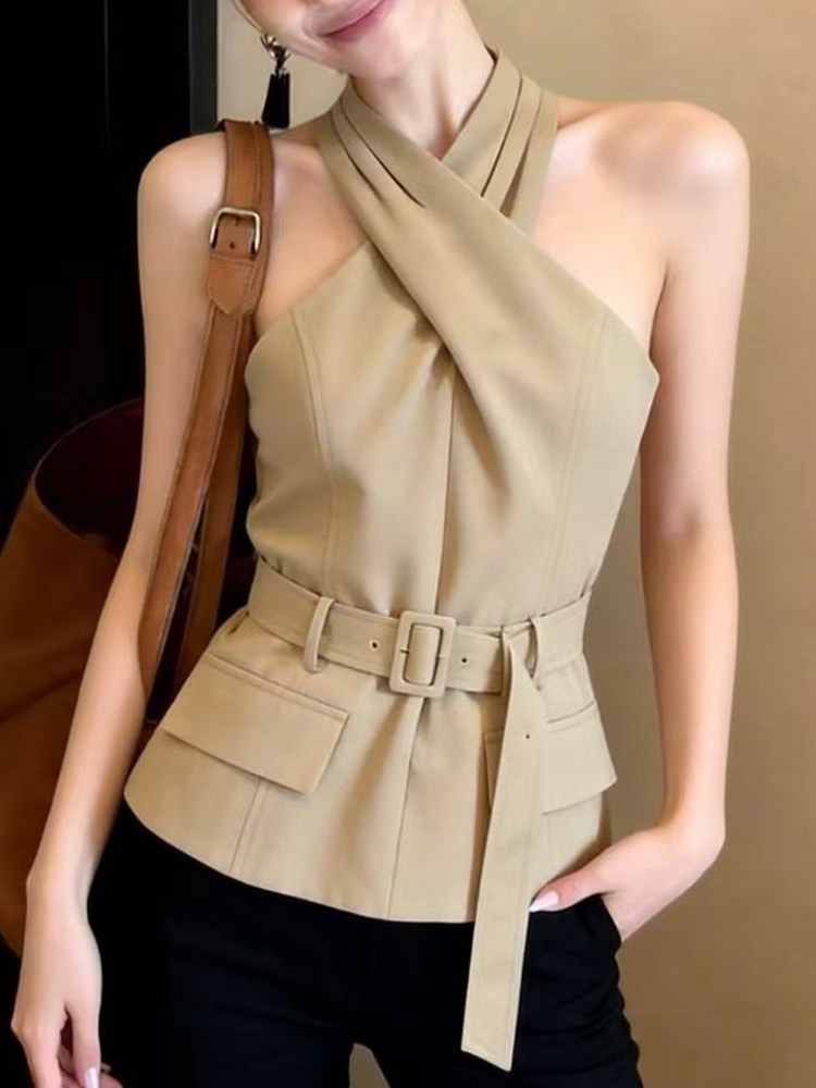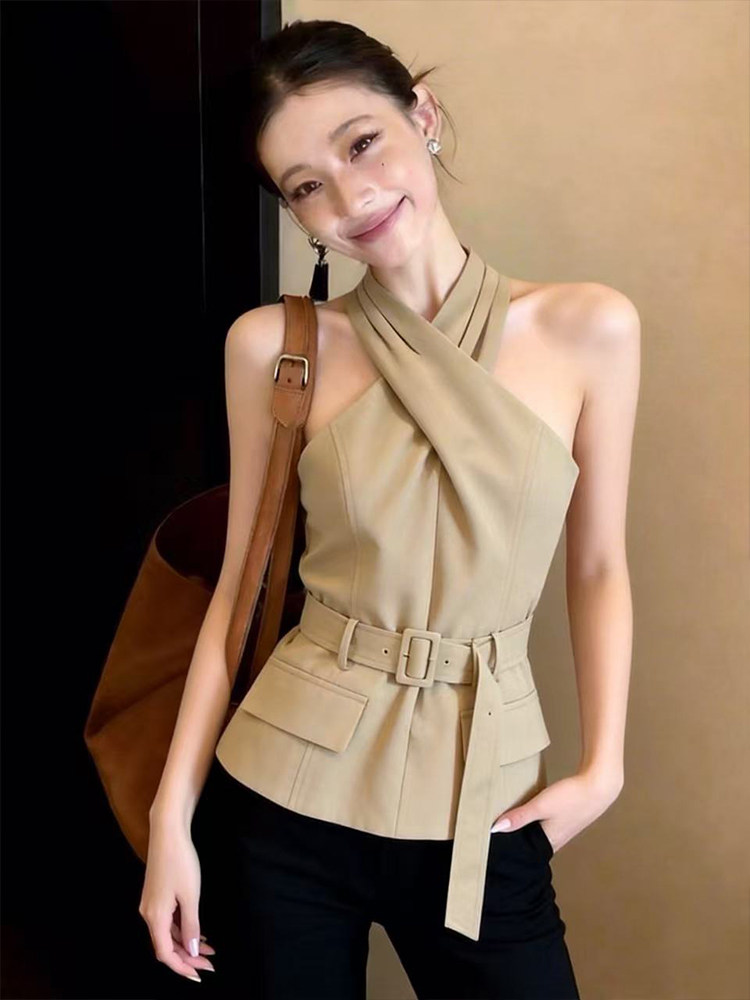 RY2927# 实拍性感甜辣妹交叉挂脖吊带背心女设计感巨好看绑带收腰无袖上衣