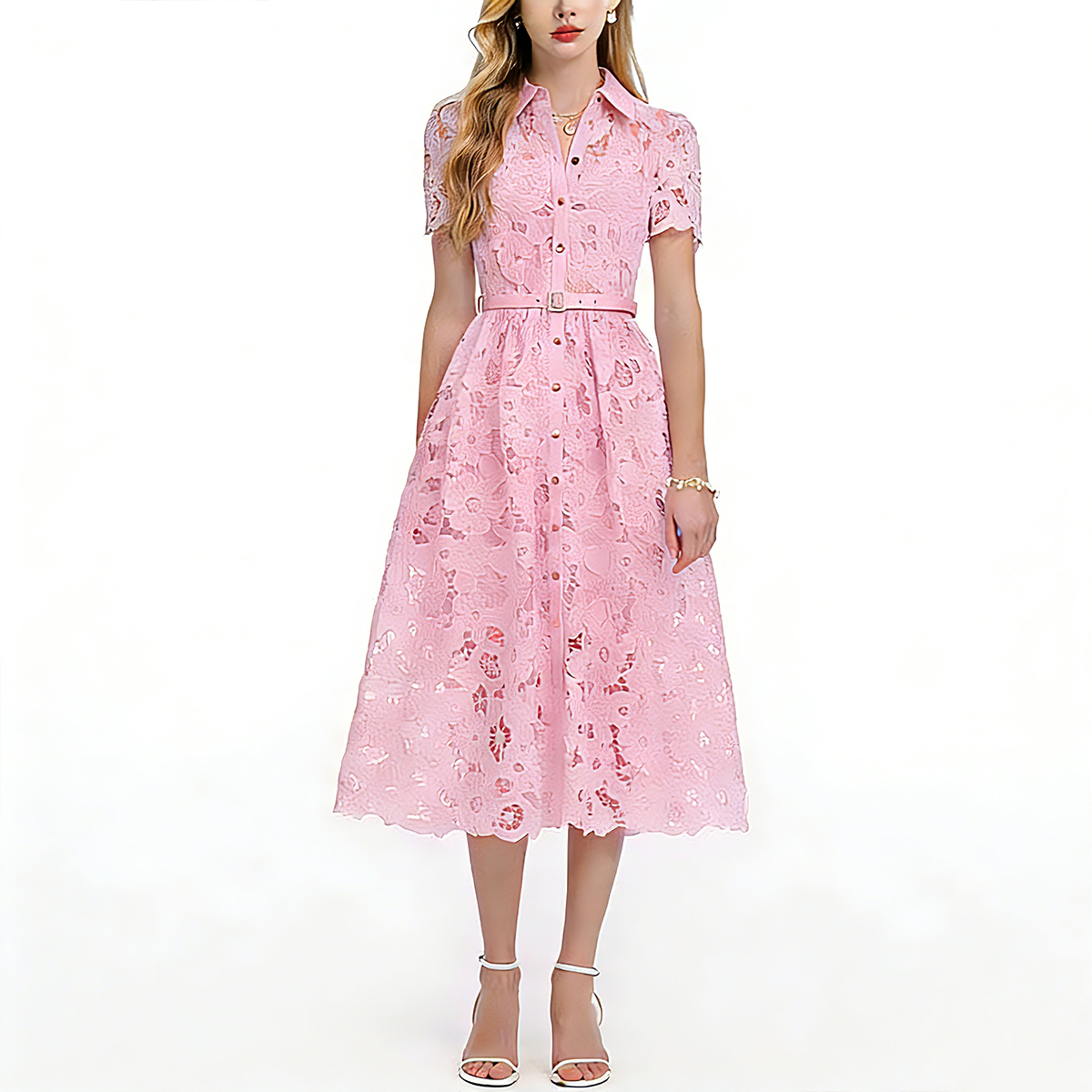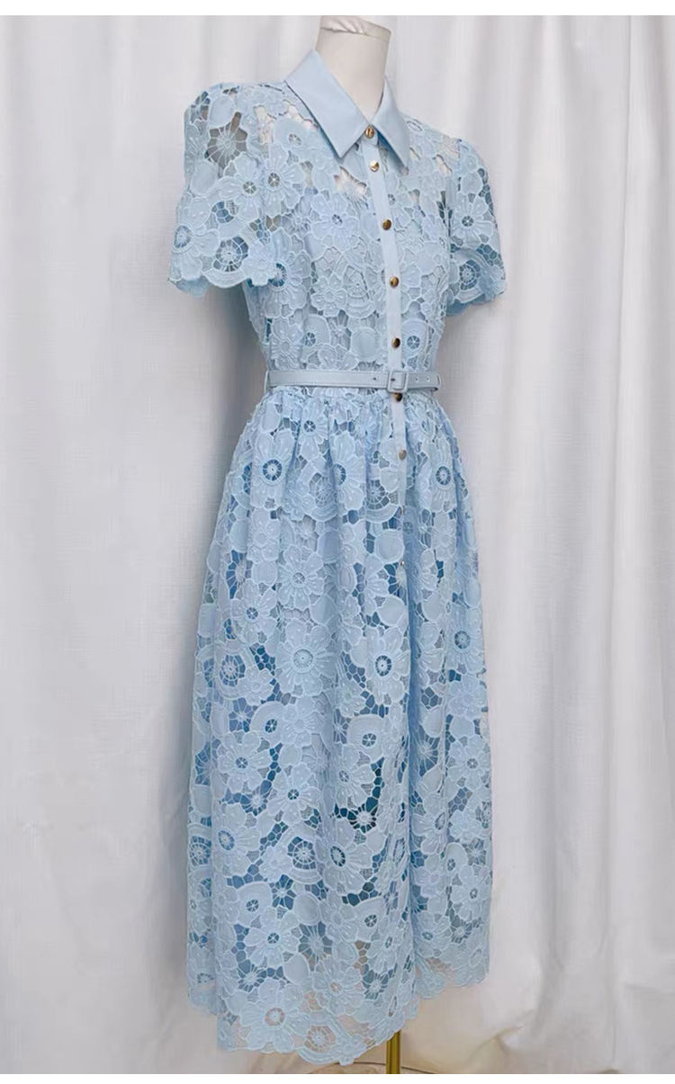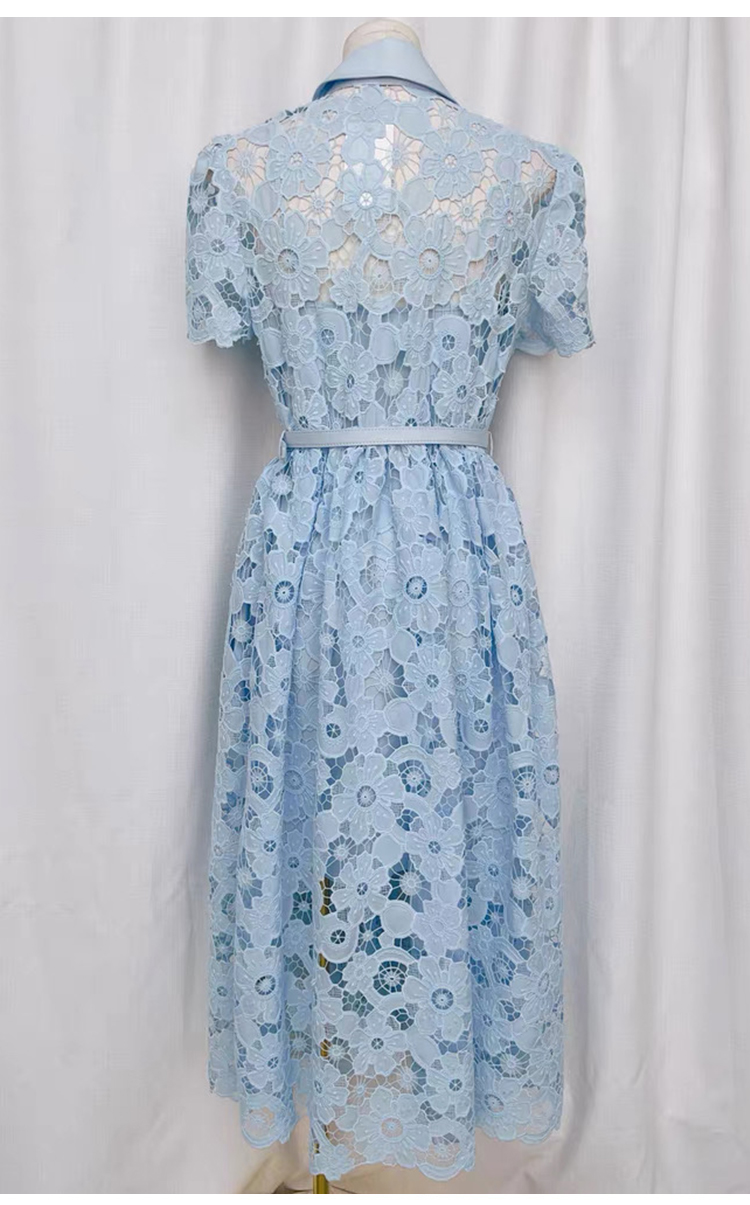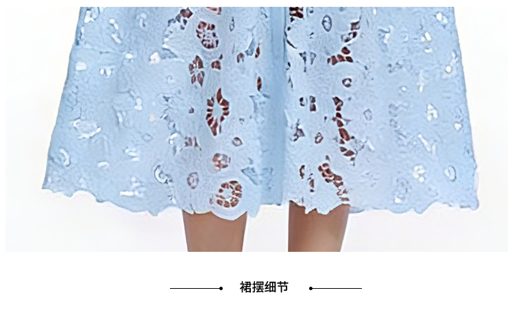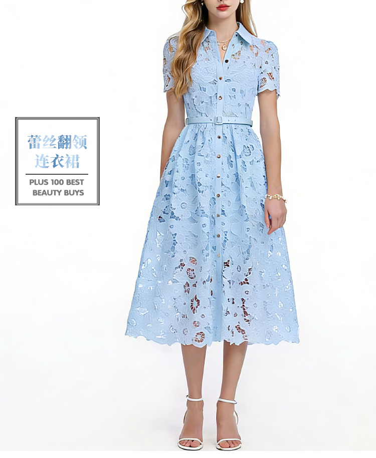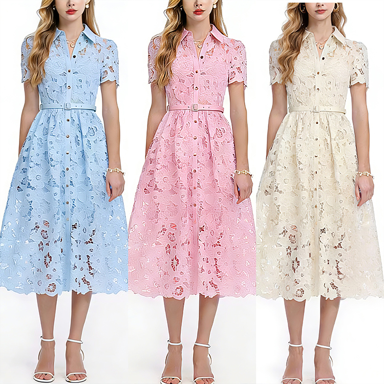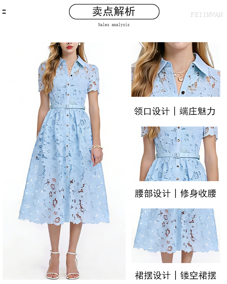 RY2935# 法式镂空花朵蕾丝翻领短袖修身收腰连衣裙内搭吊带配腰带