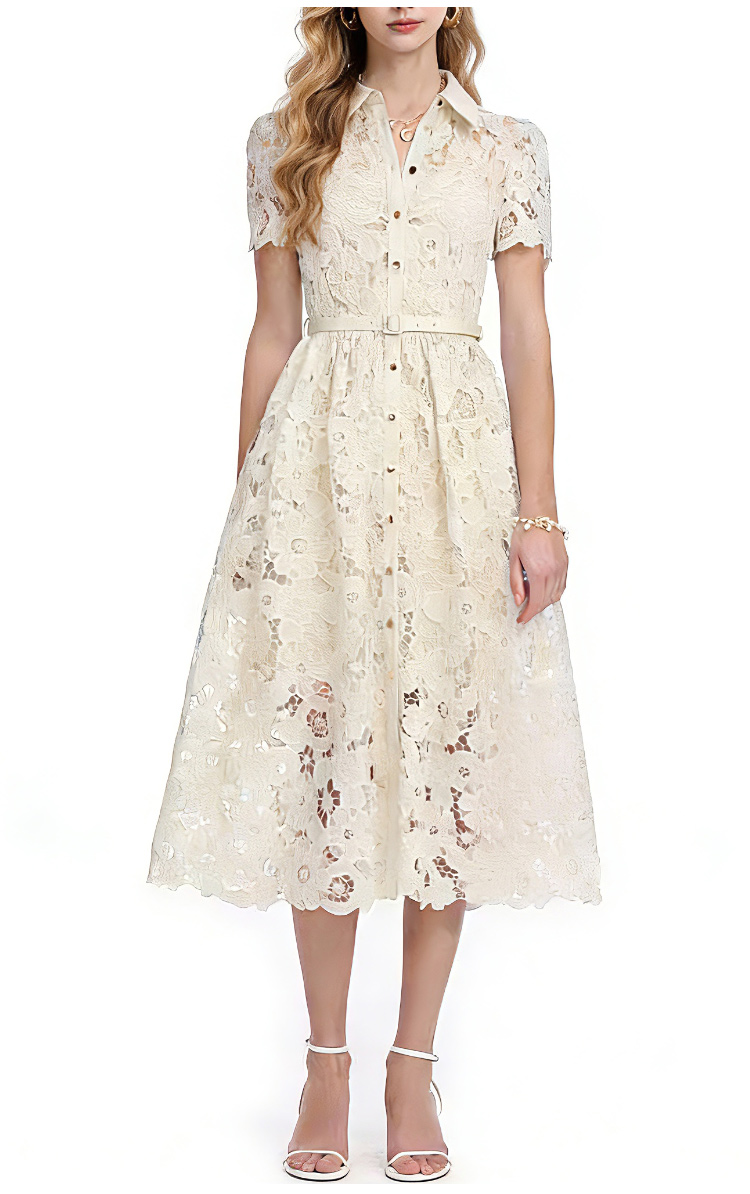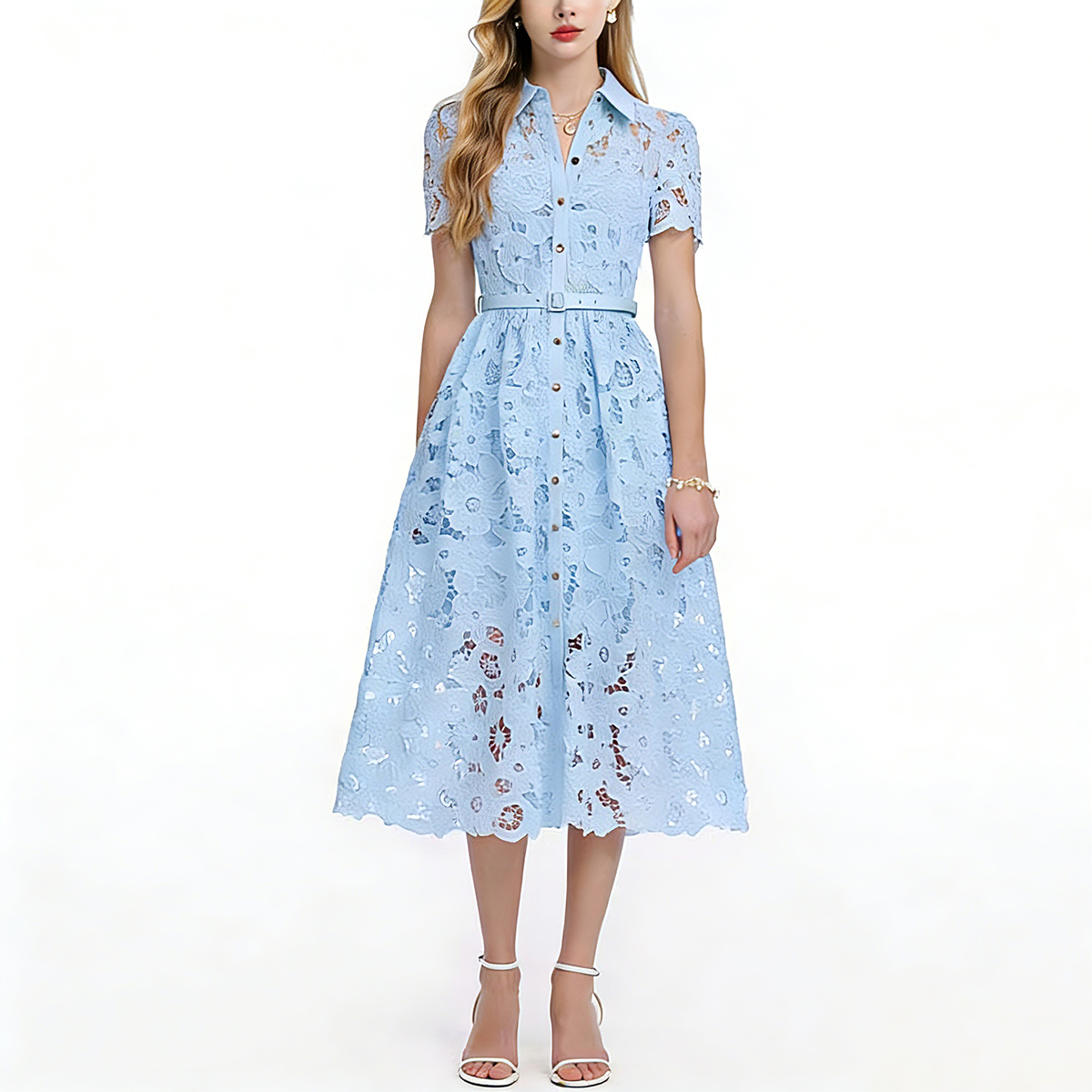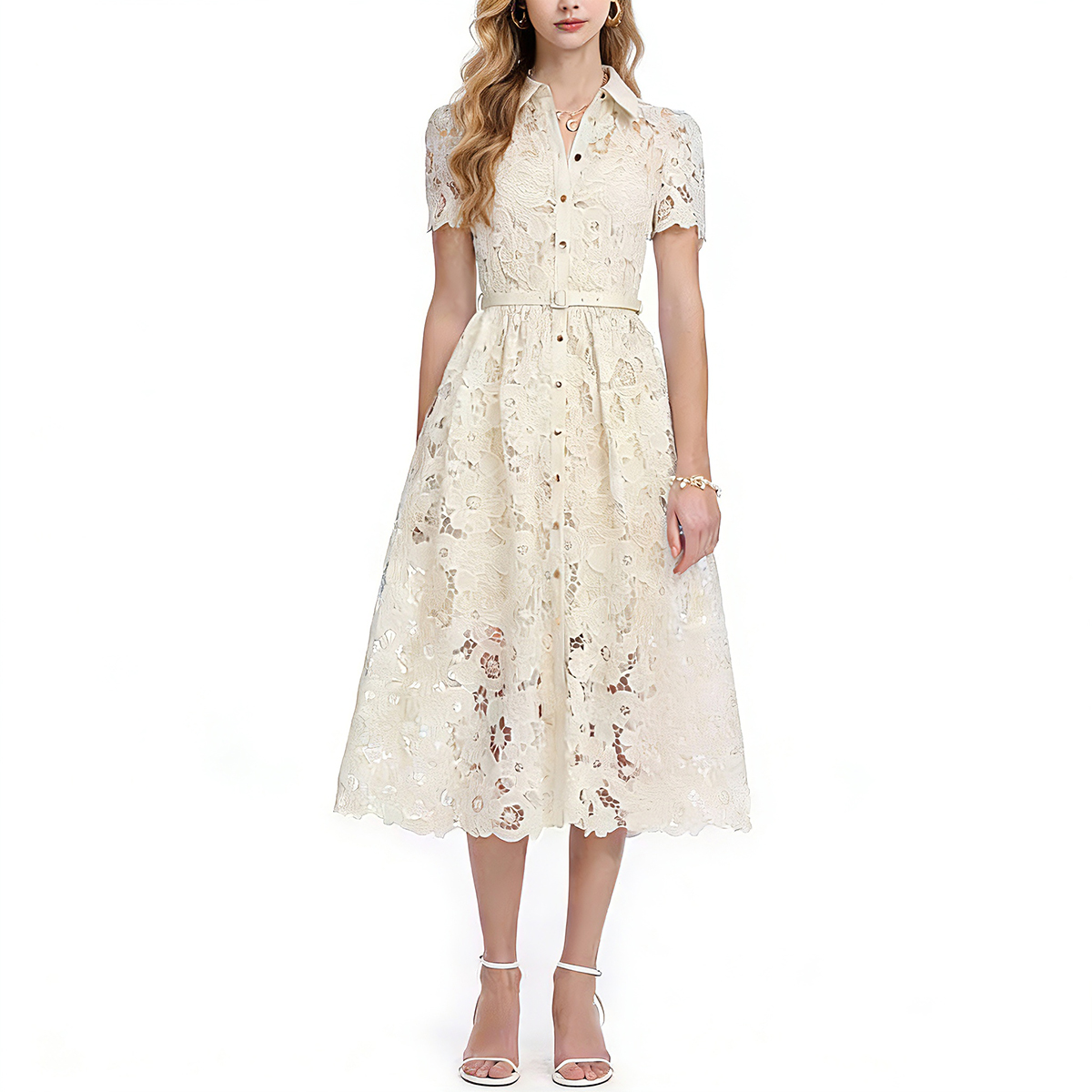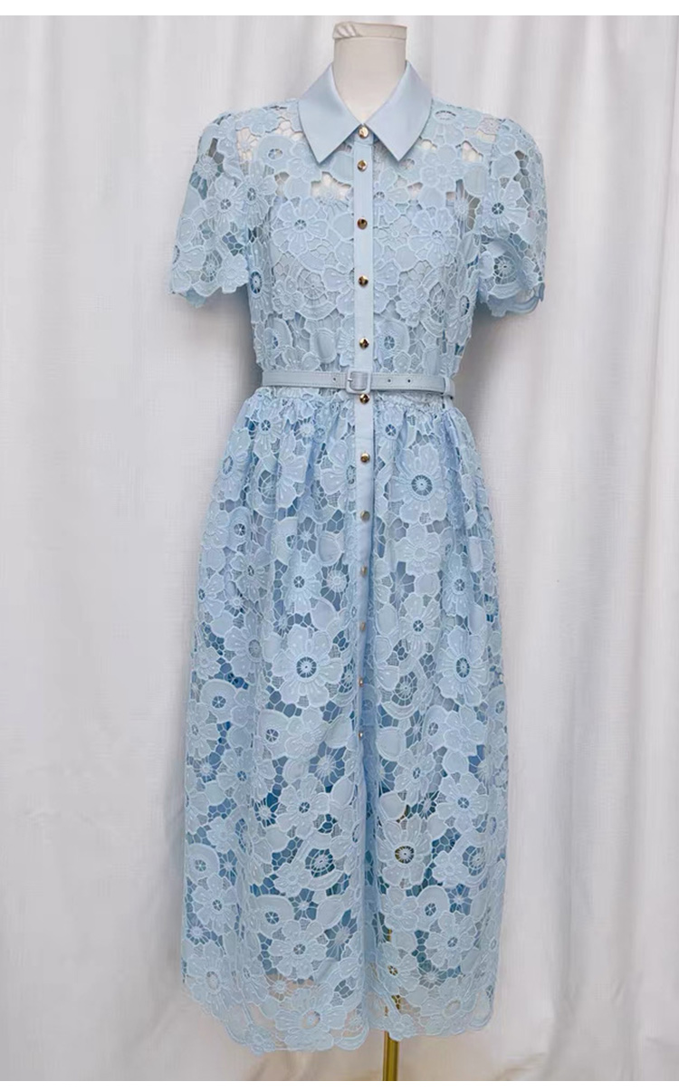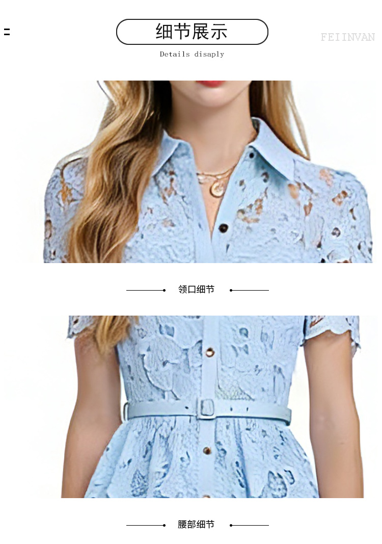 RY2935# 法式镂空花朵蕾丝翻领短袖修身收腰连衣裙内搭吊带配腰带