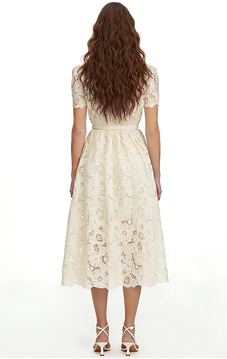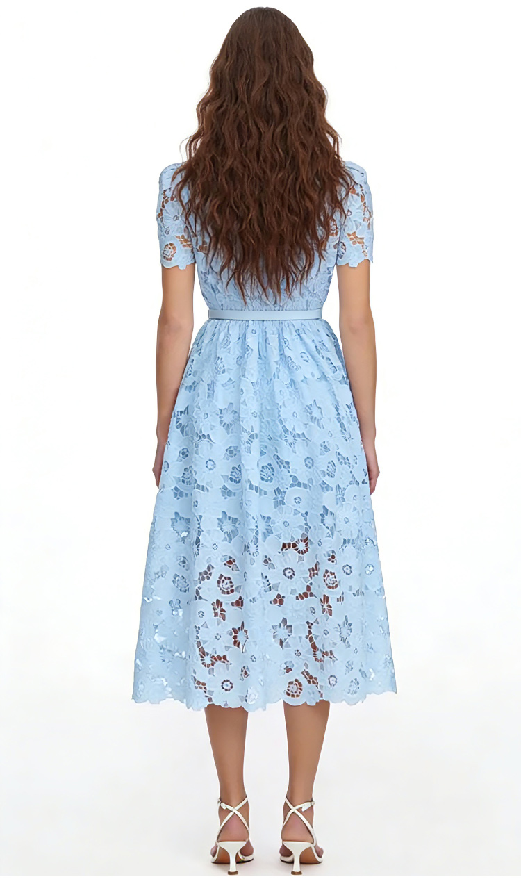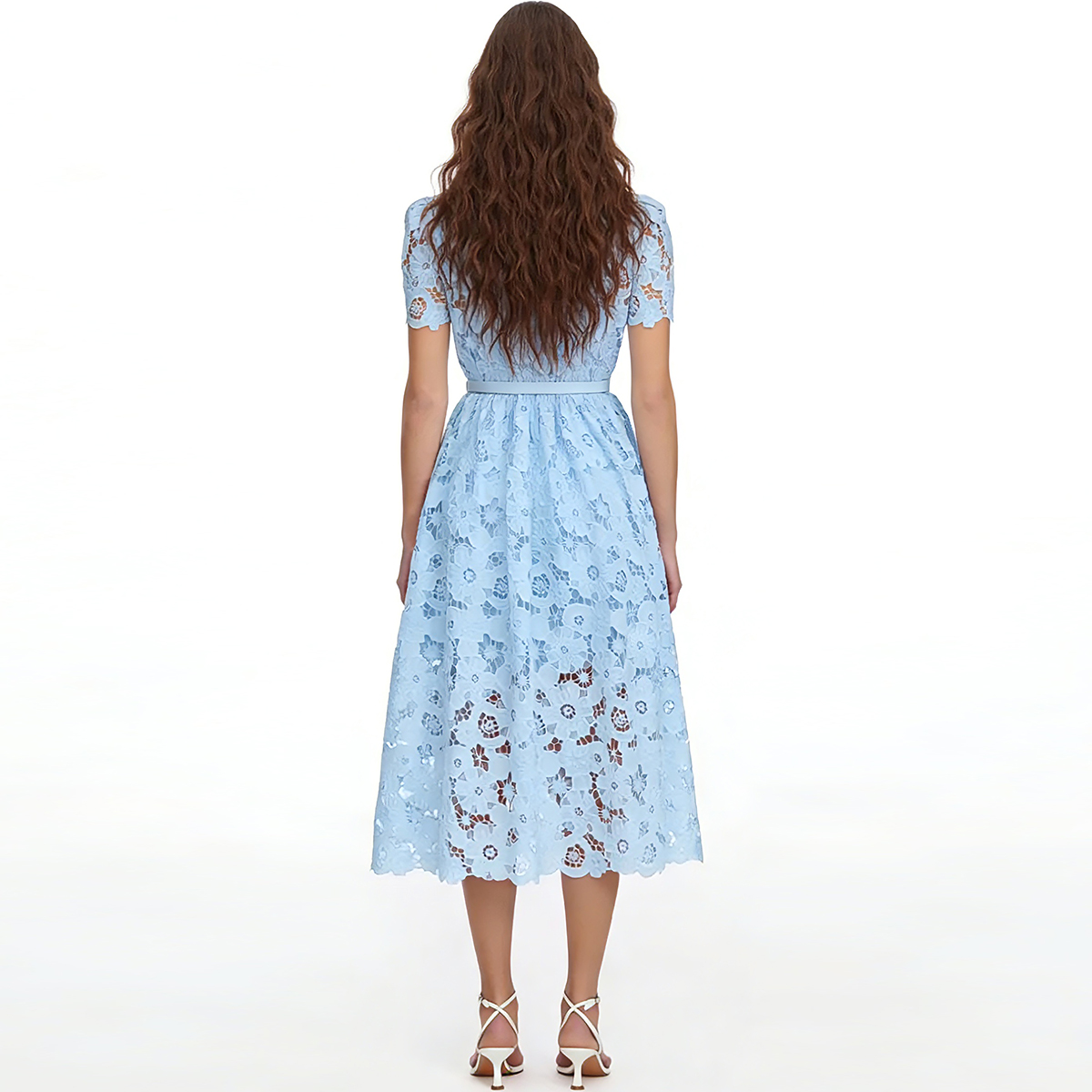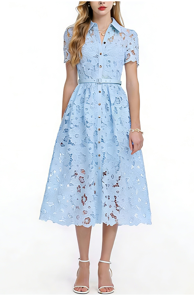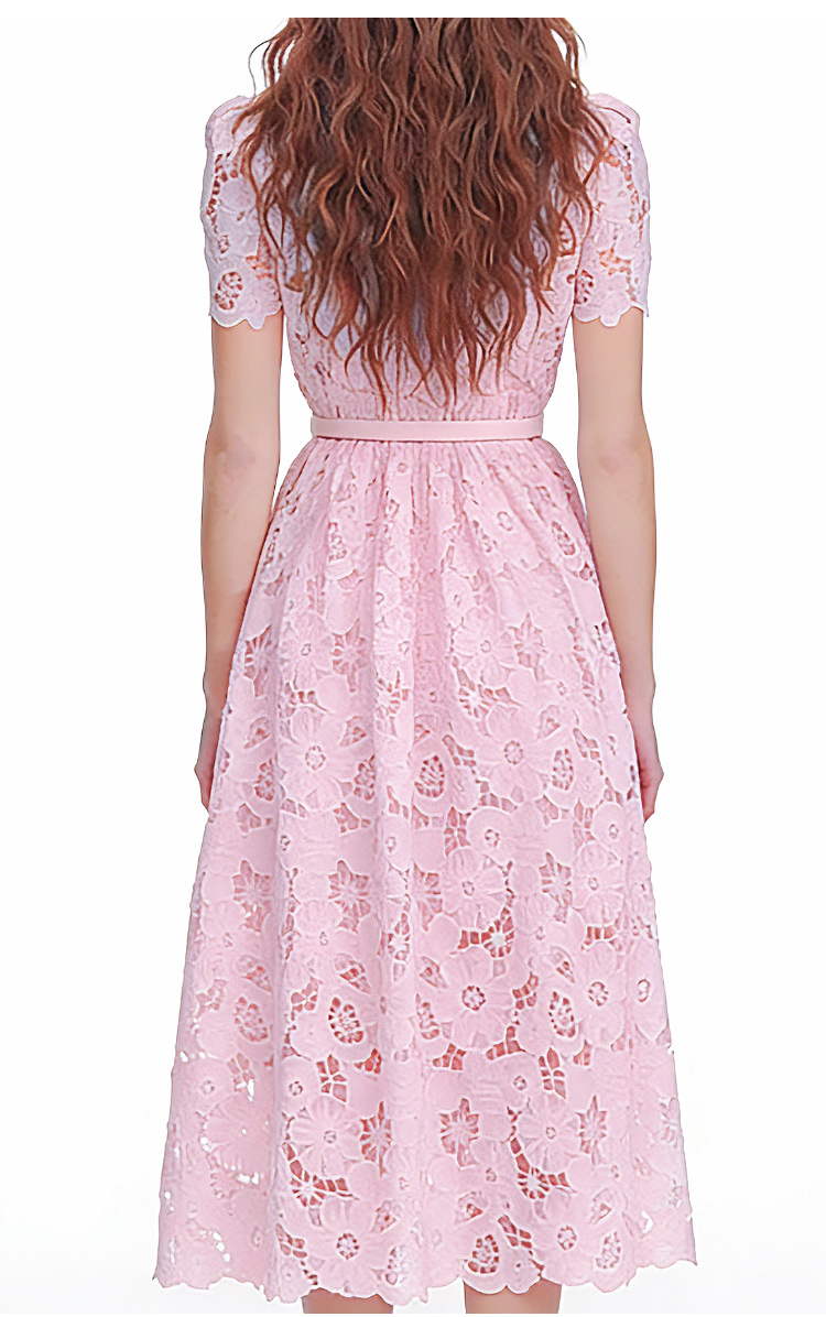 RY2935# 法式镂空花朵蕾丝翻领短袖修身收腰连衣裙内搭吊带配腰带
