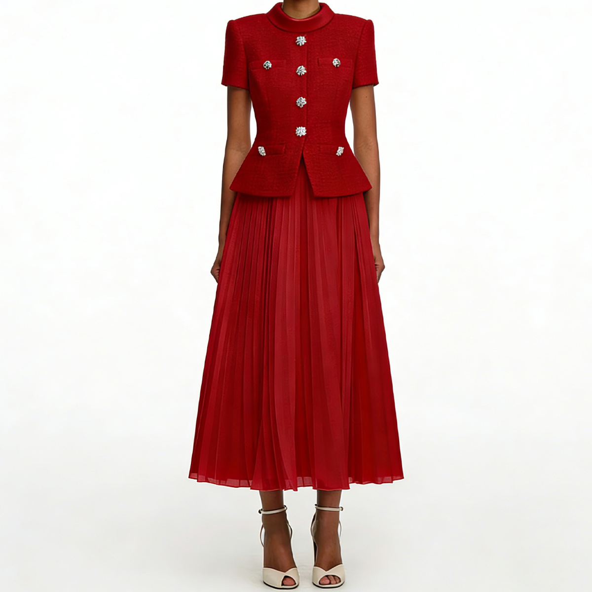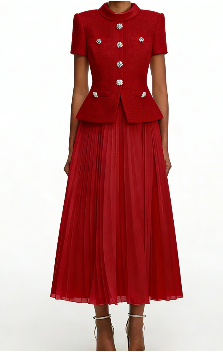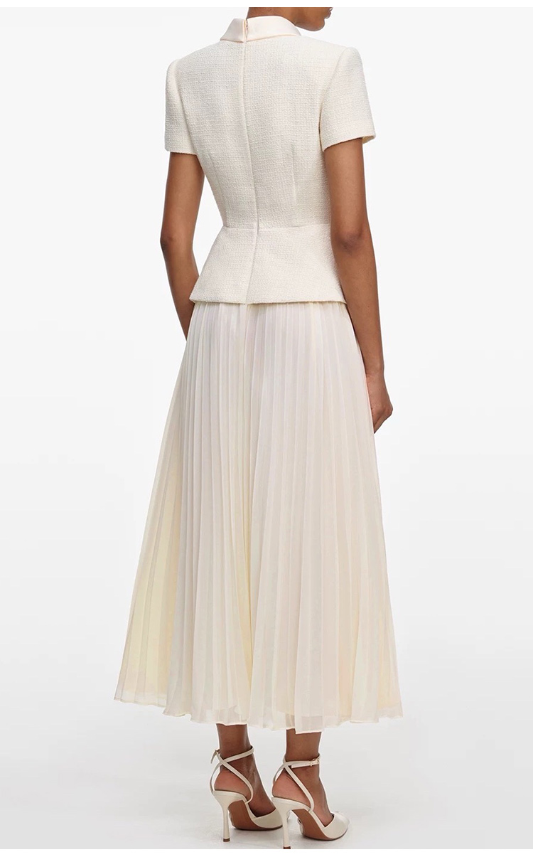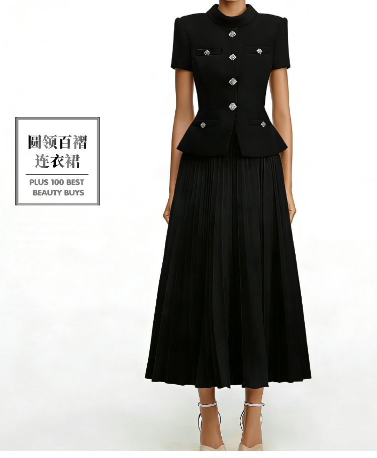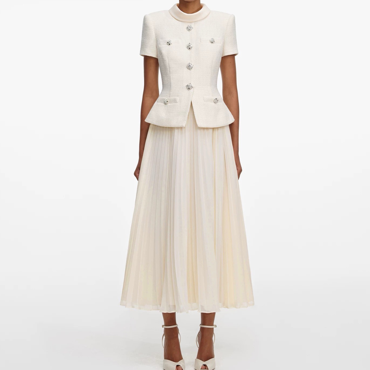 RY2938# 法式气质小香风圆领短袖钻扣收腰外套+百褶长裙套装裙