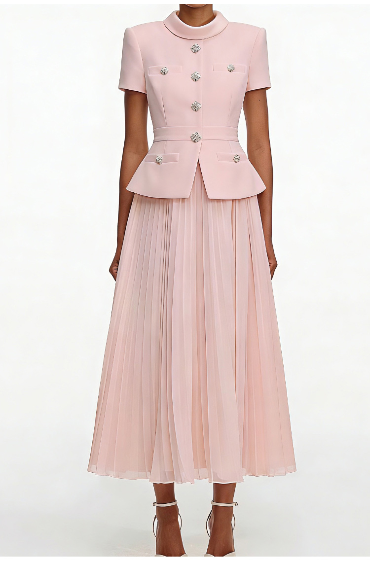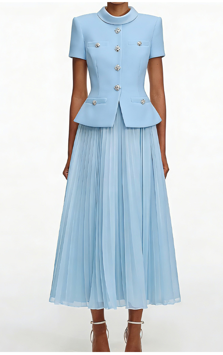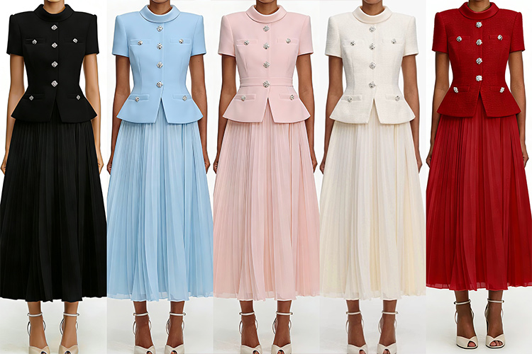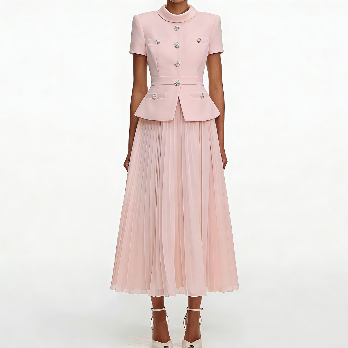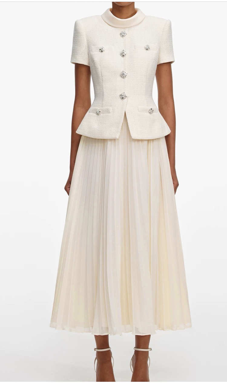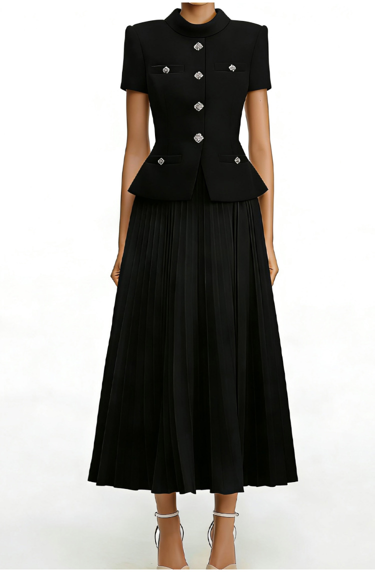 RY2938# 法式气质小香风圆领短袖钻扣收腰外套+百褶长裙套装裙