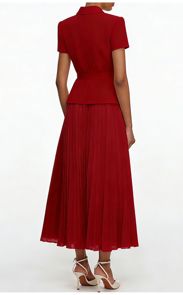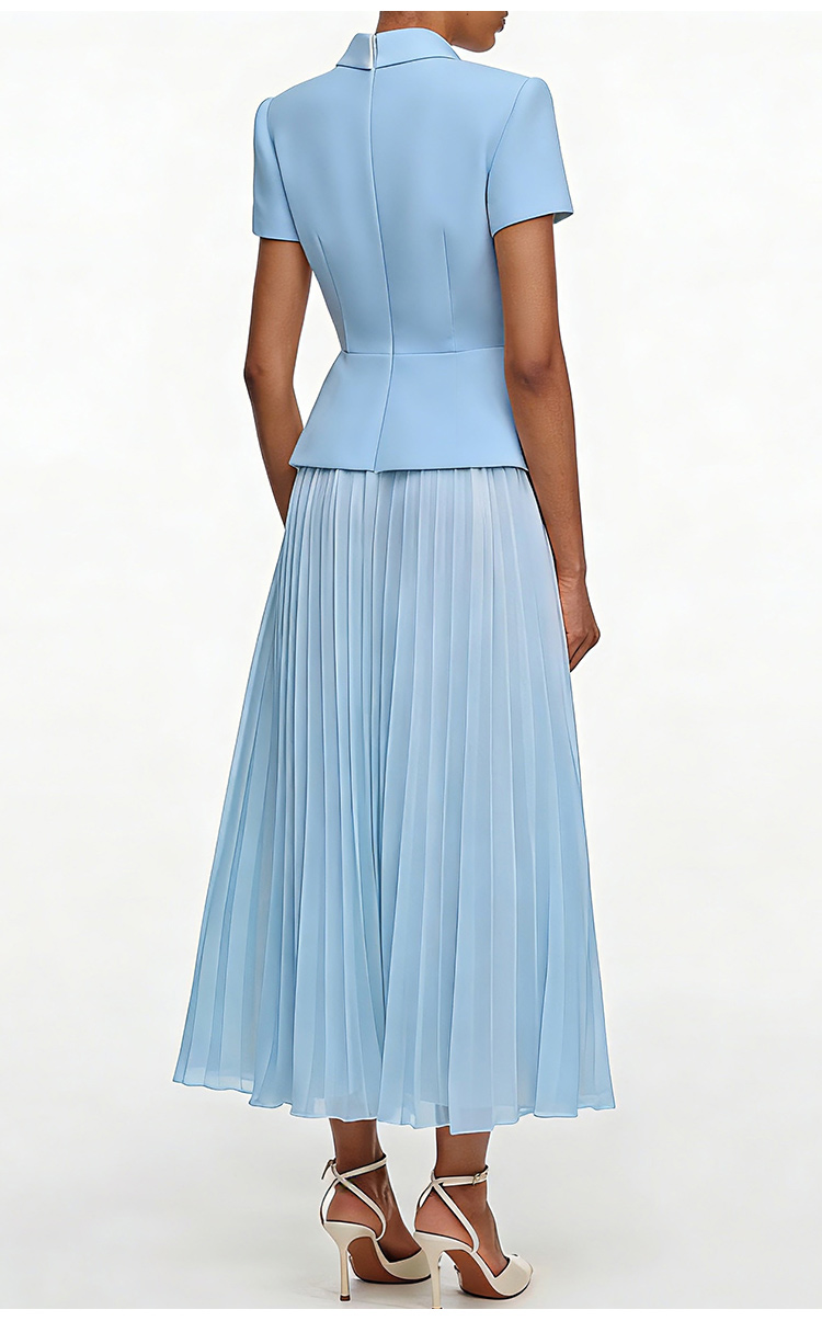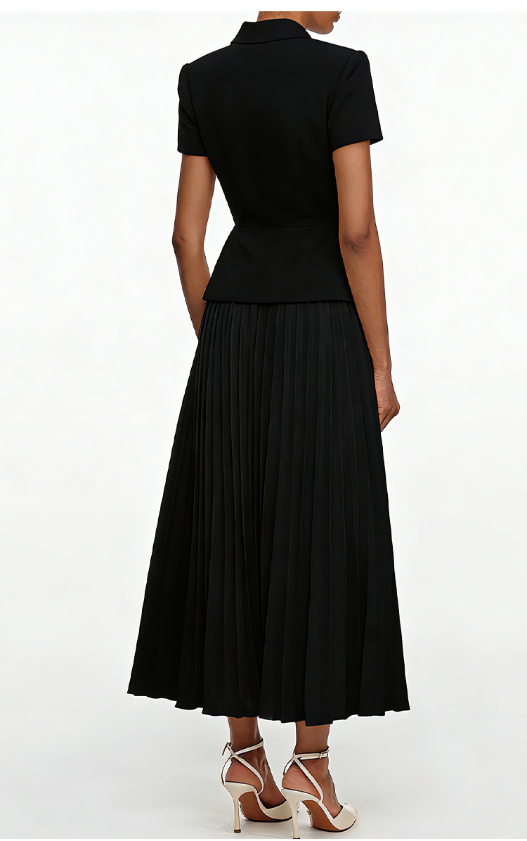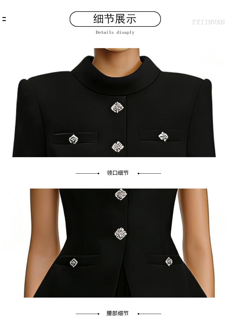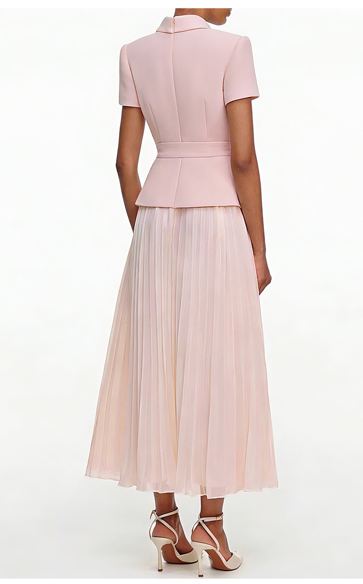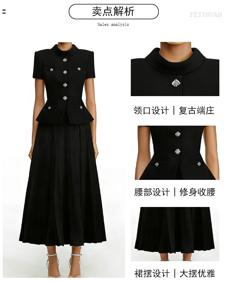 RY2938# 法式气质小香风圆领短袖钻扣收腰外套+百褶长裙套装裙