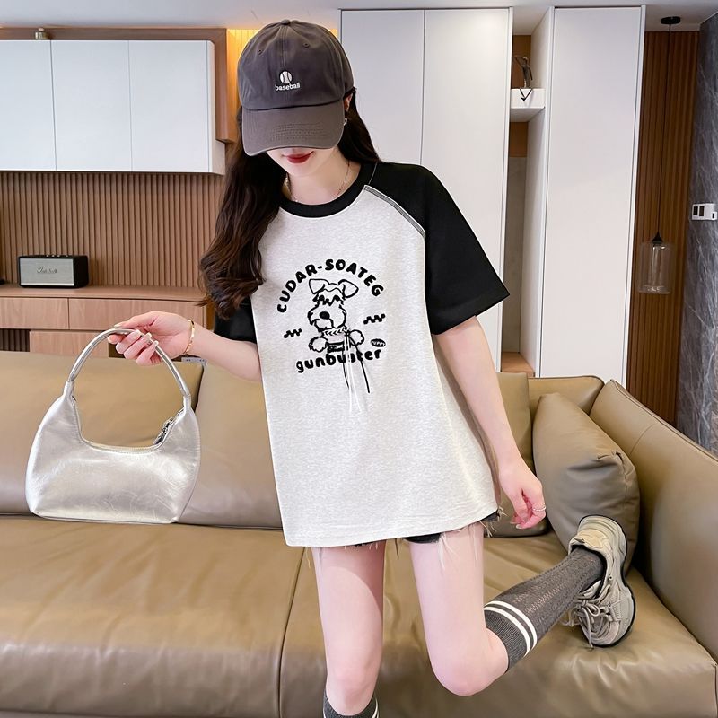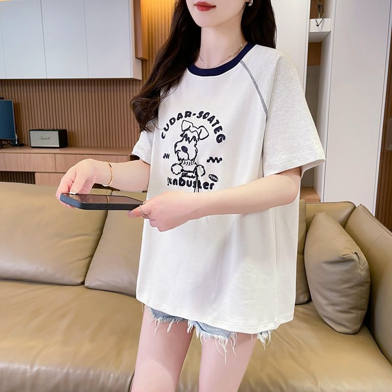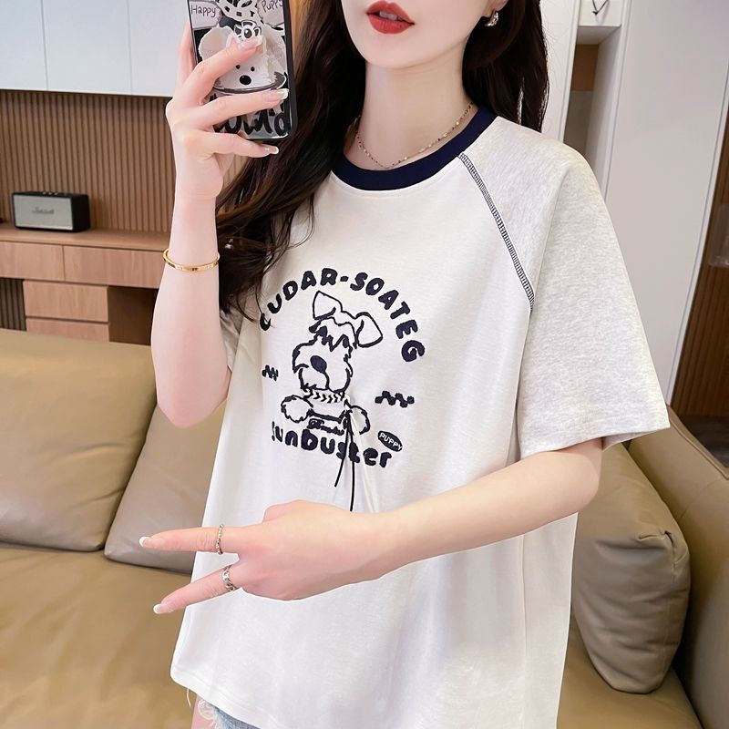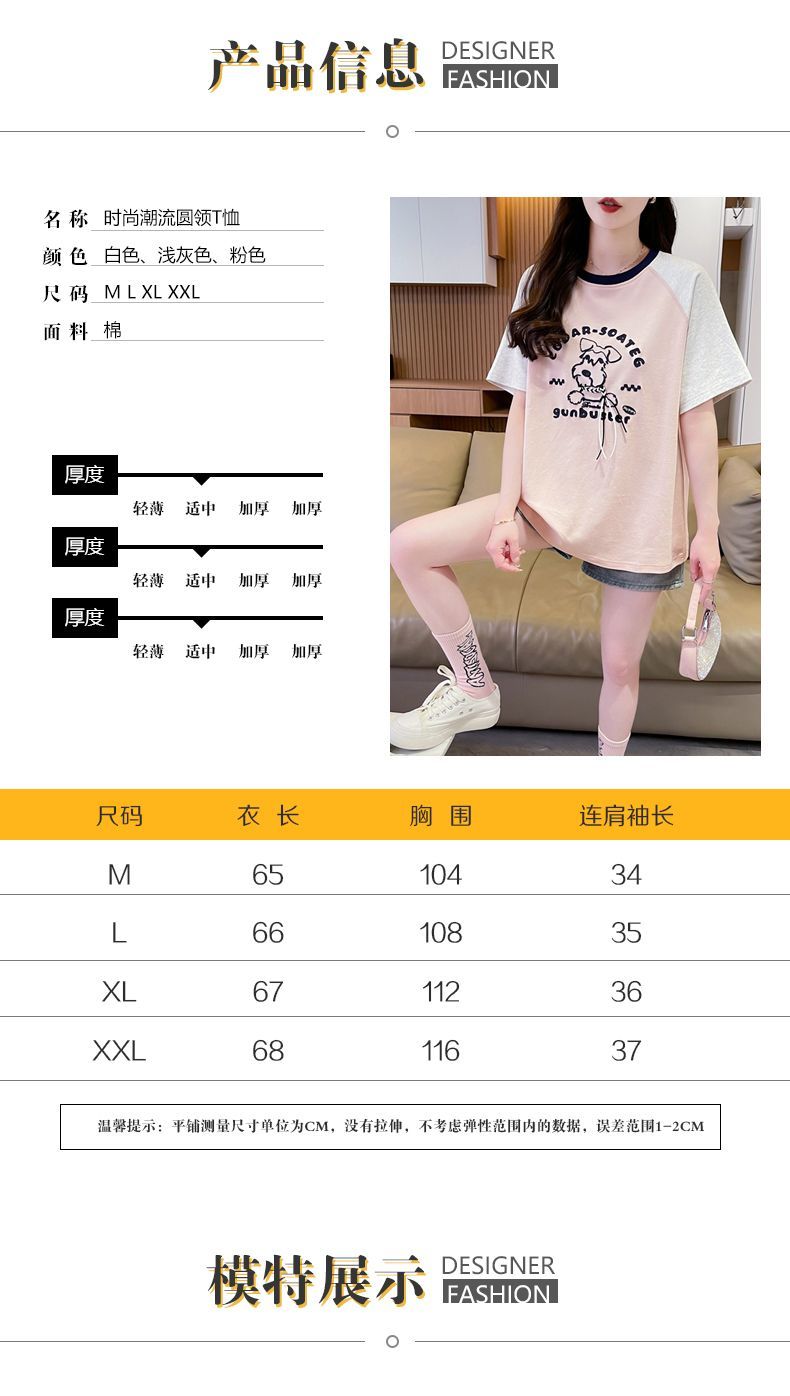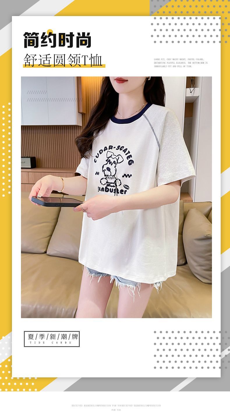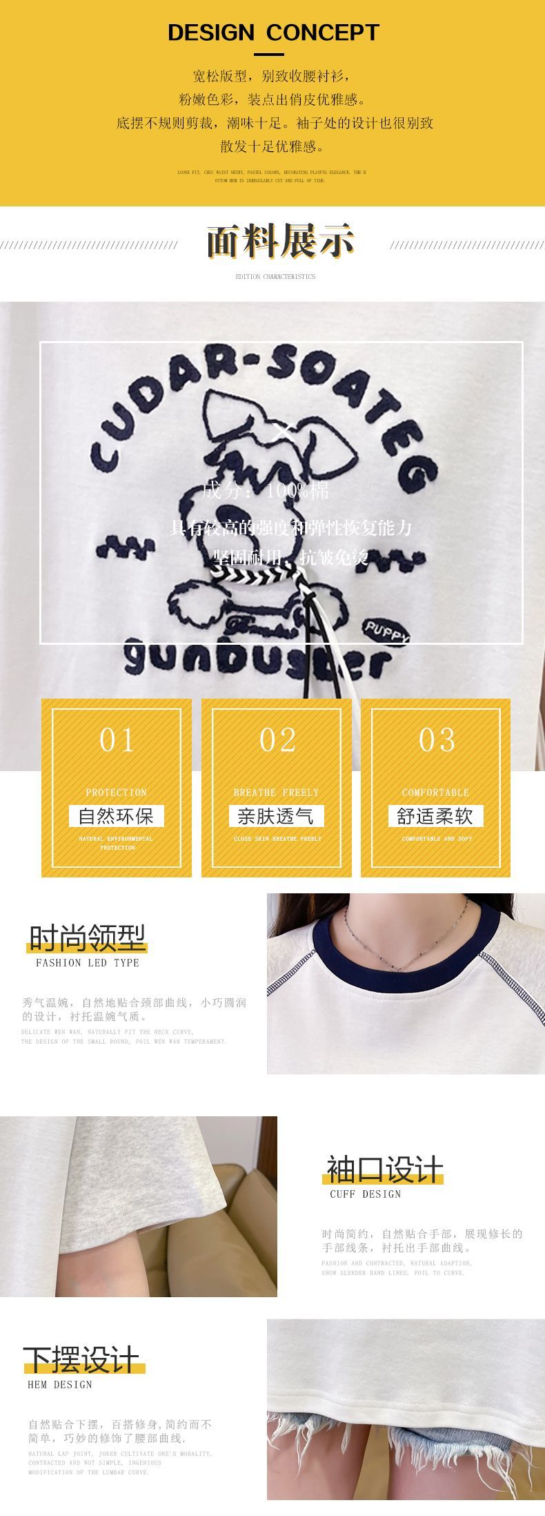 RY3020# 实拍 100%纯棉后包领韩版中长款撞色刺绣短袖T恤女
