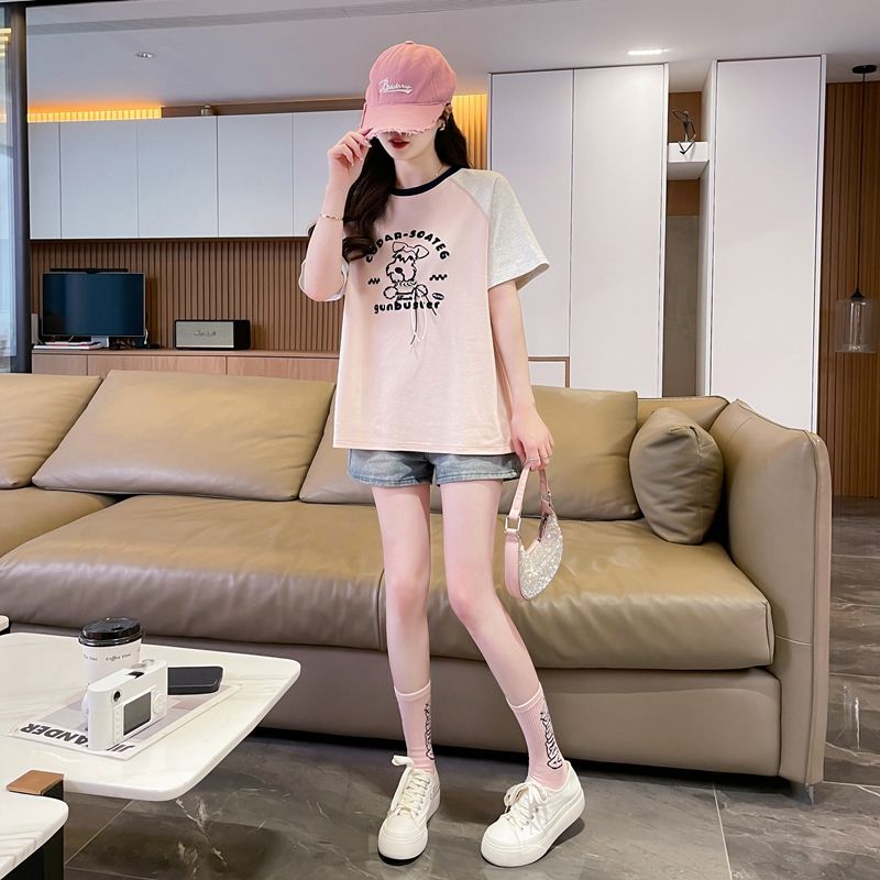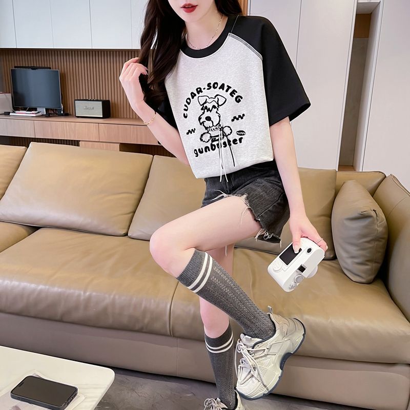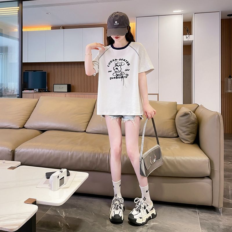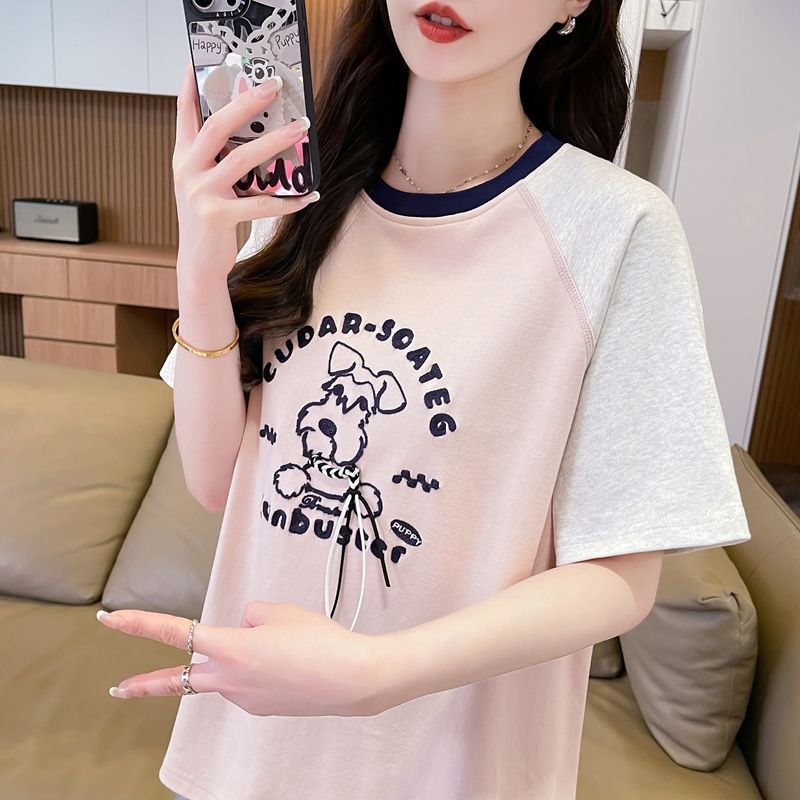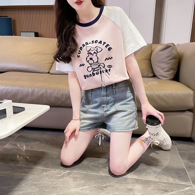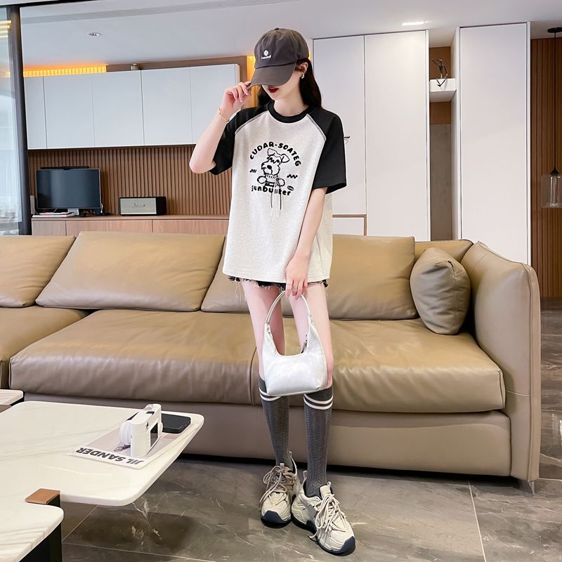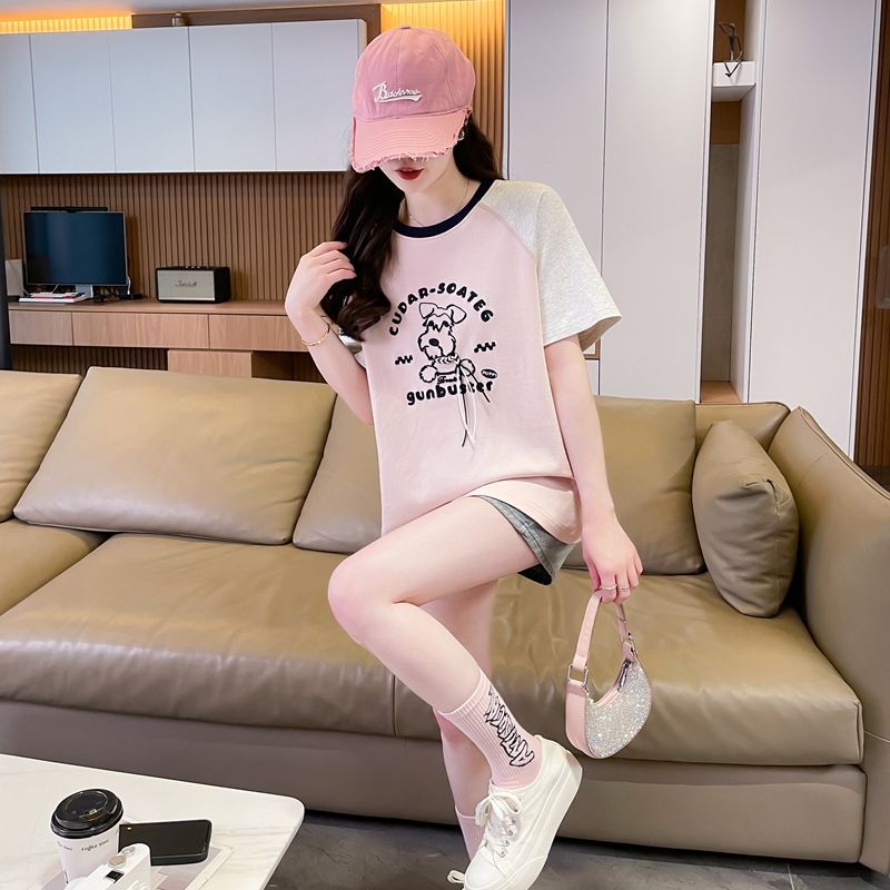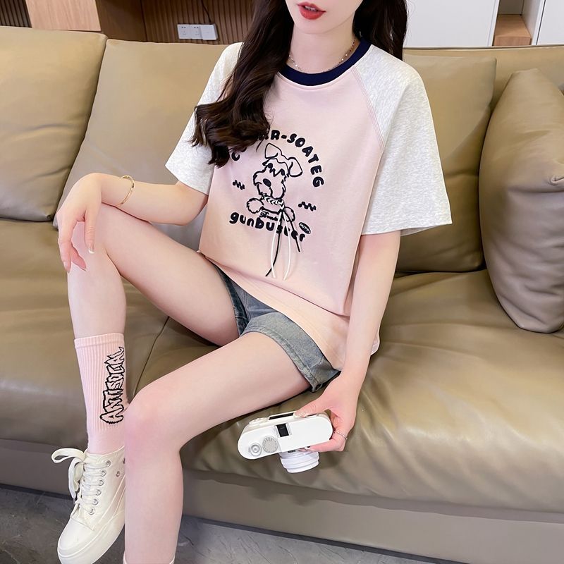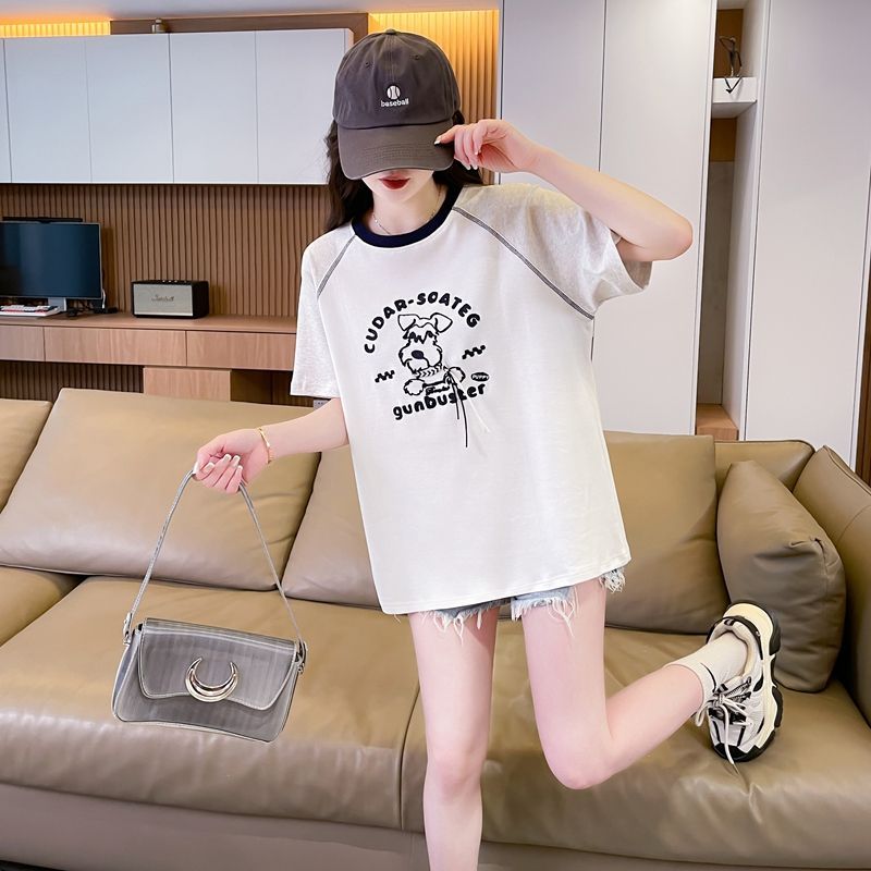 RY3020# 实拍 100%纯棉后包领韩版中长款撞色刺绣短袖T恤女