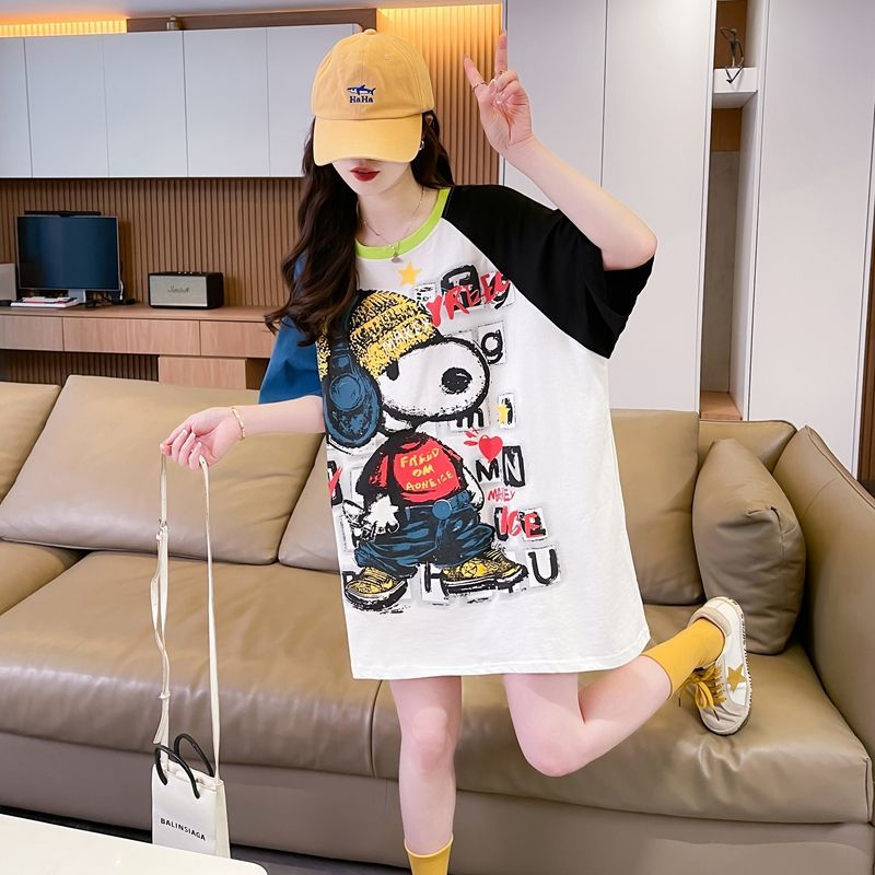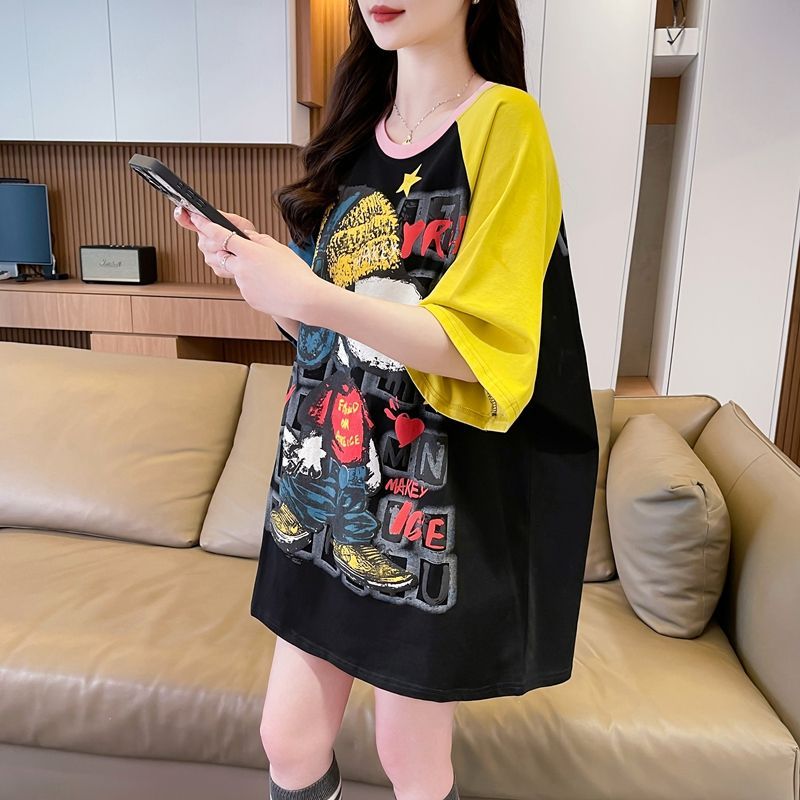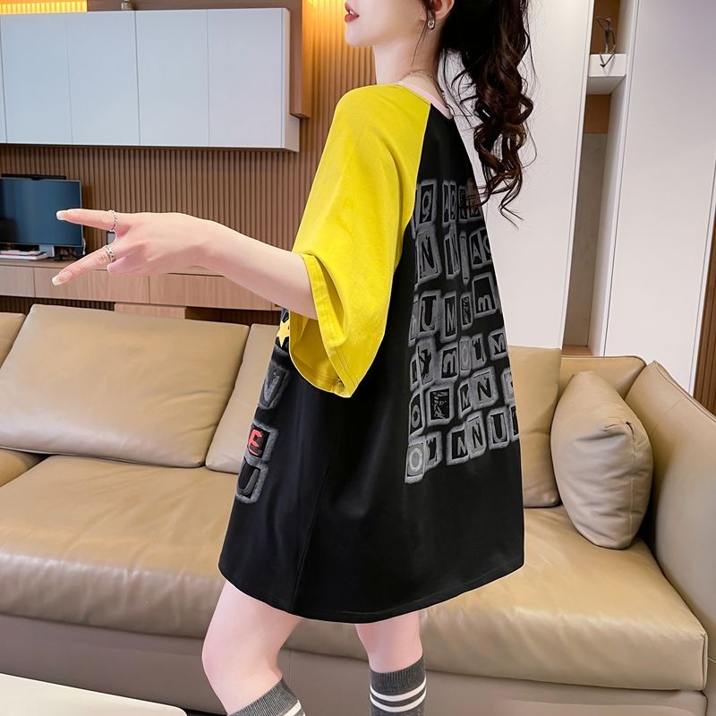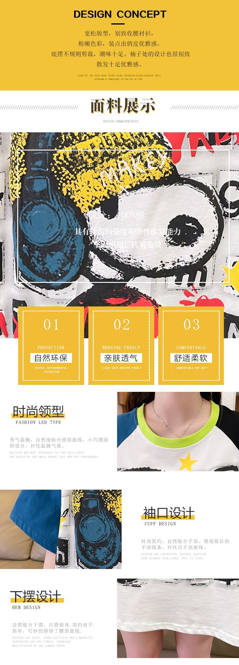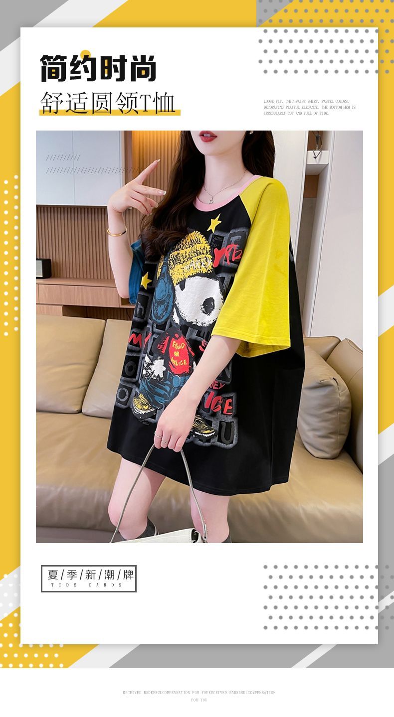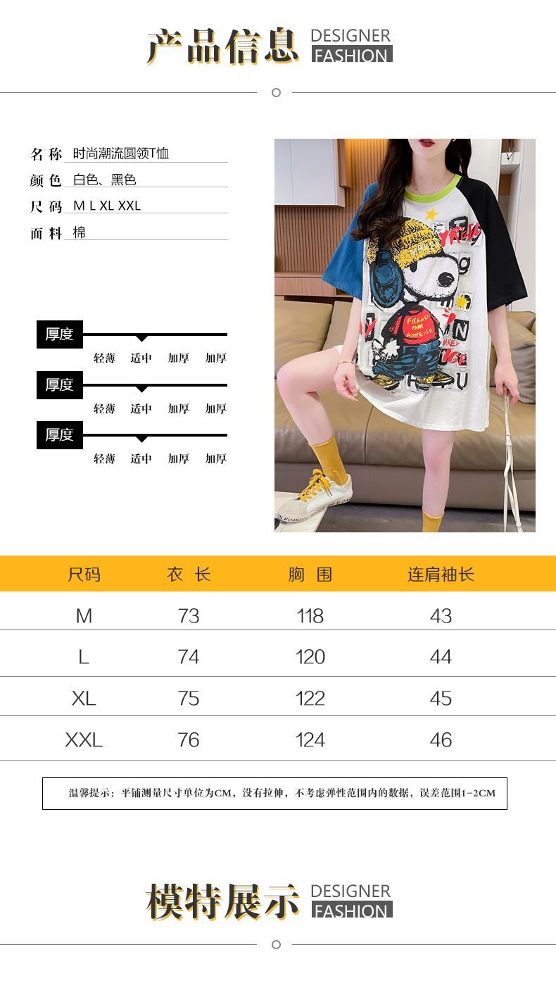 RY3022# 实拍 100%纯棉 后包领中长款撞色圆领短袖T恤女