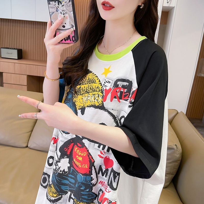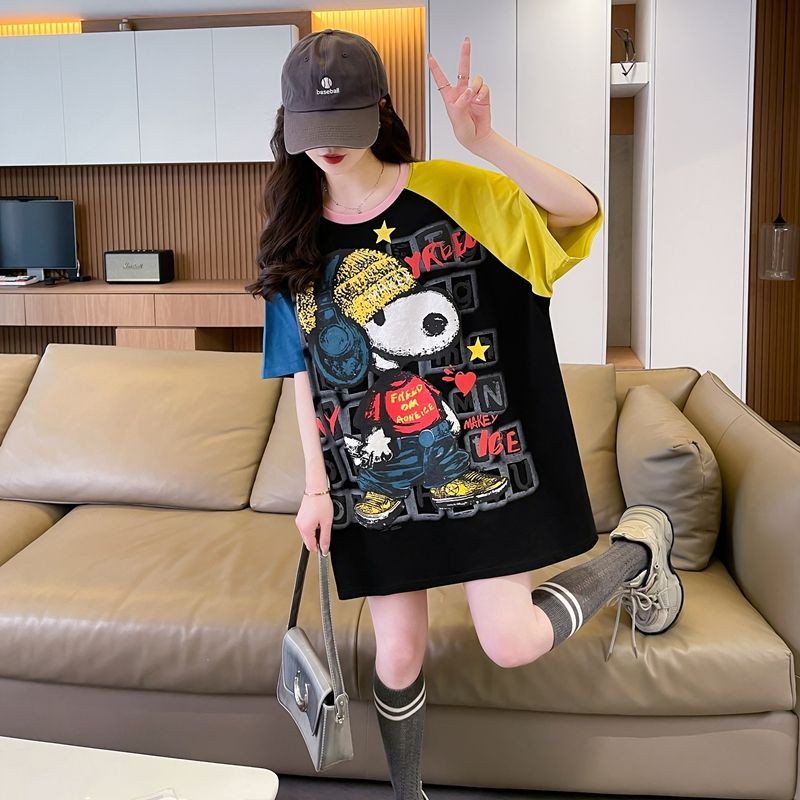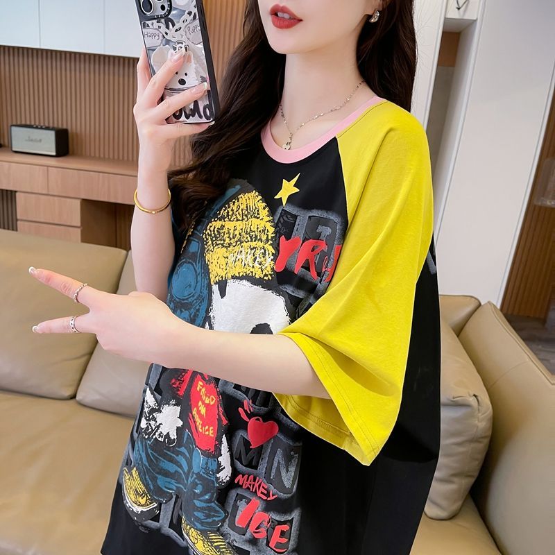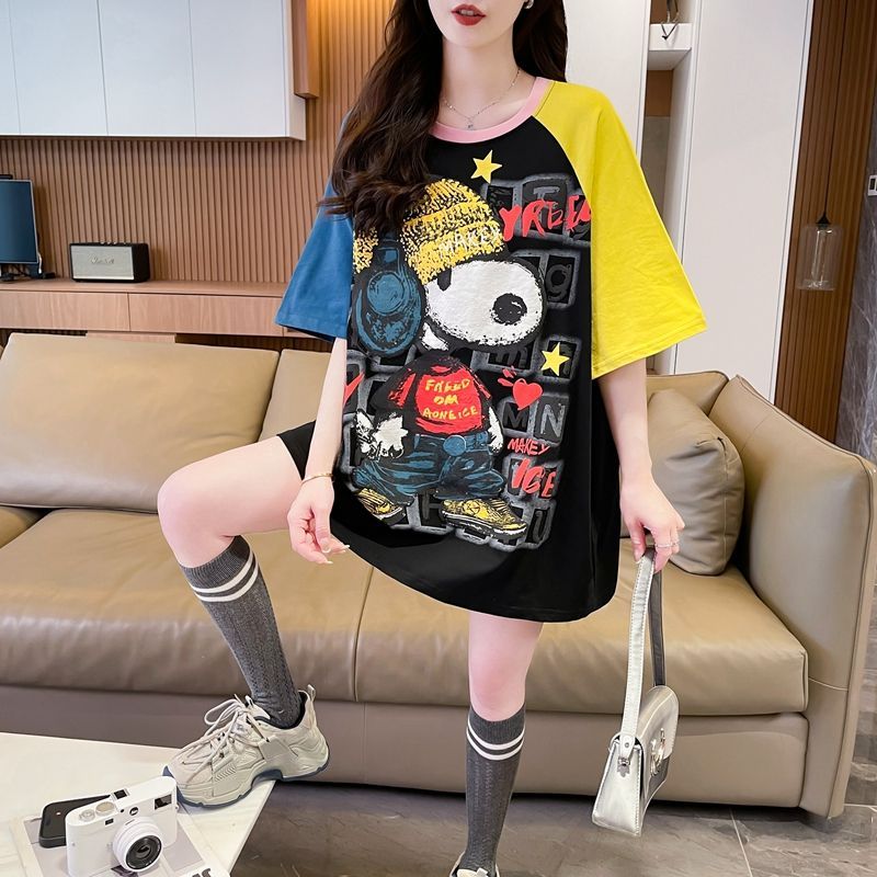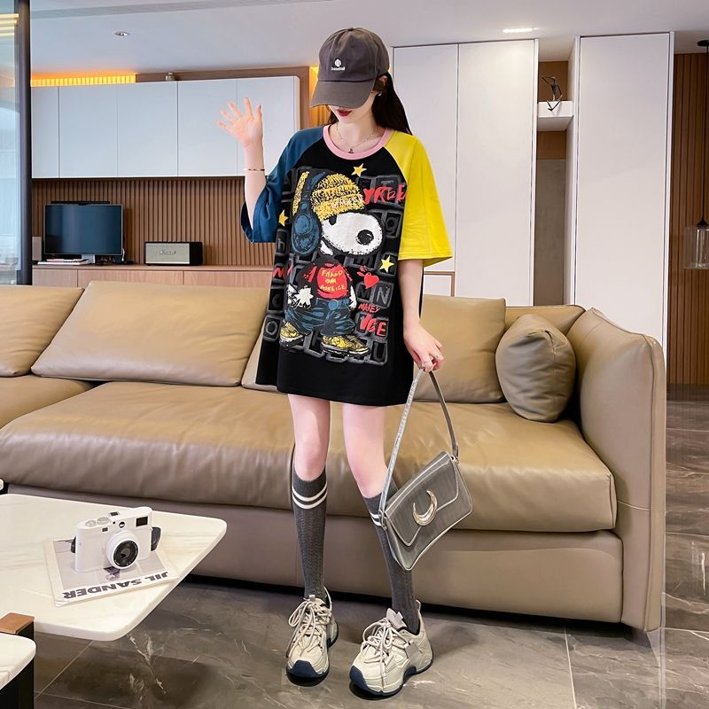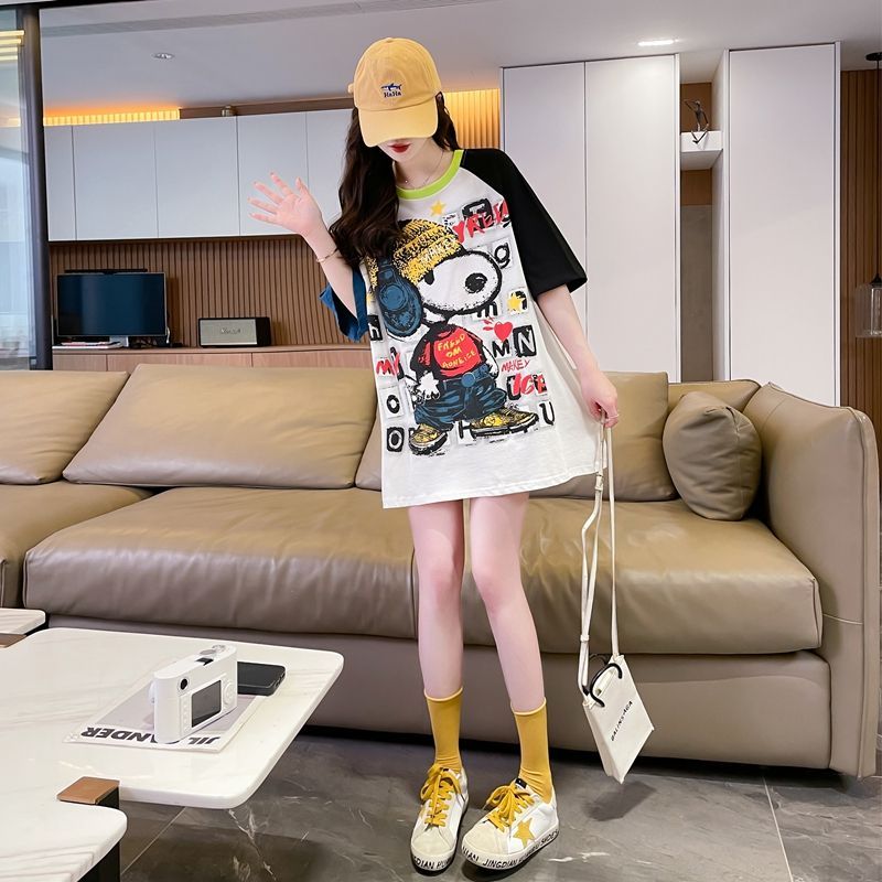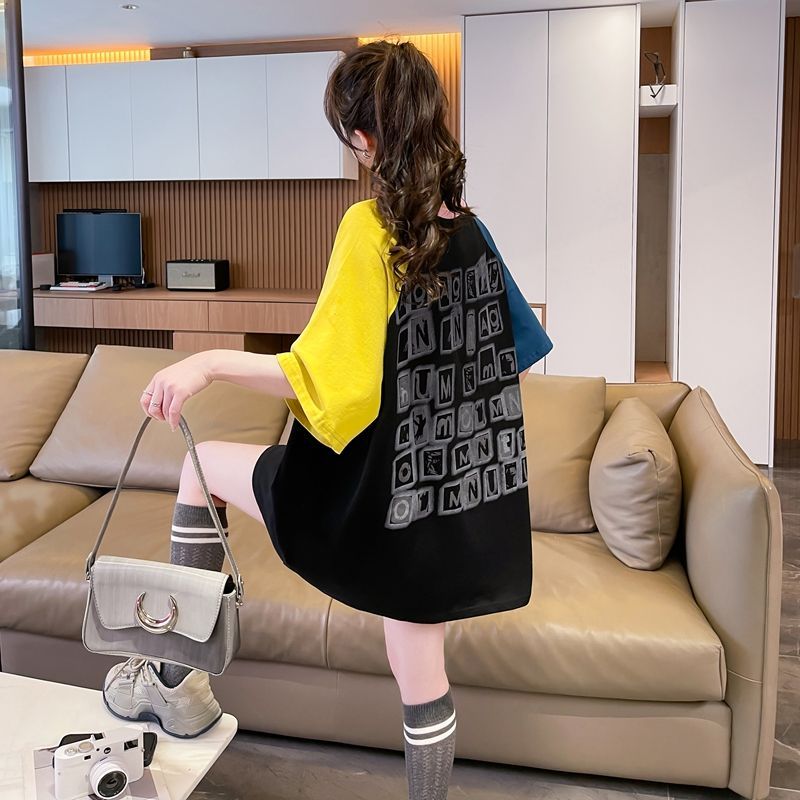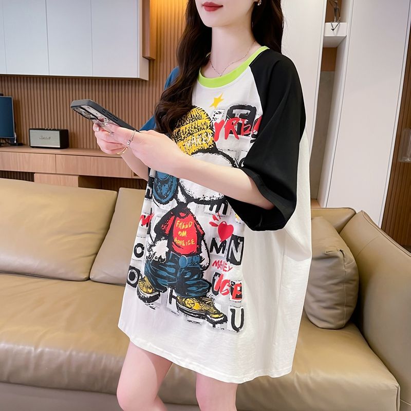 RY3022# 实拍 100%纯棉 后包领中长款撞色圆领短袖T恤女