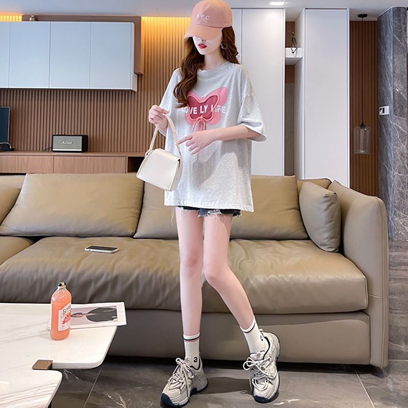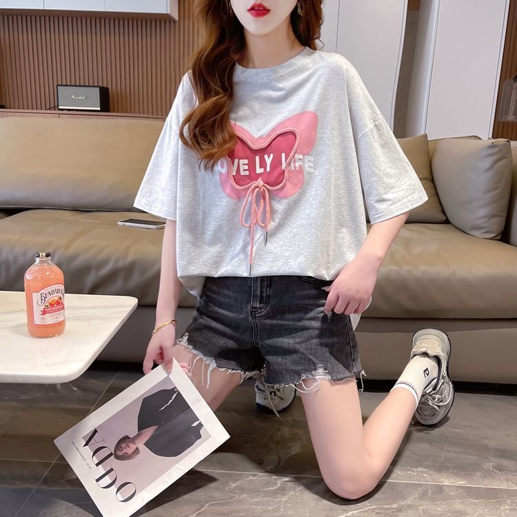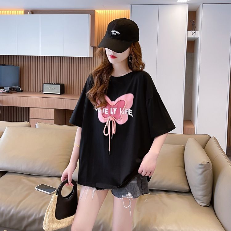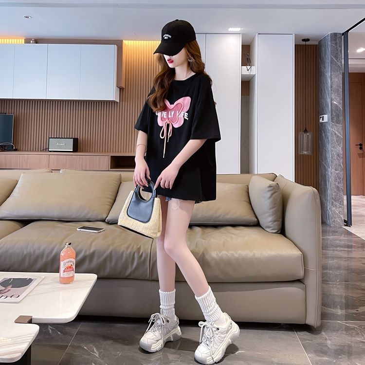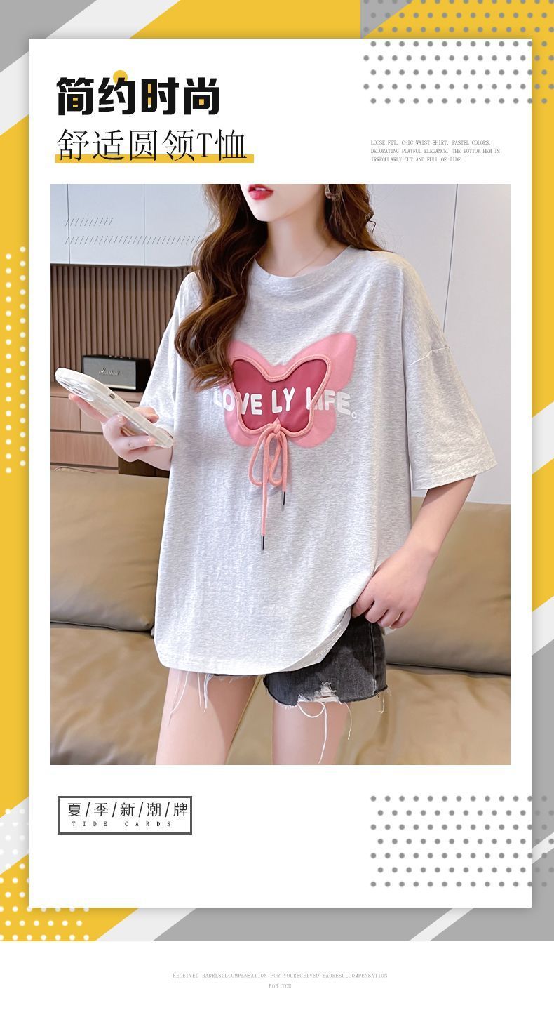 RY3023# 实拍 100%纯棉 后包领 韩版中长款重工印花短袖T恤女