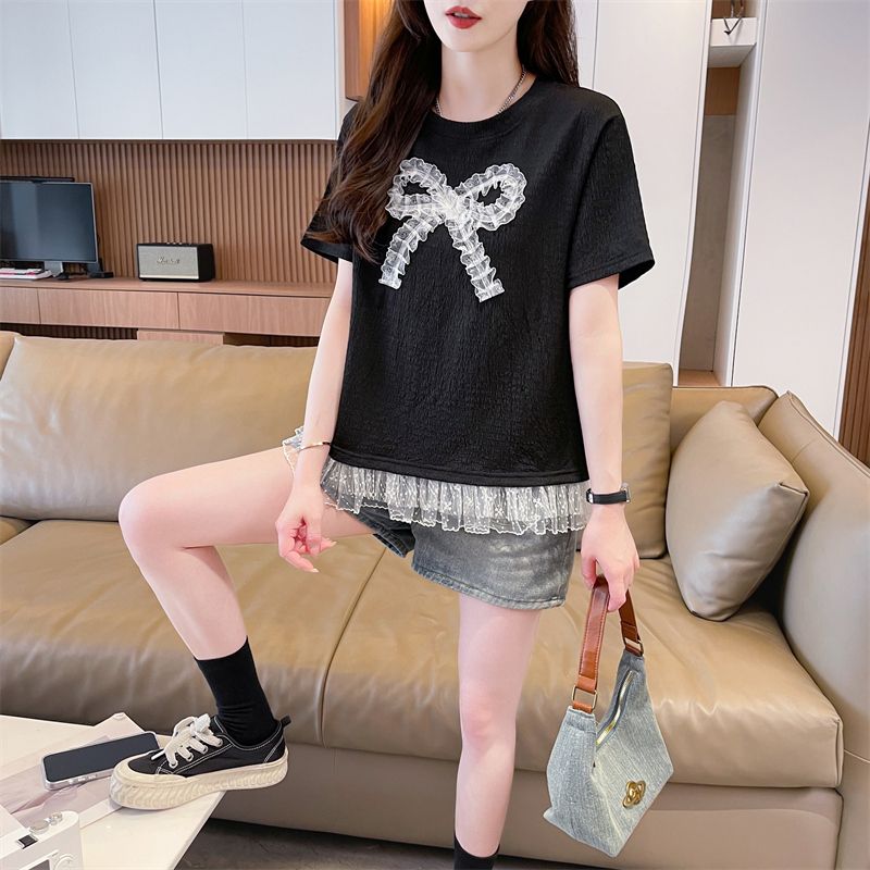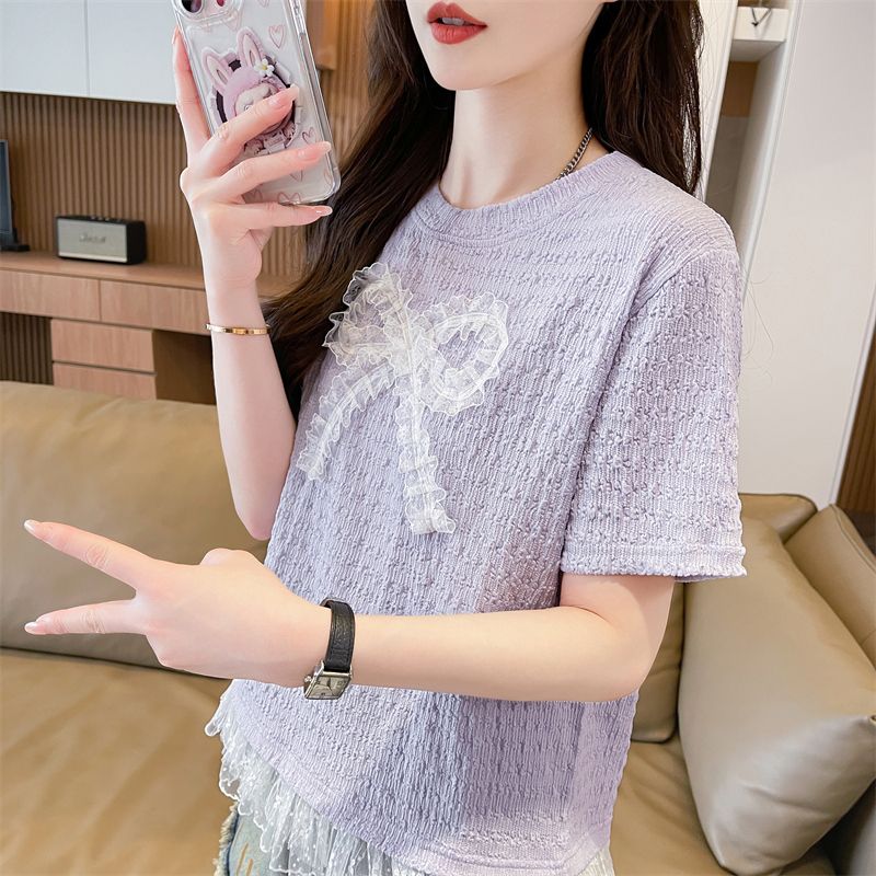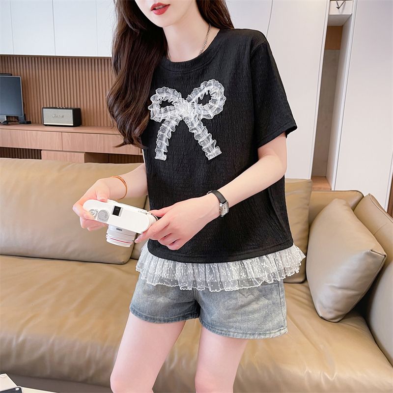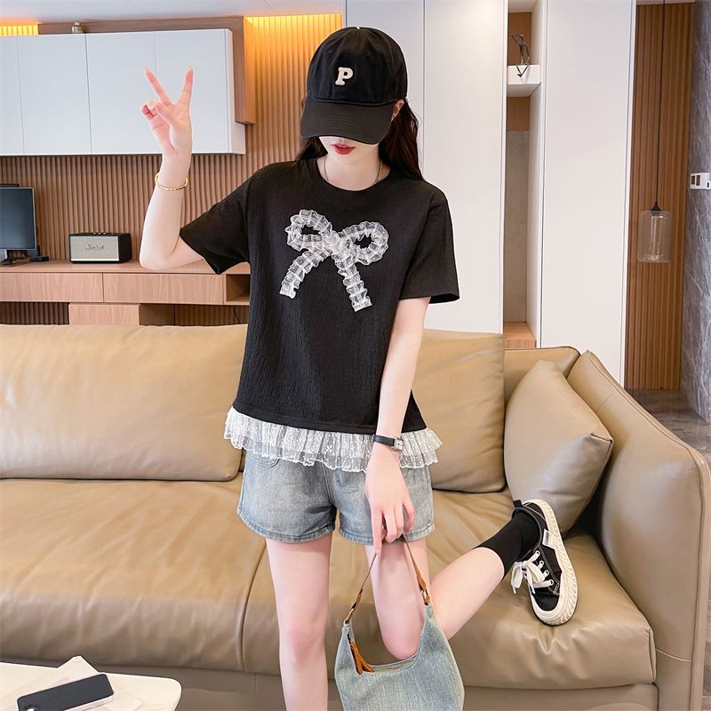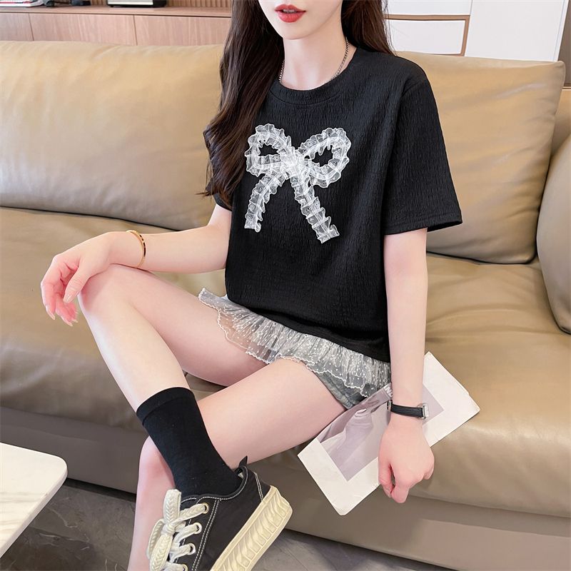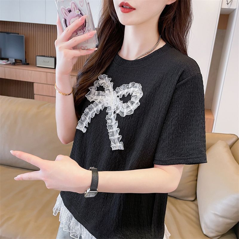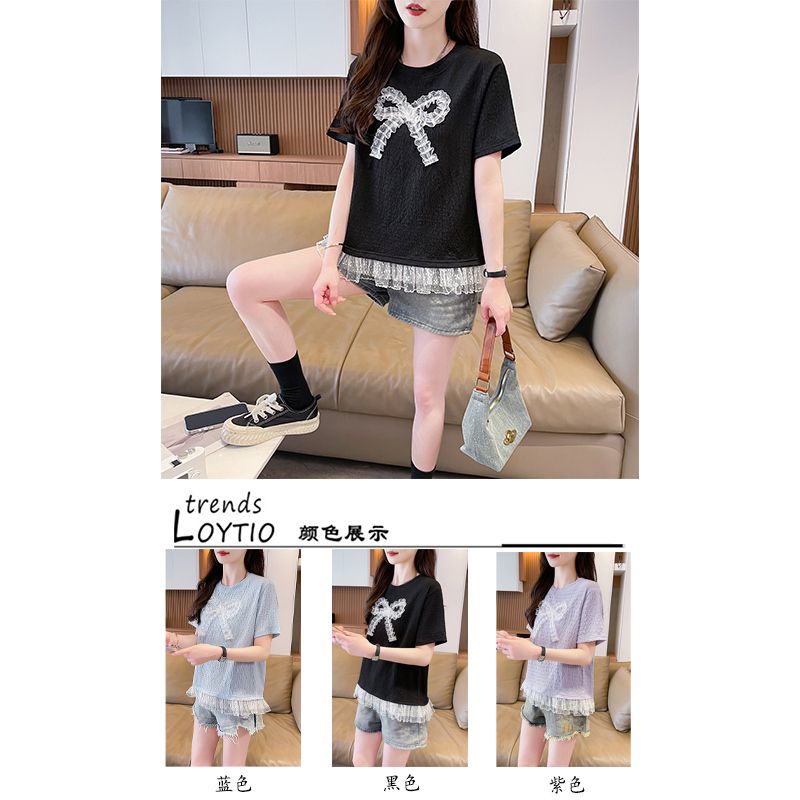 RY3025# 实拍短袖t恤女夏季新款宽松时尚韩版大蝴蝶结蕾丝气质上衣女