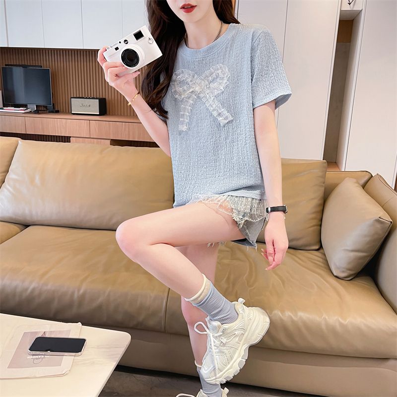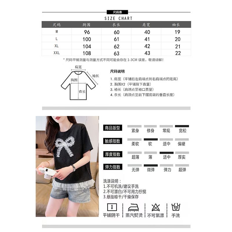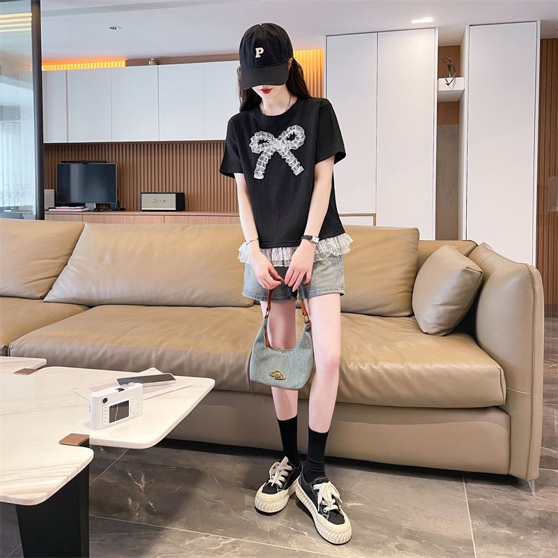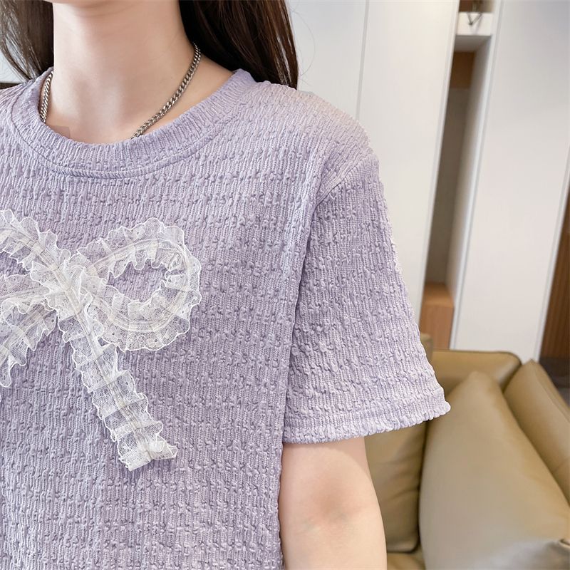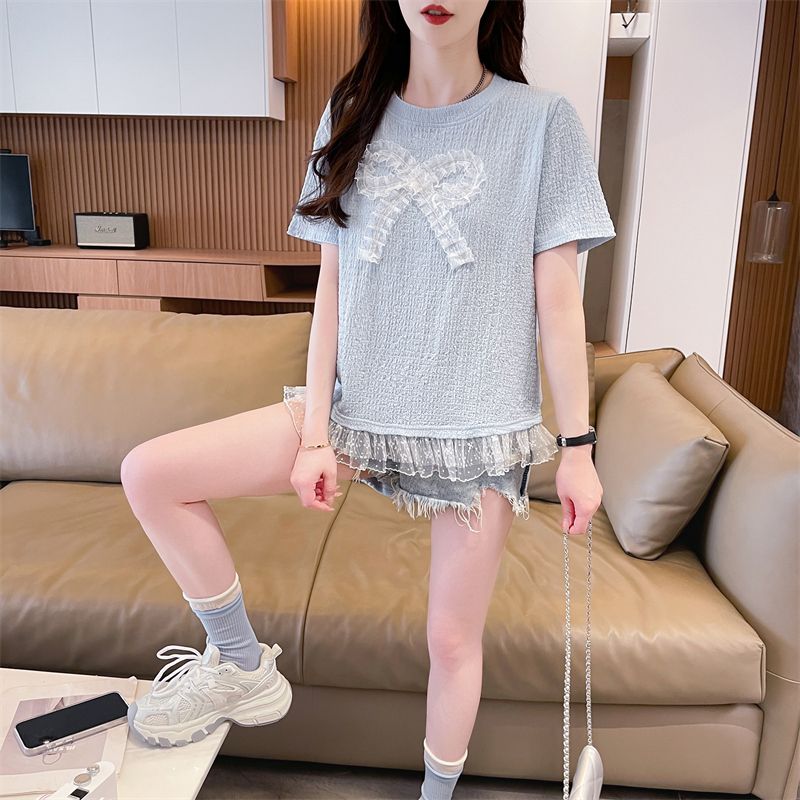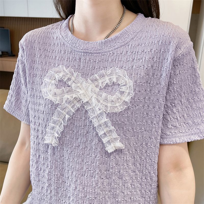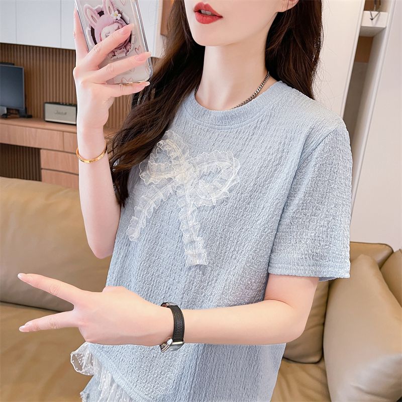 RY3025# 实拍短袖t恤女夏季新款宽松时尚韩版大蝴蝶结蕾丝气质上衣女