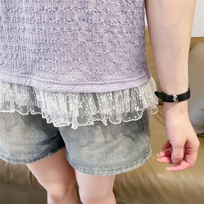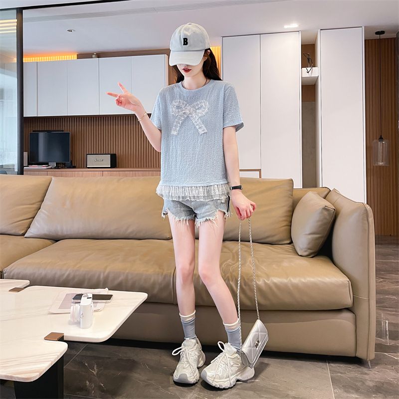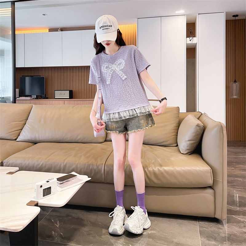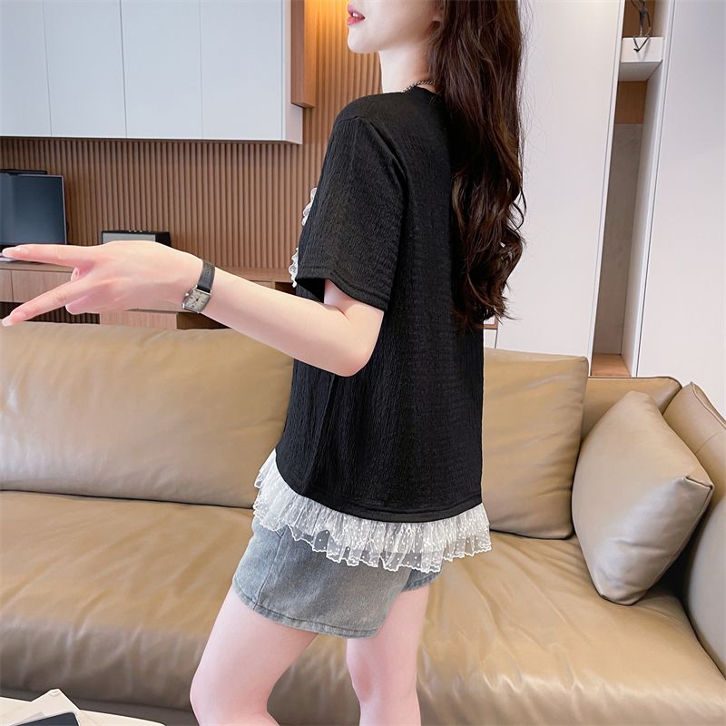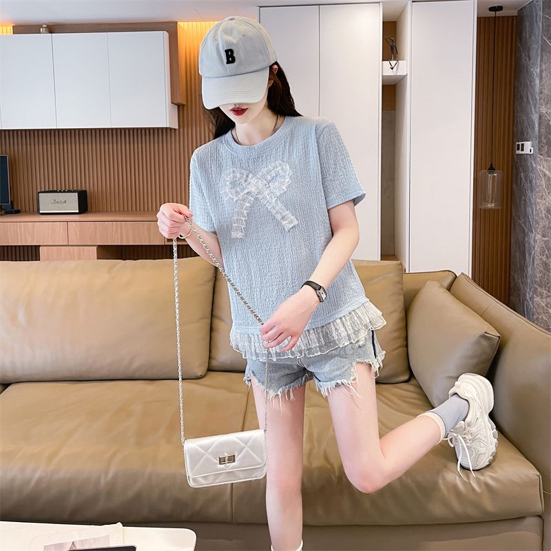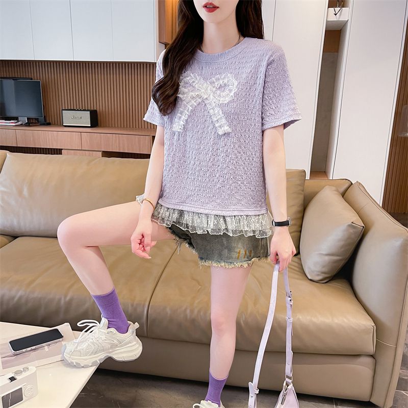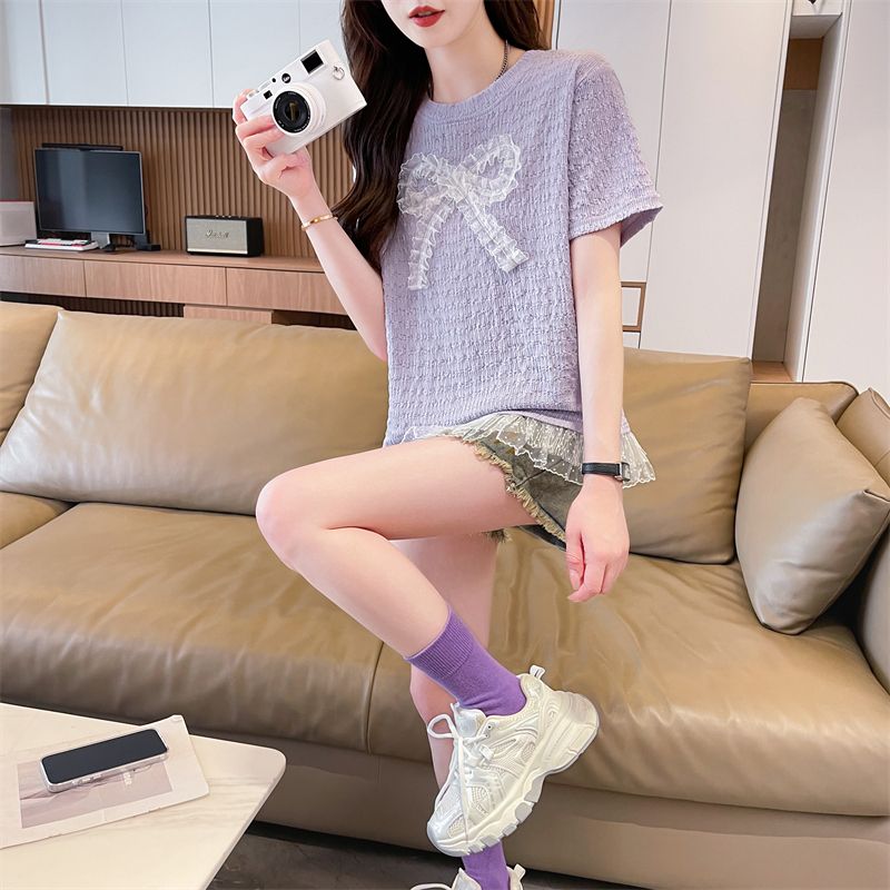 RY3025# 实拍短袖t恤女夏季新款宽松时尚韩版大蝴蝶结蕾丝气质上衣女