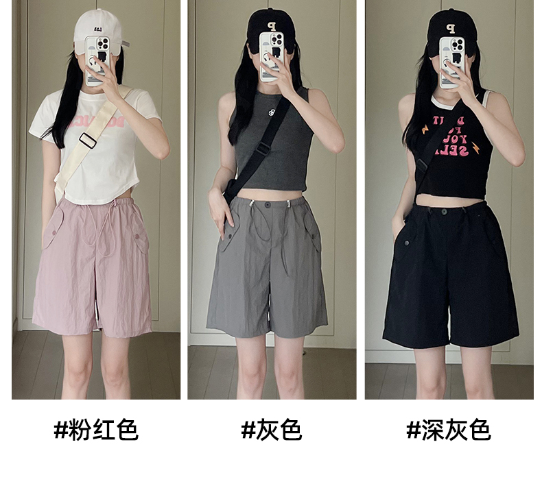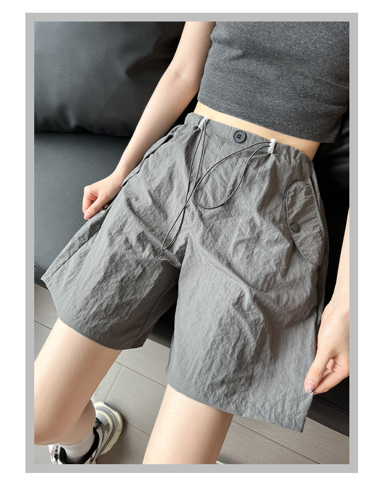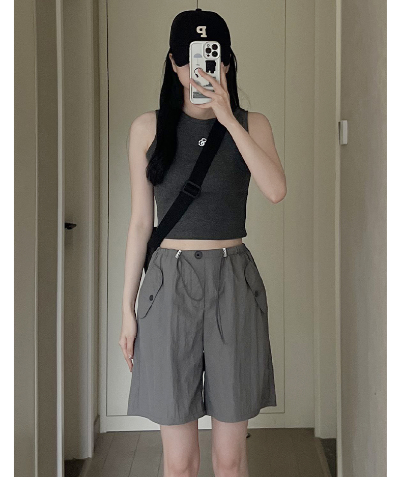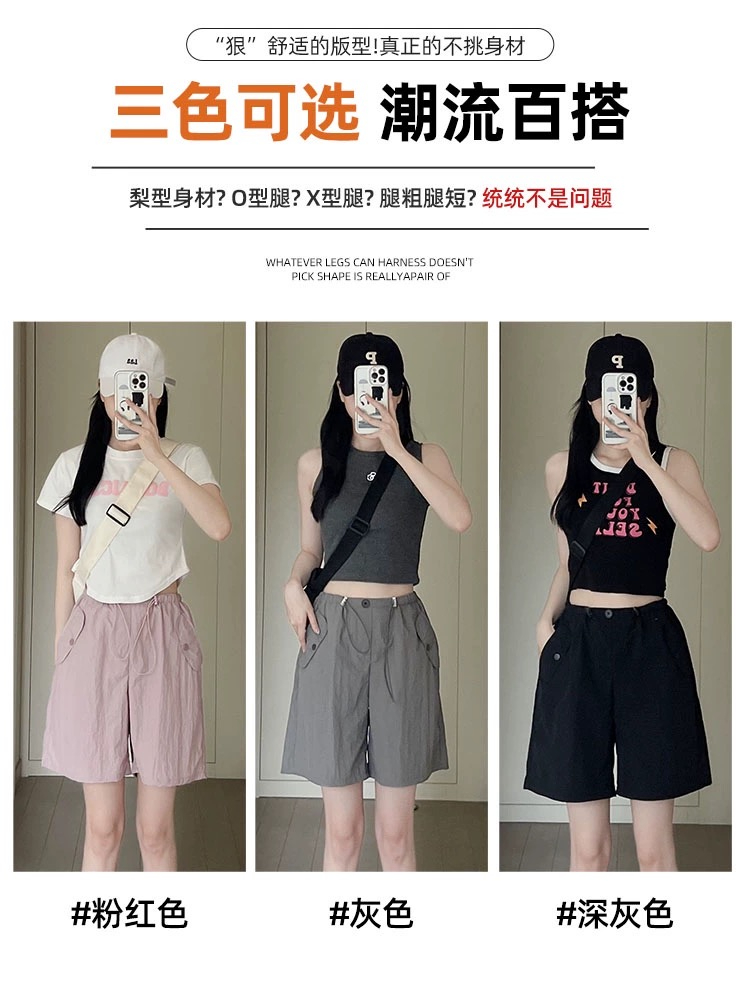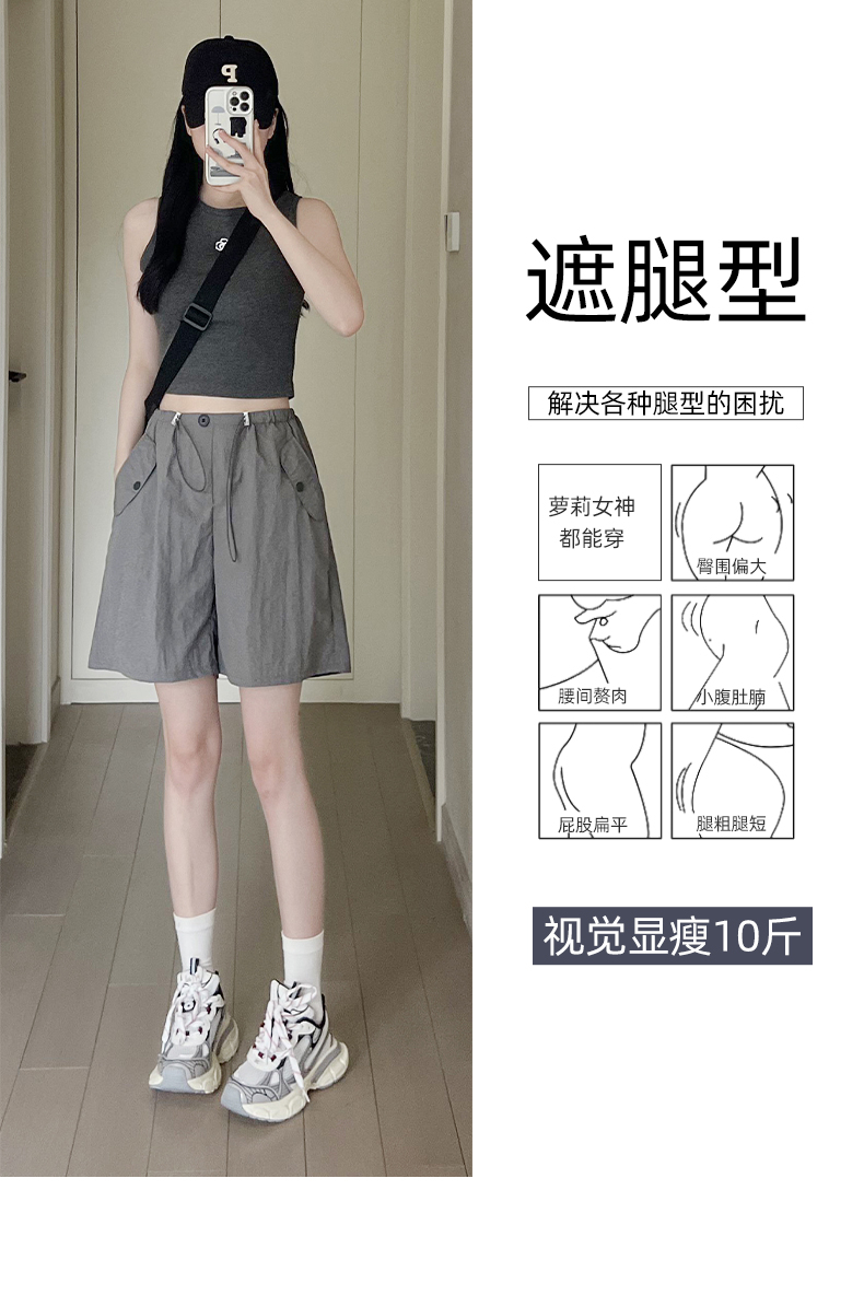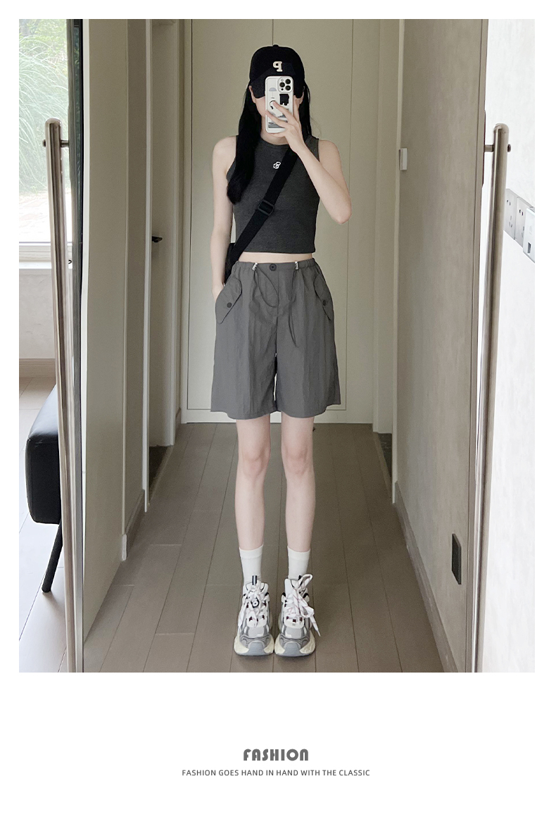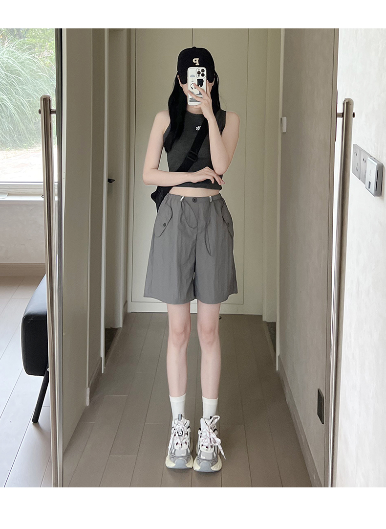 RY3028# 灰色工装短裤女夏季薄款高腰休闲阔腿设计感速干运动美式五分裤子
