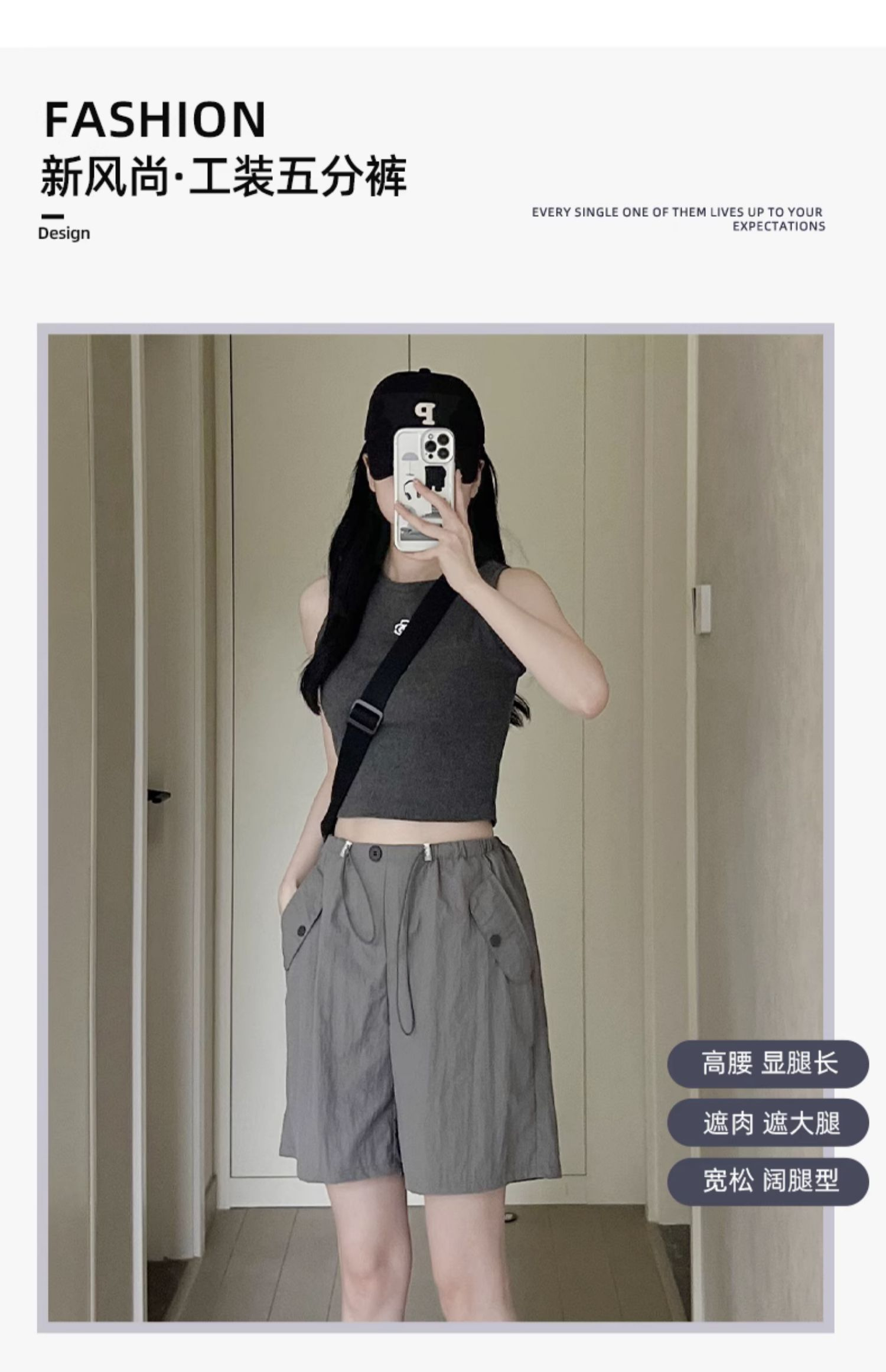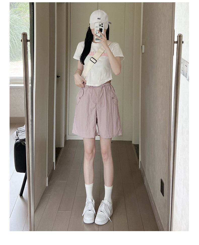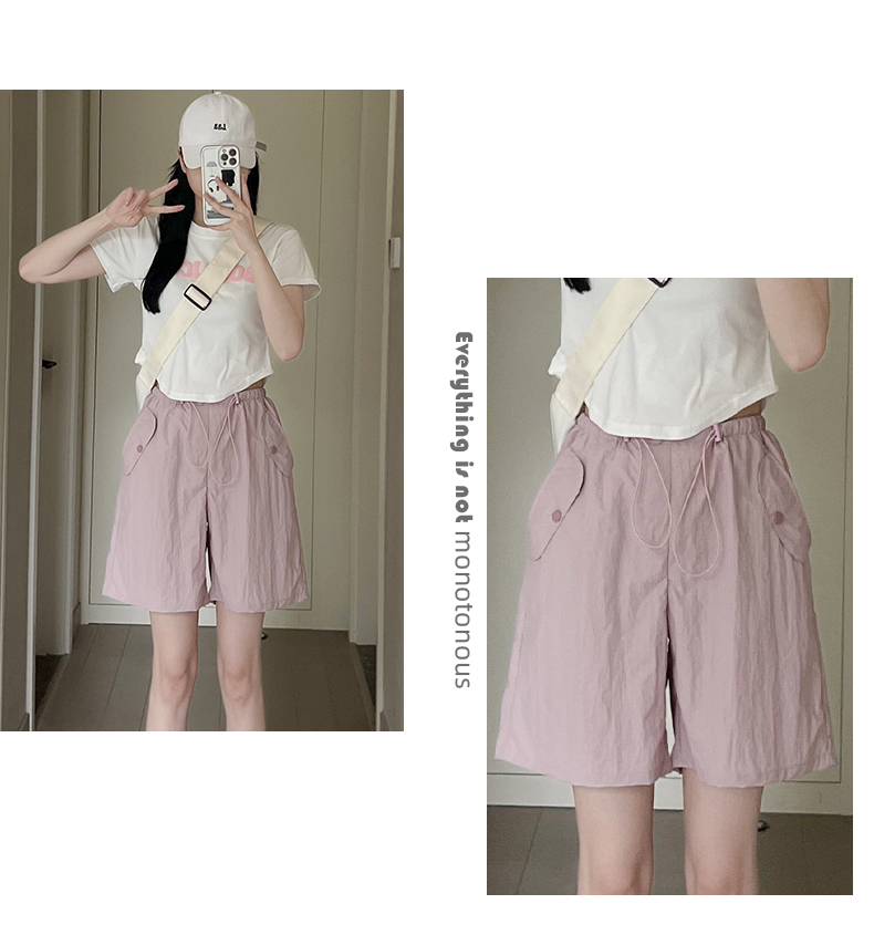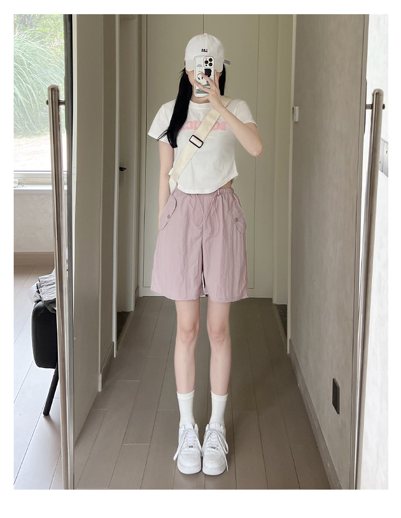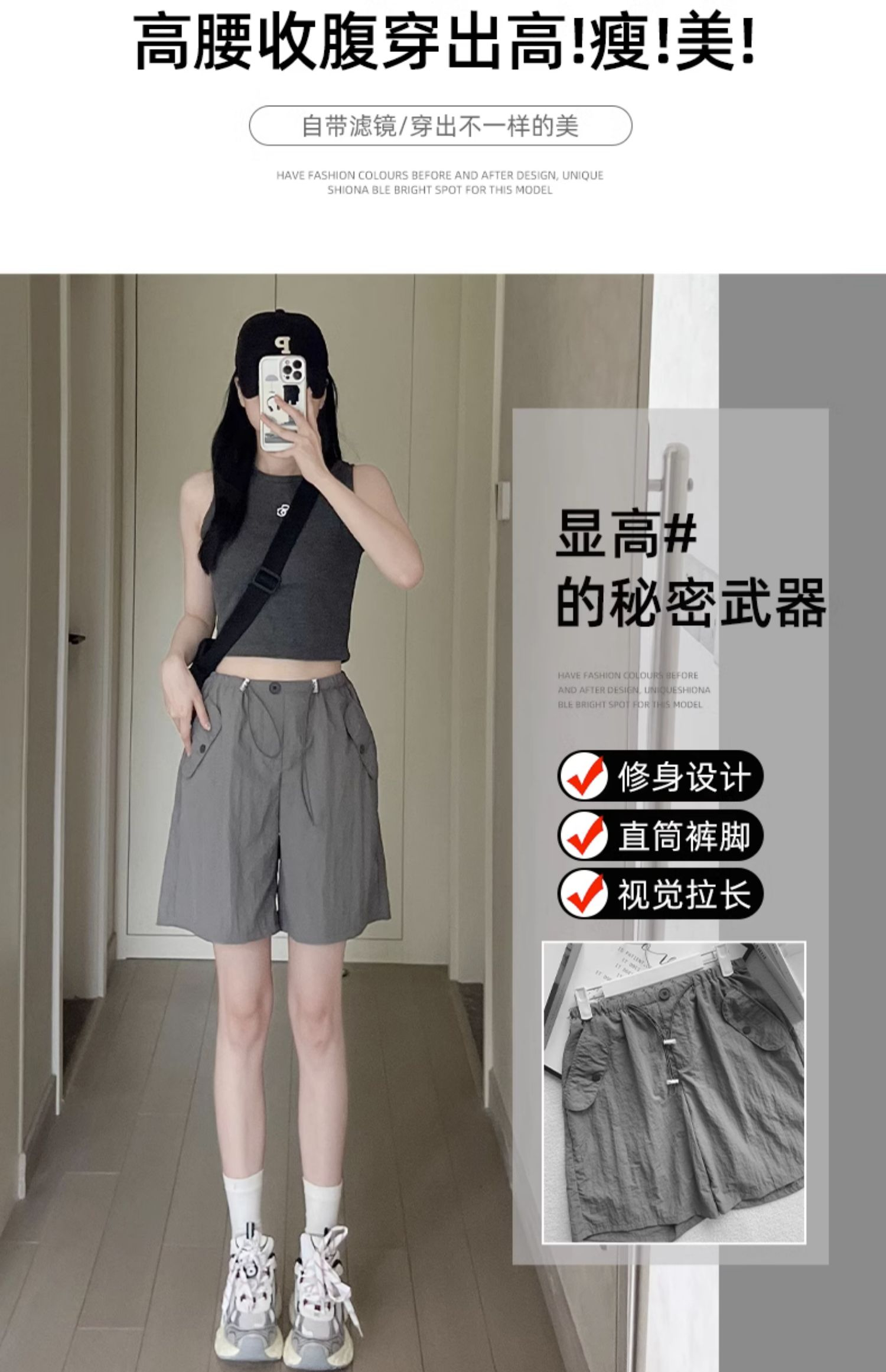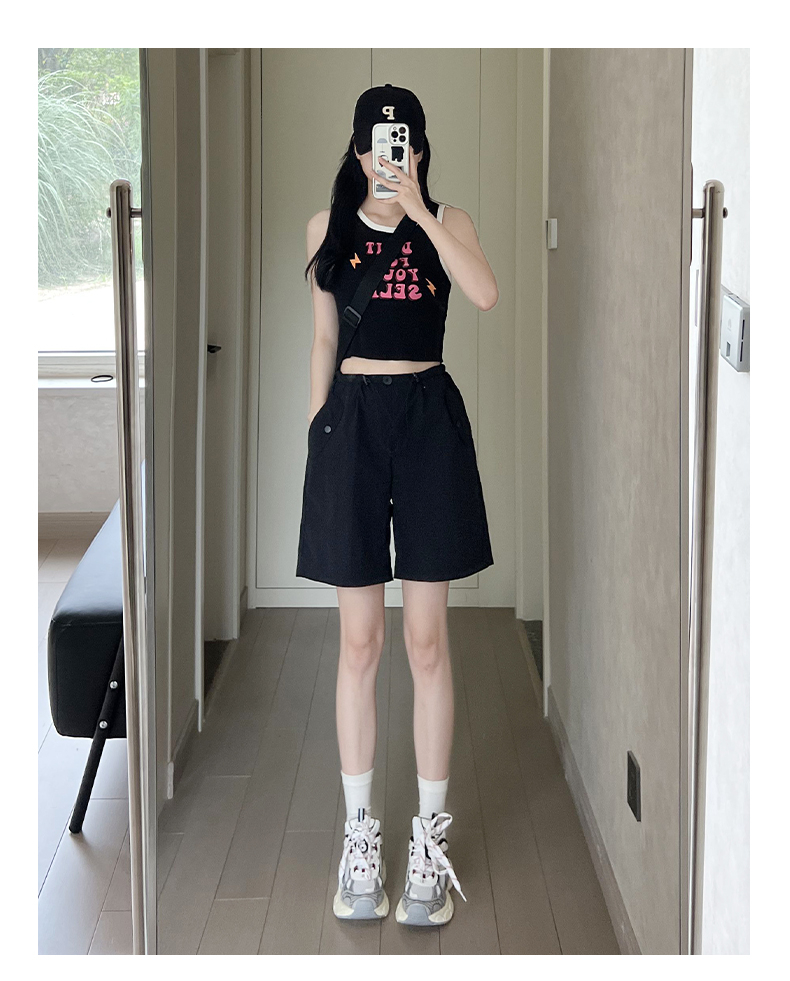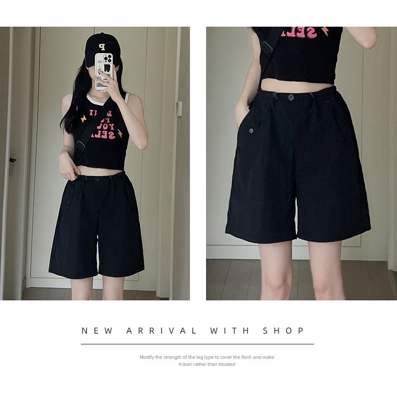 RY3028# 灰色工装短裤女夏季薄款高腰休闲阔腿设计感速干运动美式五分裤子