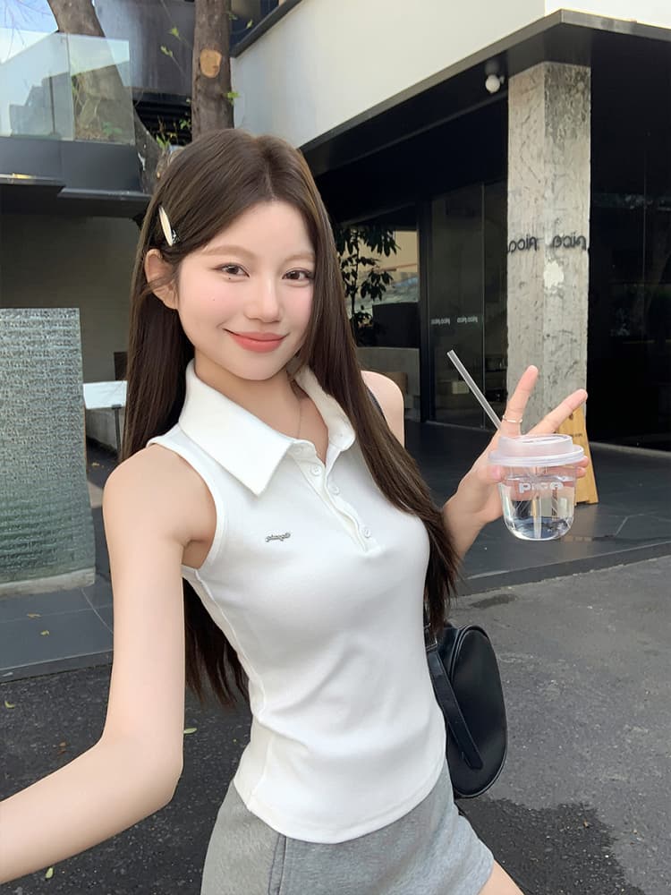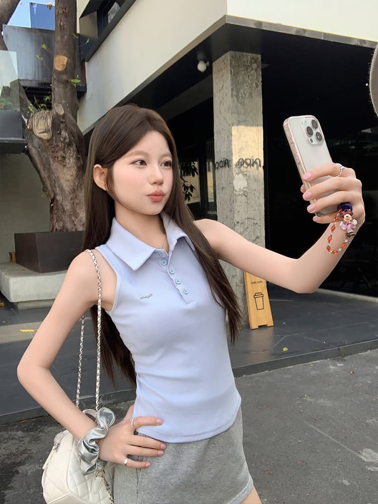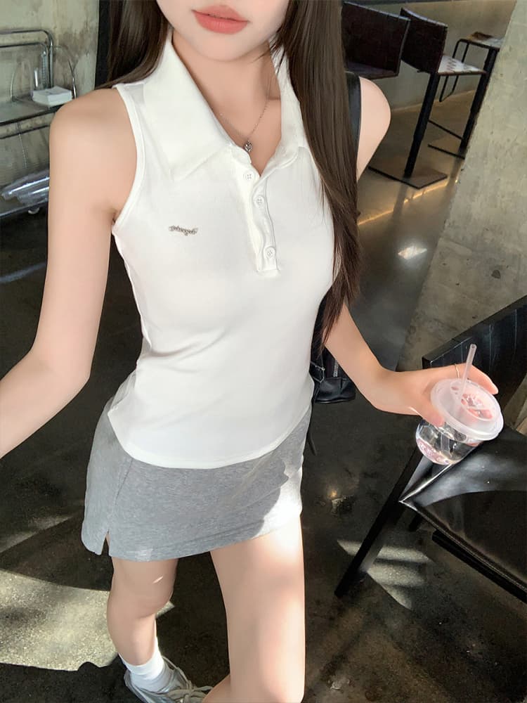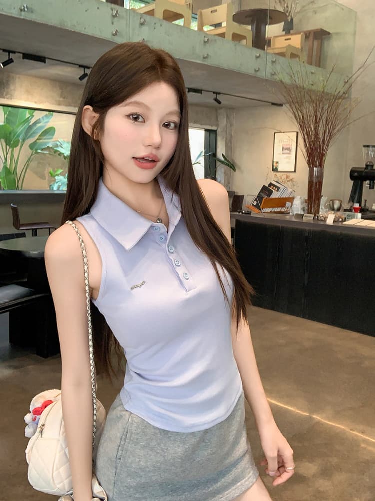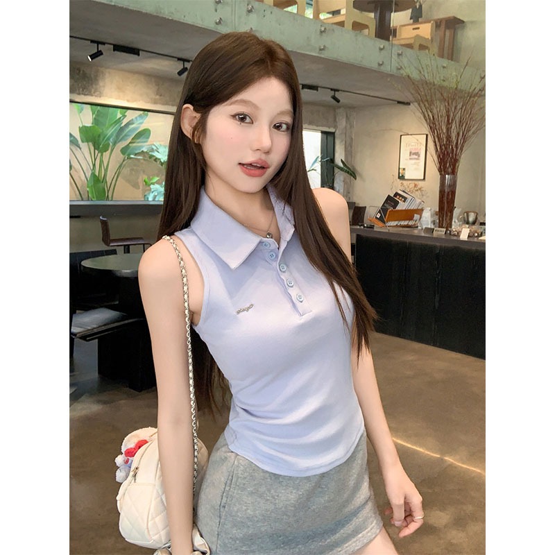 RY3033# 原版品质Polo领无袖背心夏季新款设计感修身辣妹短款上衣