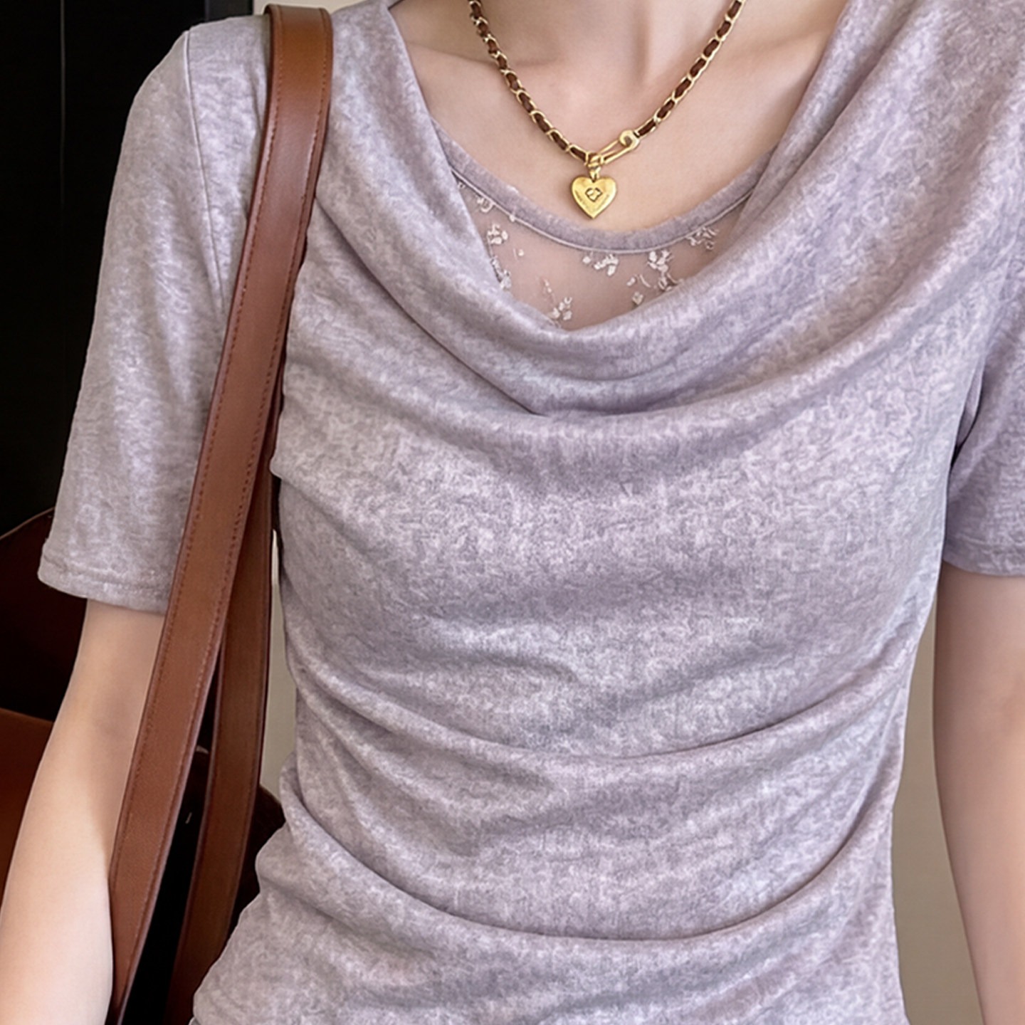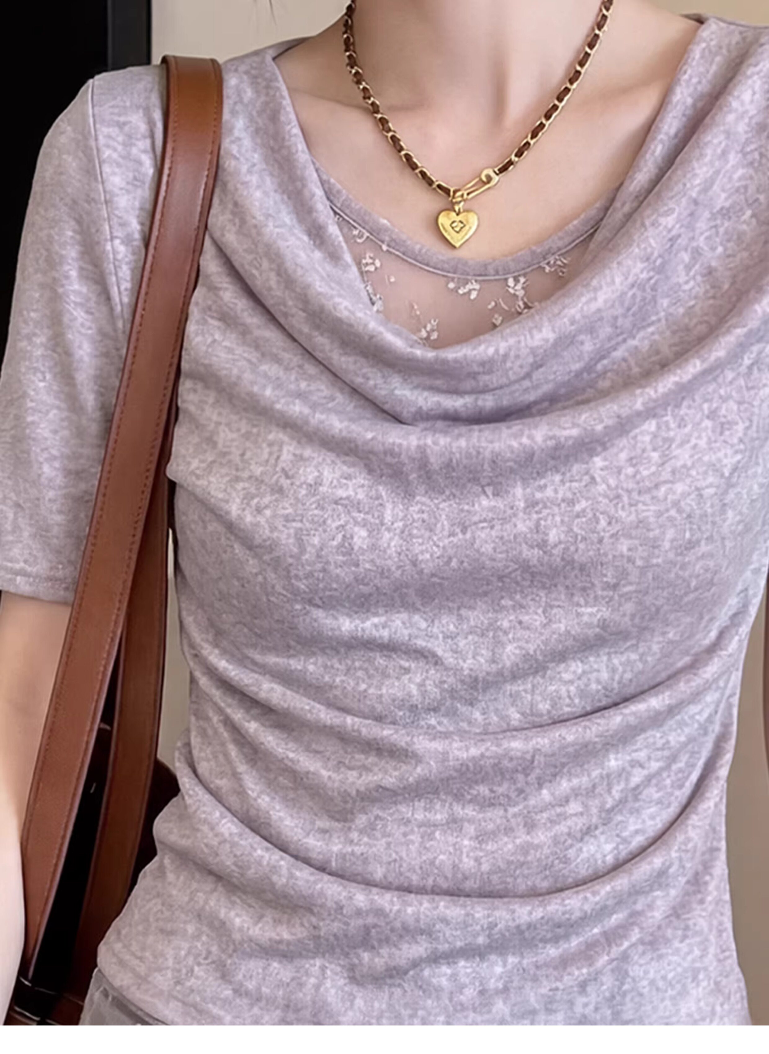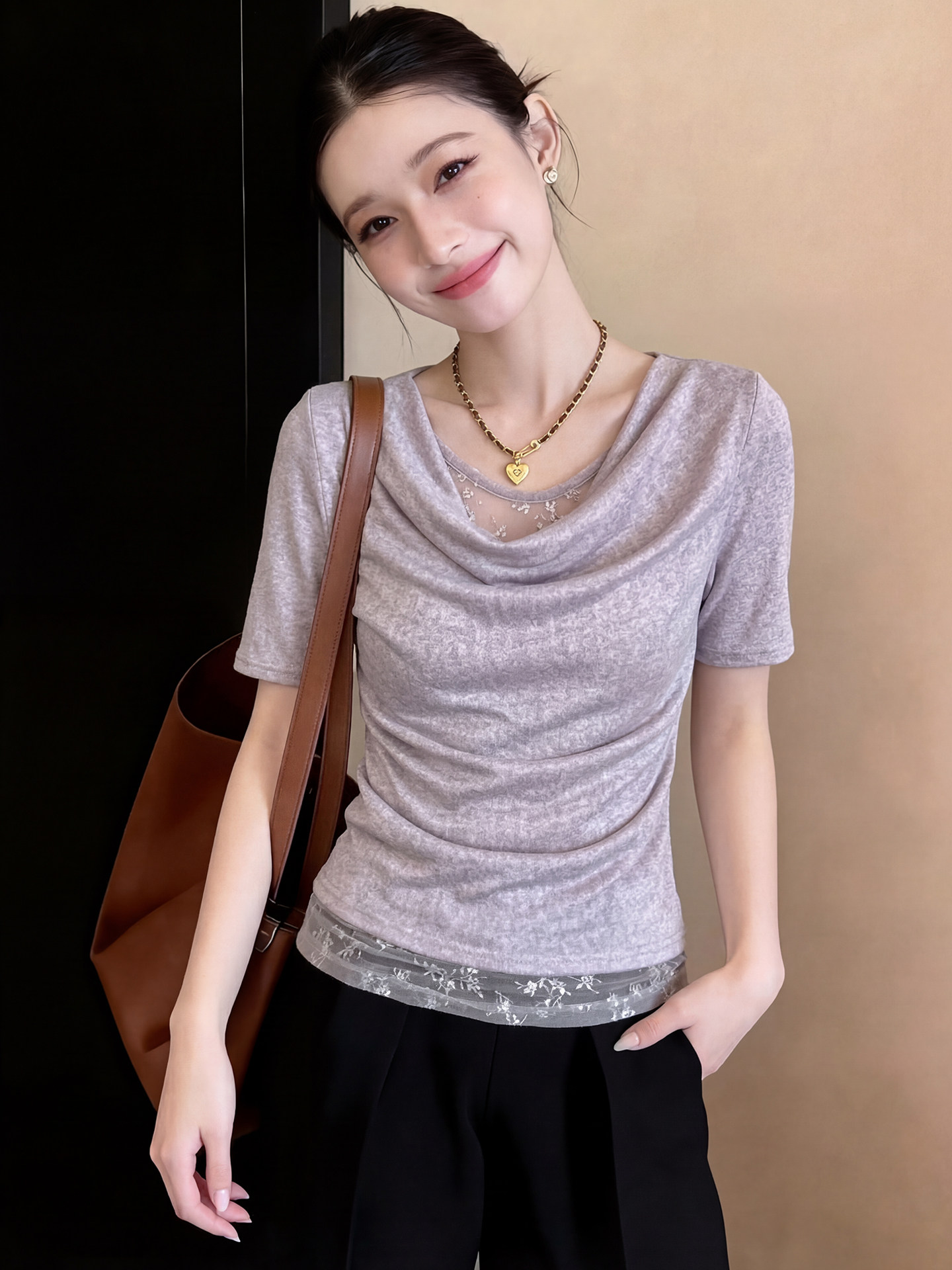 RY3037# 夏季独特漂亮荡领2026新款气质女士设计感假两件巨好看的短袖t恤