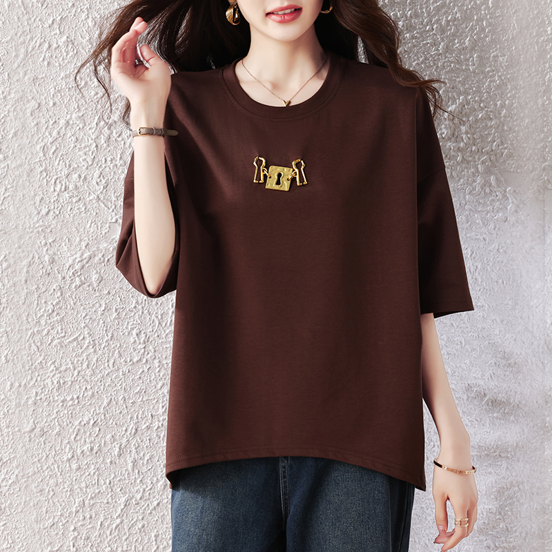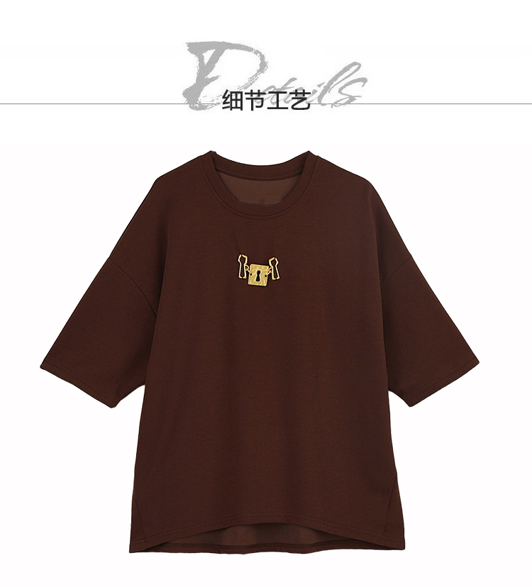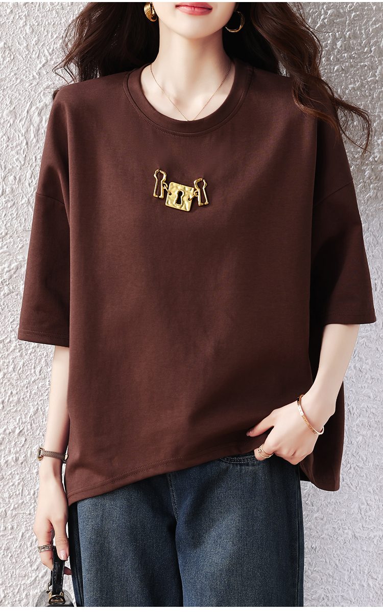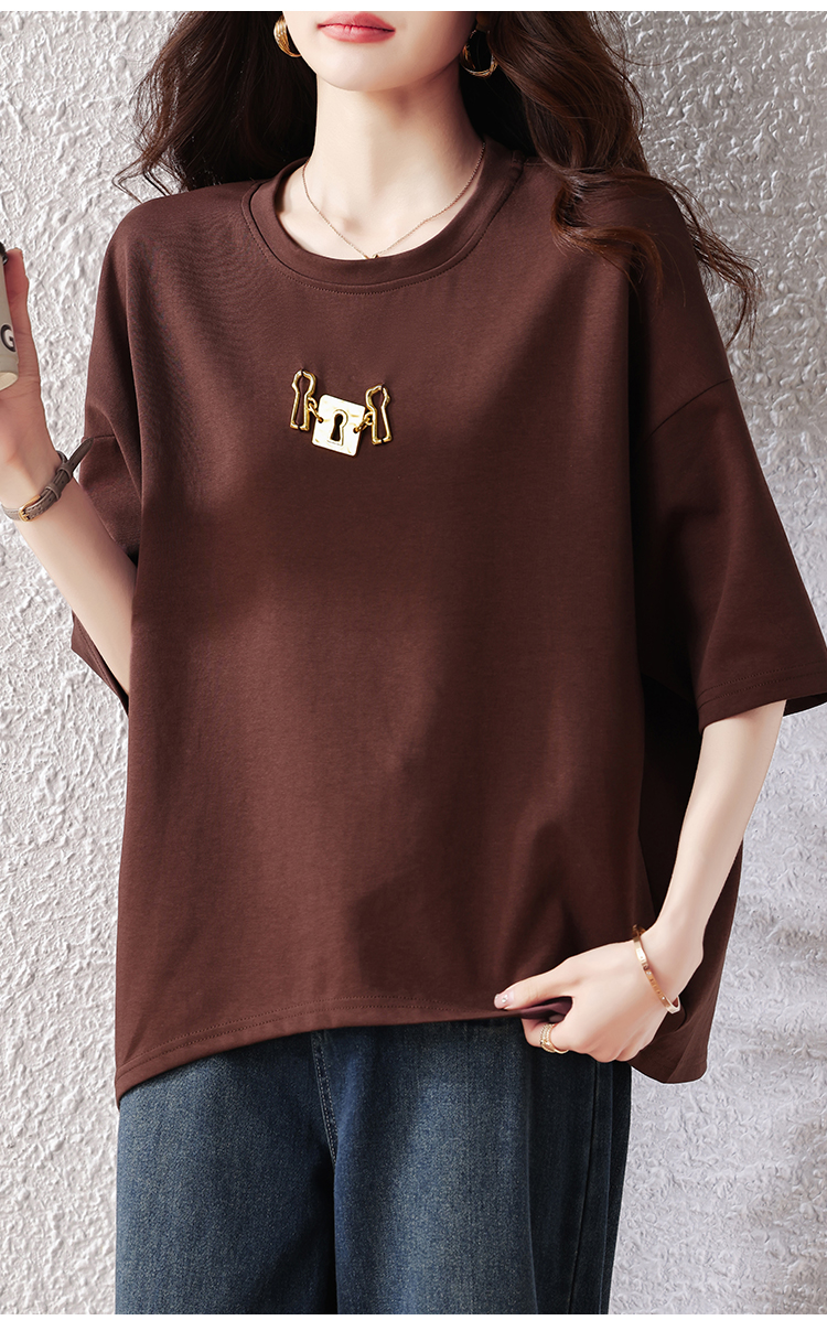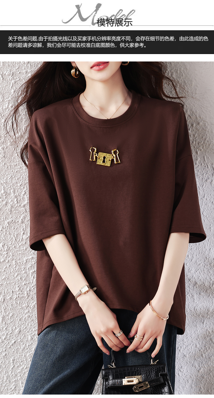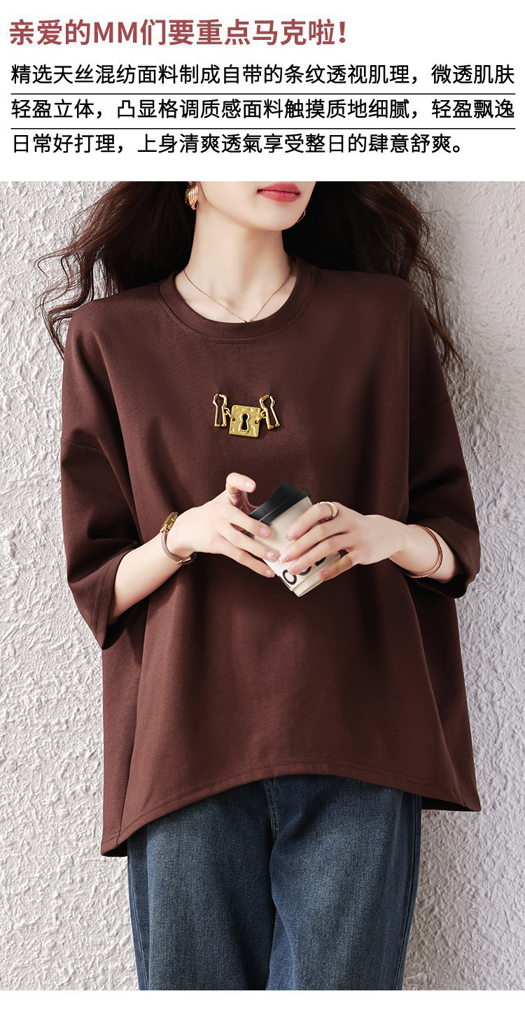 RY3042# 实拍2026夏新款大码女装胖mm简约时尚金属装饰宽松显瘦上衣T恤
