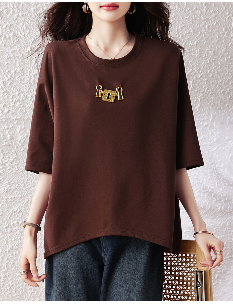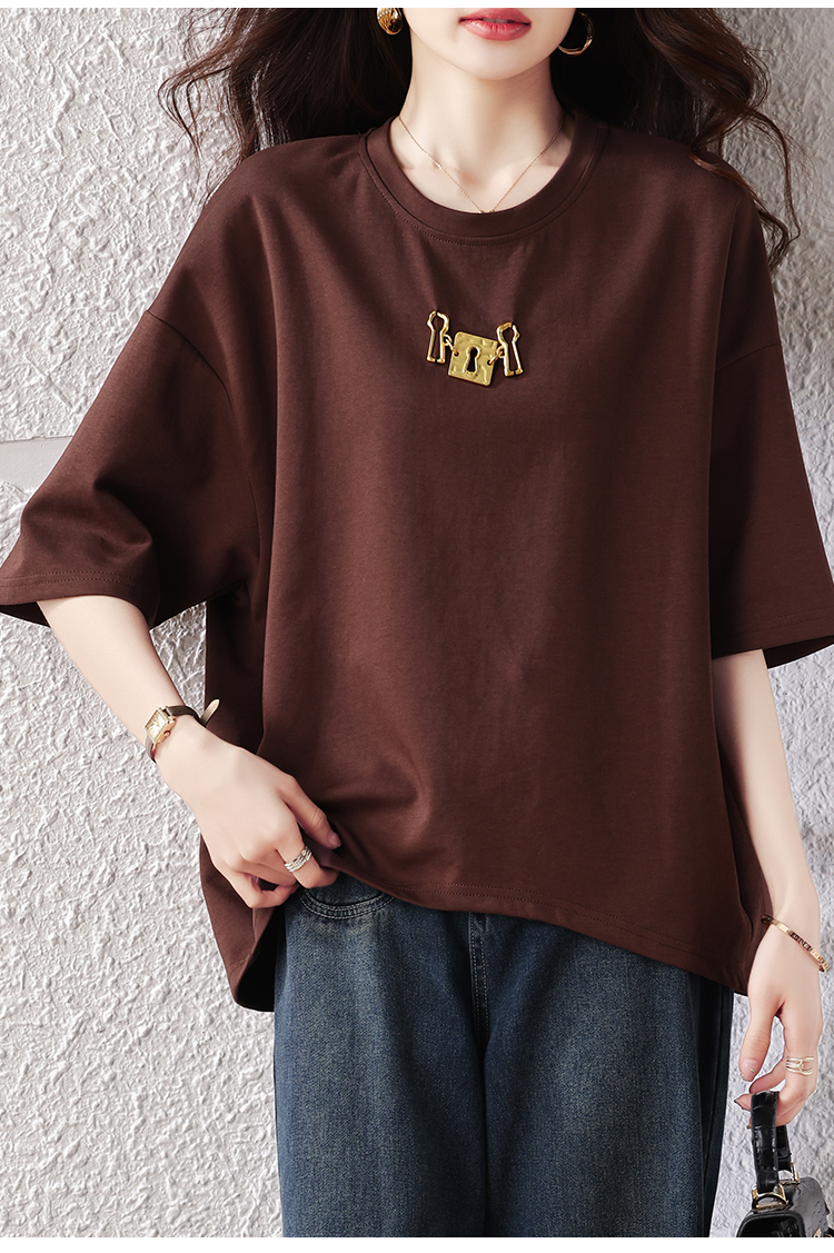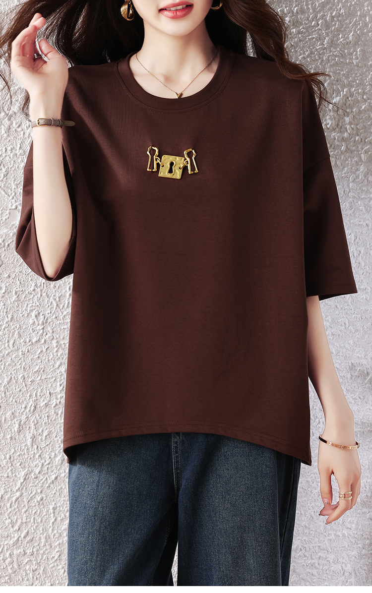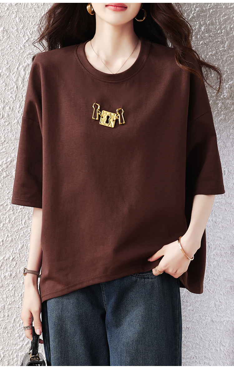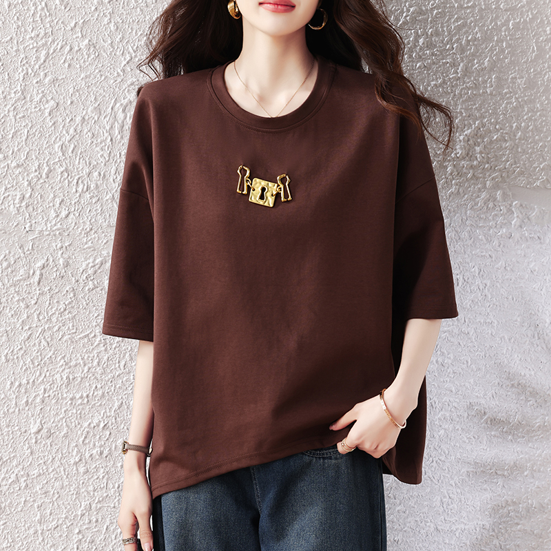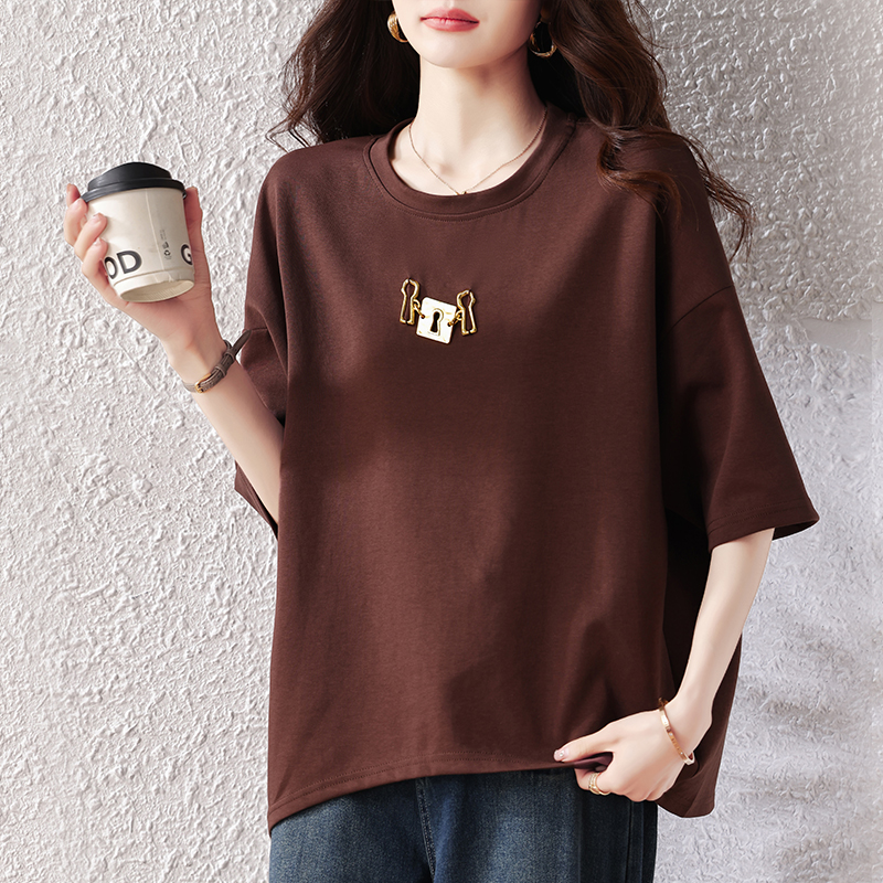 RY3042# 实拍2026夏新款大码女装胖mm简约时尚金属装饰宽松显瘦上衣T恤
