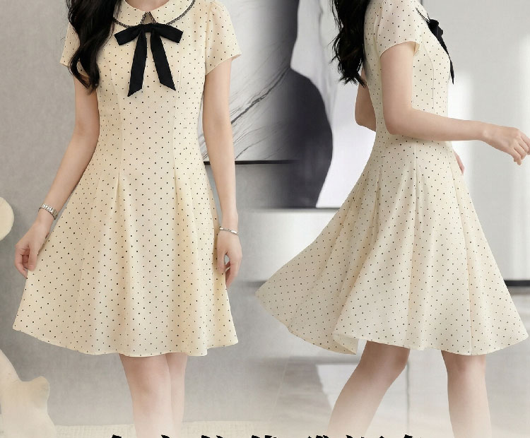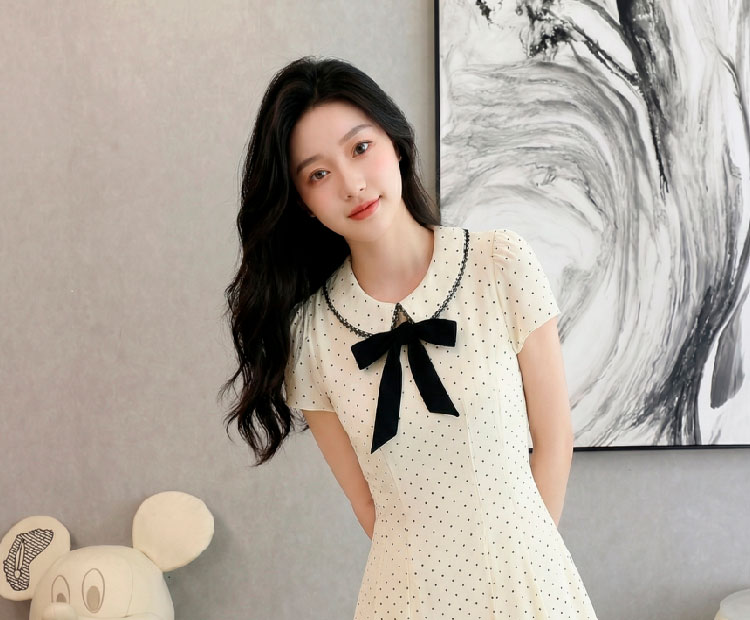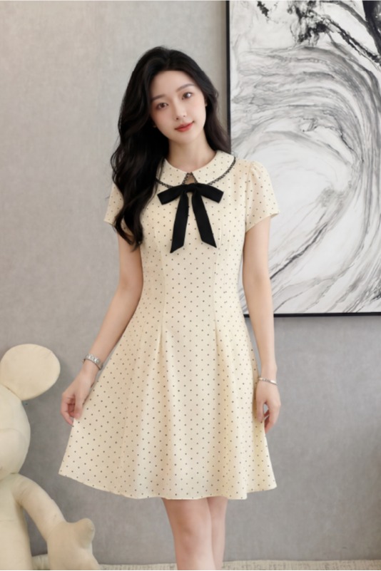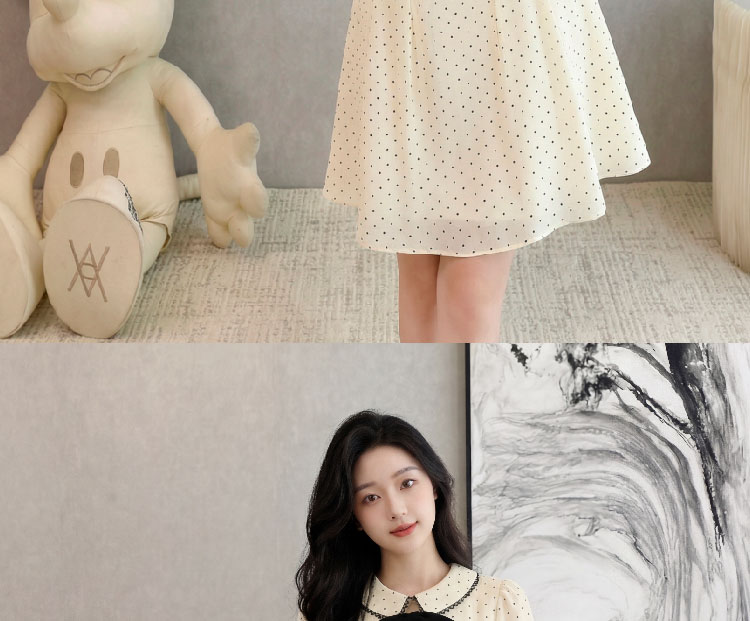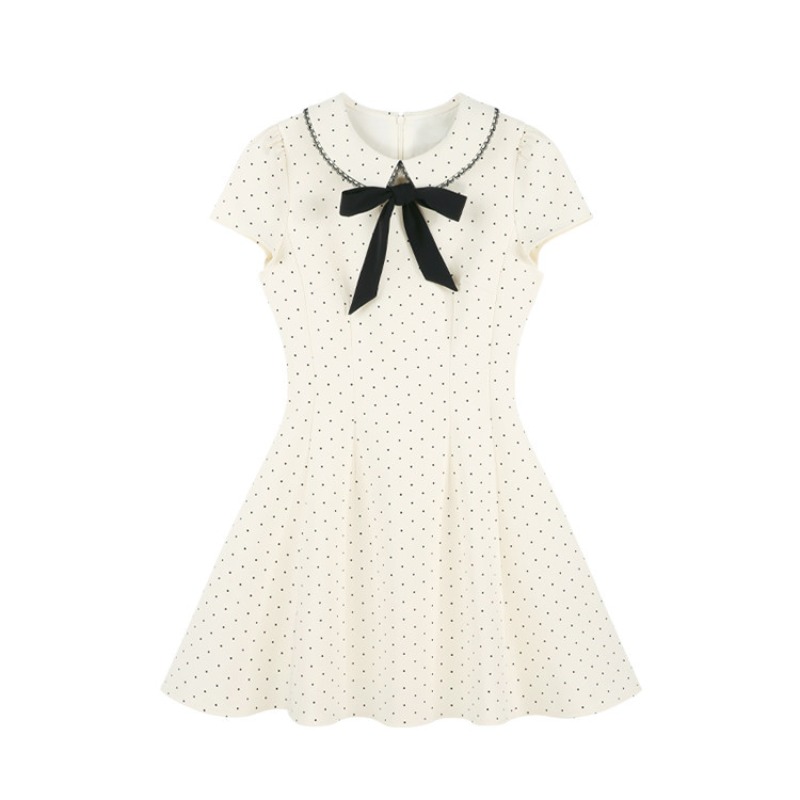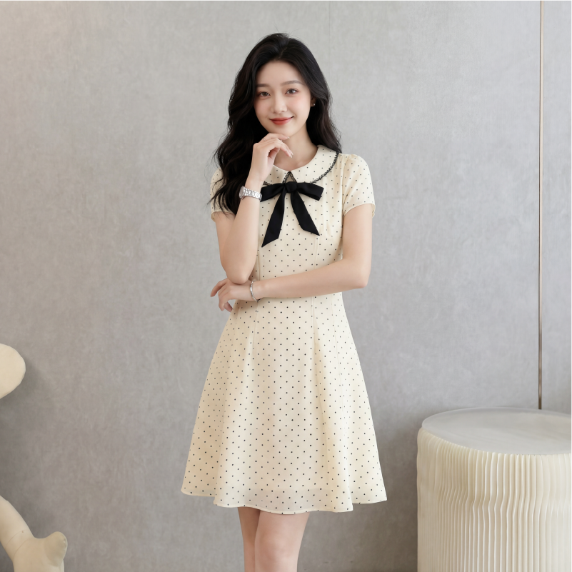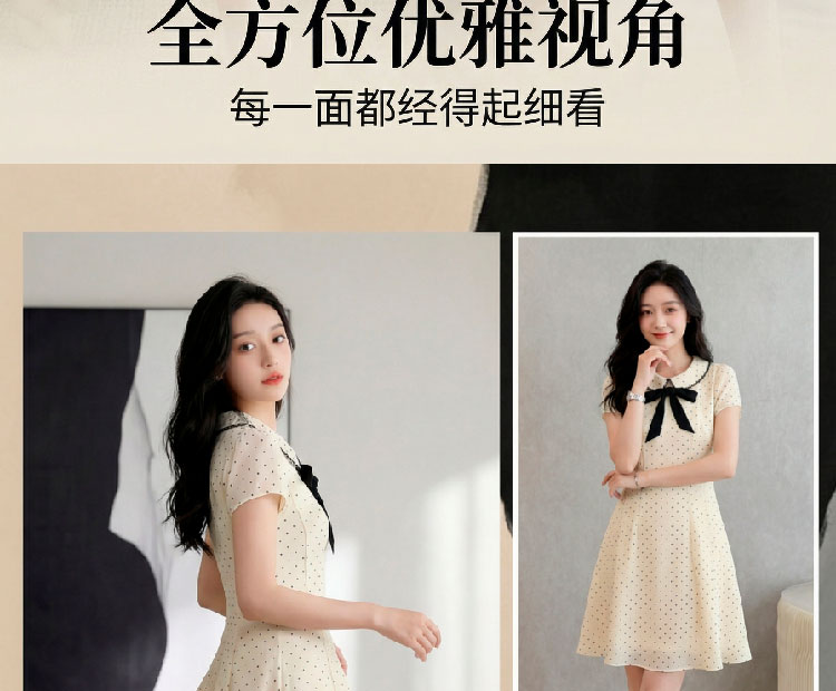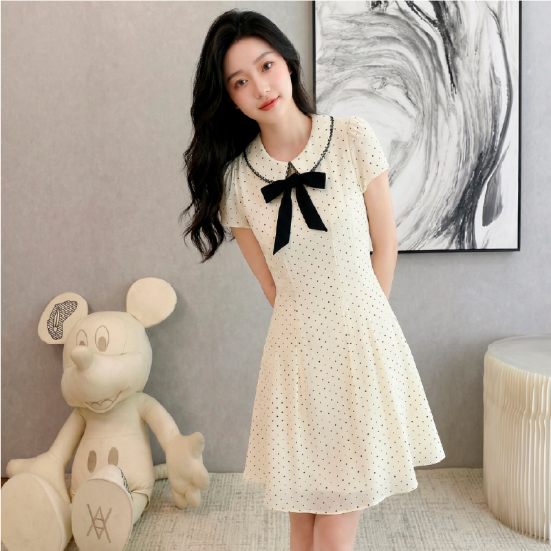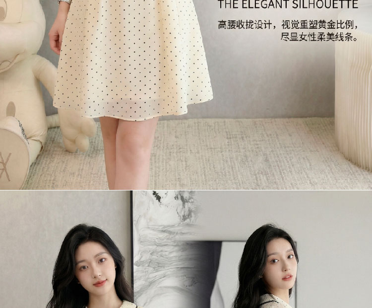 RY3046# 娃娃领甜美杏色波点连衣裙女夏季小香风法式掐腰miu系小洋裙a字裙