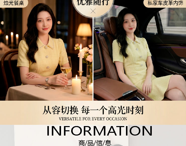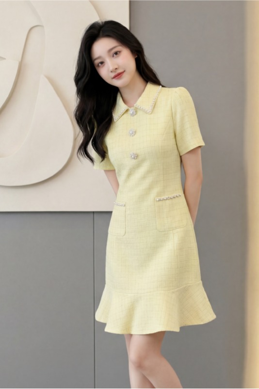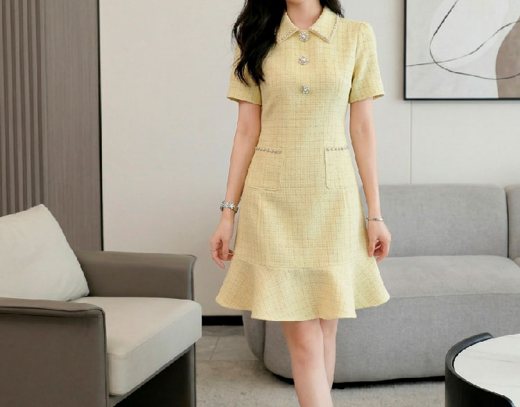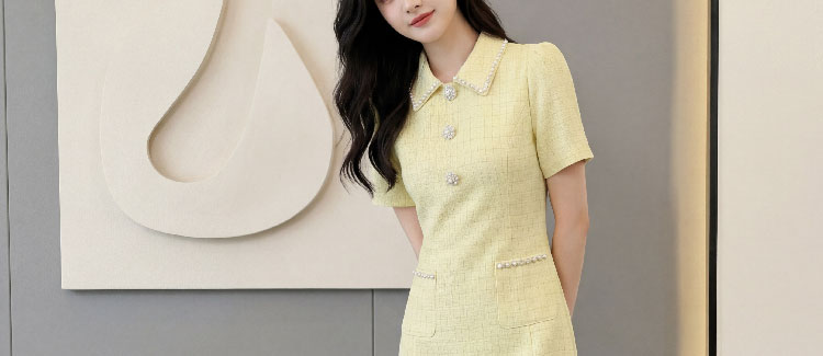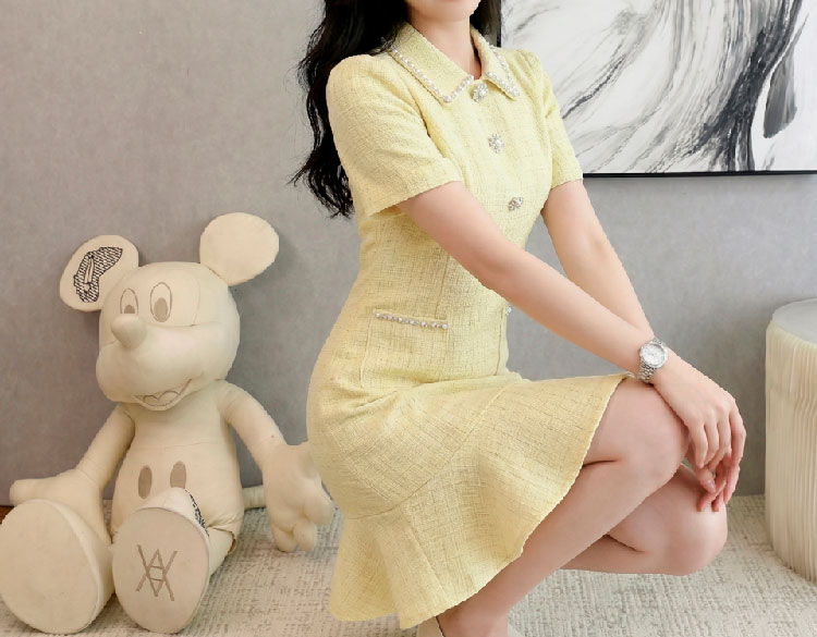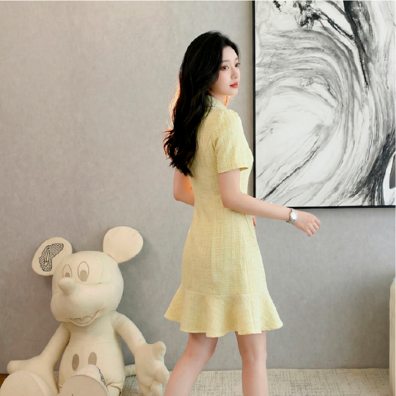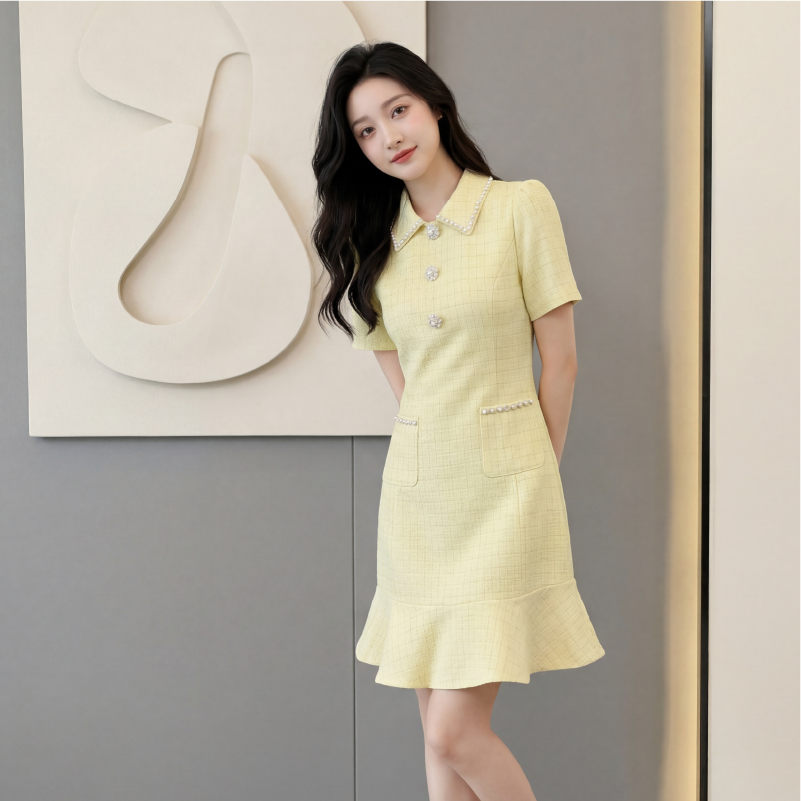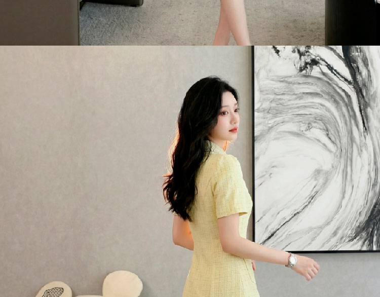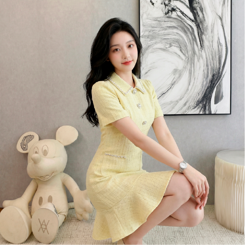 RY3049# 夏季新款钻链装饰小香风温柔风收腰浅黄连衣裙