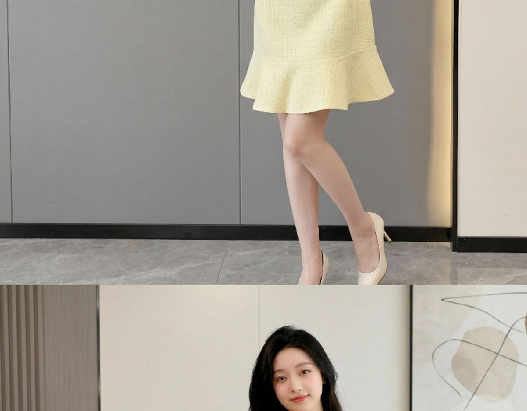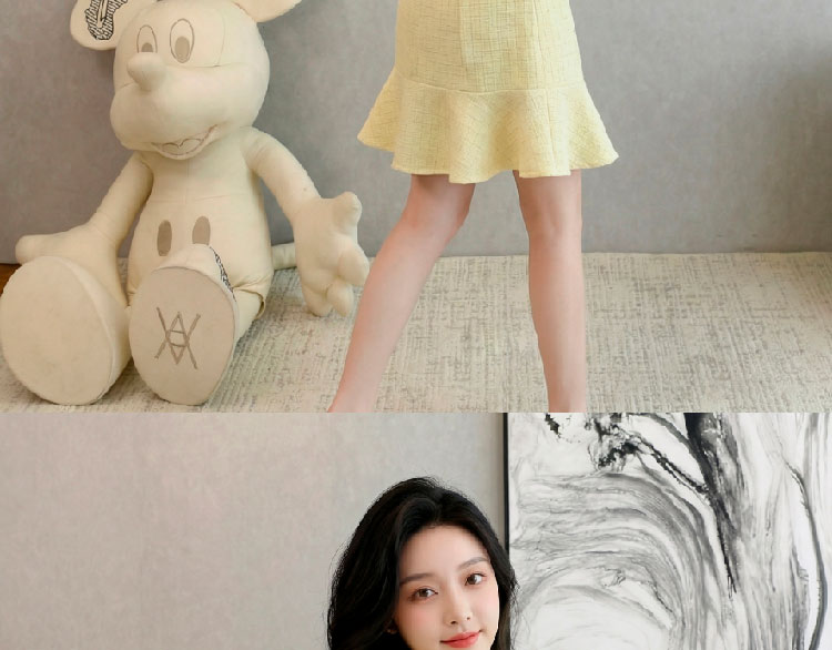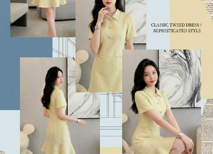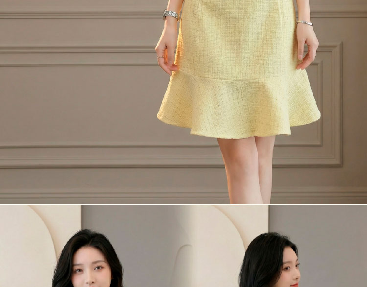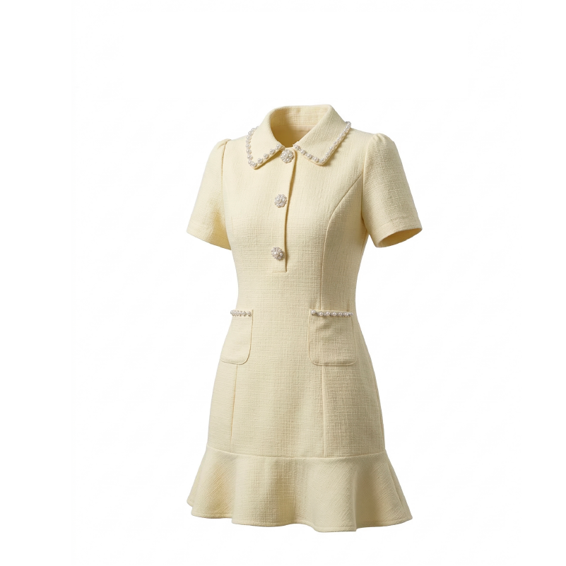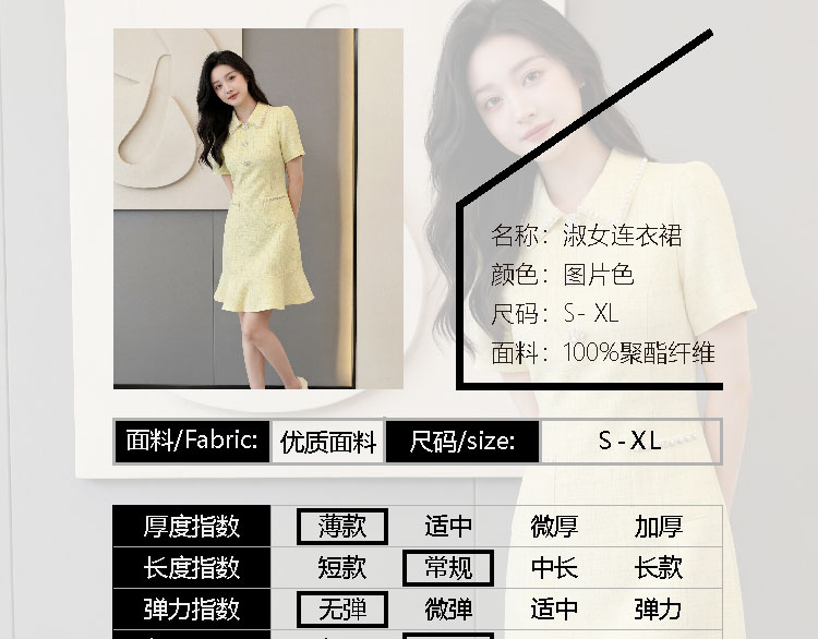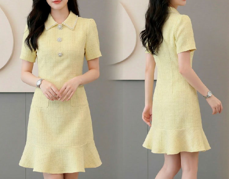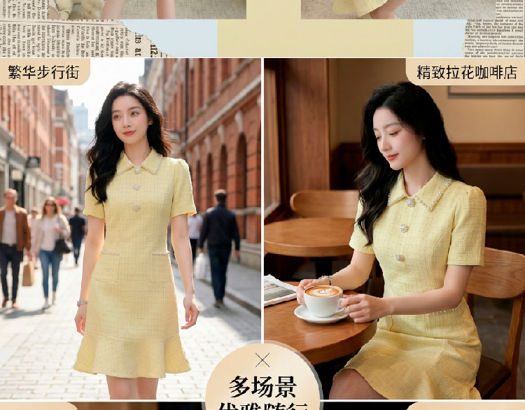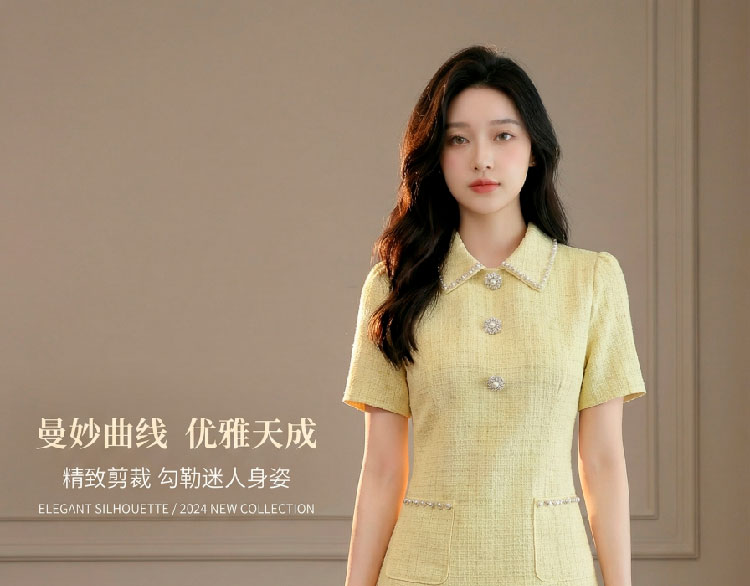 RY3049# 夏季新款钻链装饰小香风温柔风收腰浅黄连衣裙