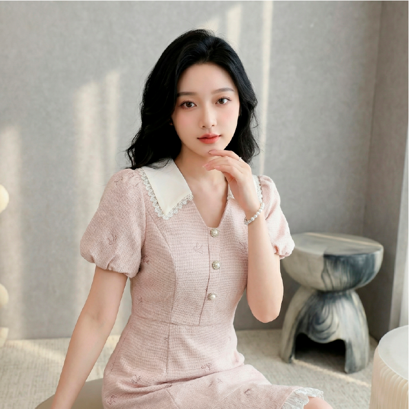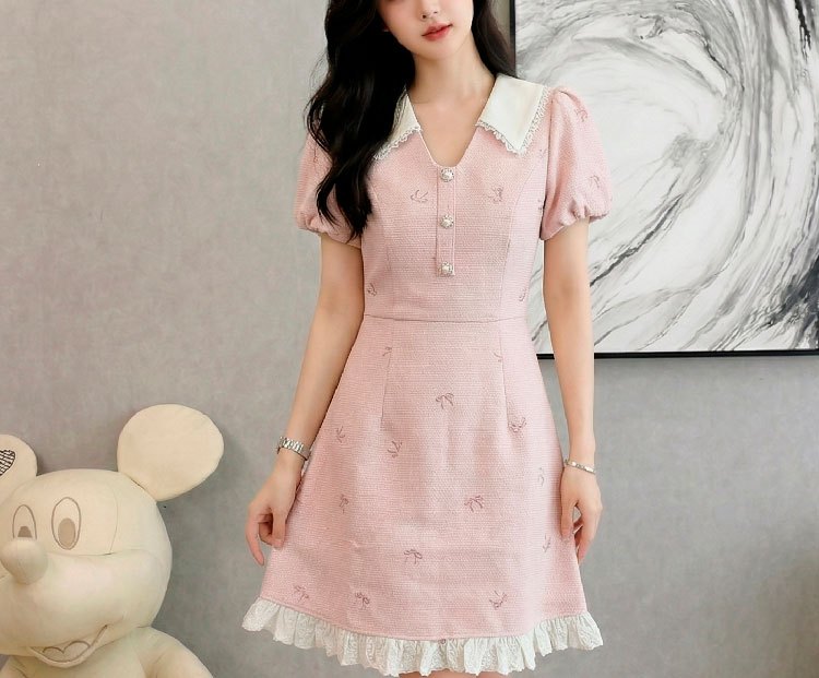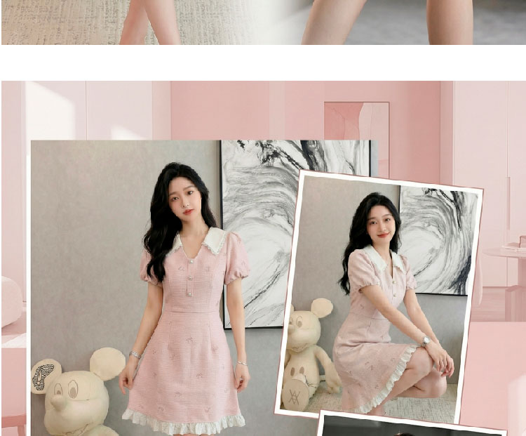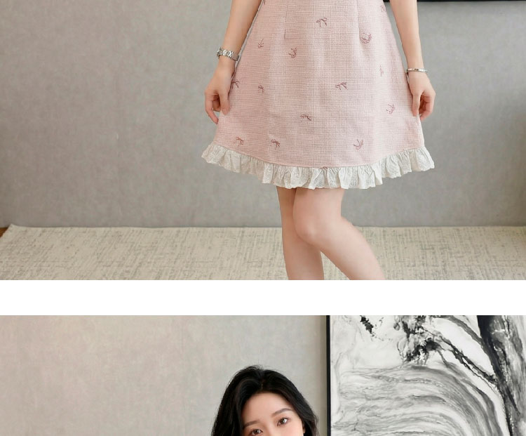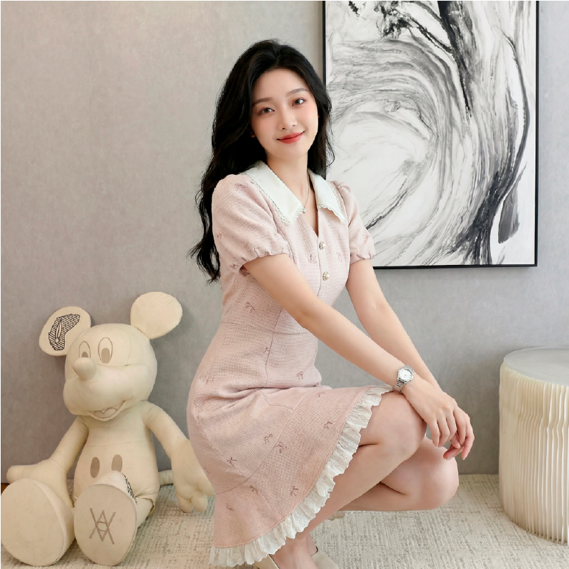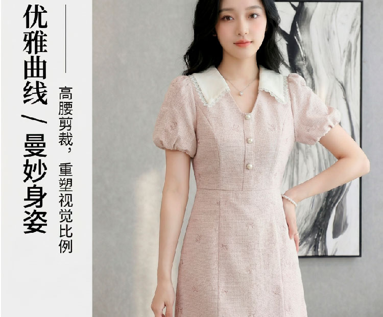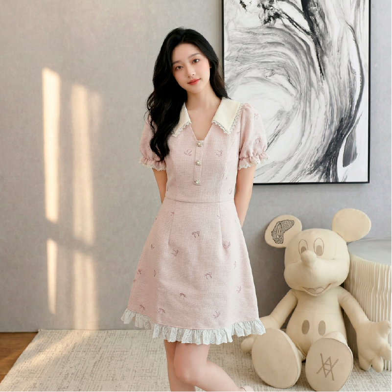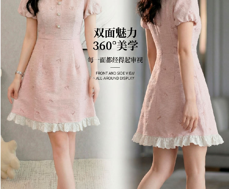RY3050# 小香风粉色v领短袖连衣裙女夏季高级感蕾丝花边法式小个子甜美裙