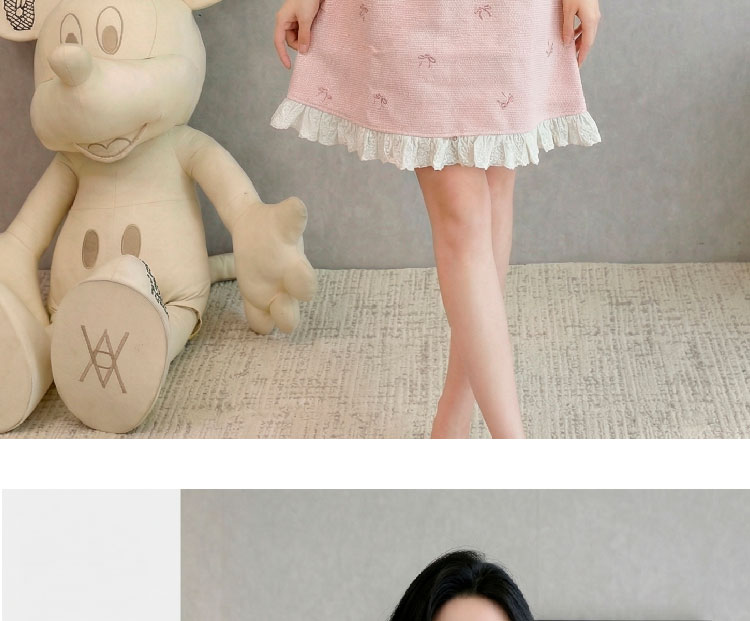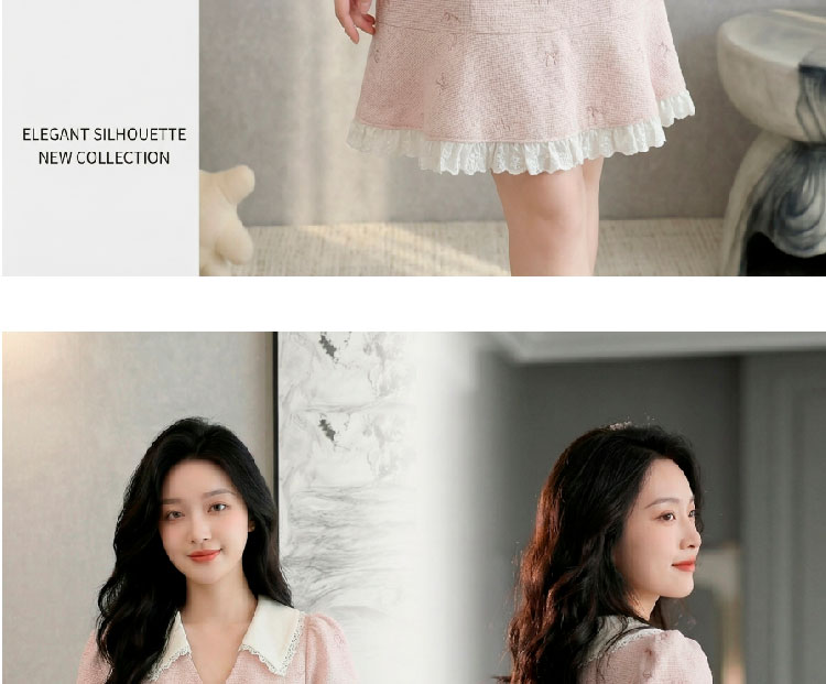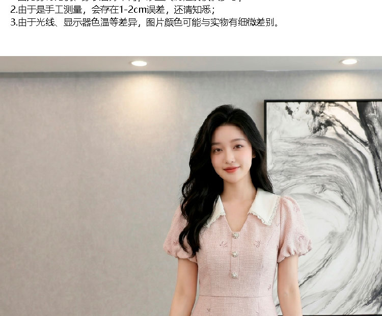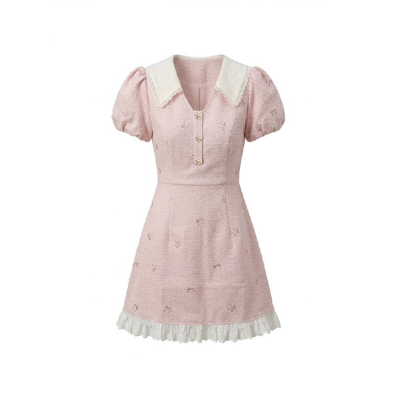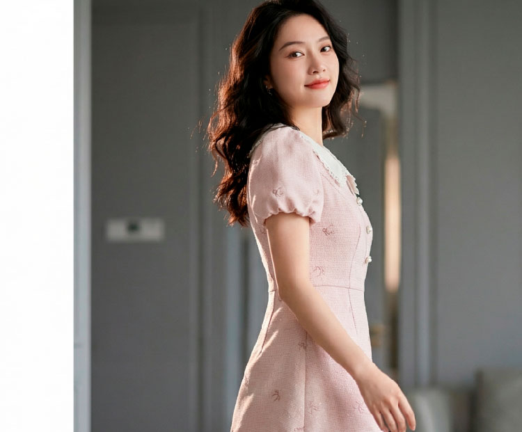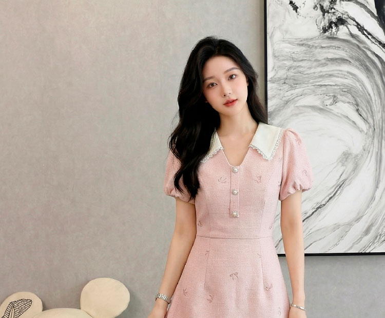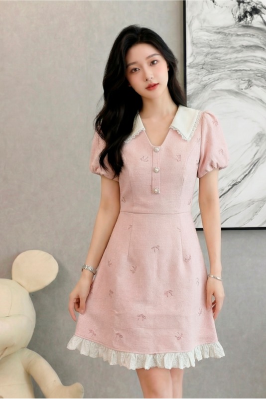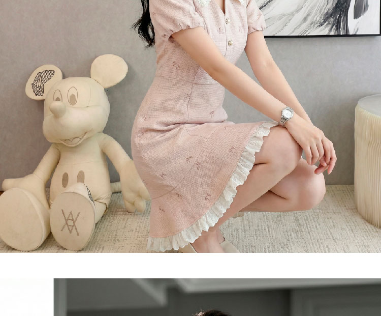 RY3050# 小香风粉色v领短袖连衣裙女夏季高级感蕾丝花边法式小个子甜美裙