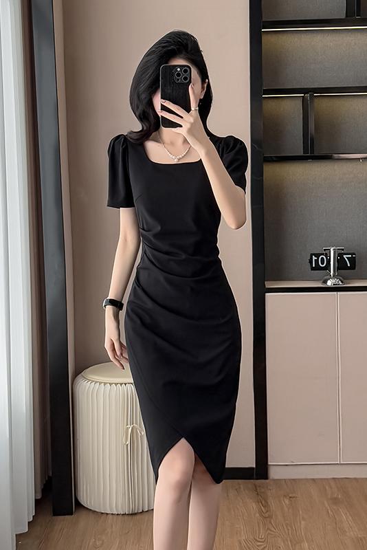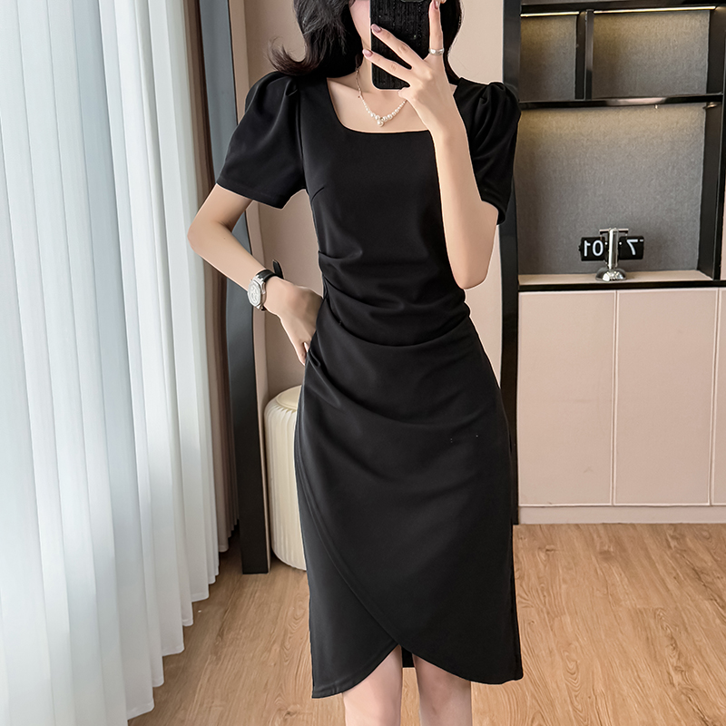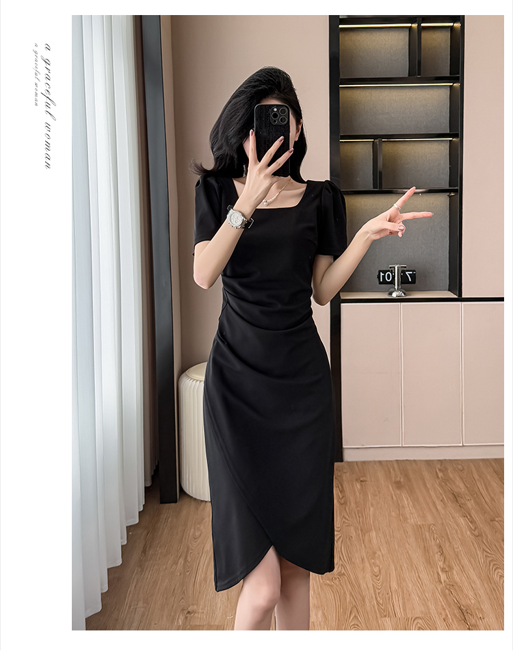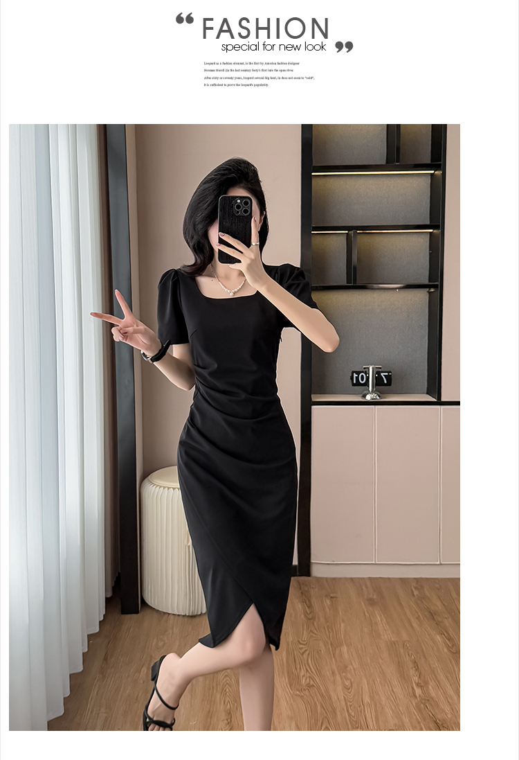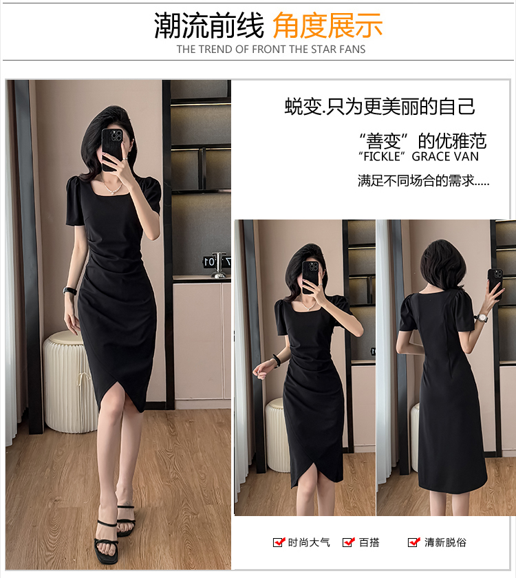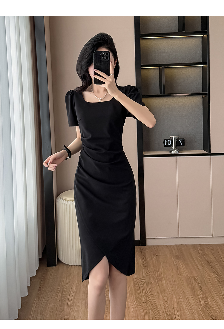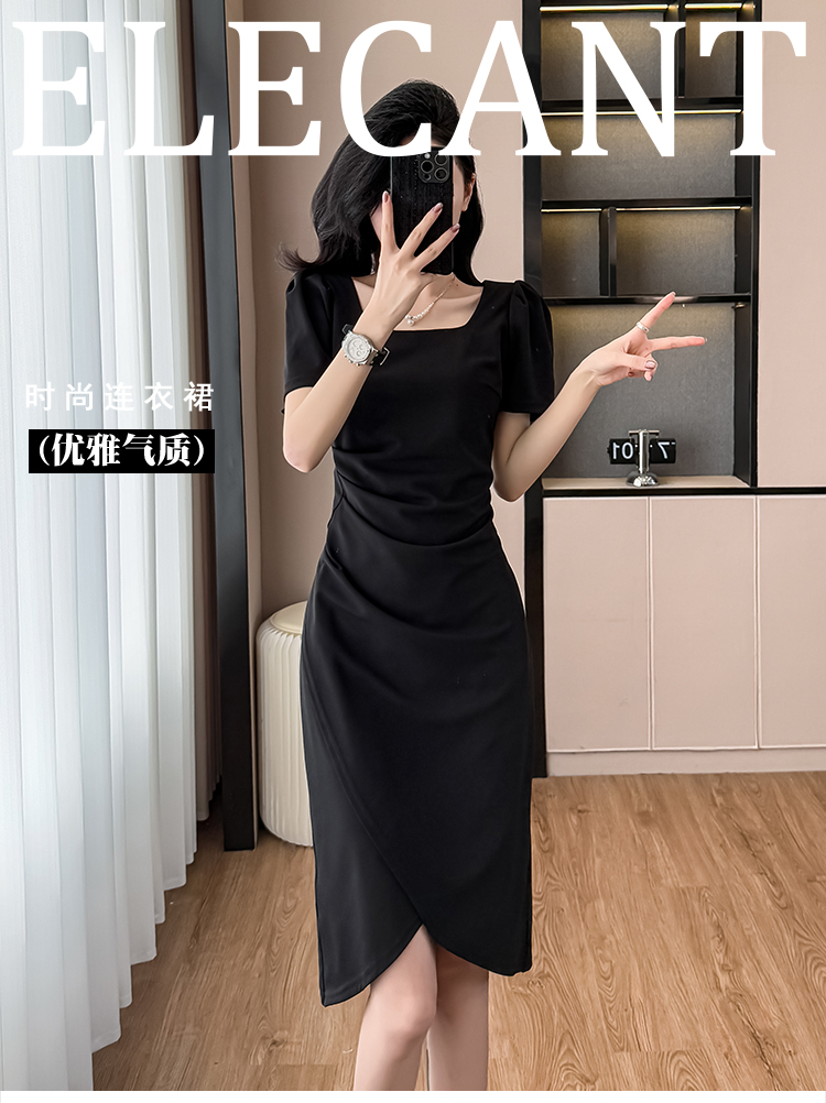 RY3054# 实拍夏季新款法式方领连衣裙修身开叉中长小黑裙收腰女
