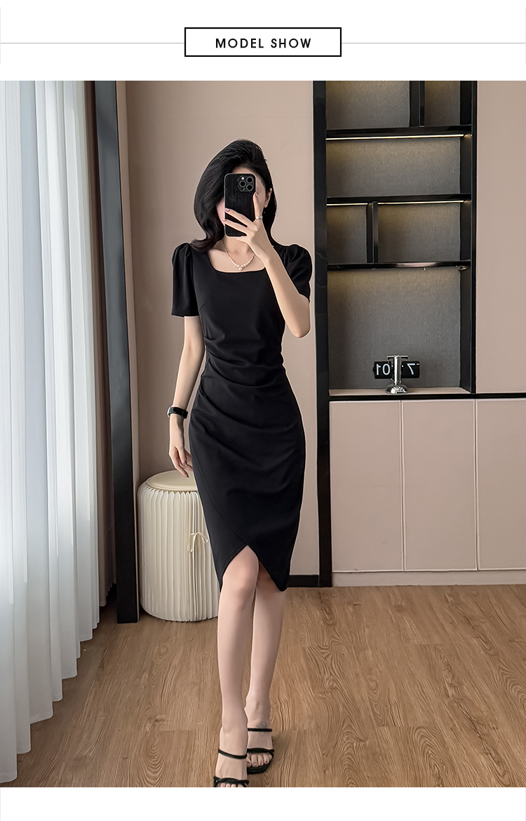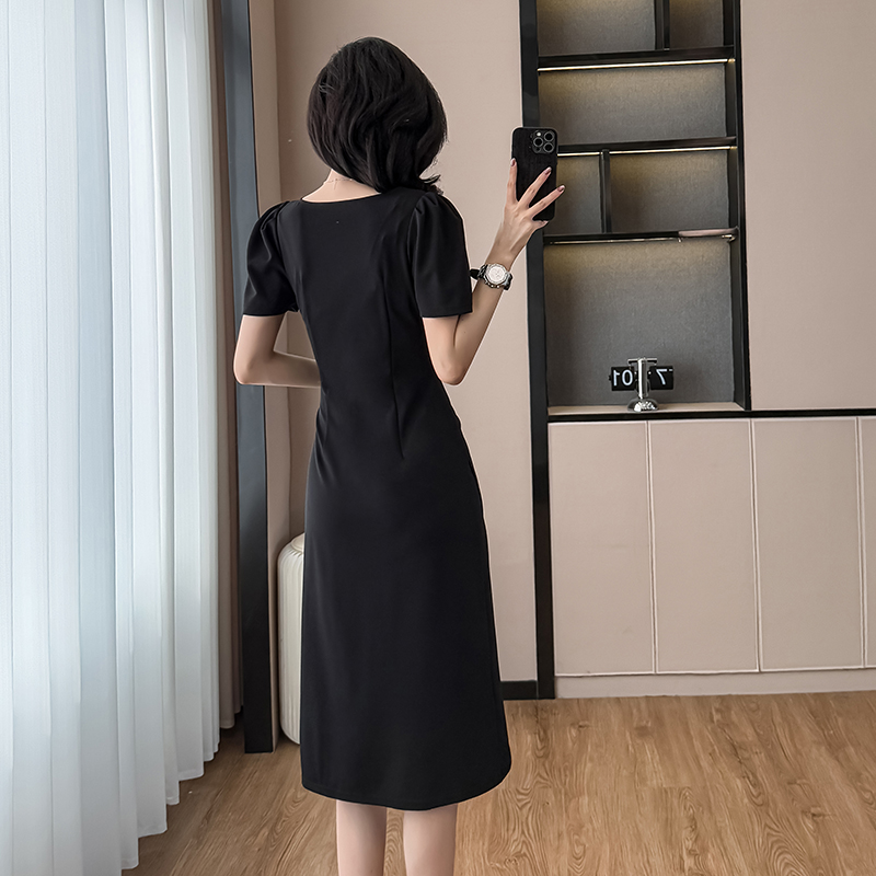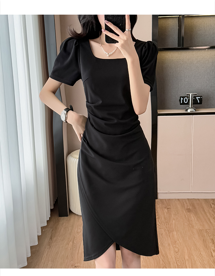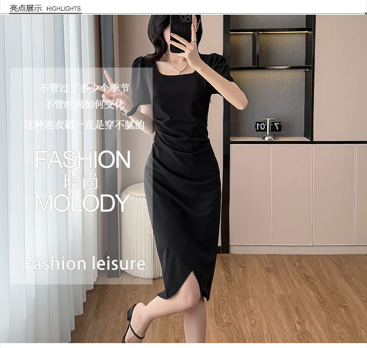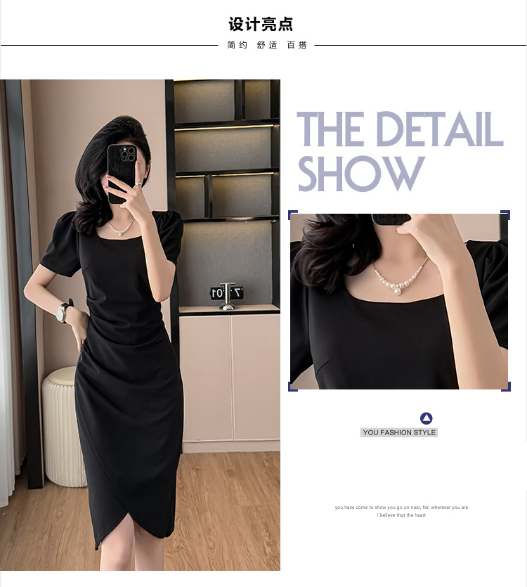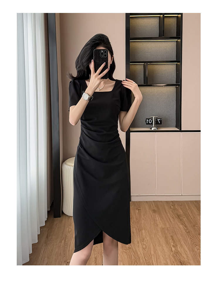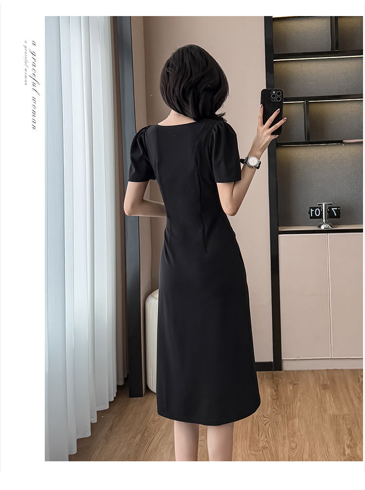 RY3054# 实拍夏季新款法式方领连衣裙修身开叉中长小黑裙收腰女