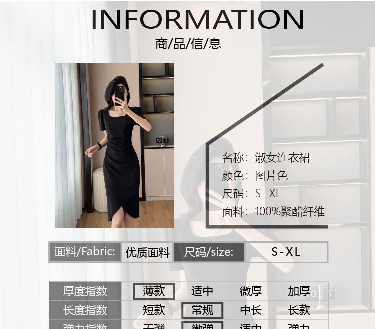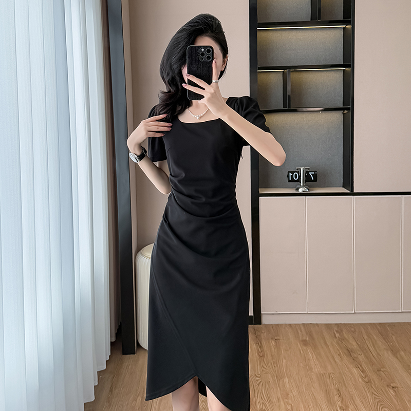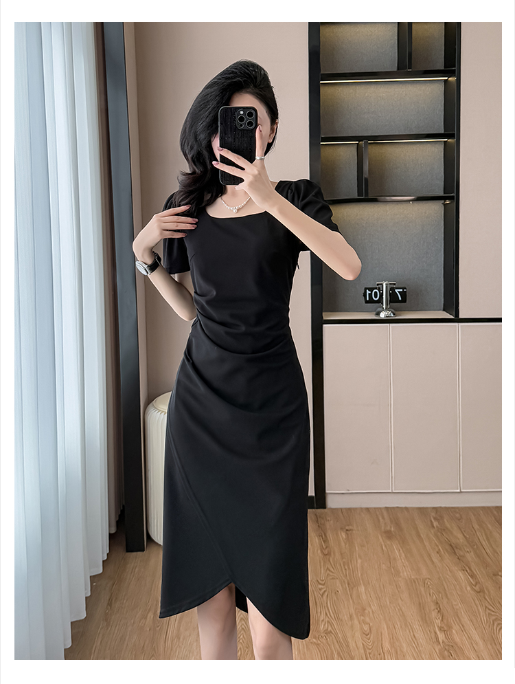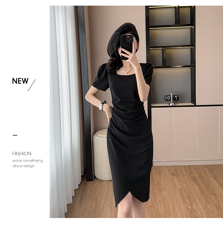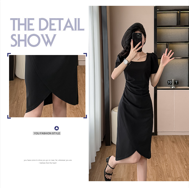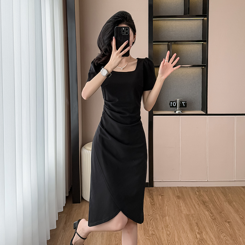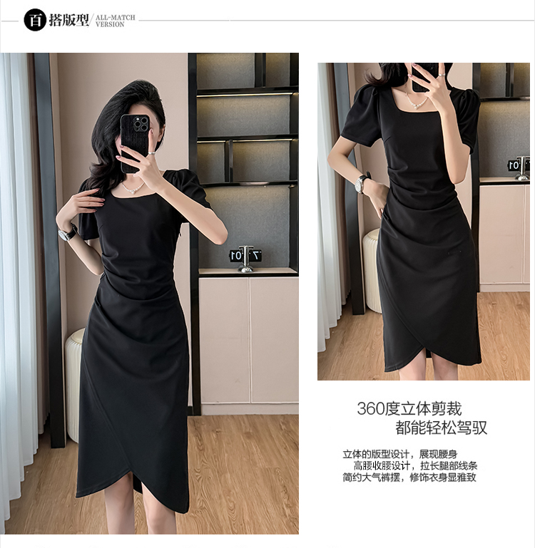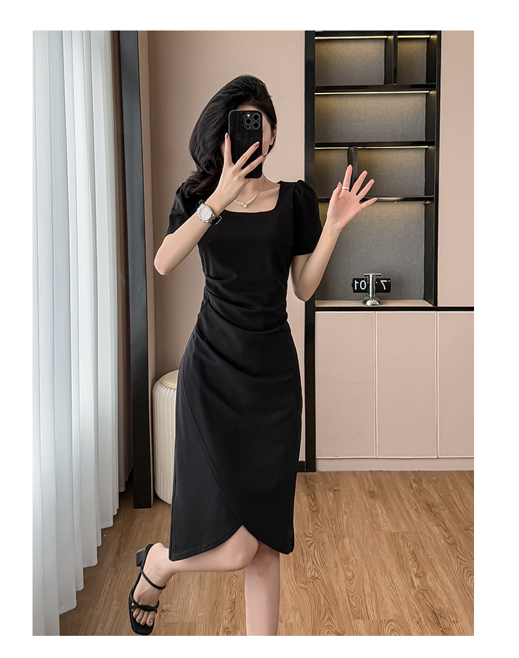 RY3054# 实拍夏季新款法式方领连衣裙修身开叉中长小黑裙收腰女