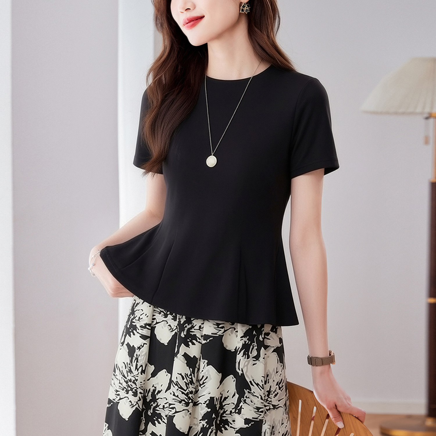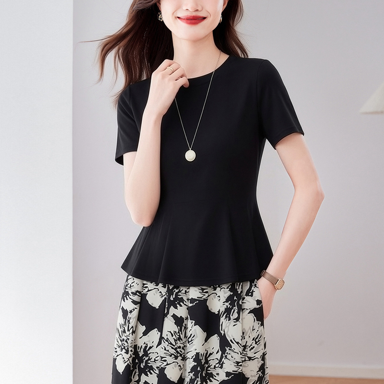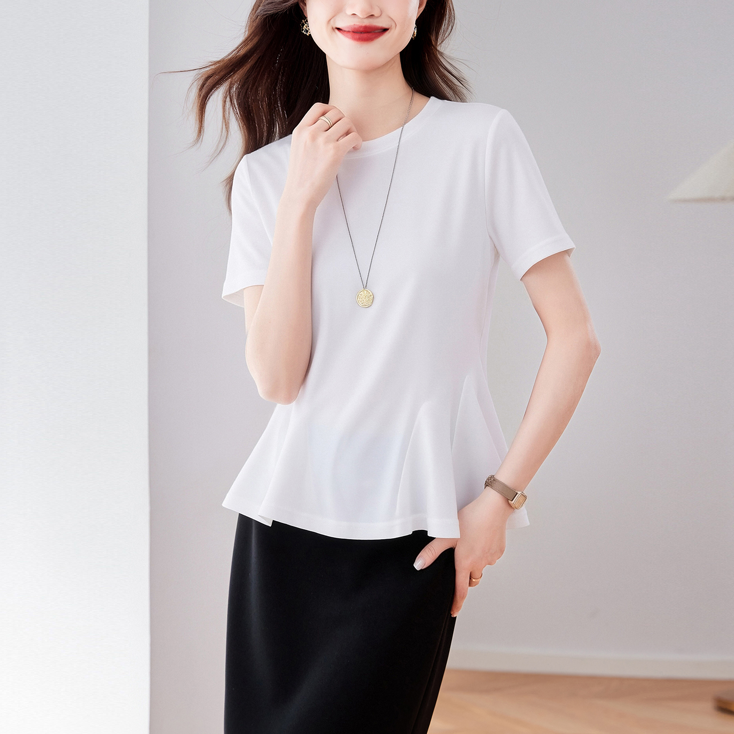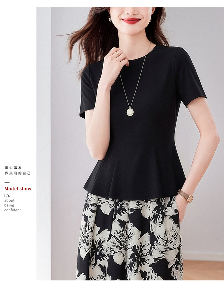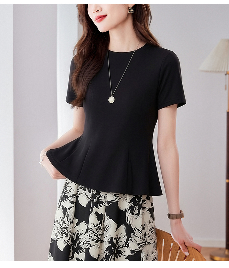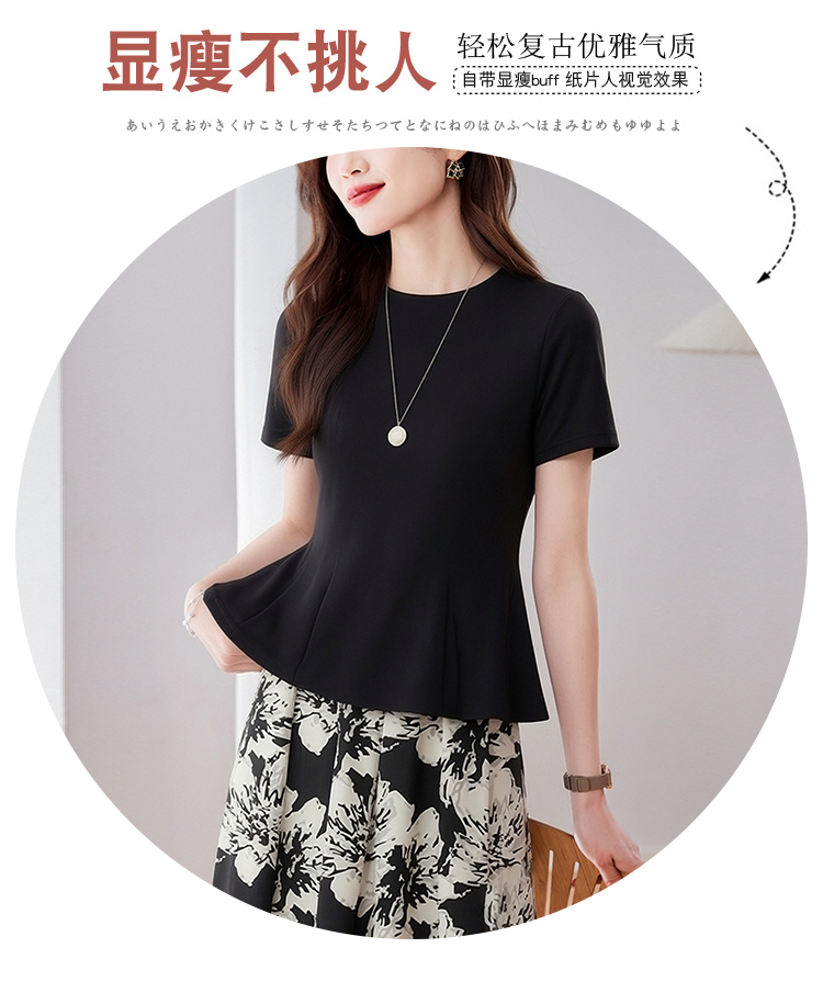 RY3063# 实拍夏季新品轻奢洋气圆领T恤女2026夏季新款女短袖上衣显瘦小衫