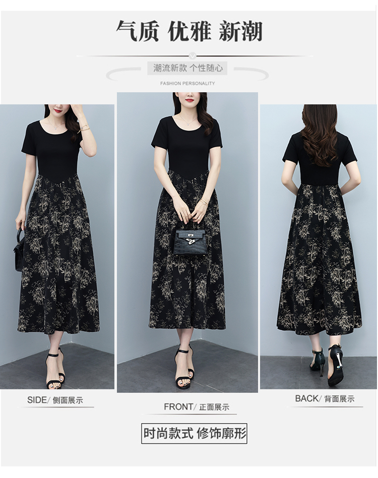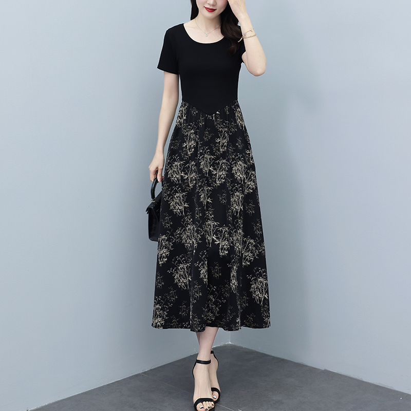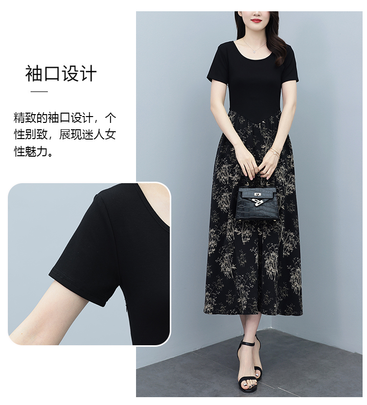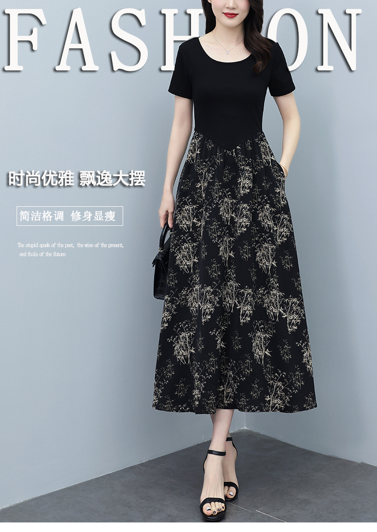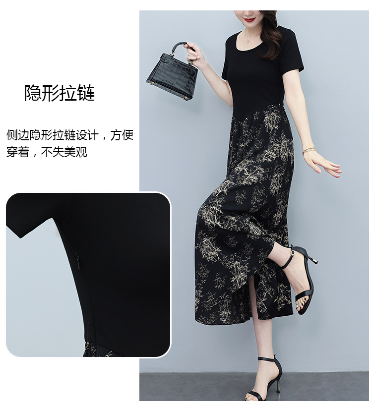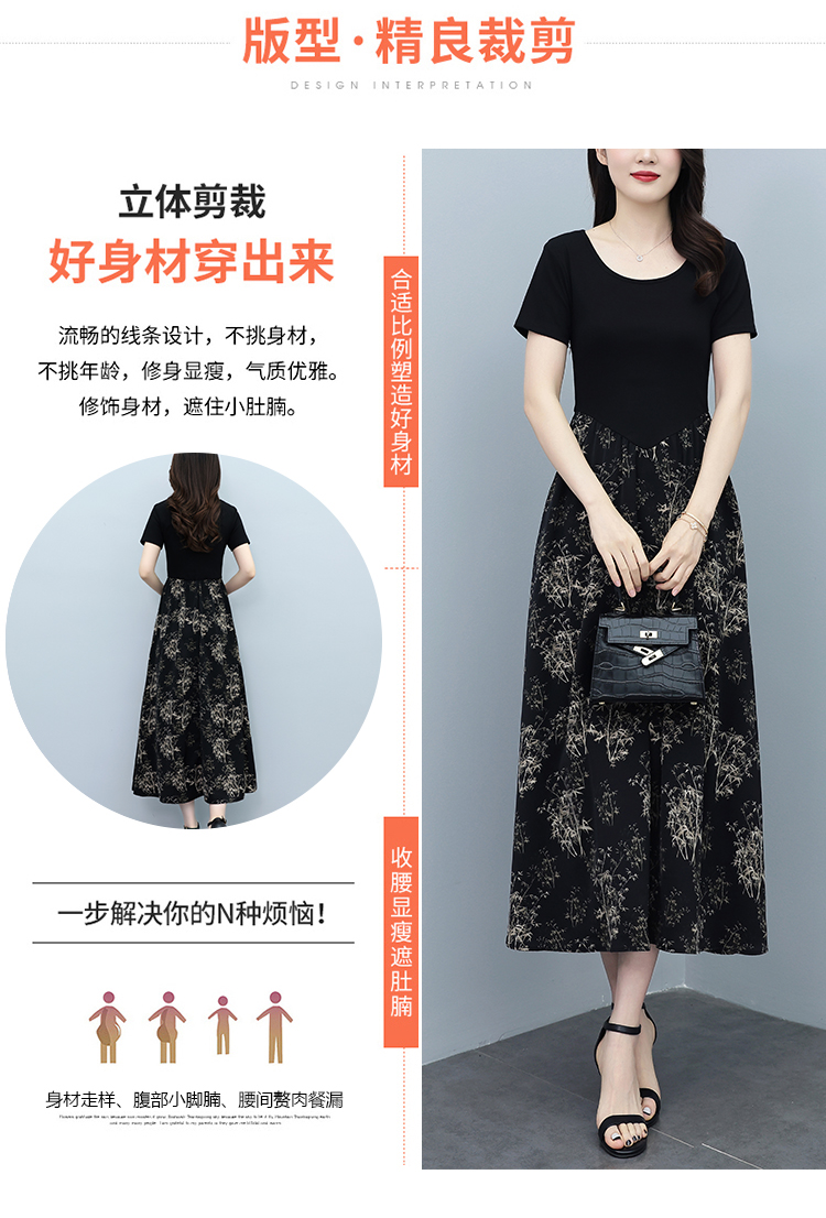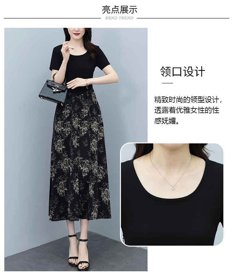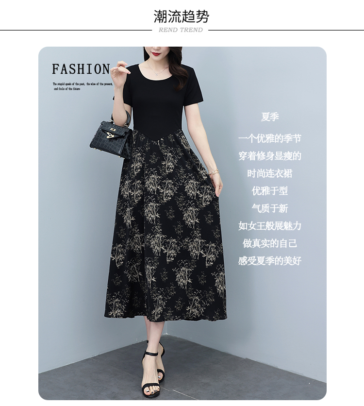 RY3107# 时尚气质印花连衣裙拼接圆领棉T恤短袖a字裙女韩版夏季新款显瘦