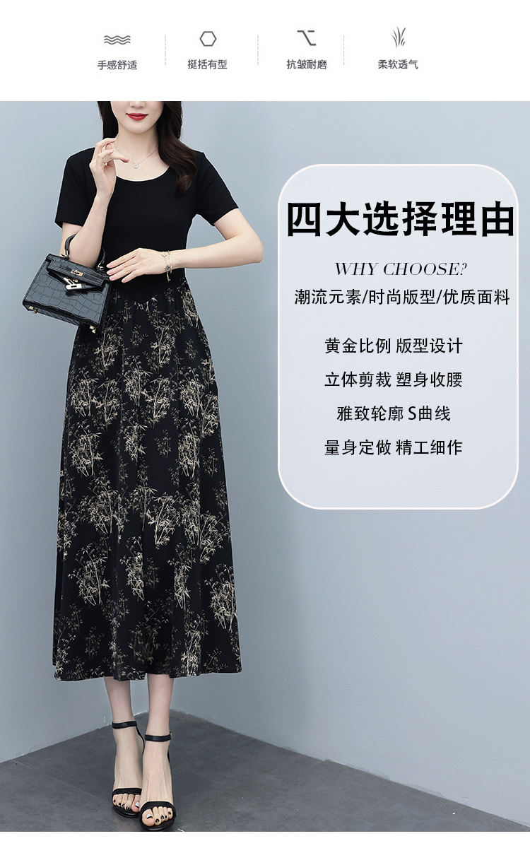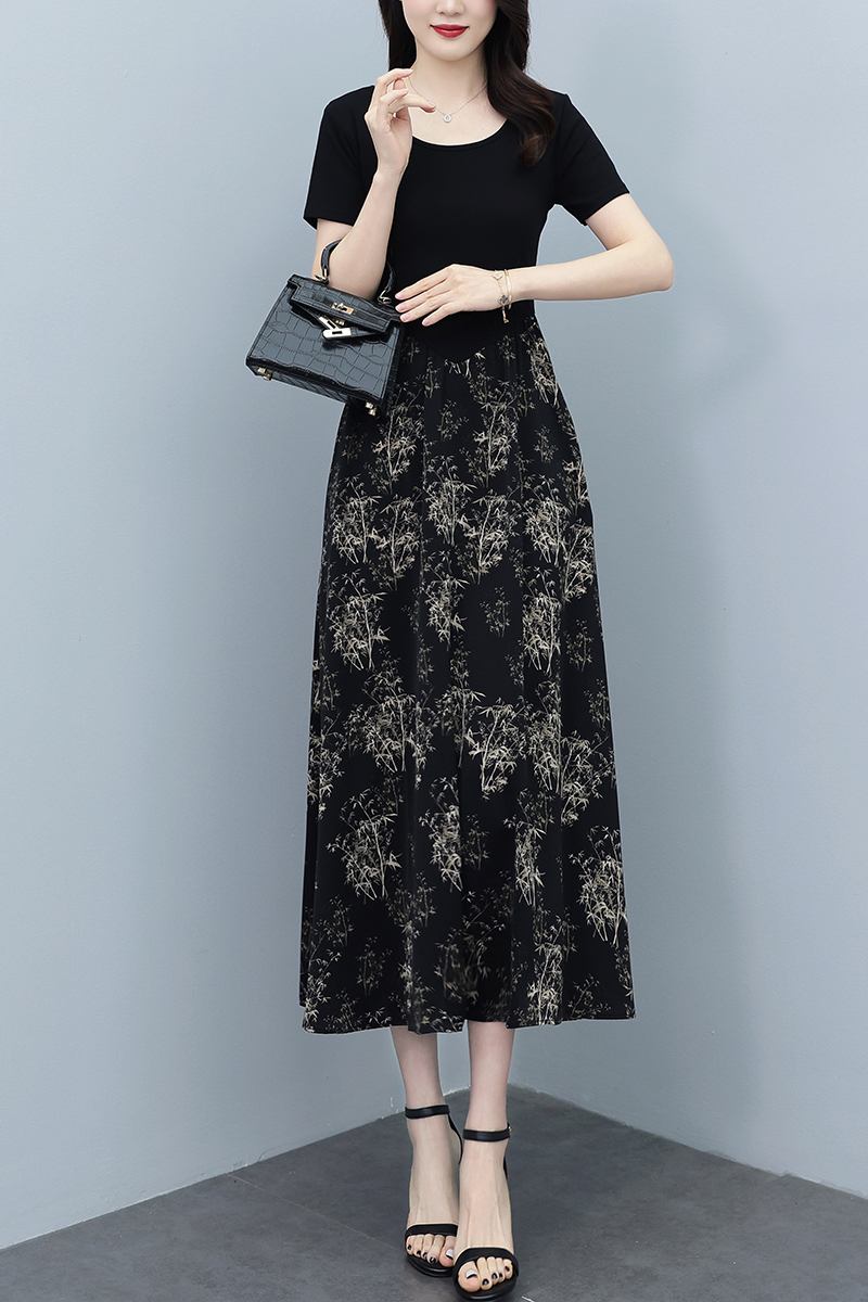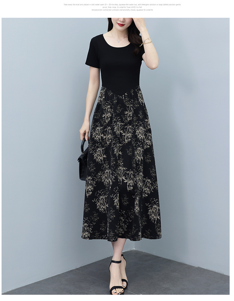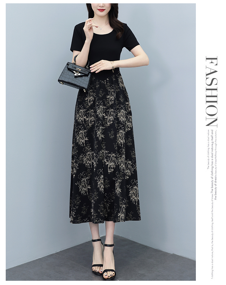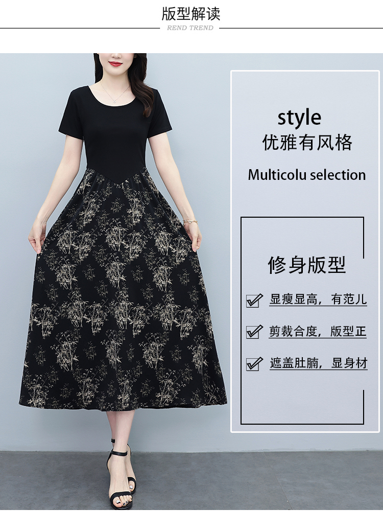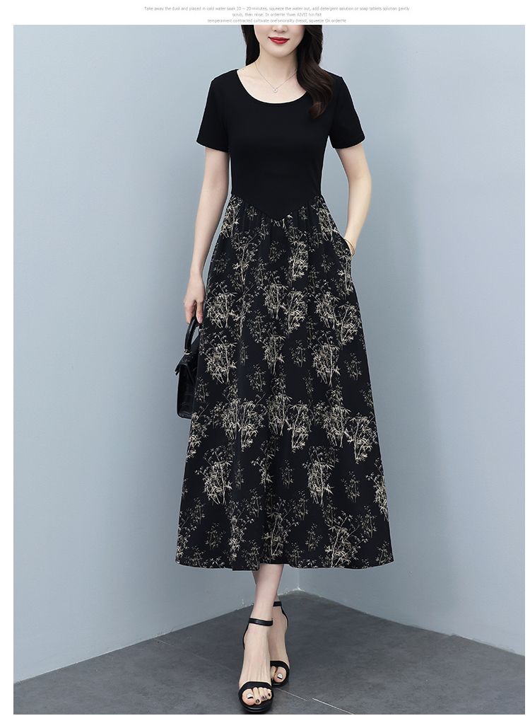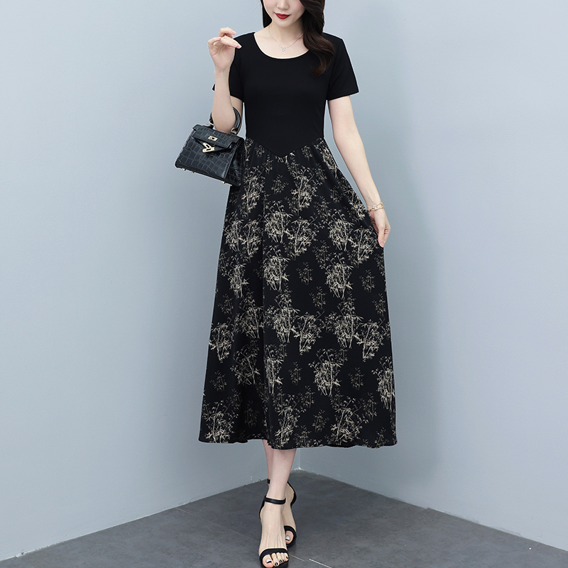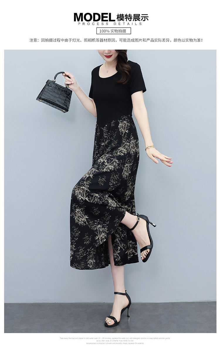 RY3107# 时尚气质印花连衣裙拼接圆领棉T恤短袖a字裙女韩版夏季新款显瘦