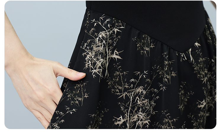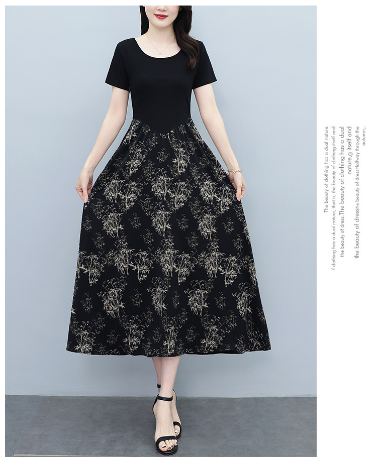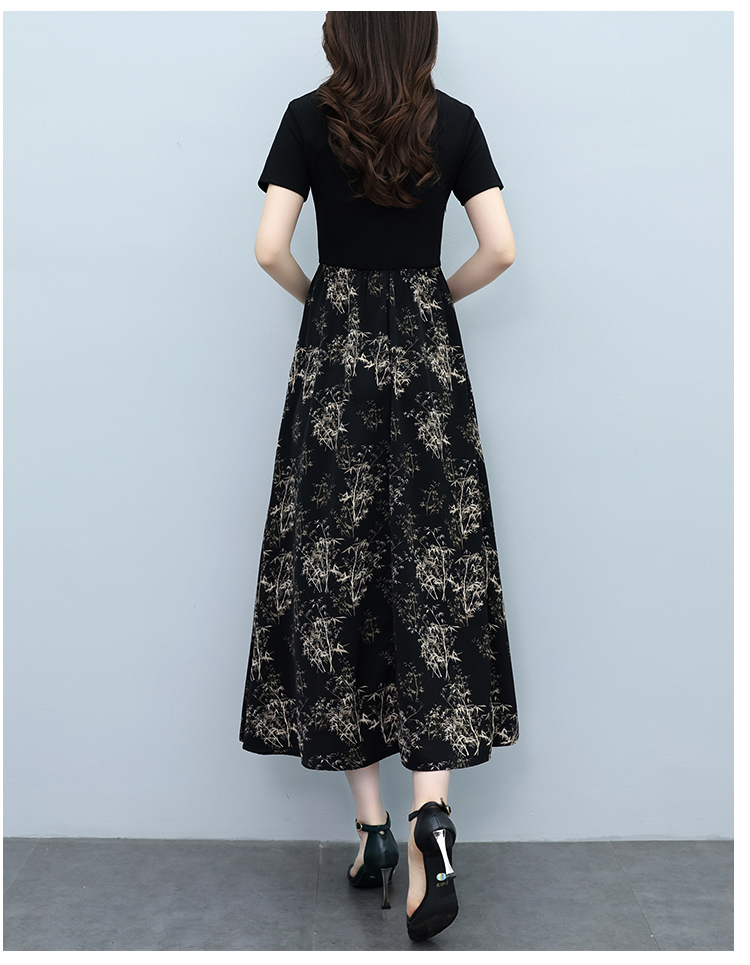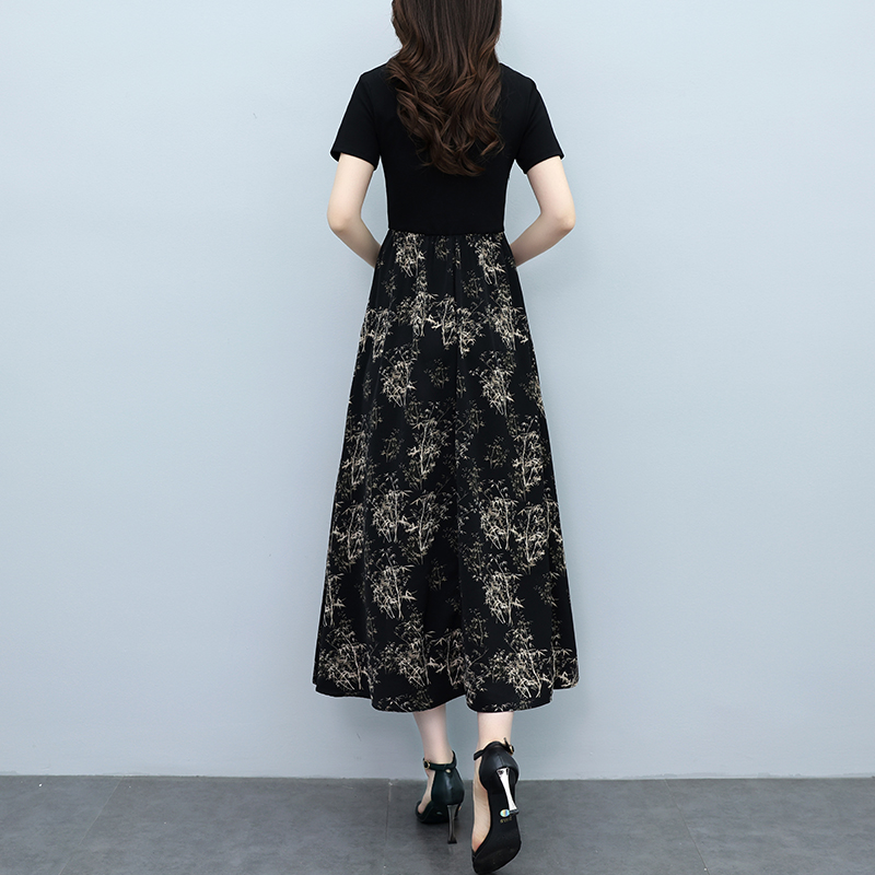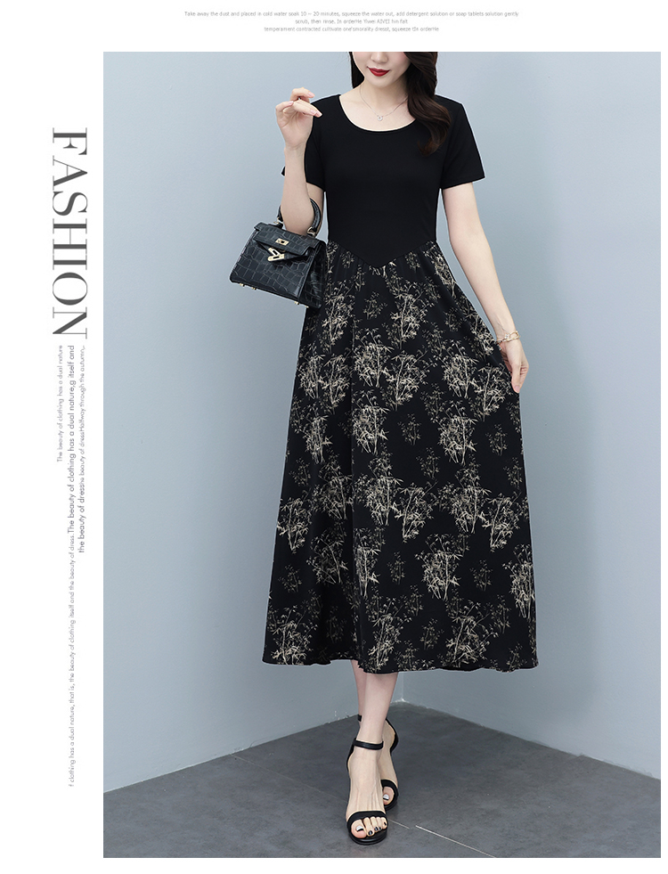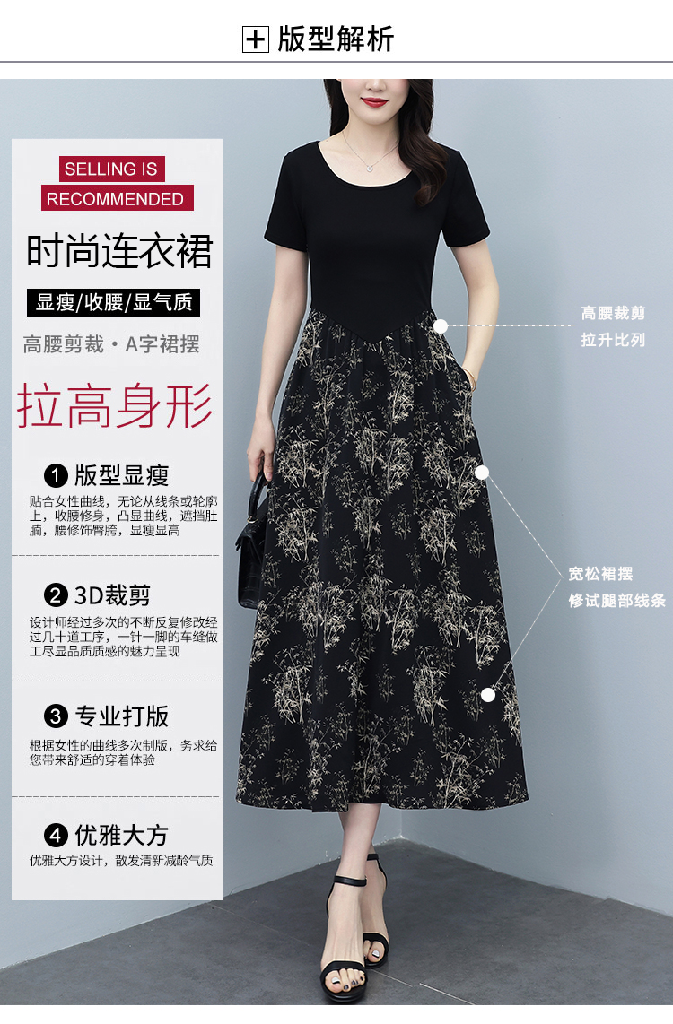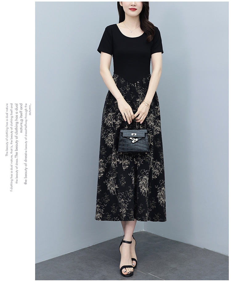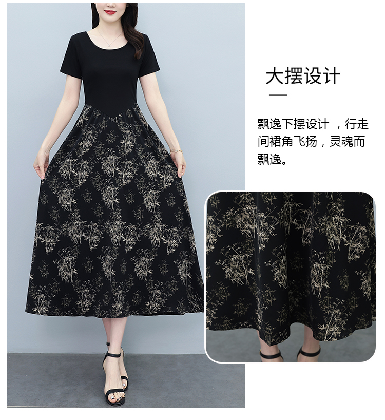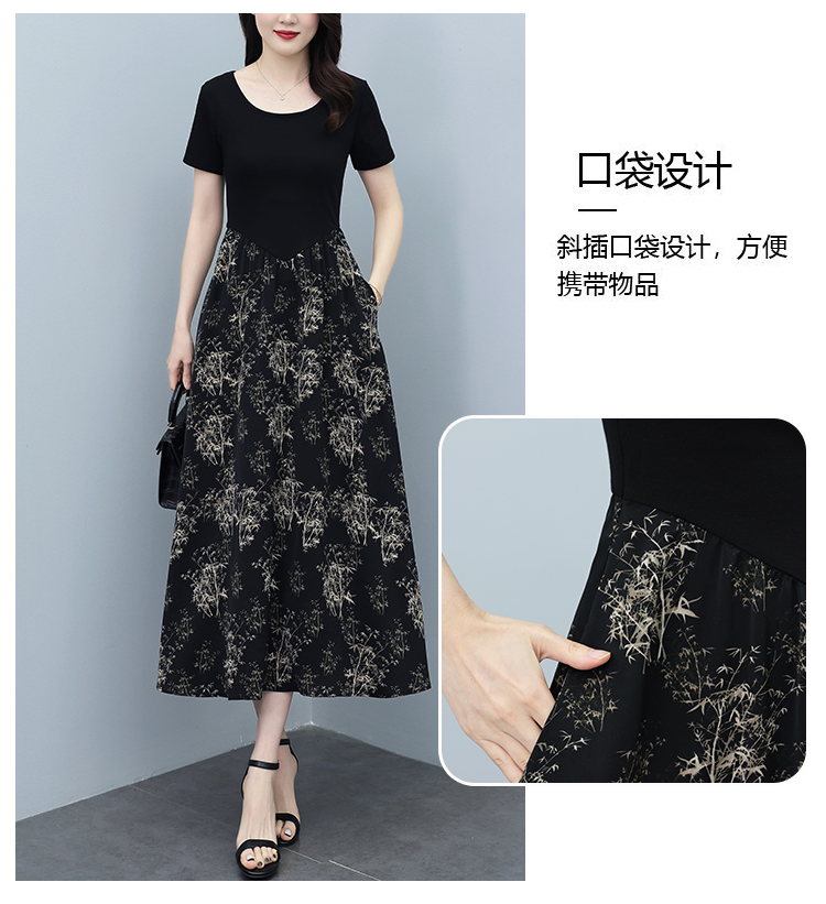 RY3107# 时尚气质印花连衣裙拼接圆领棉T恤短袖a字裙女韩版夏季新款显瘦